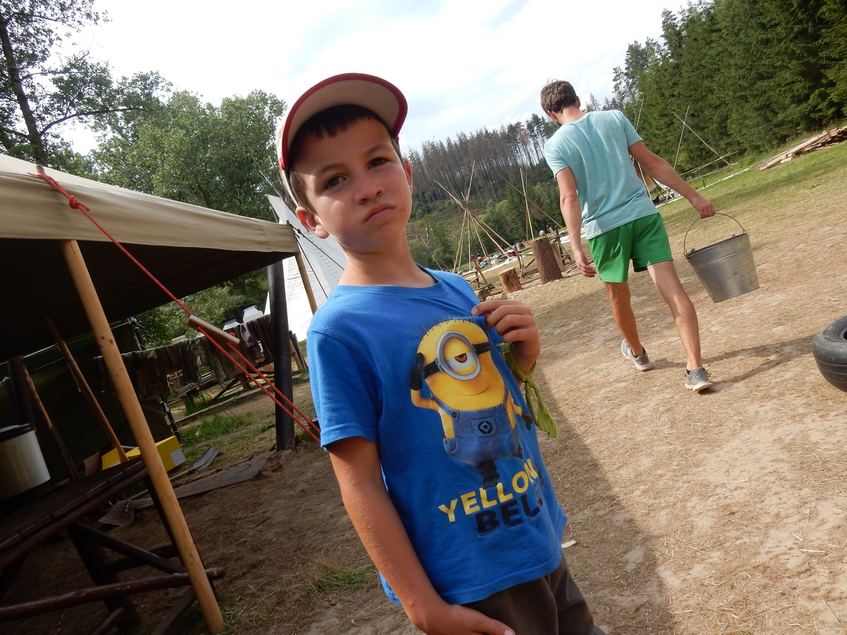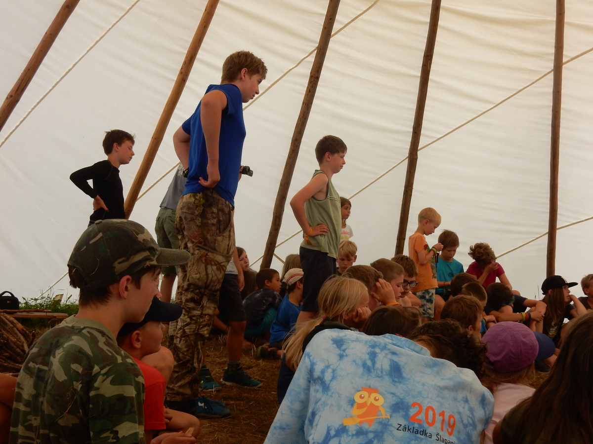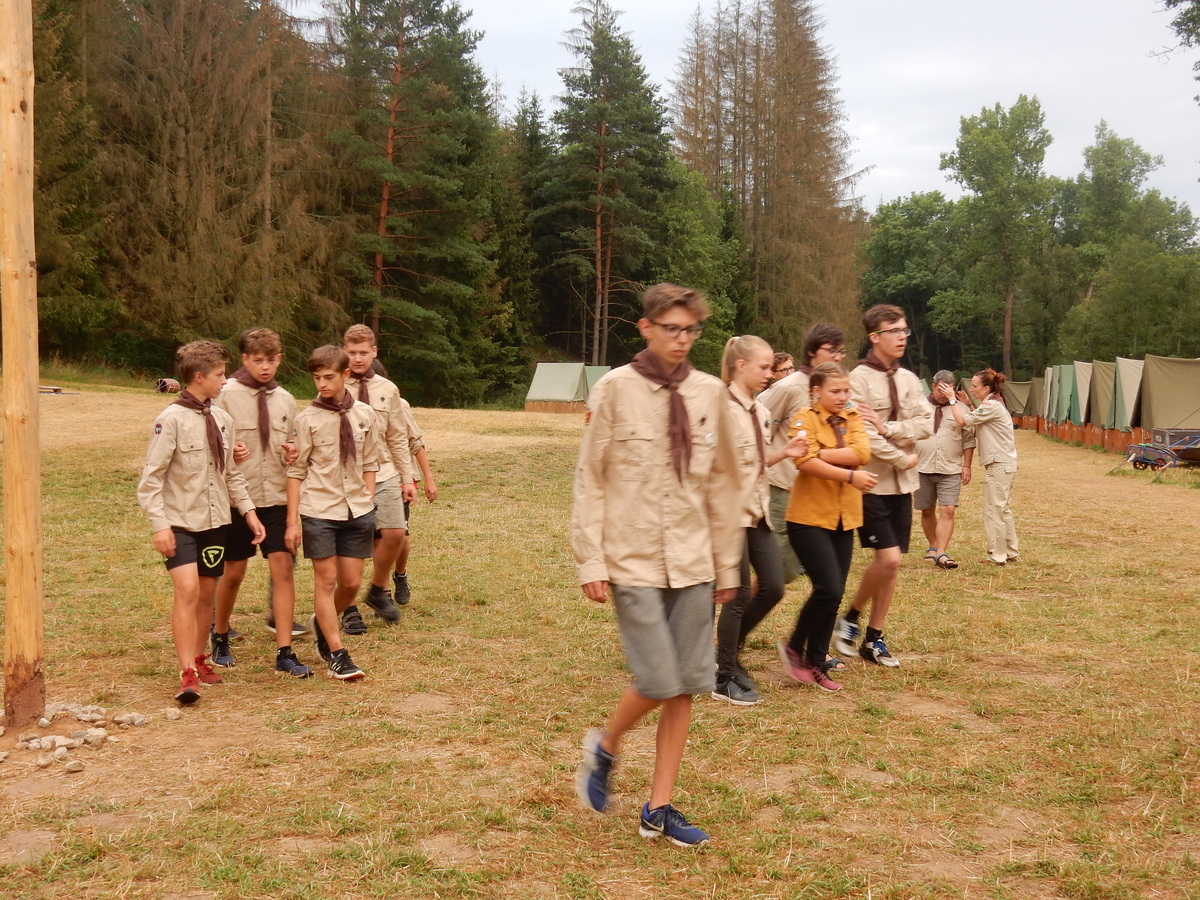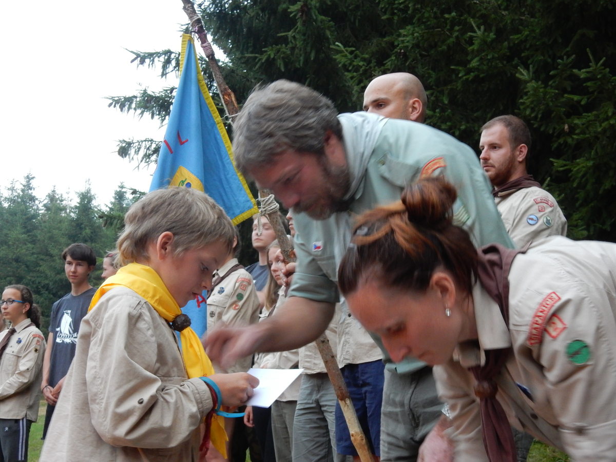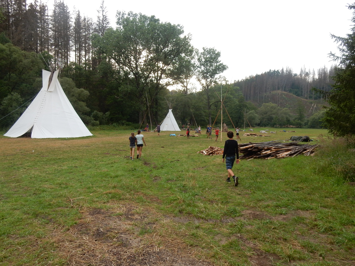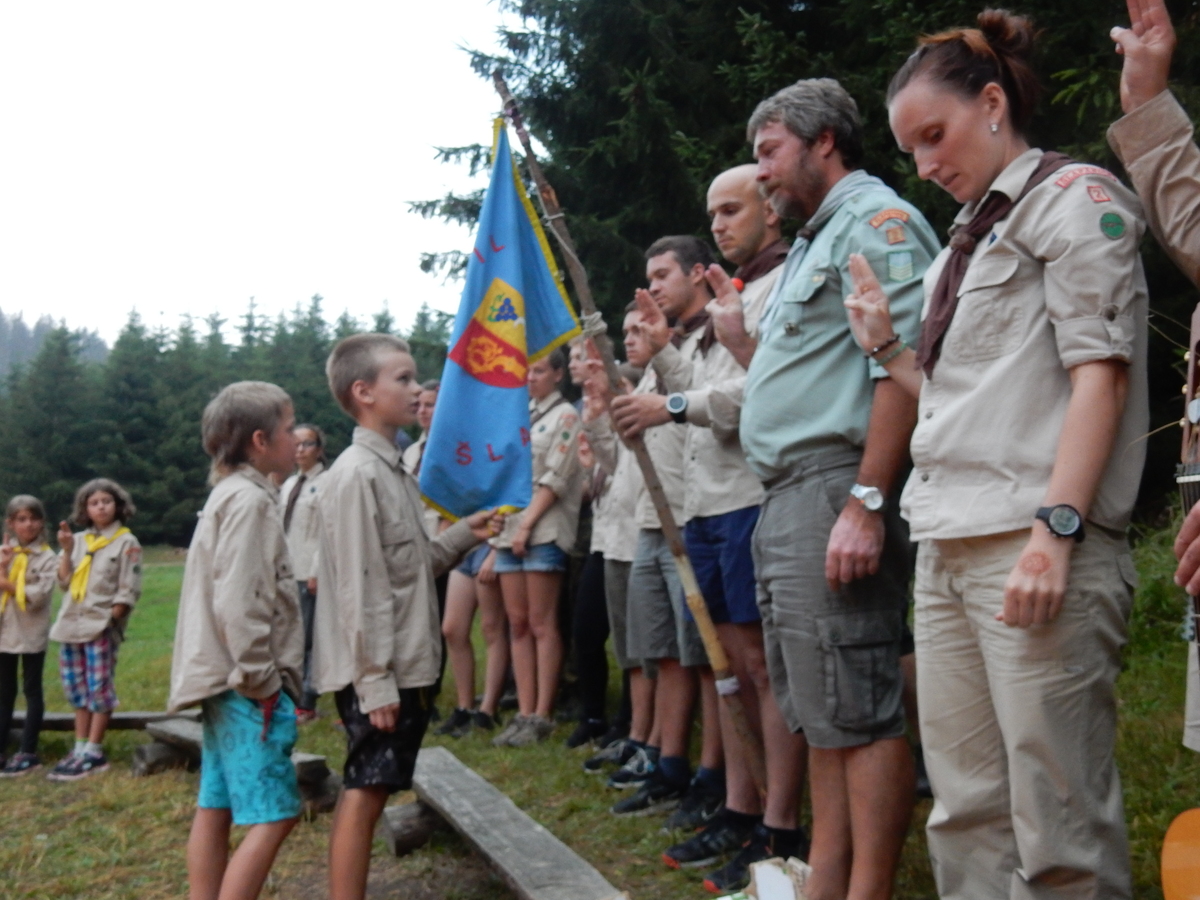 Den programem doslova nabitý. Dopoledne družinky grilují - někdo kýtu, jiný sýr, další třeba hamburgerové maso. Při tom se zpívá a pomalu se bourají týpka. V poledním klidu pak pořádá výprodejovou dražbu Žid, odpoledne se hraje Boj o totem. Při večerním nástupu svěšujeme státní vlajku a u slavnostního ohně skládá slib 12 členů oddílu. Dalších 7 zvládlo těžkou skautskou zkoušku 3 orlí pera a 4 mladší zase 3 bílé tesáky. Taky se hodnotí úklid ve stanech a dlouho do noci zpívá. Poprvé a naposledy není na táboře vyhlášena večerka :-)...