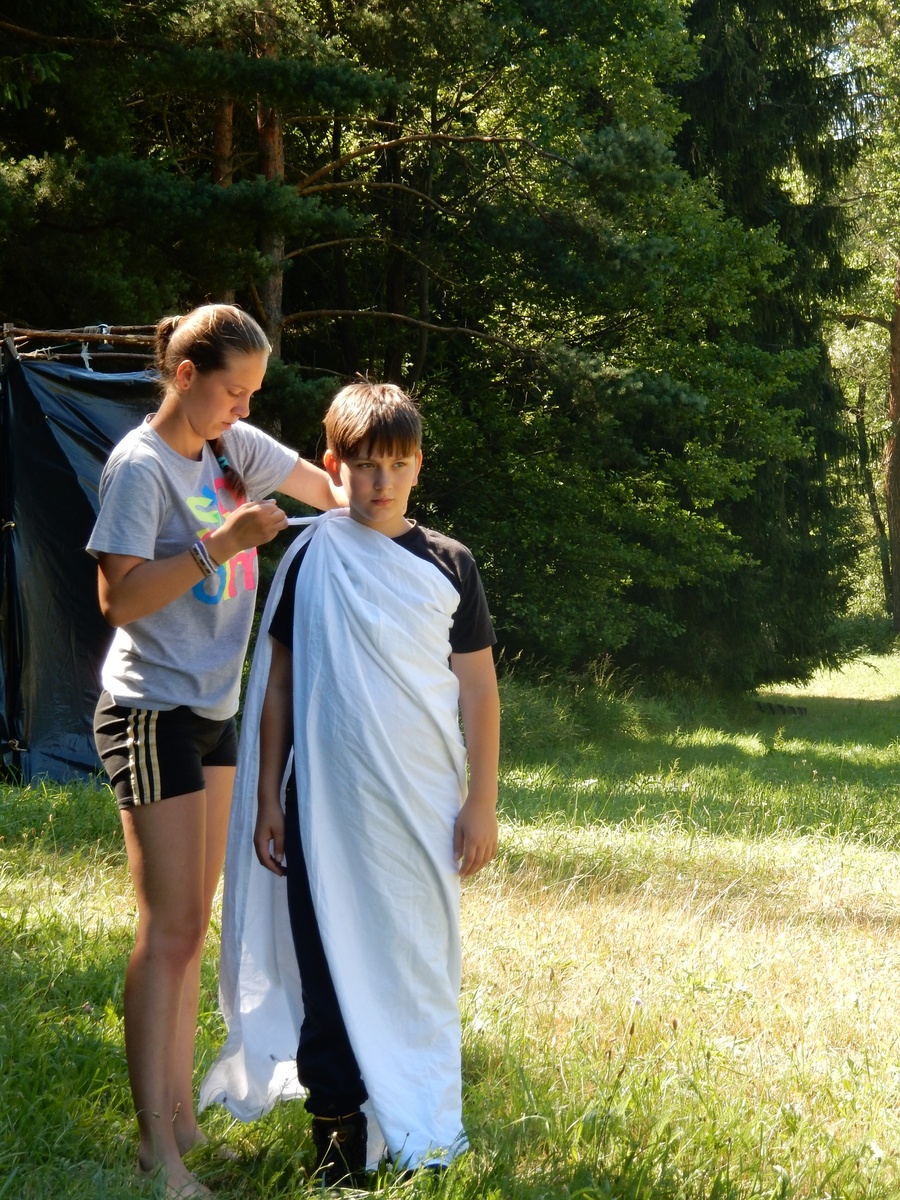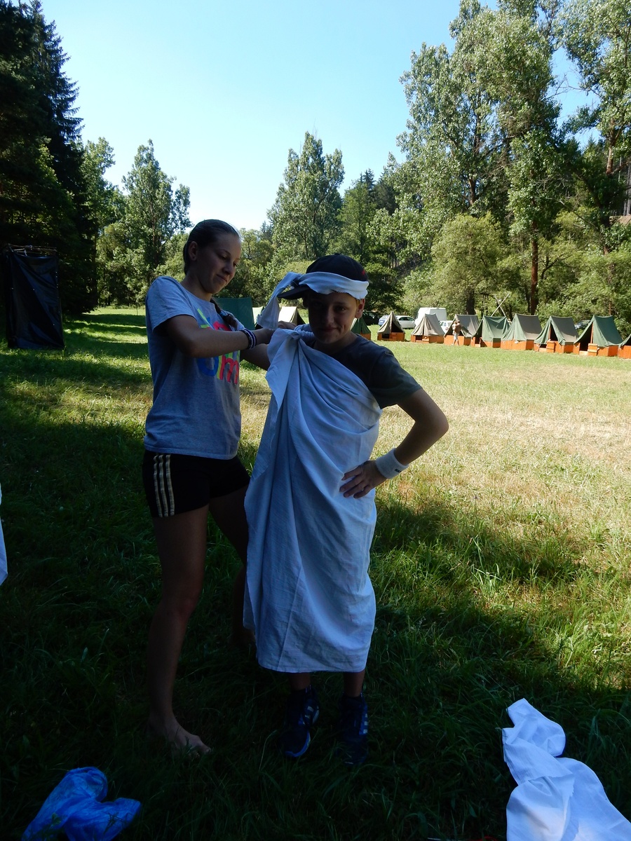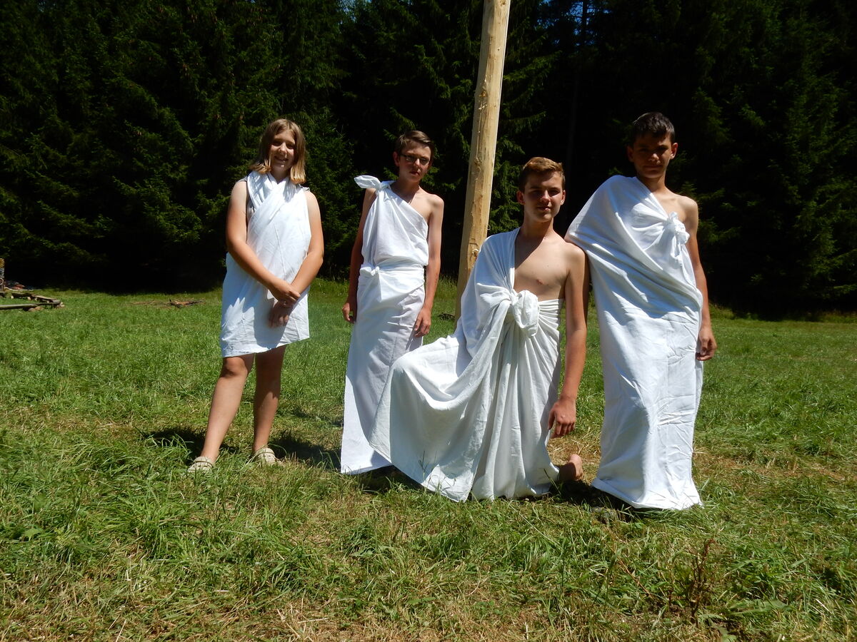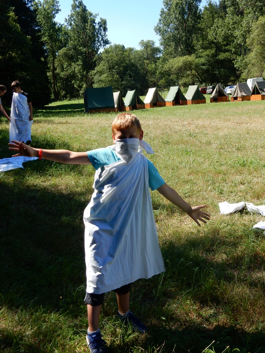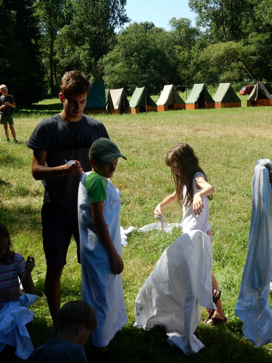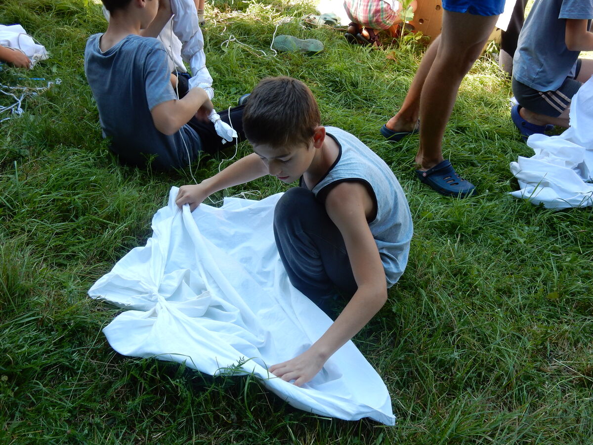 Druhý táborový den se rozjela celotáborová hra. Dopoledne mladší batikovali tógy, zatímco starší zakládali Síně předků a vábili vodní melodií Lernenskou hydru (ty flašky od piva, co jsou na fotkách jsme si půjčili v Kauflandu :-)). Odpoledne pak i straší i mladší razili k rybníku na Americe, kde byla etapa ve znamení boje s hydrou. Ochlazení ve vodě přišlo všem vhod, bylo opravdu teplo. Po večeři a sněmu probíhaly sportovní hry v táboře. Zítra nové fotky nečekejte, neb razíme na puťák a tam to s internetem bude všelijaký. Snad pozítří... Jura