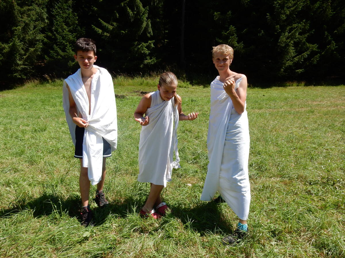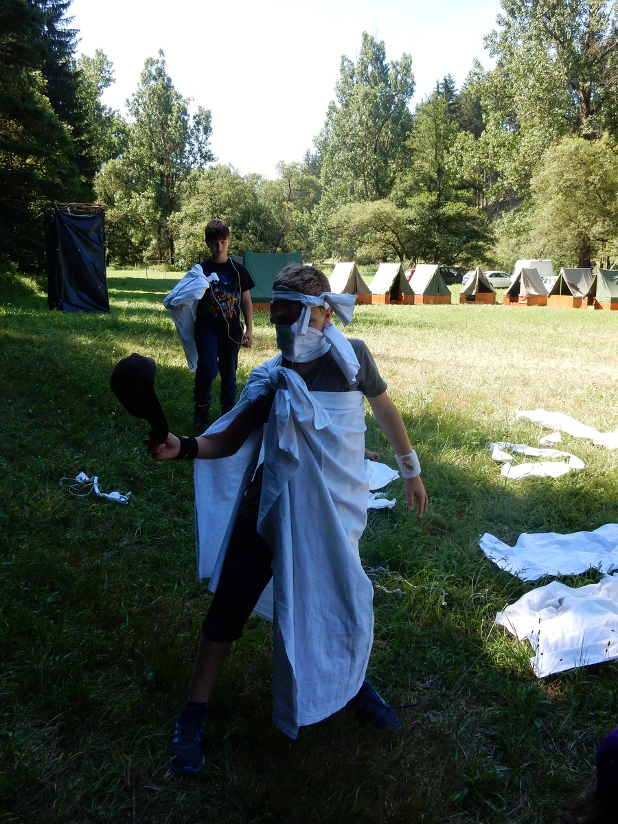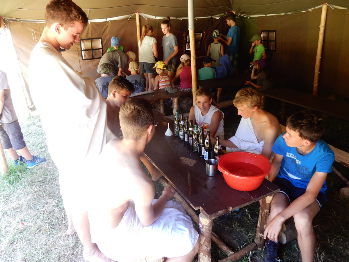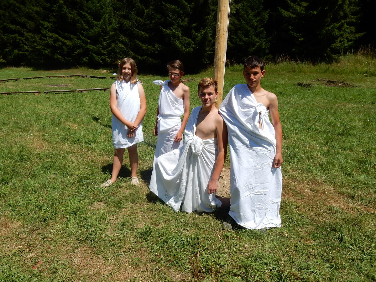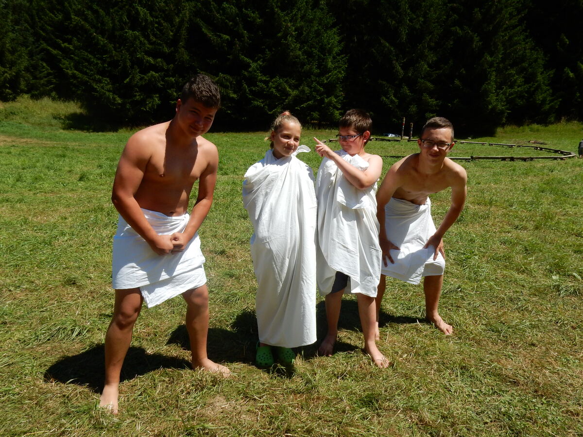 Druhý táborový den se rozjela celotáborová hra. Dopoledne mladší batikovali tógy, zatímco starší zakládali Síně předků a vábili vodní melodií Lernenskou hydru (ty flašky od piva, co jsou na fotkách jsme si půjčili v Kauflandu :-)). Odpoledne pak i straší i mladší razili k rybníku na Americe, kde byla etapa ve znamení boje s hydrou. Ochlazení ve vodě přišlo všem vhod, bylo opravdu teplo. Po večeři a sněmu probíhaly sportovní hry v táboře. Zítra nové fotky nečekejte, neb razíme na puťák a tam to s internetem bude všelijaký. Snad pozítří... Jura