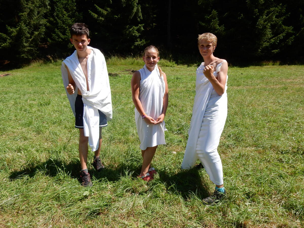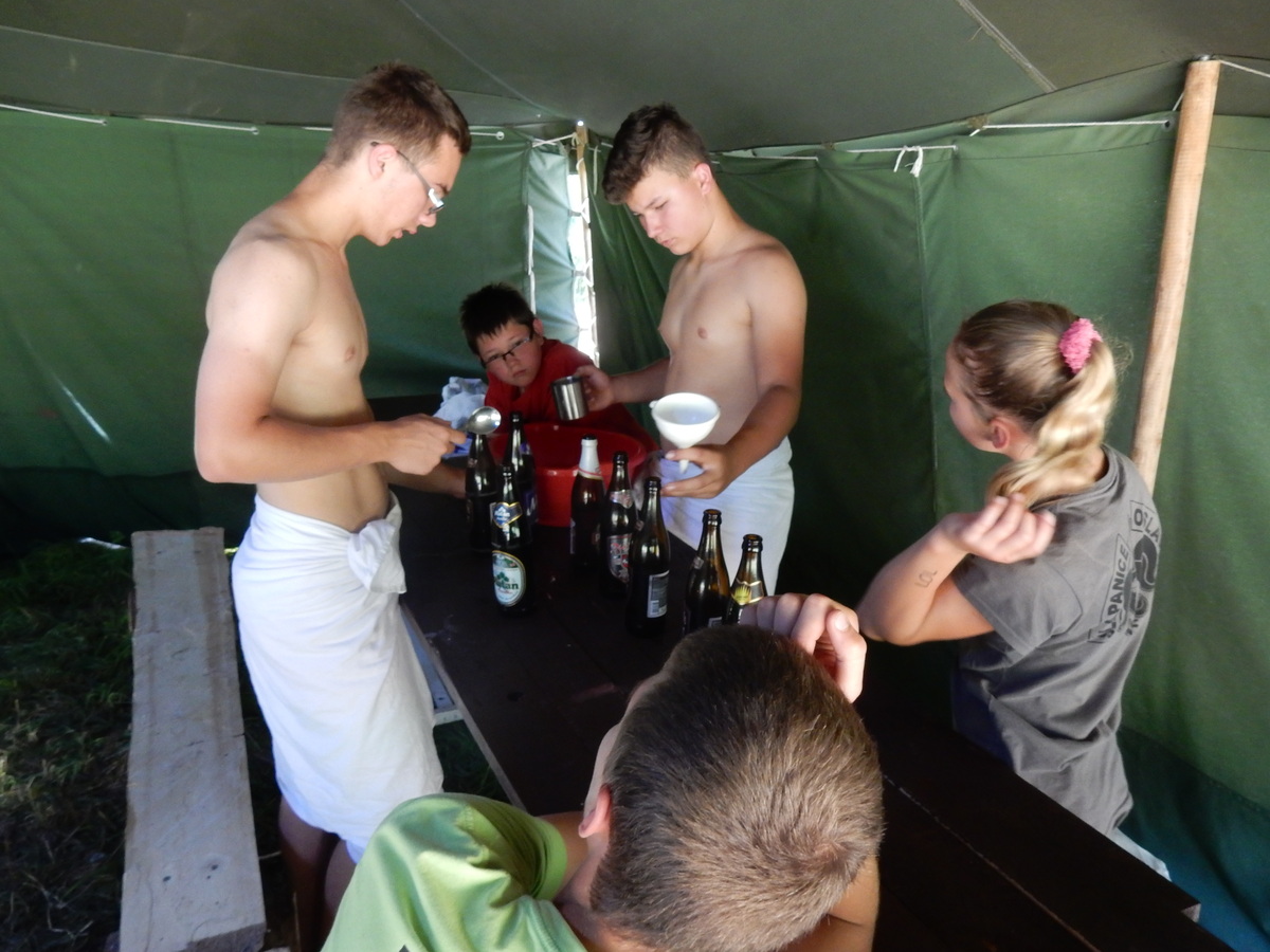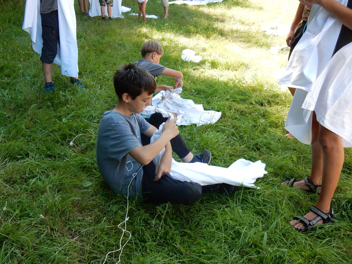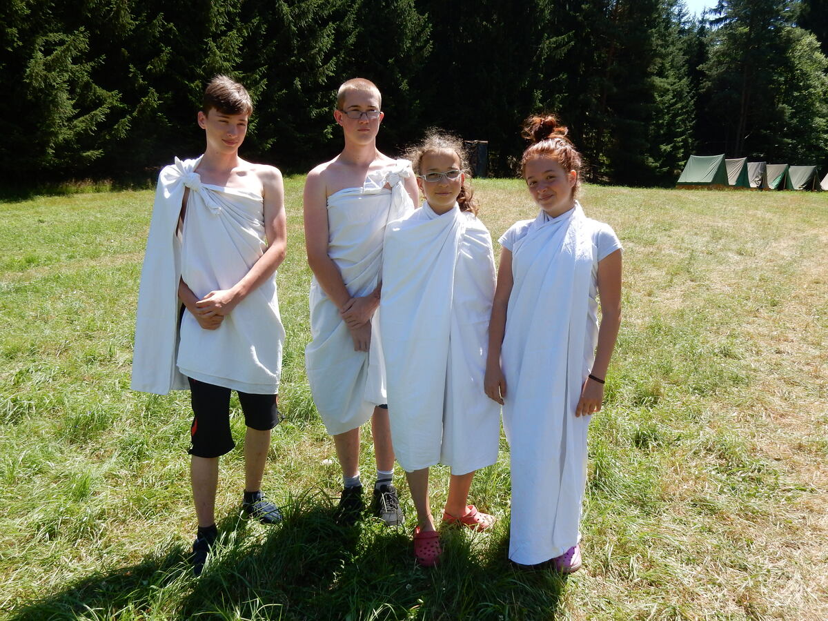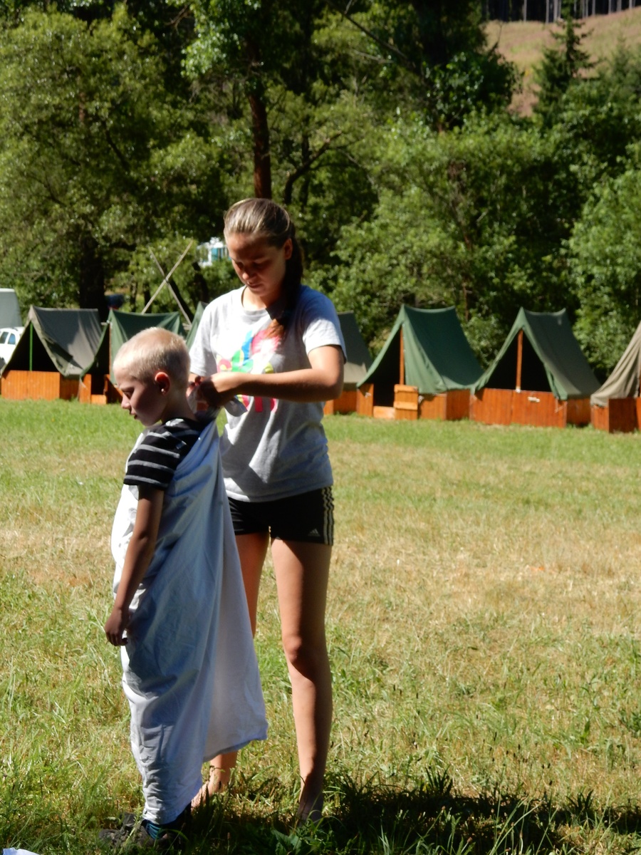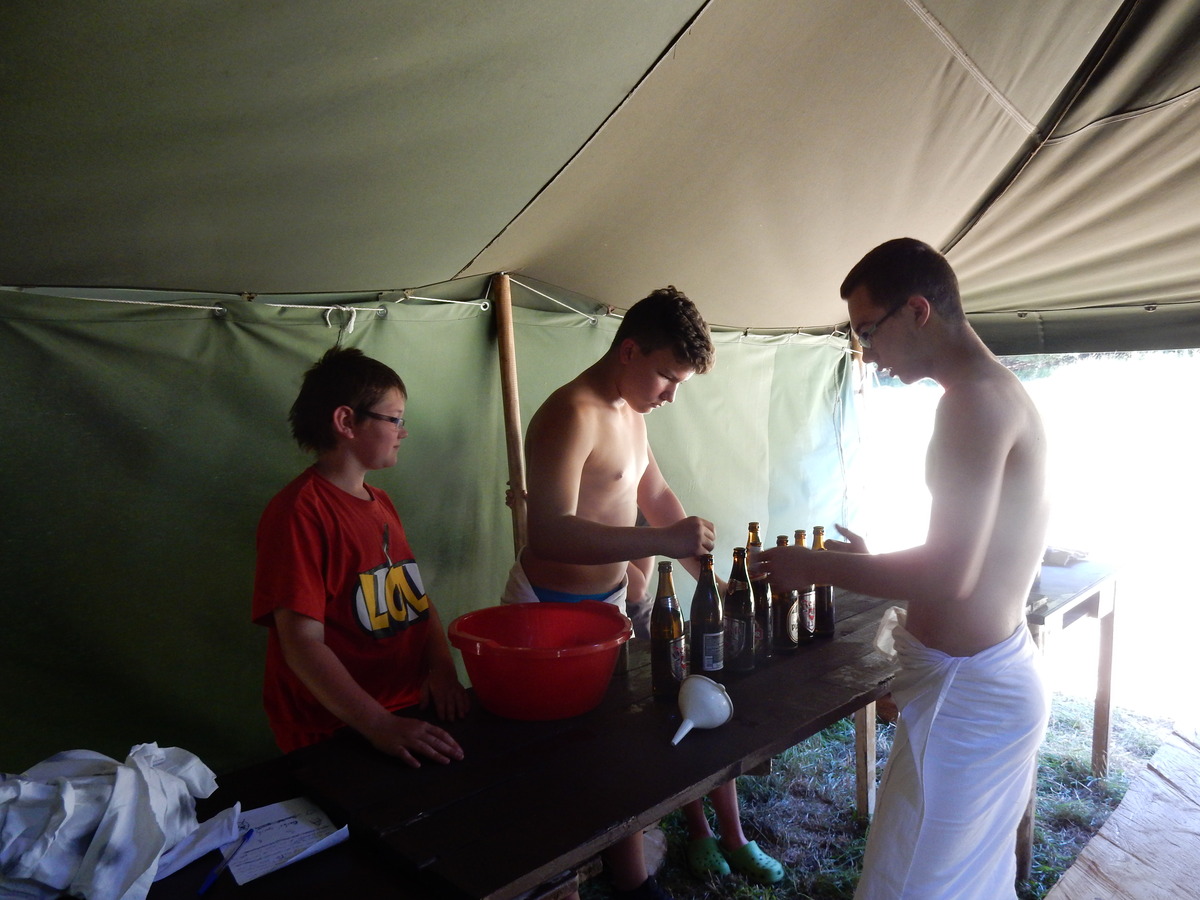 Druhý táborový den se rozjela celotáborová hra. Dopoledne mladší batikovali tógy, zatímco starší zakládali Síně předků a vábili vodní melodií Lernenskou hydru (ty flašky od piva, co jsou na fotkách jsme si půjčili v Kauflandu :-)). Odpoledne pak i straší i mladší razili k rybníku na Americe, kde byla etapa ve znamení boje s hydrou. Ochlazení ve vodě přišlo všem vhod, bylo opravdu teplo. Po večeři a sněmu probíhaly sportovní hry v táboře. Zítra nové fotky nečekejte, neb razíme na puťák a tam to s internetem bude všelijaký. Snad pozítří... Jura