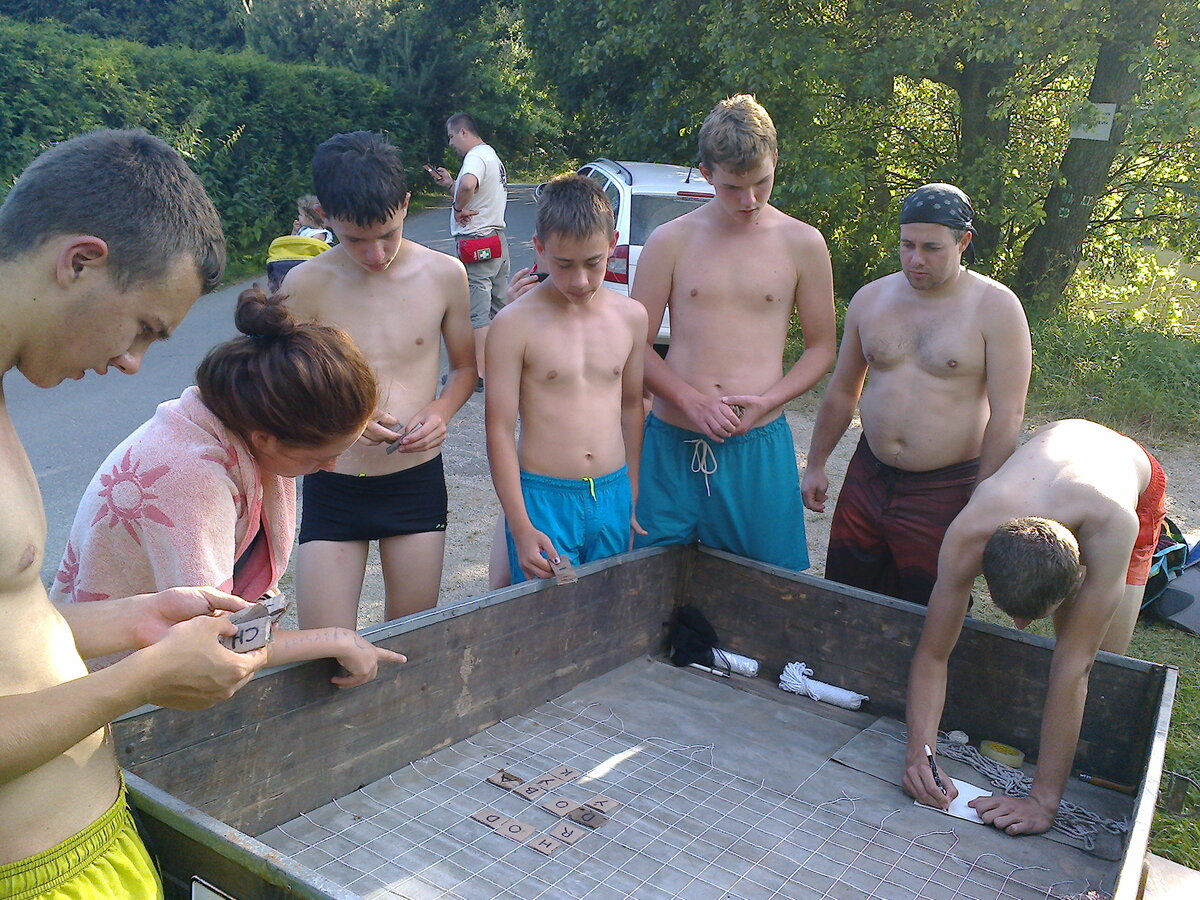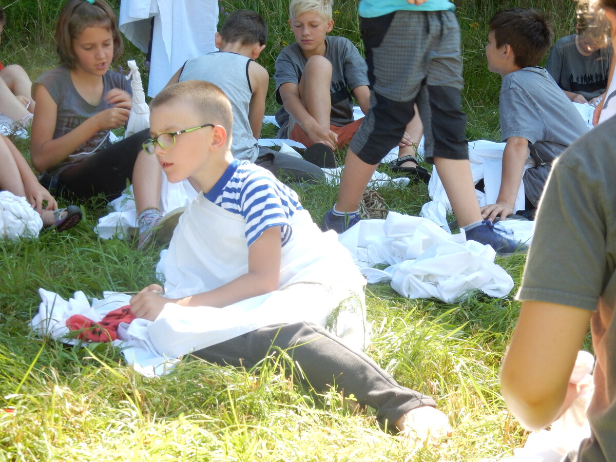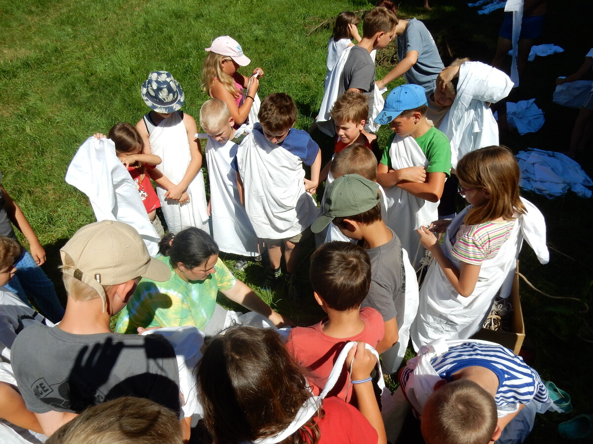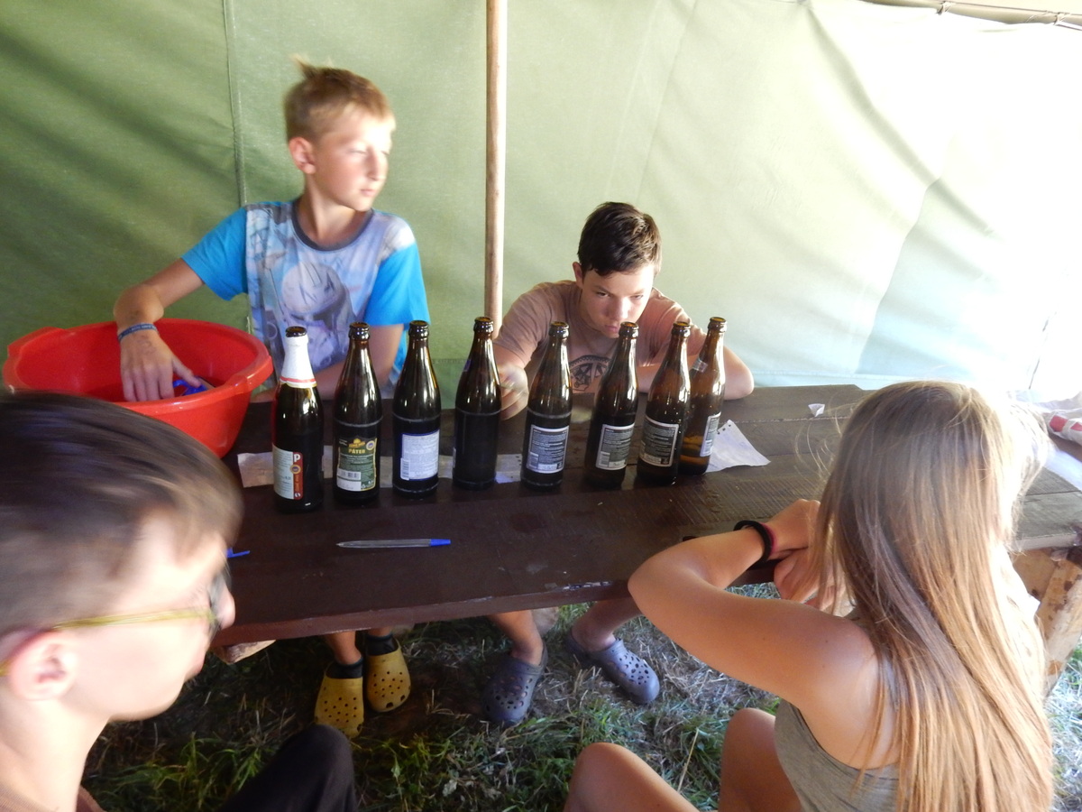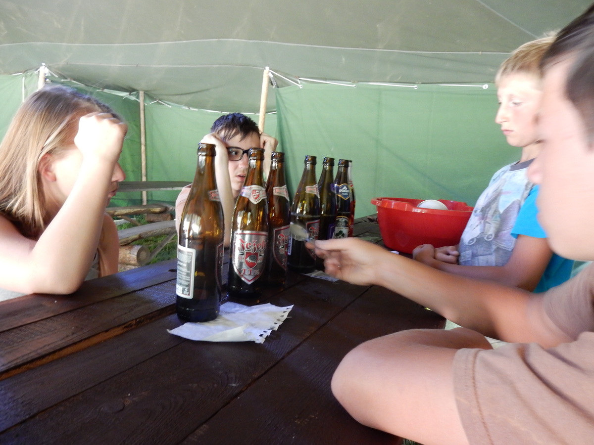 Druhý táborový den se rozjela celotáborová hra. Dopoledne mladší batikovali tógy, zatímco starší zakládali Síně předků a vábili vodní melodií Lernenskou hydru (ty flašky od piva, co jsou na fotkách jsme si půjčili v Kauflandu :-)). Odpoledne pak i straší i mladší razili k rybníku na Americe, kde byla etapa ve znamení boje s hydrou. Ochlazení ve vodě přišlo všem vhod, bylo opravdu teplo. Po večeři a sněmu probíhaly sportovní hry v táboře. Zítra nové fotky nečekejte, neb razíme na puťák a tam to s internetem bude všelijaký. Snad pozítří... Jura