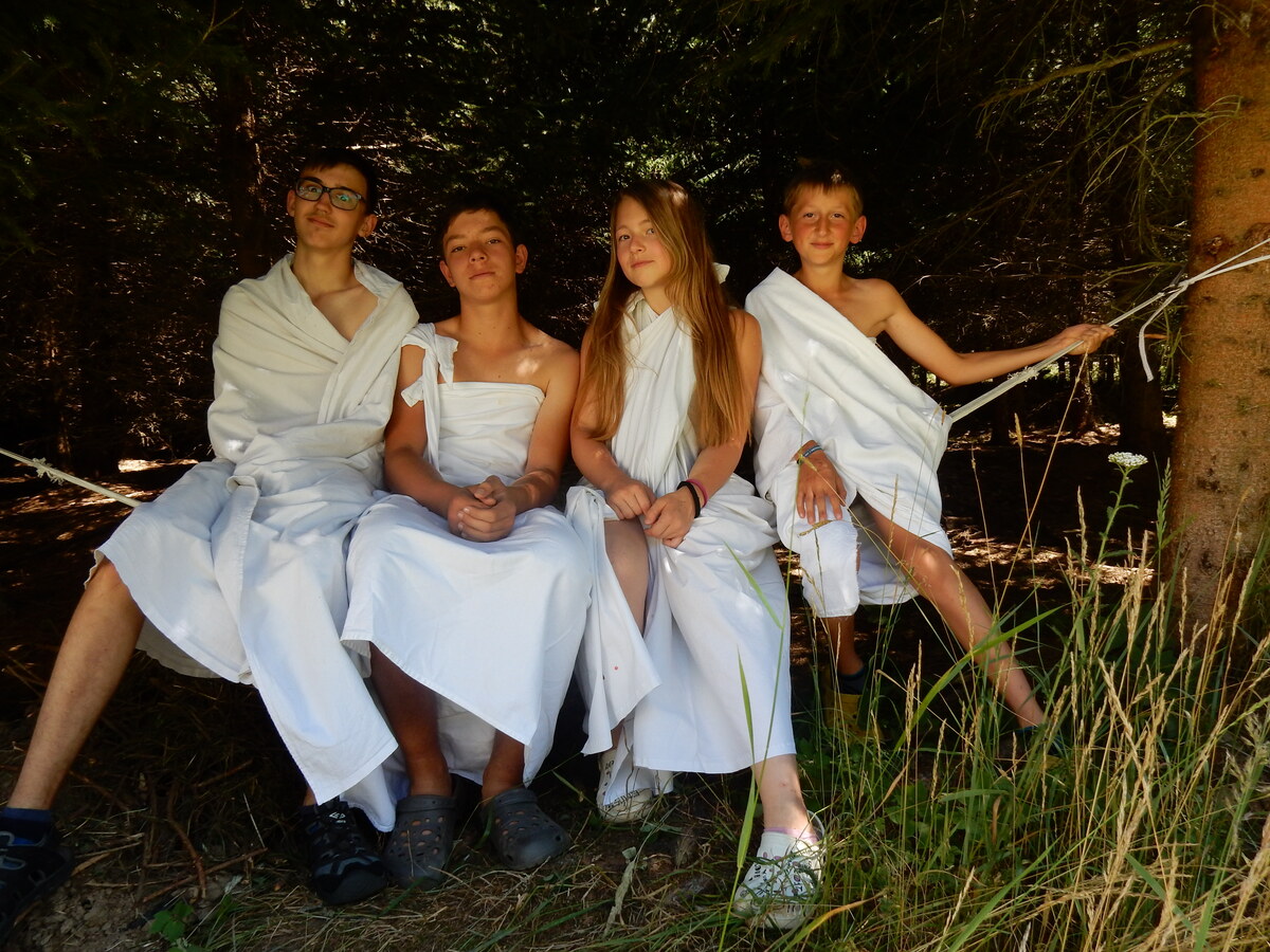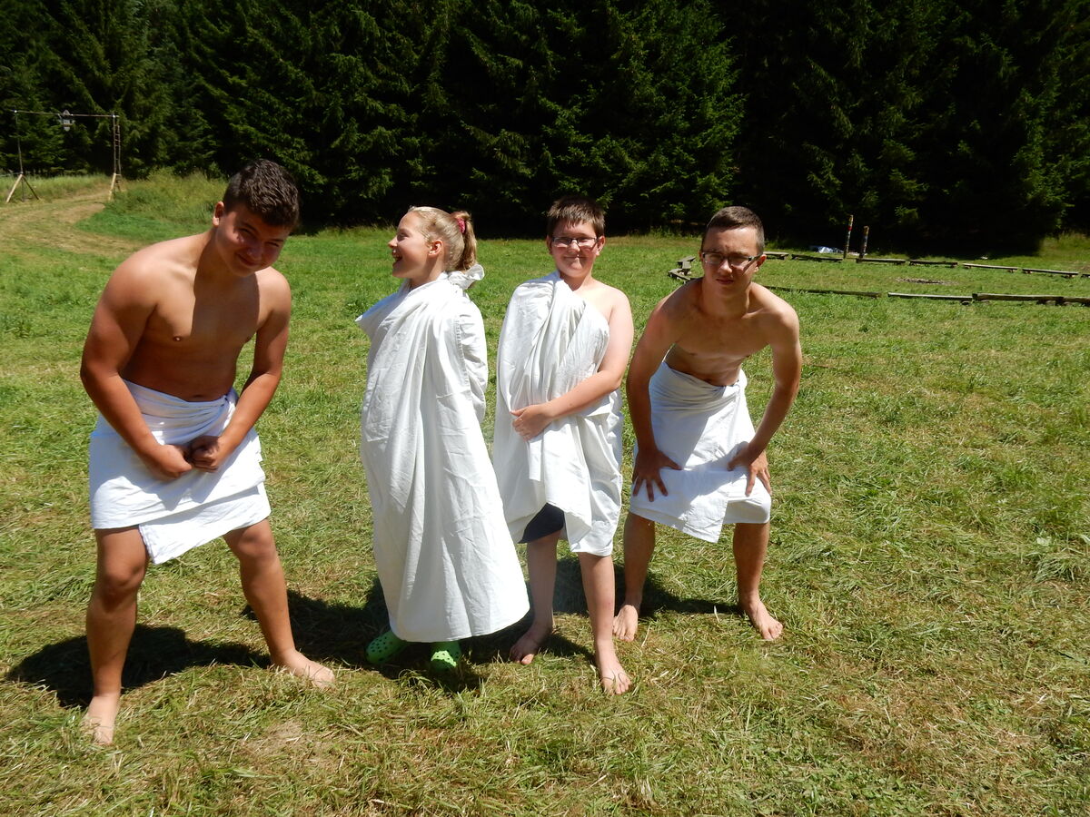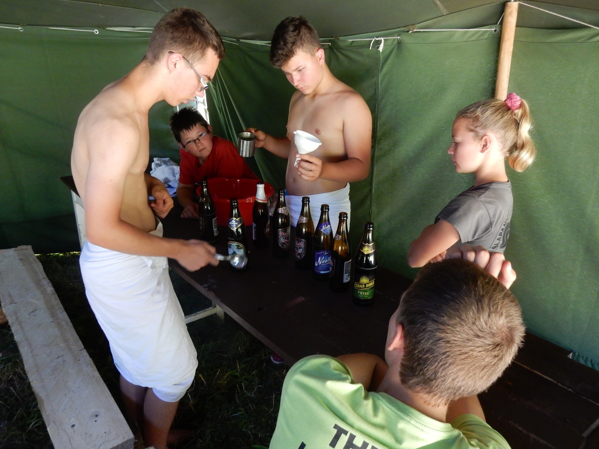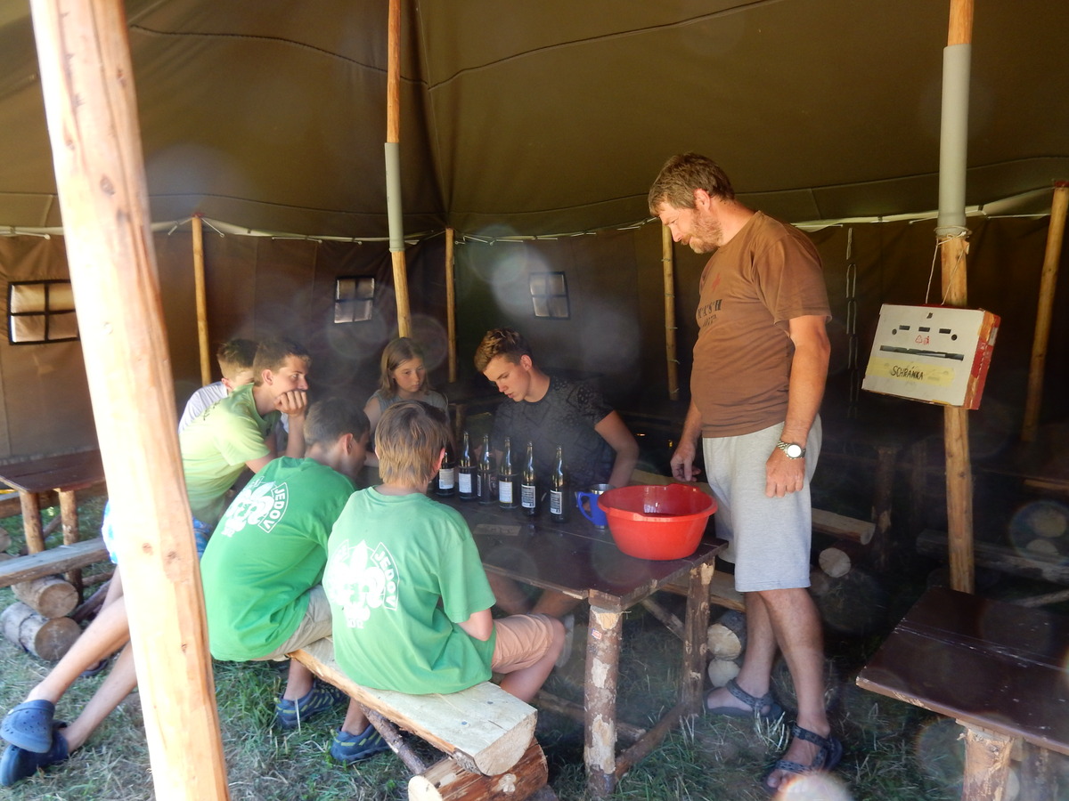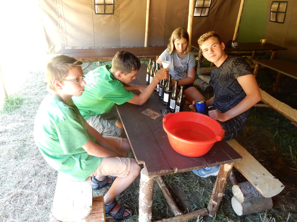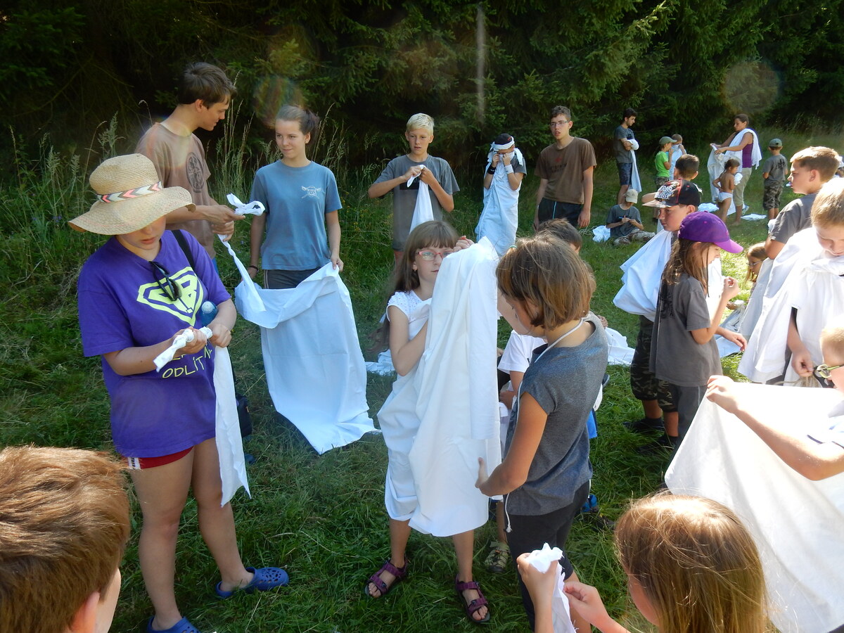 Druhý táborový den se rozjela celotáborová hra. Dopoledne mladší batikovali tógy, zatímco starší zakládali Síně předků a vábili vodní melodií Lernenskou hydru (ty flašky od piva, co jsou na fotkách jsme si půjčili v Kauflandu :-)). Odpoledne pak i straší i mladší razili k rybníku na Americe, kde byla etapa ve znamení boje s hydrou. Ochlazení ve vodě přišlo všem vhod, bylo opravdu teplo. Po večeři a sněmu probíhaly sportovní hry v táboře. Zítra nové fotky nečekejte, neb razíme na puťák a tam to s internetem bude všelijaký. Snad pozítří... Jura