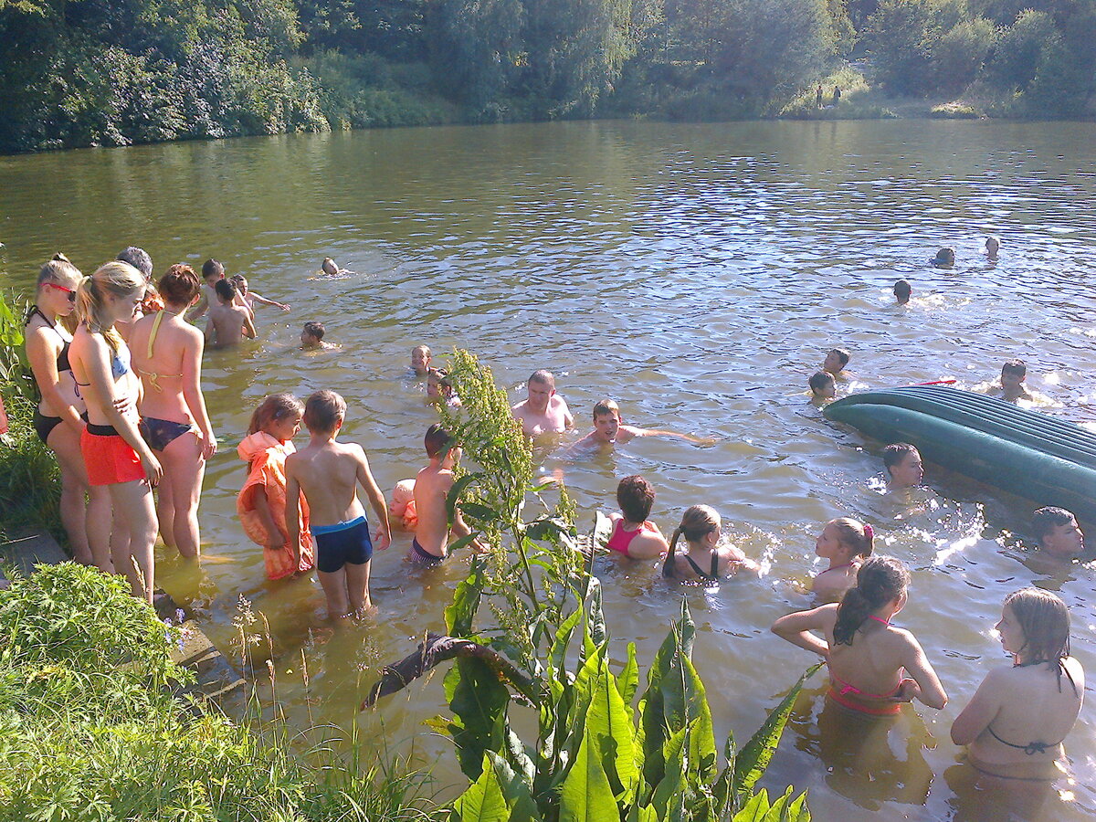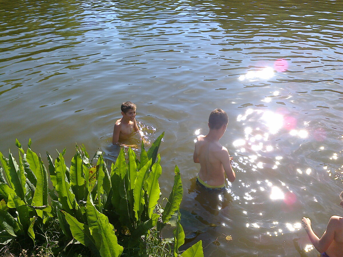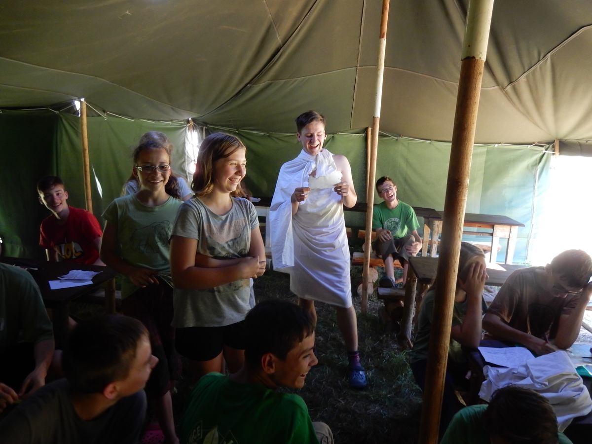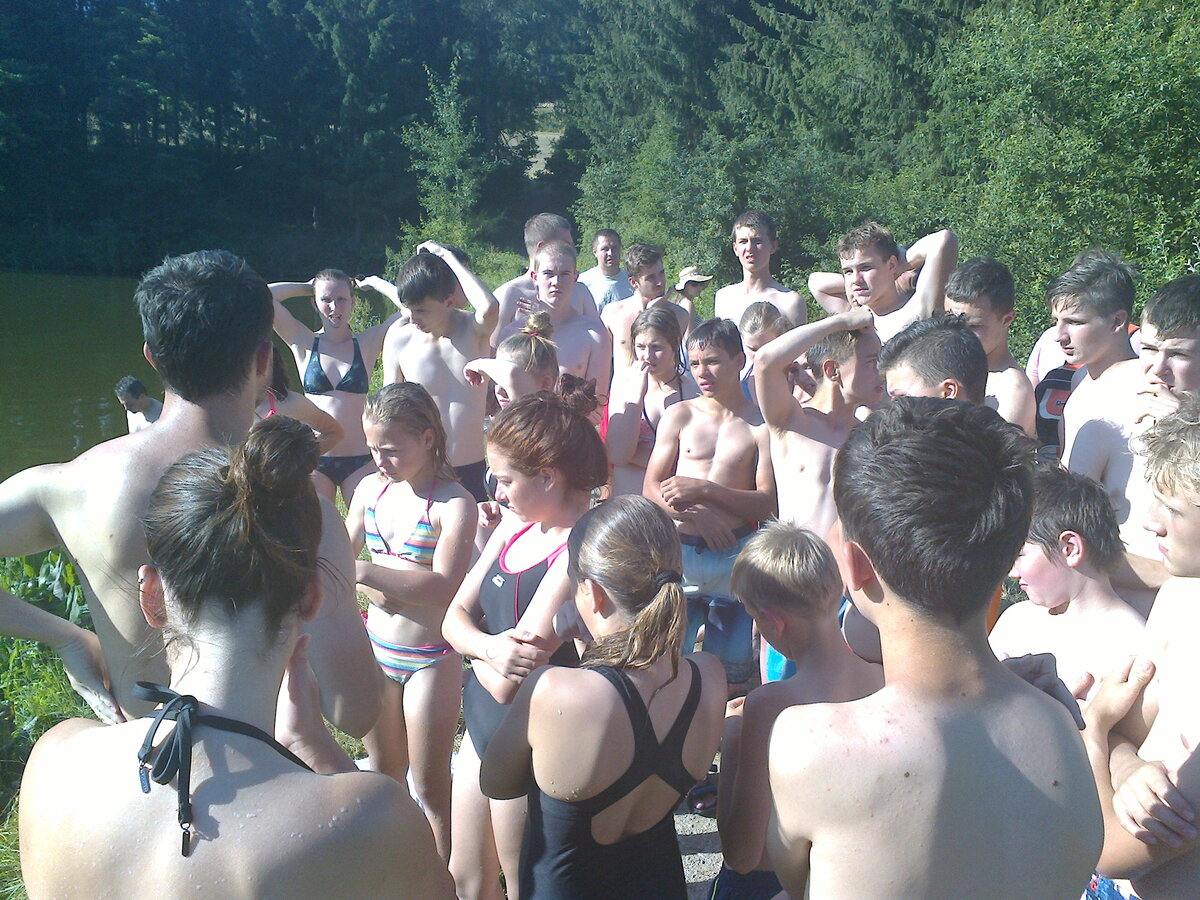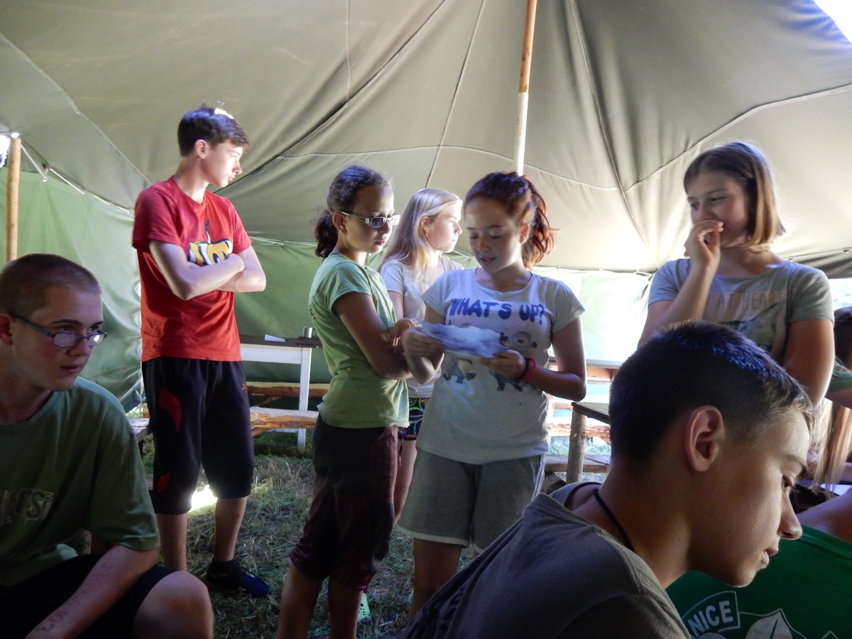 Druhý táborový den se rozjela celotáborová hra. Dopoledne mladší batikovali tógy, zatímco starší zakládali Síně předků a vábili vodní melodií Lernenskou hydru (ty flašky od piva, co jsou na fotkách jsme si půjčili v Kauflandu :-)). Odpoledne pak i straší i mladší razili k rybníku na Americe, kde byla etapa ve znamení boje s hydrou. Ochlazení ve vodě přišlo všem vhod, bylo opravdu teplo. Po večeři a sněmu probíhaly sportovní hry v táboře. Zítra nové fotky nečekejte, neb razíme na puťák a tam to s internetem bude všelijaký. Snad pozítří... Jura
