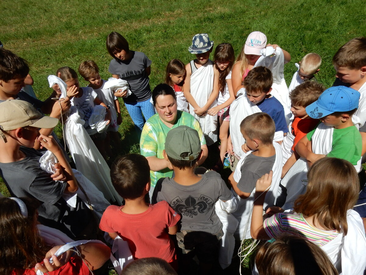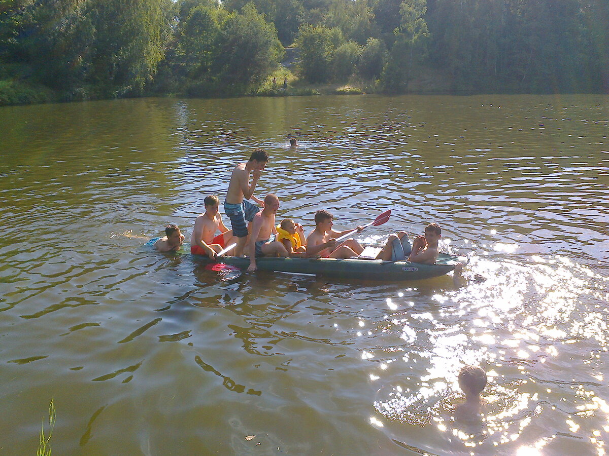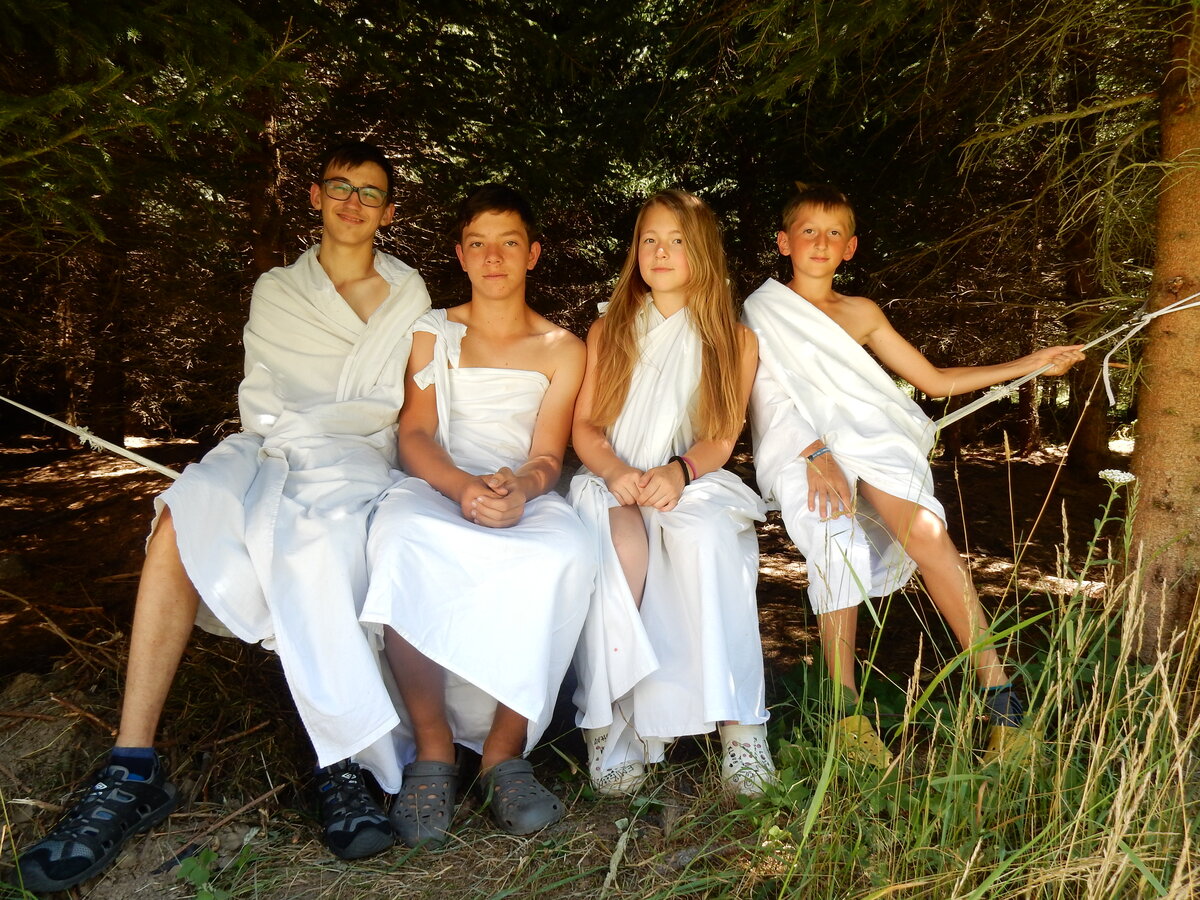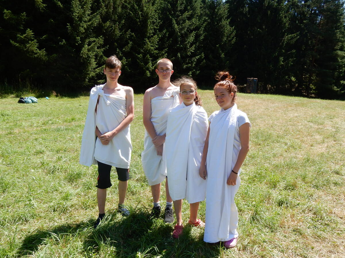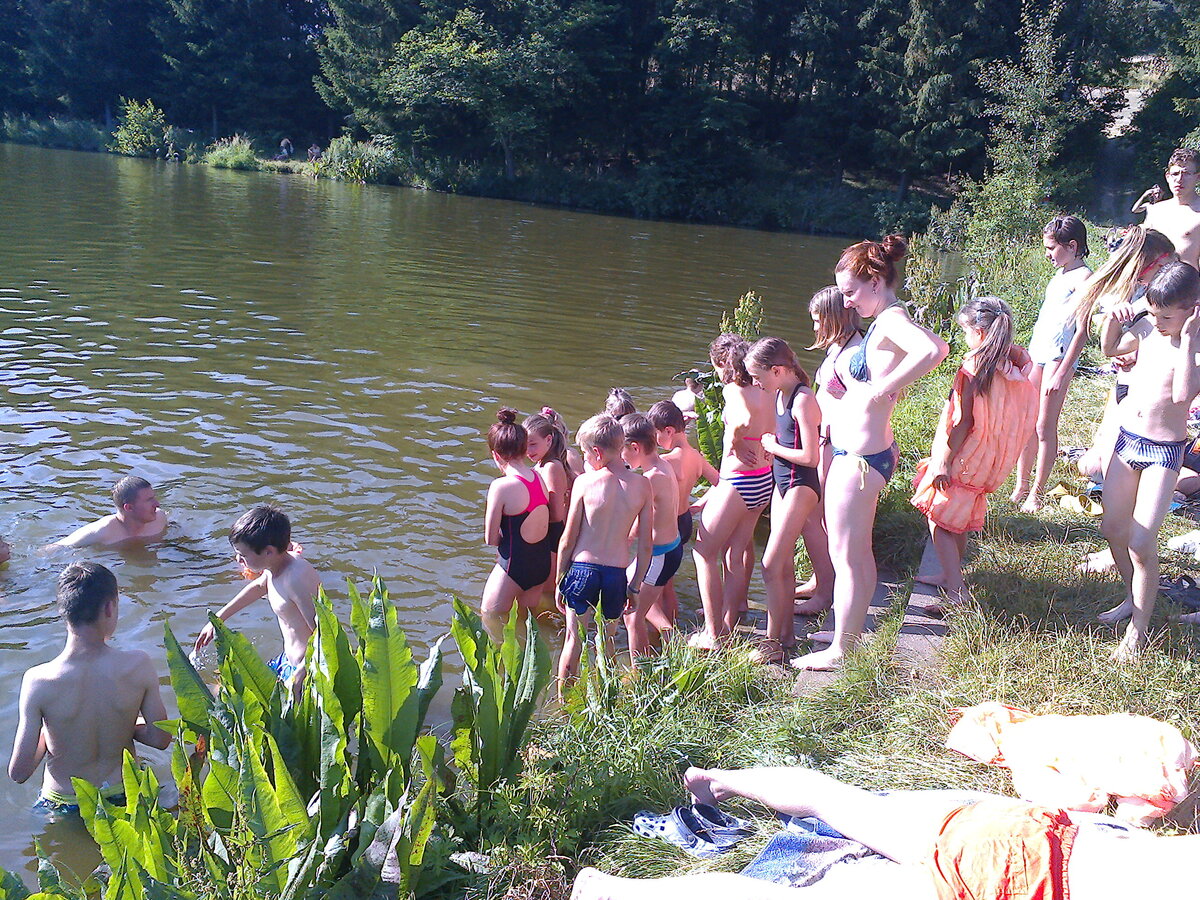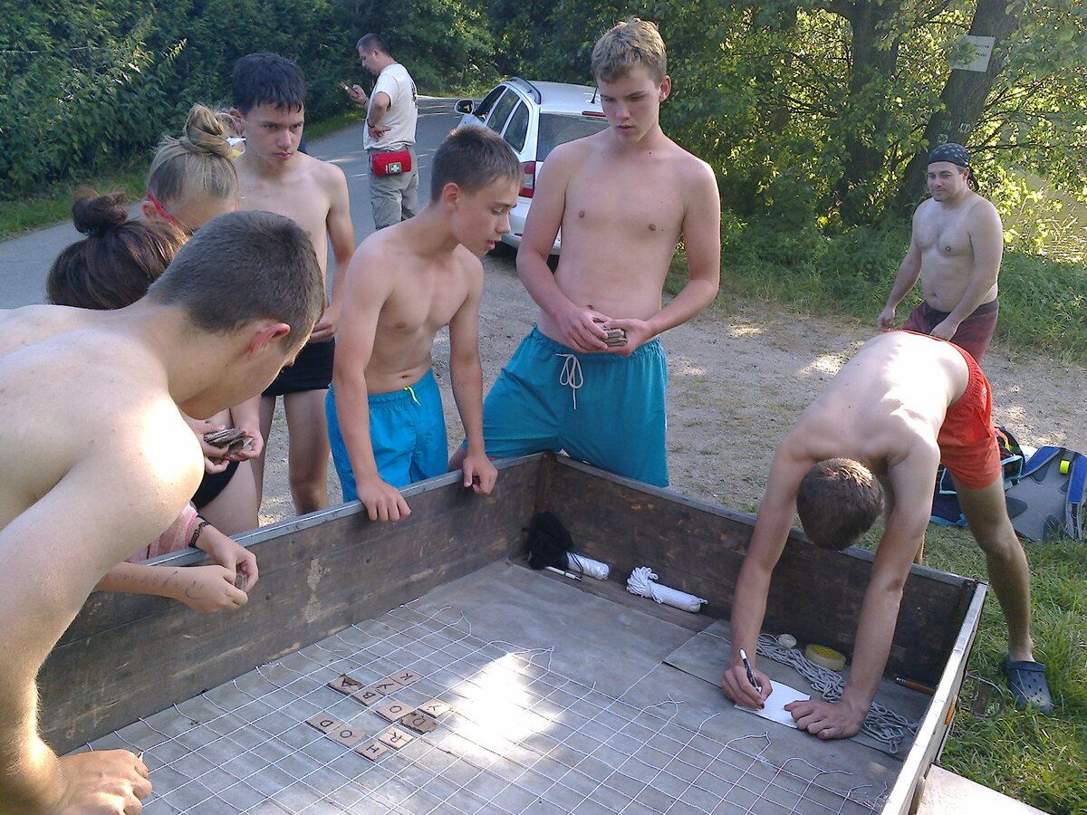 Druhý táborový den se rozjela celotáborová hra. Dopoledne mladší batikovali tógy, zatímco starší zakládali Síně předků a vábili vodní melodií Lernenskou hydru (ty flašky od piva, co jsou na fotkách jsme si půjčili v Kauflandu :-)). Odpoledne pak i straší i mladší razili k rybníku na Americe, kde byla etapa ve znamení boje s hydrou. Ochlazení ve vodě přišlo všem vhod, bylo opravdu teplo. Po večeři a sněmu probíhaly sportovní hry v táboře. Zítra nové fotky nečekejte, neb razíme na puťák a tam to s internetem bude všelijaký. Snad pozítří... Jura