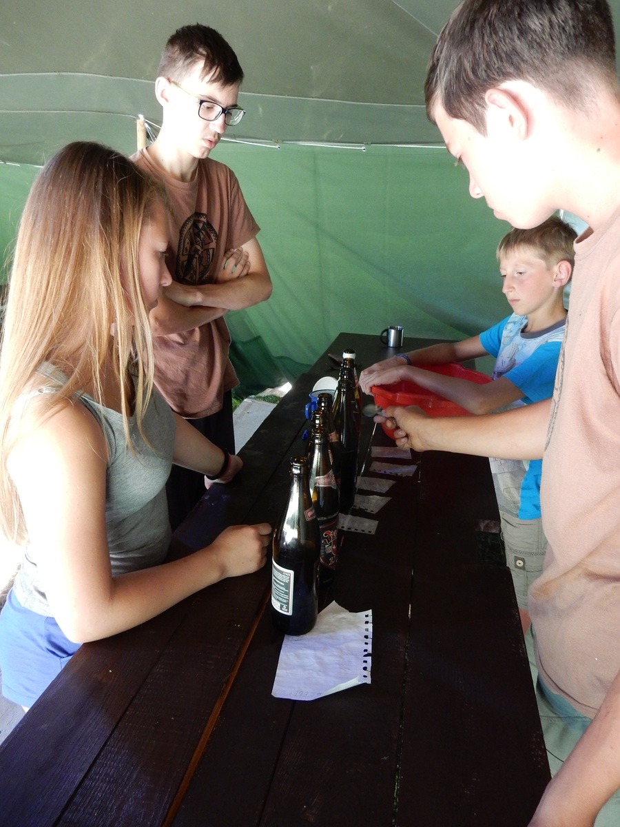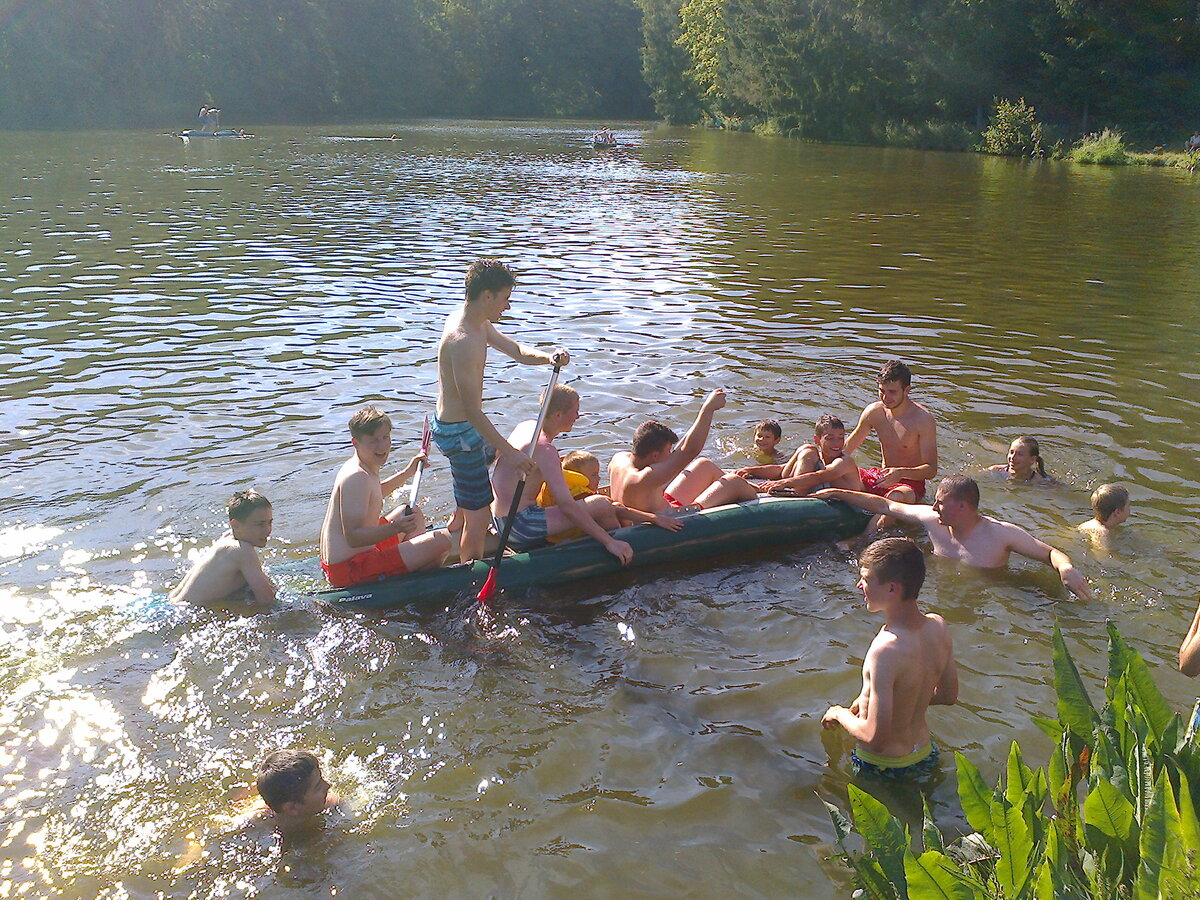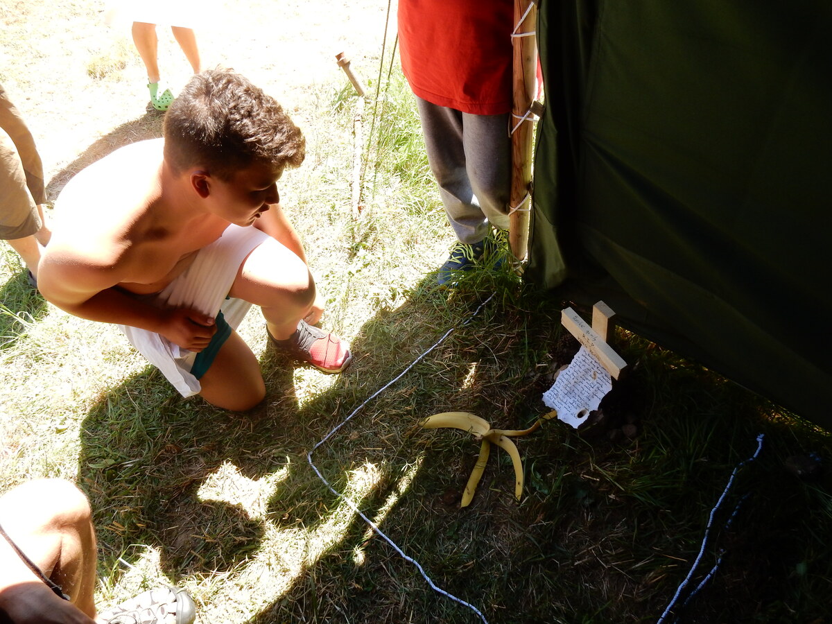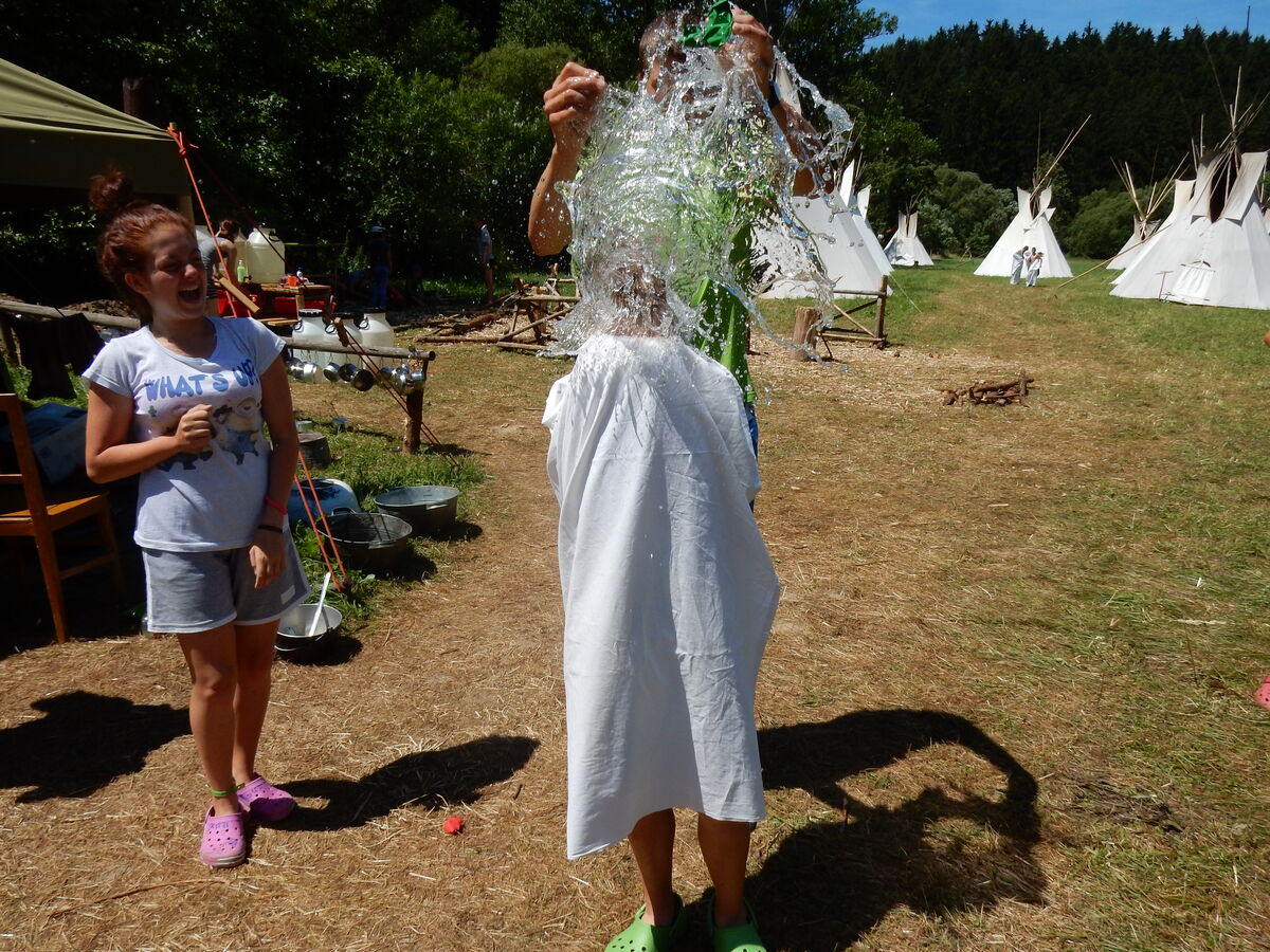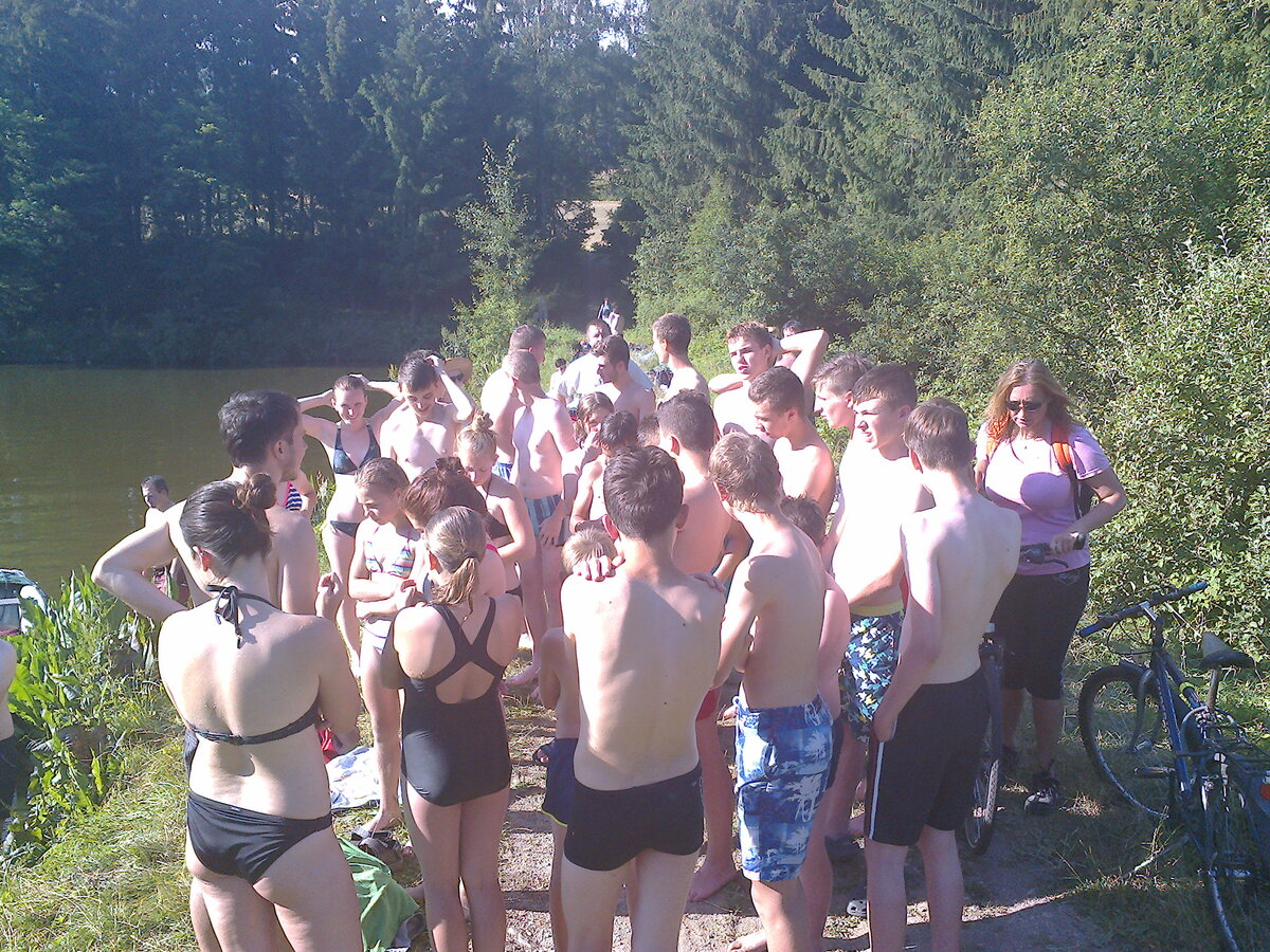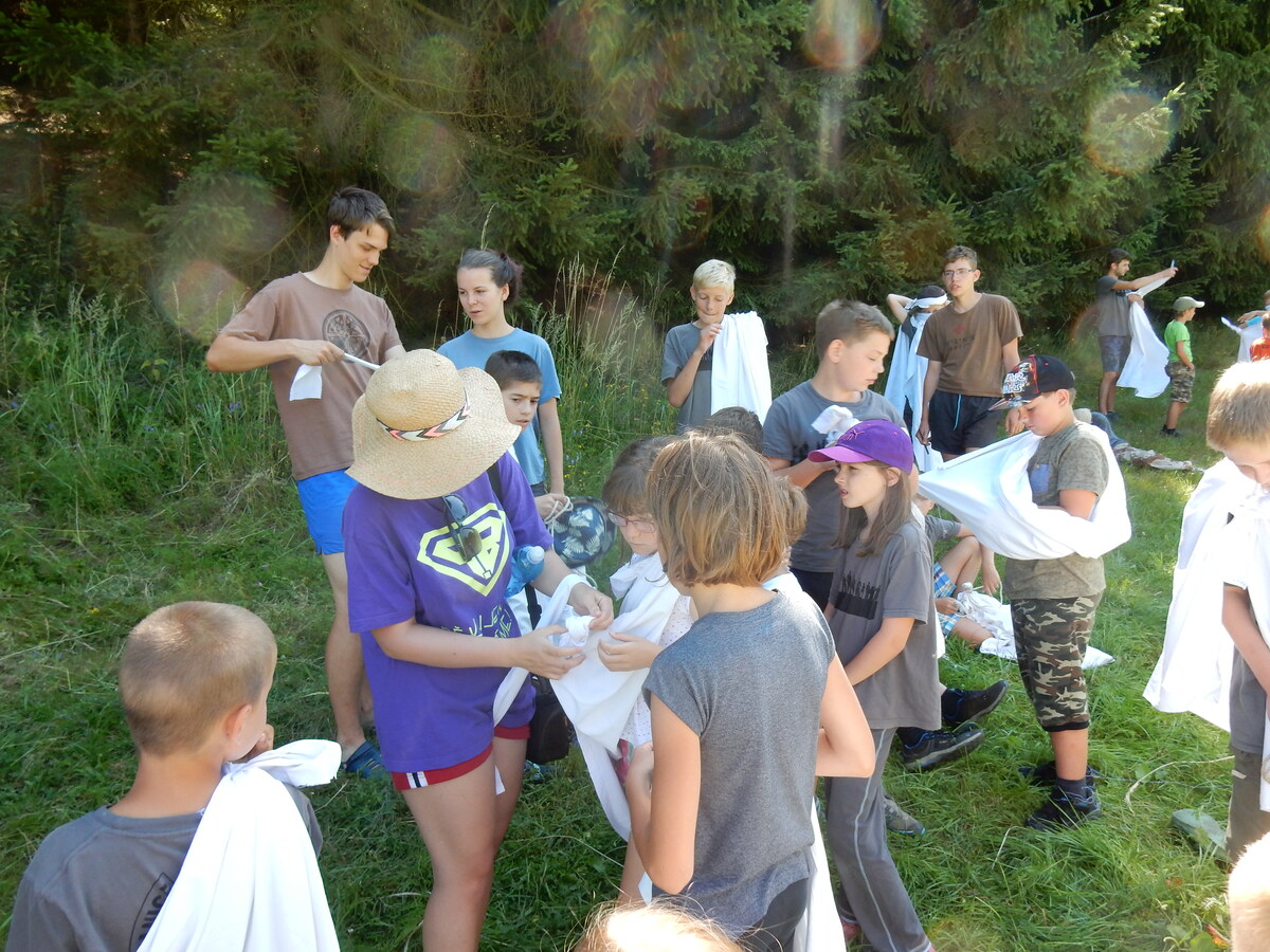 Druhý táborový den se rozjela celotáborová hra. Dopoledne mladší batikovali tógy, zatímco starší zakládali Síně předků a vábili vodní melodií Lernenskou hydru (ty flašky od piva, co jsou na fotkách jsme si půjčili v Kauflandu :-)). Odpoledne pak i straší i mladší razili k rybníku na Americe, kde byla etapa ve znamení boje s hydrou. Ochlazení ve vodě přišlo všem vhod, bylo opravdu teplo. Po večeři a sněmu probíhaly sportovní hry v táboře. Zítra nové fotky nečekejte, neb razíme na puťák a tam to s internetem bude všelijaký. Snad pozítří... Jura