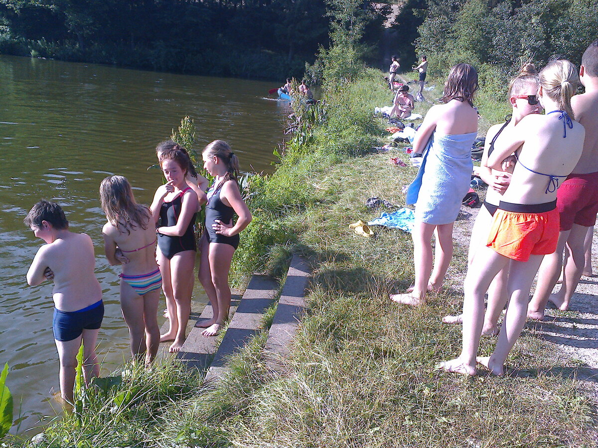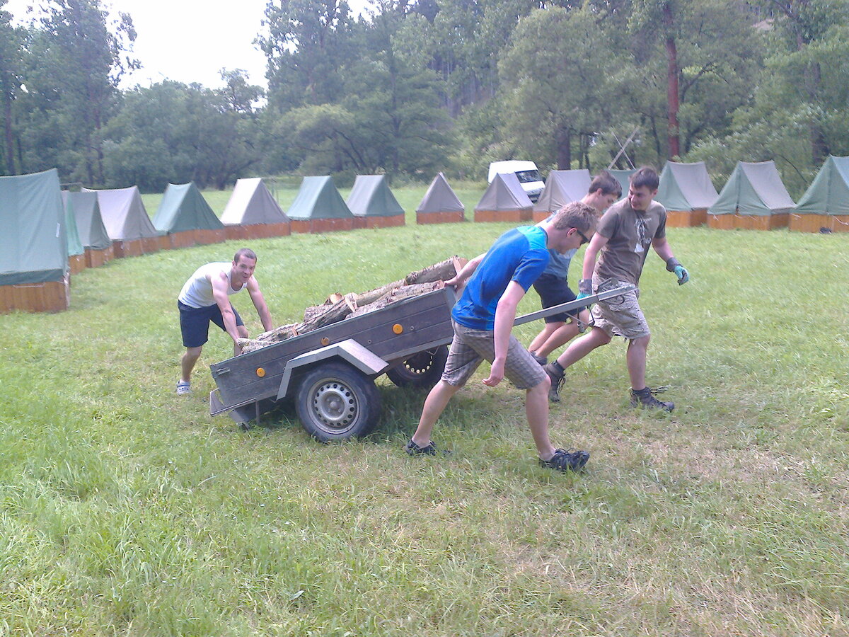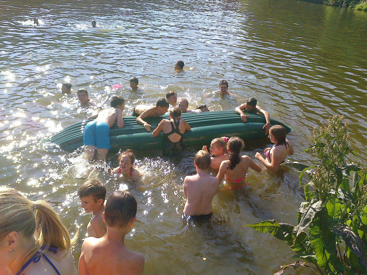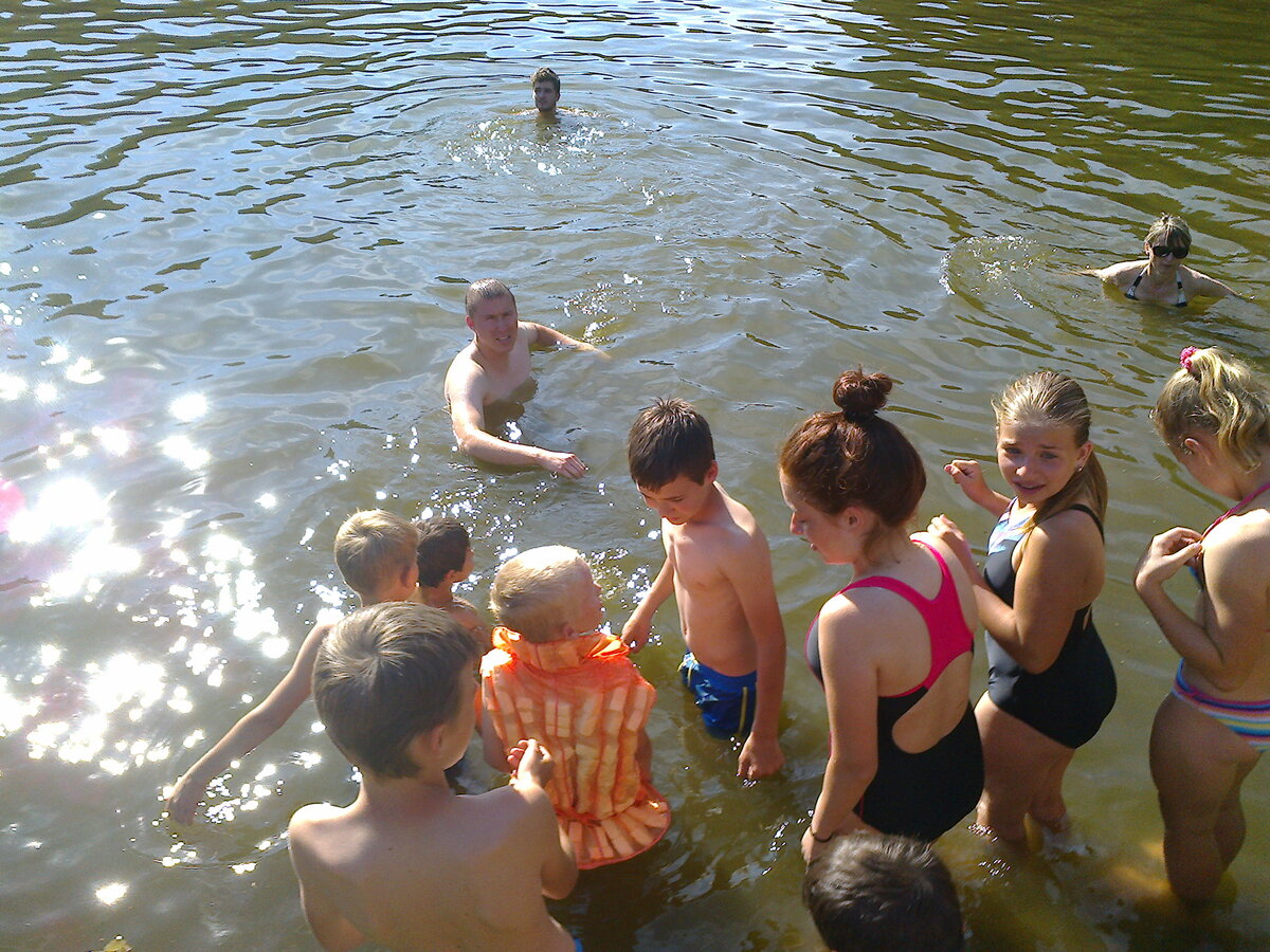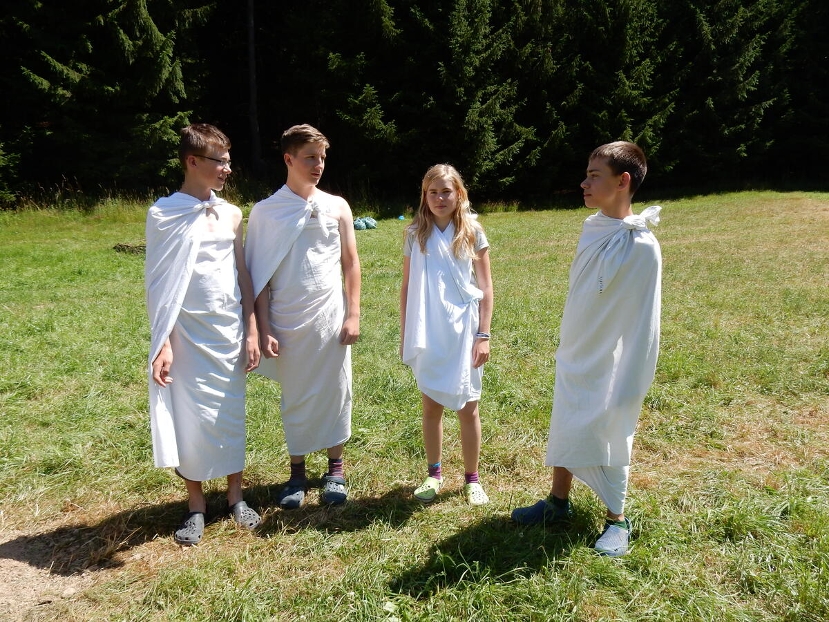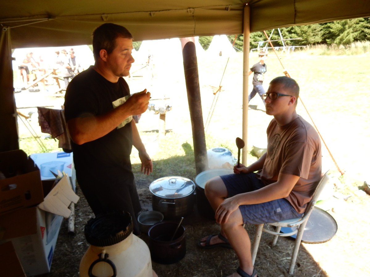 Druhý táborový den se rozjela celotáborová hra. Dopoledne mladší batikovali tógy, zatímco starší zakládali Síně předků a vábili vodní melodií Lernenskou hydru (ty flašky od piva, co jsou na fotkách jsme si půjčili v Kauflandu :-)). Odpoledne pak i straší i mladší razili k rybníku na Americe, kde byla etapa ve znamení boje s hydrou. Ochlazení ve vodě přišlo všem vhod, bylo opravdu teplo. Po večeři a sněmu probíhaly sportovní hry v táboře. Zítra nové fotky nečekejte, neb razíme na puťák a tam to s internetem bude všelijaký. Snad pozítří... Jura