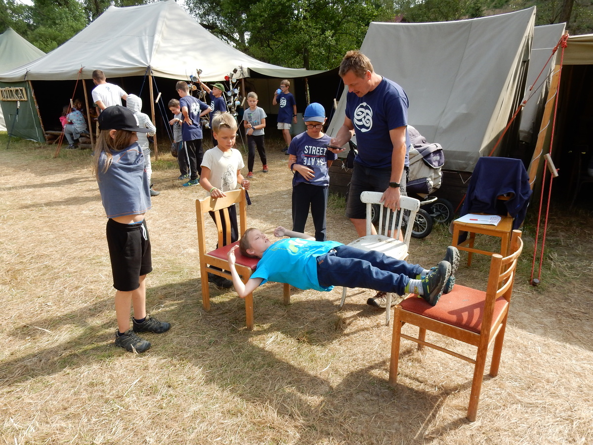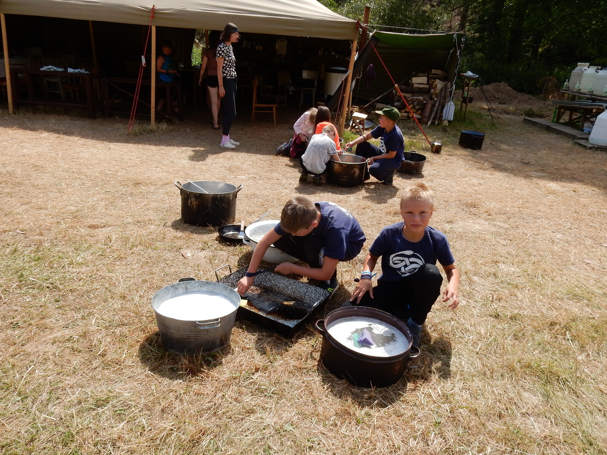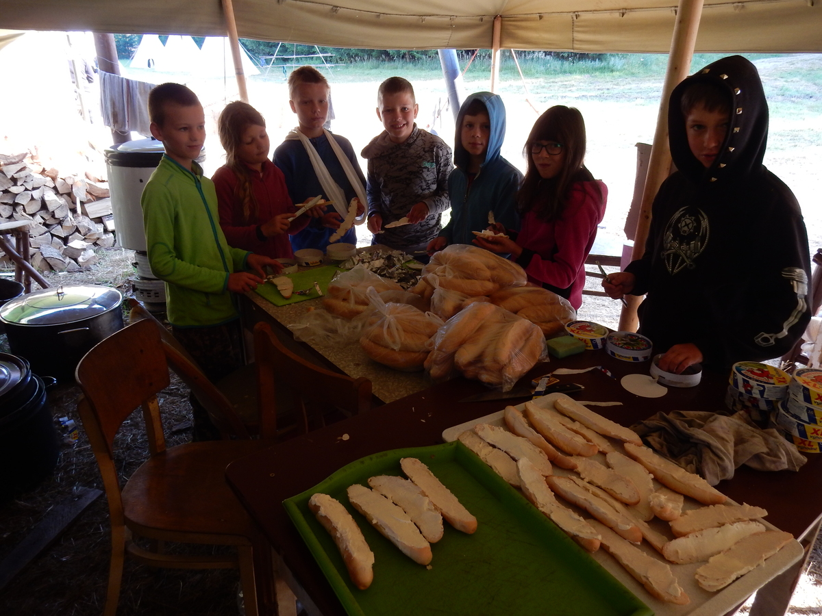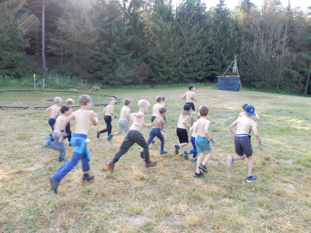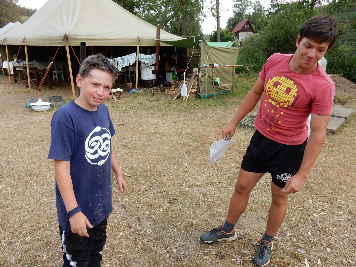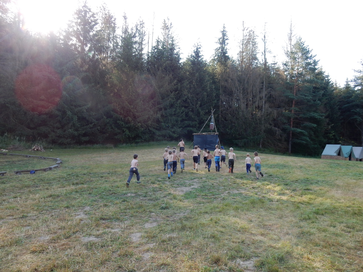 Třetí táborový den započal rozcvičkou, což některé mamánkovatější táborníky trošku překvapilo. Zvládli ji ale všichni. Dopoledne se konala velká bojovka v lese, pašeráci se snažili pronést územím obrů co nejvíce věcí. Odpoledne pak probíhalo ve znamení družinového programu a večer se zpívalo u ohně. Jo - a taky se vrátili z puťáků skautky a skauti, všichni živí a zdraví.