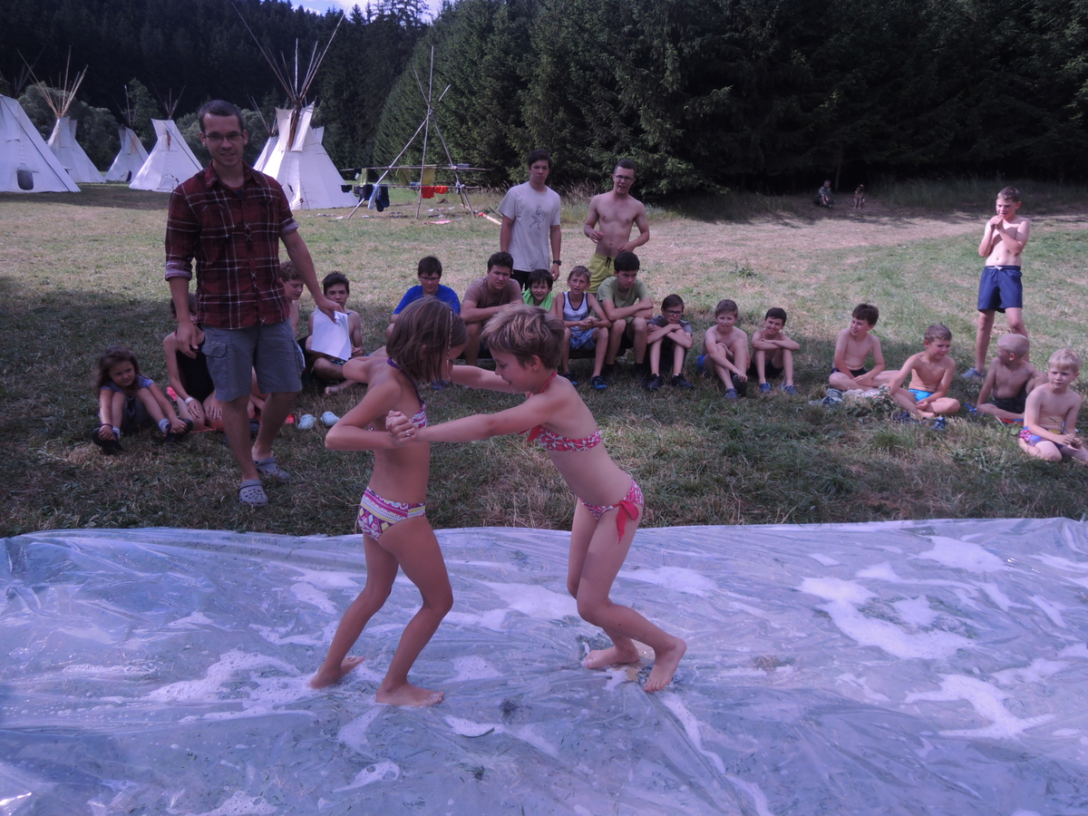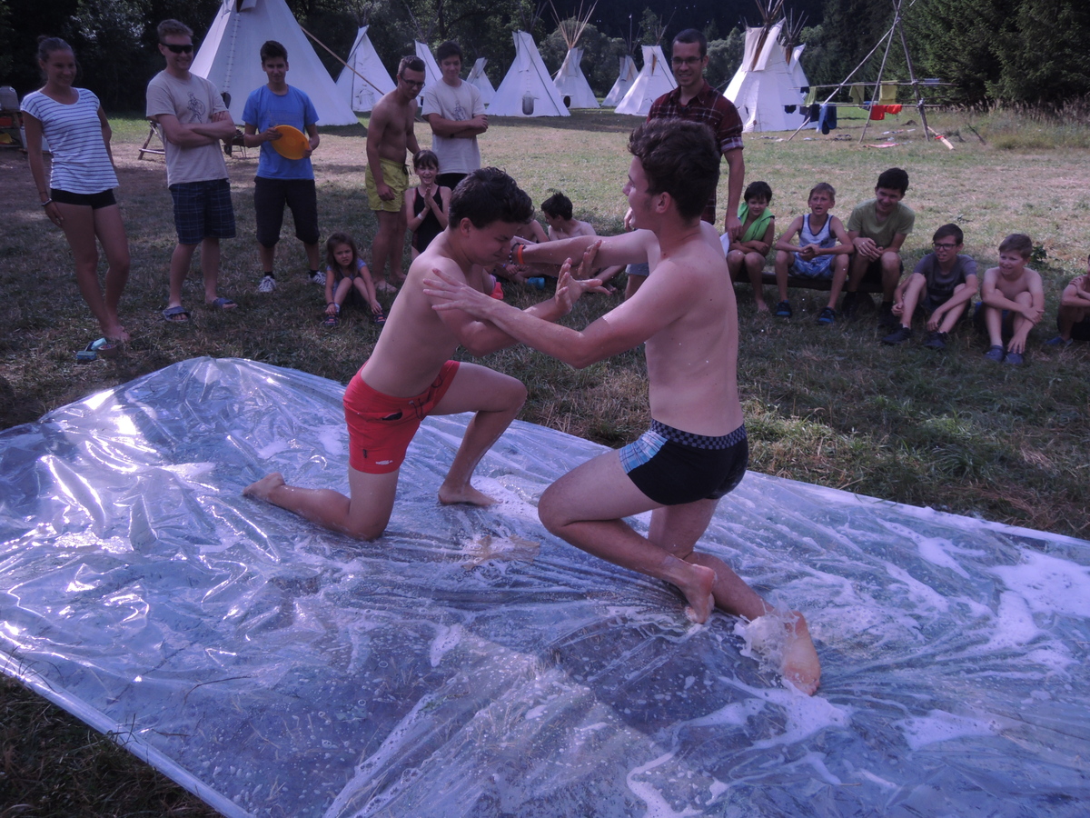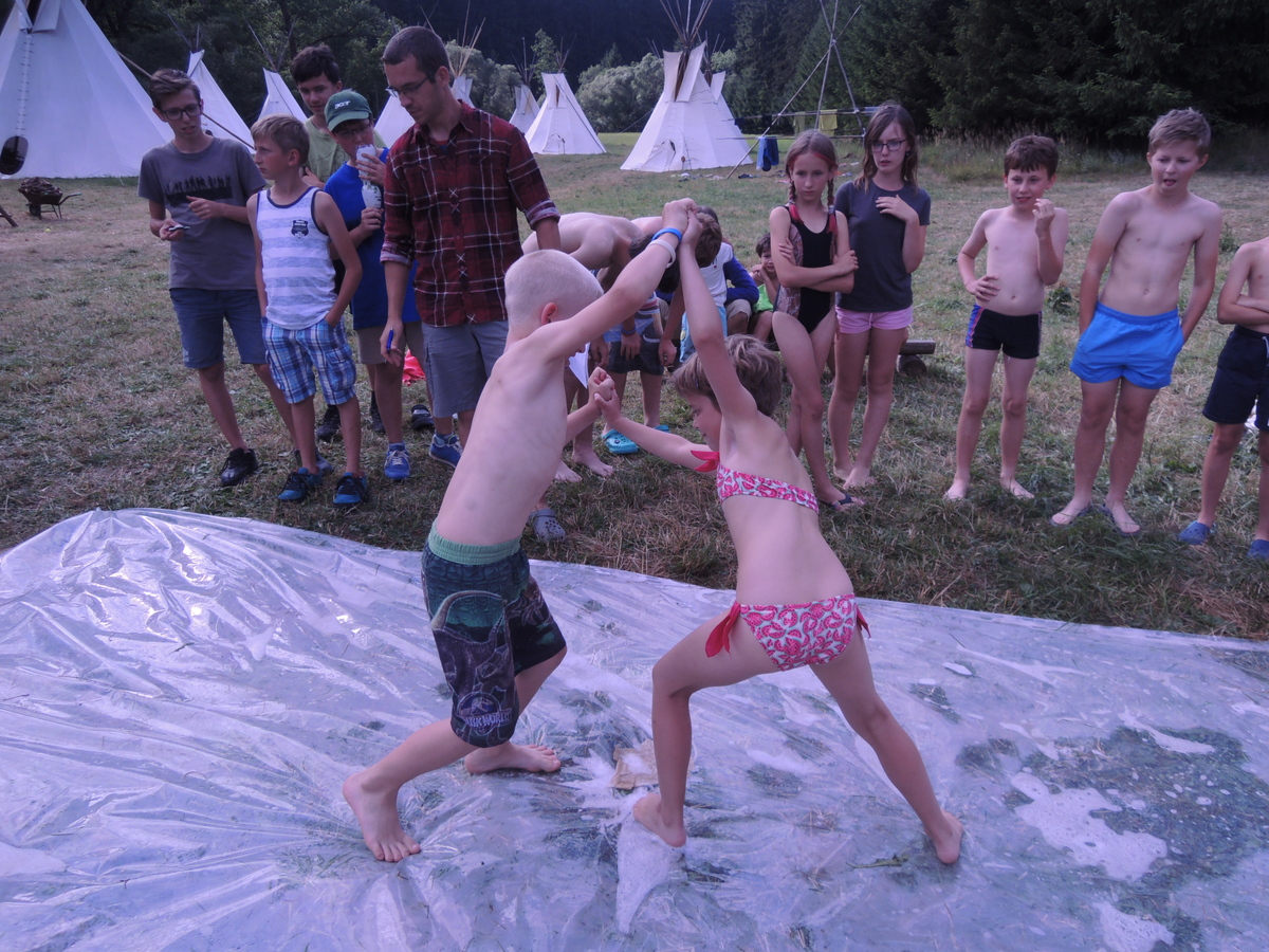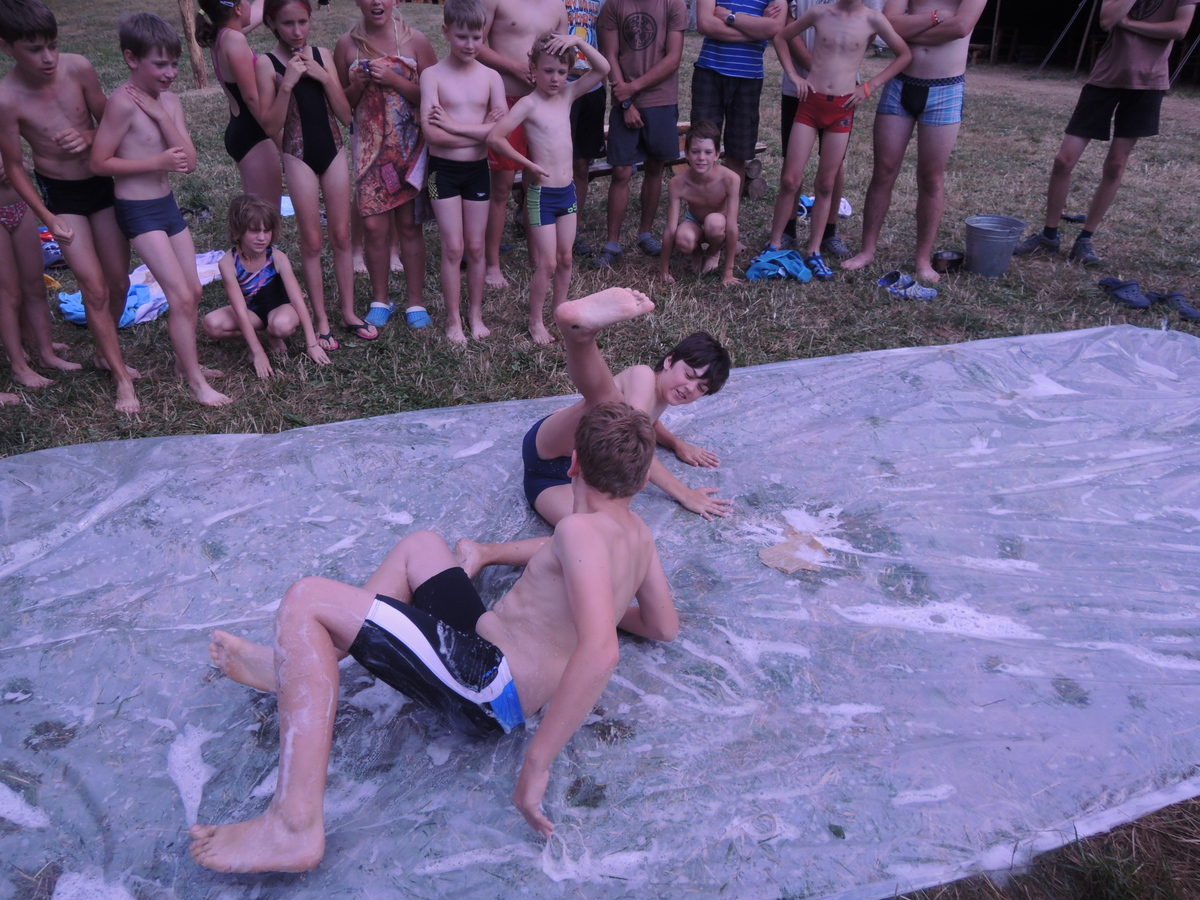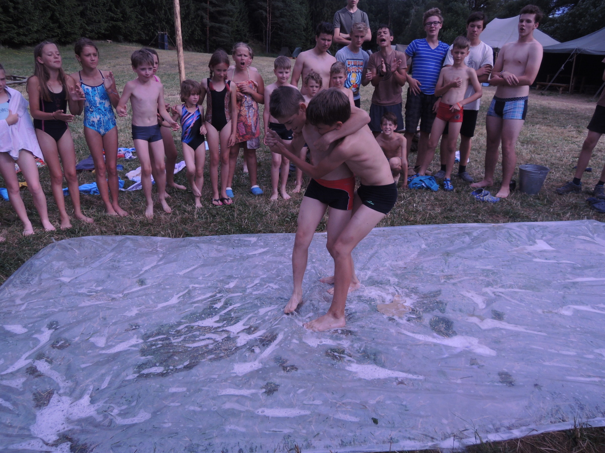 Pátý den tábora. Dopoledne se Draci vrátili z puťáku a mladší měli etapy do celotáborovky. Po obědě se rozjela super bojová turnajová hra - stačí se podívat na fotky. Večer se pak opékaly špekáčky, přičemž nás rozmarné počasí chvíli nechávalo u ohniště venku a chvílemi nás zase zahánělo do sněmovního týpka. Nakonec jsme v týpí skončili definitivně a skvěle si zazpívali. A s poslední písničkou se do tábora vrátily z vodního puťáku i Pumy. Ale to už je jiná písnička... Jura