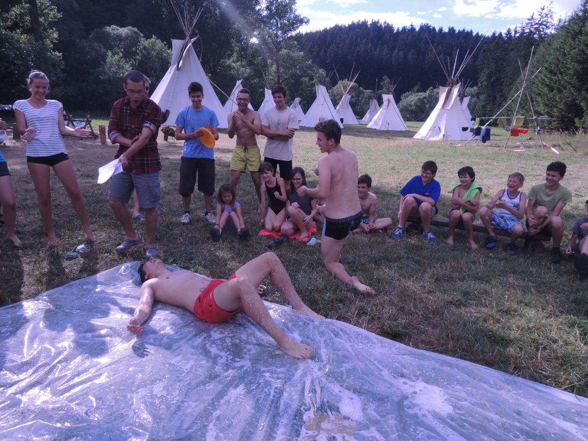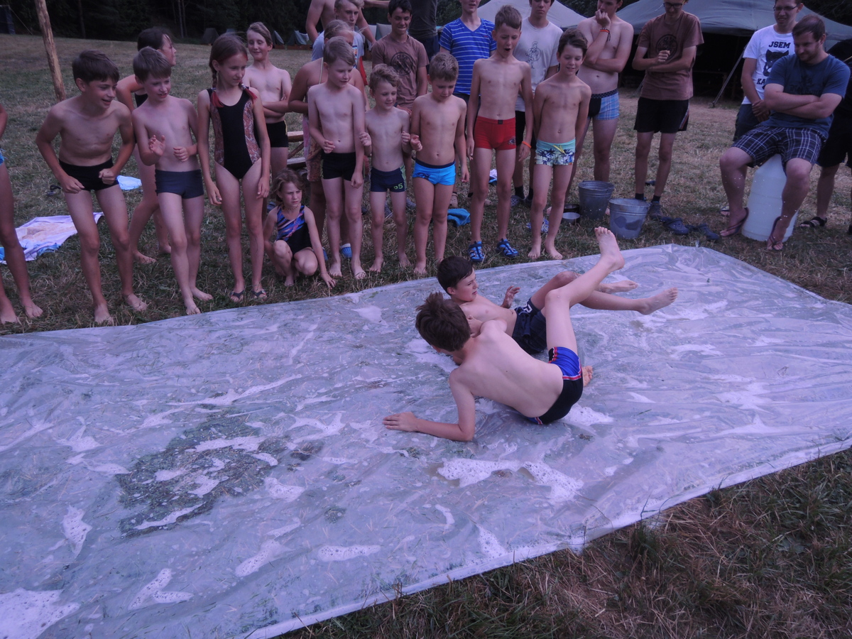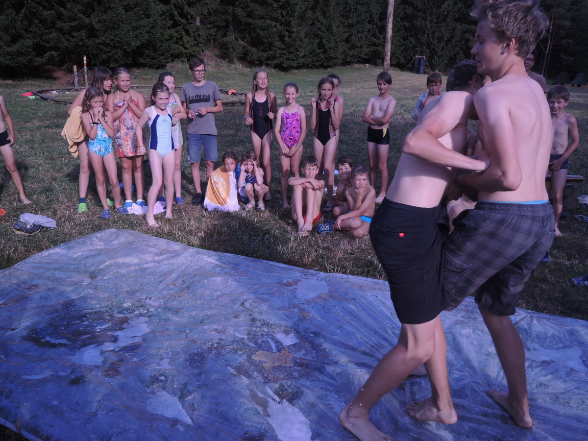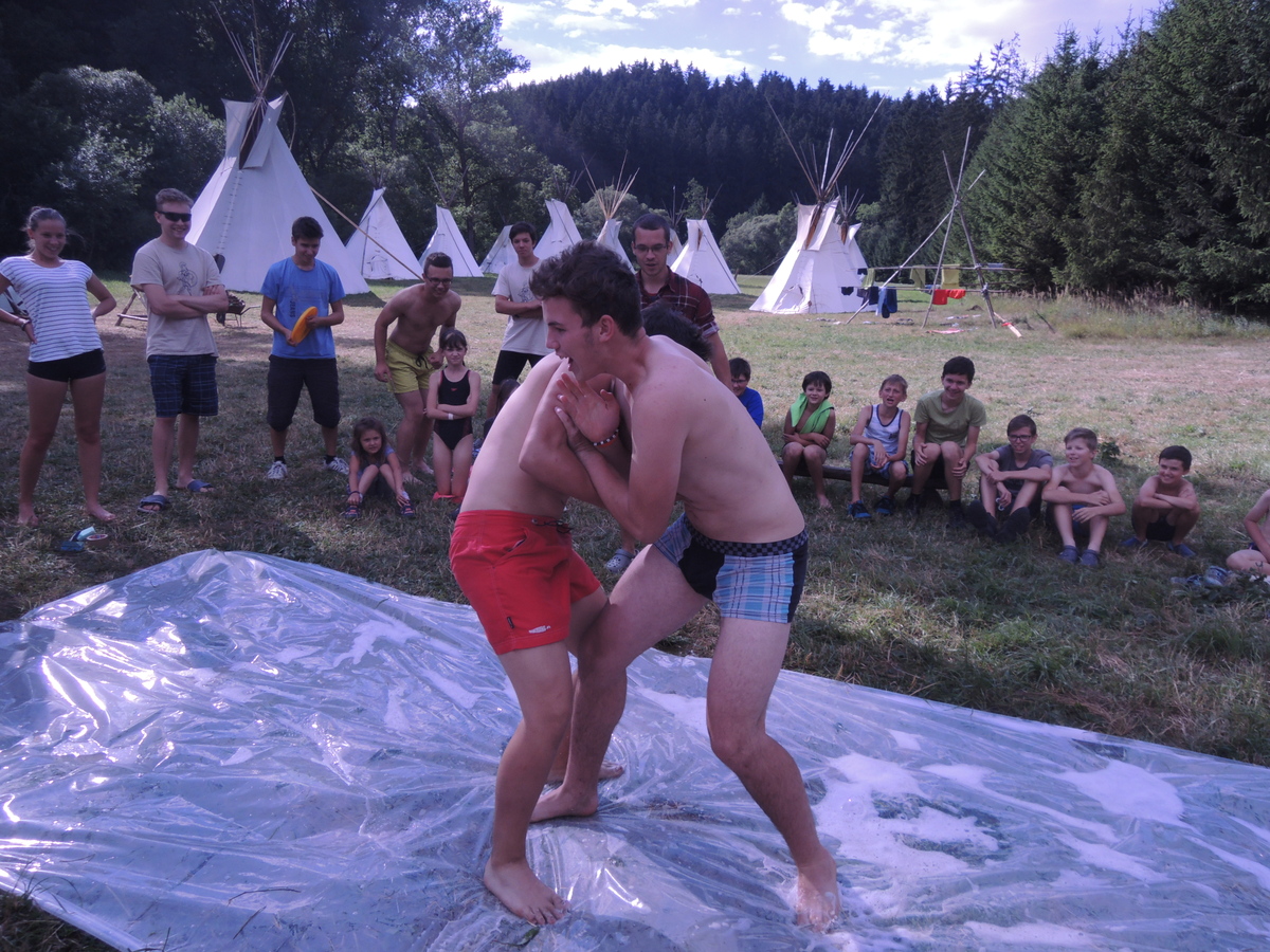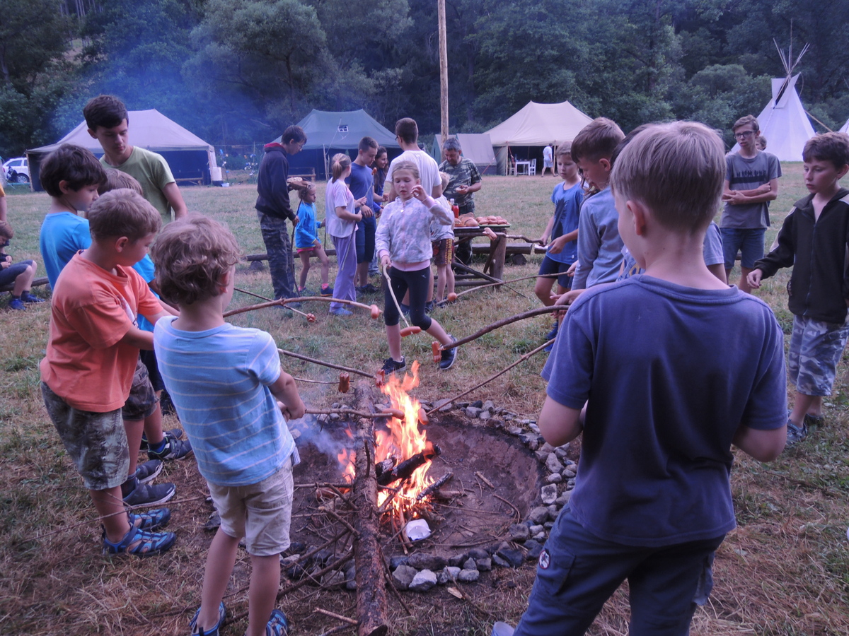 Pátý den tábora. Dopoledne se Draci vrátili z puťáku a mladší měli etapy do celotáborovky. Po obědě se rozjela super bojová turnajová hra - stačí se podívat na fotky. Večer se pak opékaly špekáčky, přičemž nás rozmarné počasí chvíli nechávalo u ohniště venku a chvílemi nás zase zahánělo do sněmovního týpka. Nakonec jsme v týpí skončili definitivně a skvěle si zazpívali. A s poslední písničkou se do tábora vrátily z vodního puťáku i Pumy. Ale to už je jiná písnička... Jura