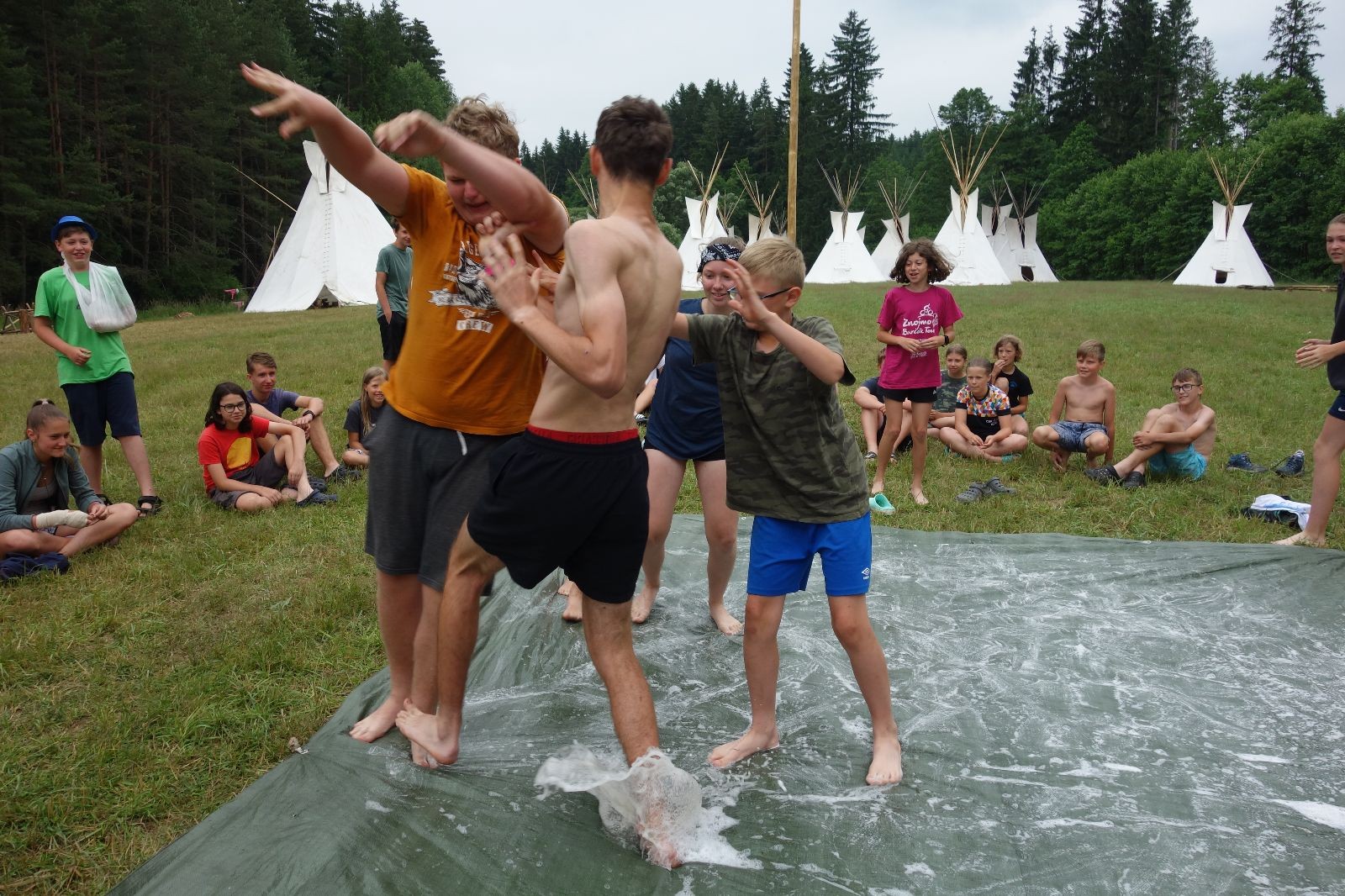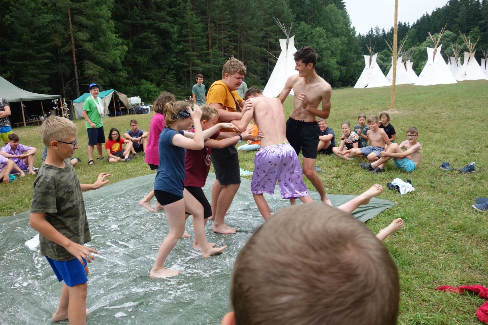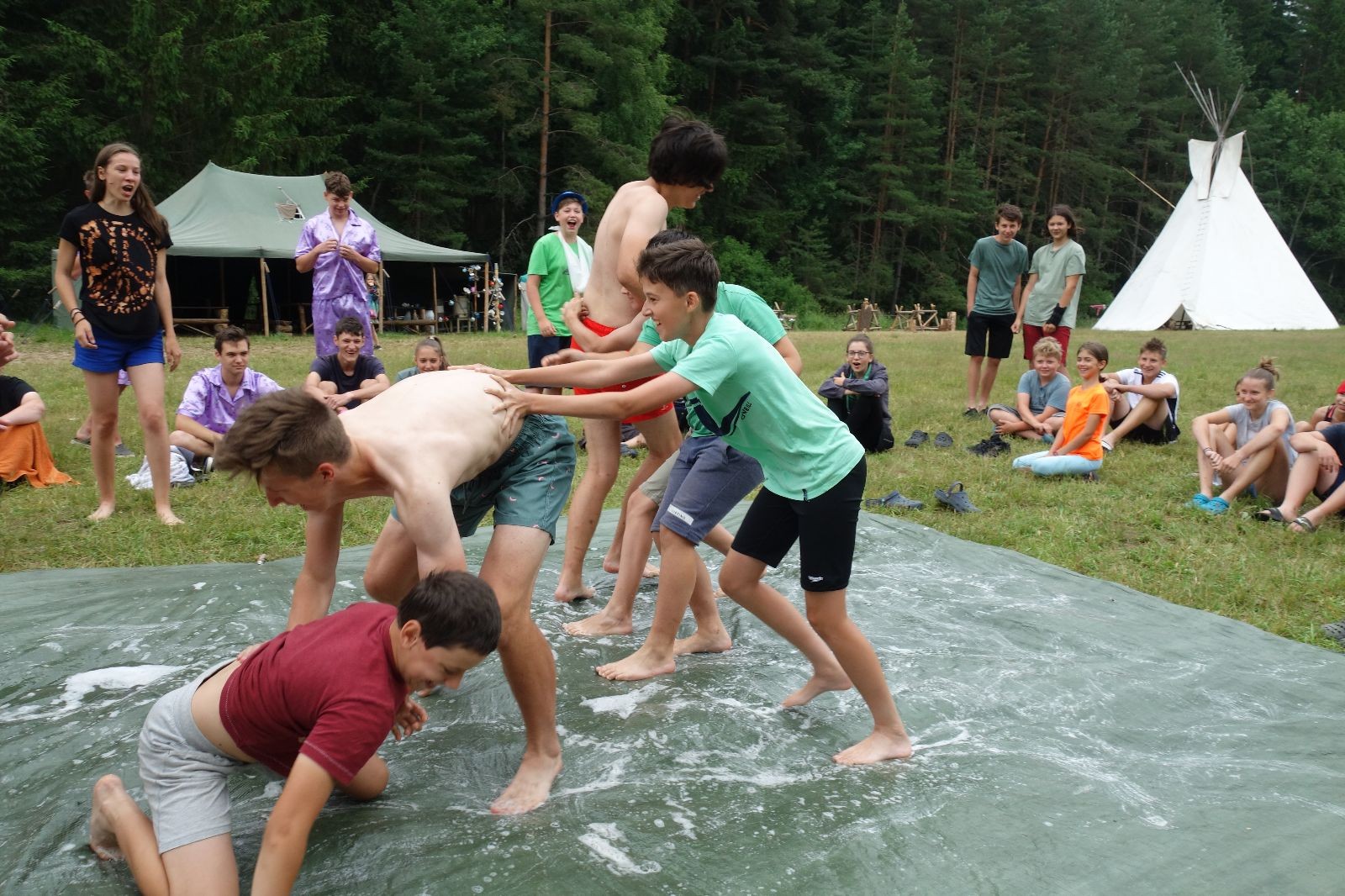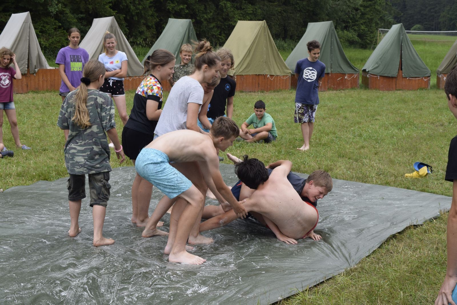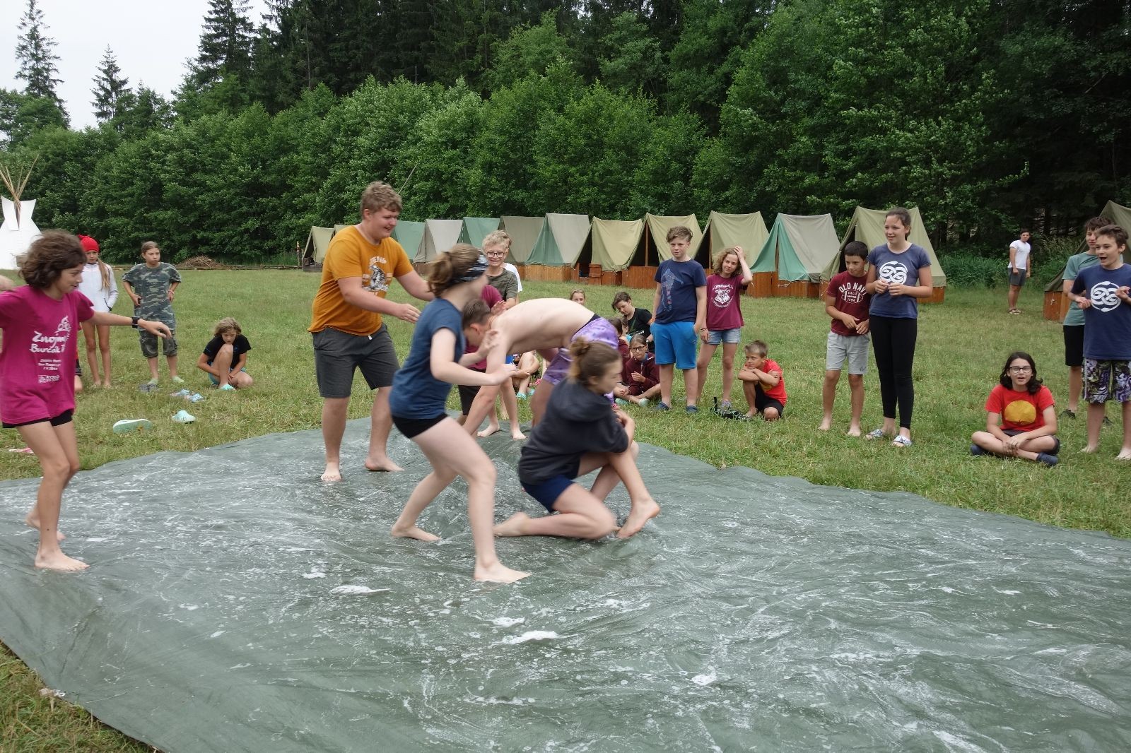Noční přepad nám opět trošku zvětšil táborový spánkový deficit, ale co, zážitek to byl. Den se rozjíždí piánko – budíček, rozcvička, snídaně, bodování úklidu… A pak: souboje na mýdlové ploše. To je kultovní oddílová soutěž, kterou si obzvláště starší neskutečně užívají. Mladší mezi tím hrají hru v lese. Na oběd máme těstoviny s kečupem a sýrem, po poledním klidu následuje družinový program. Kulinářské zážitky, cesty do okolí tábora, koupání v přehradě, plavba na loďkách na rybníku…co družinka to dobrý nápad. Večer po sněmu zkoušíme novinku – stolní hry. Každý vedoucí má nějakou hru na starost a zájemci si můžou přijít zahrát. Vypadá to, že novinka se osvědčila.