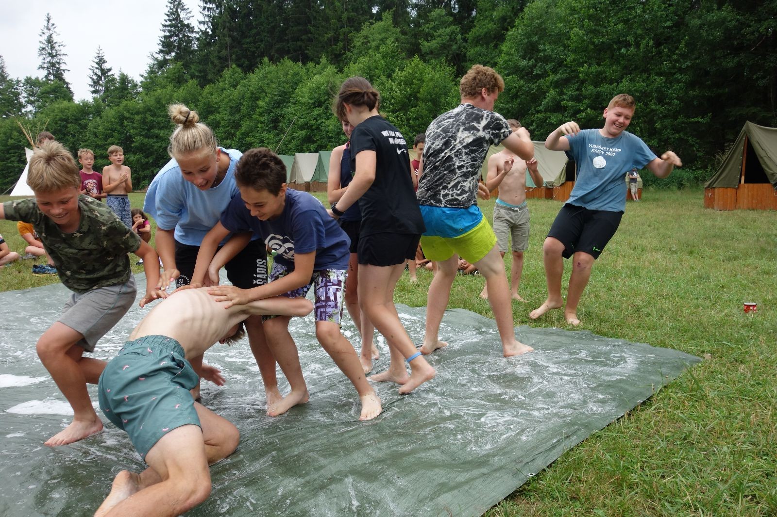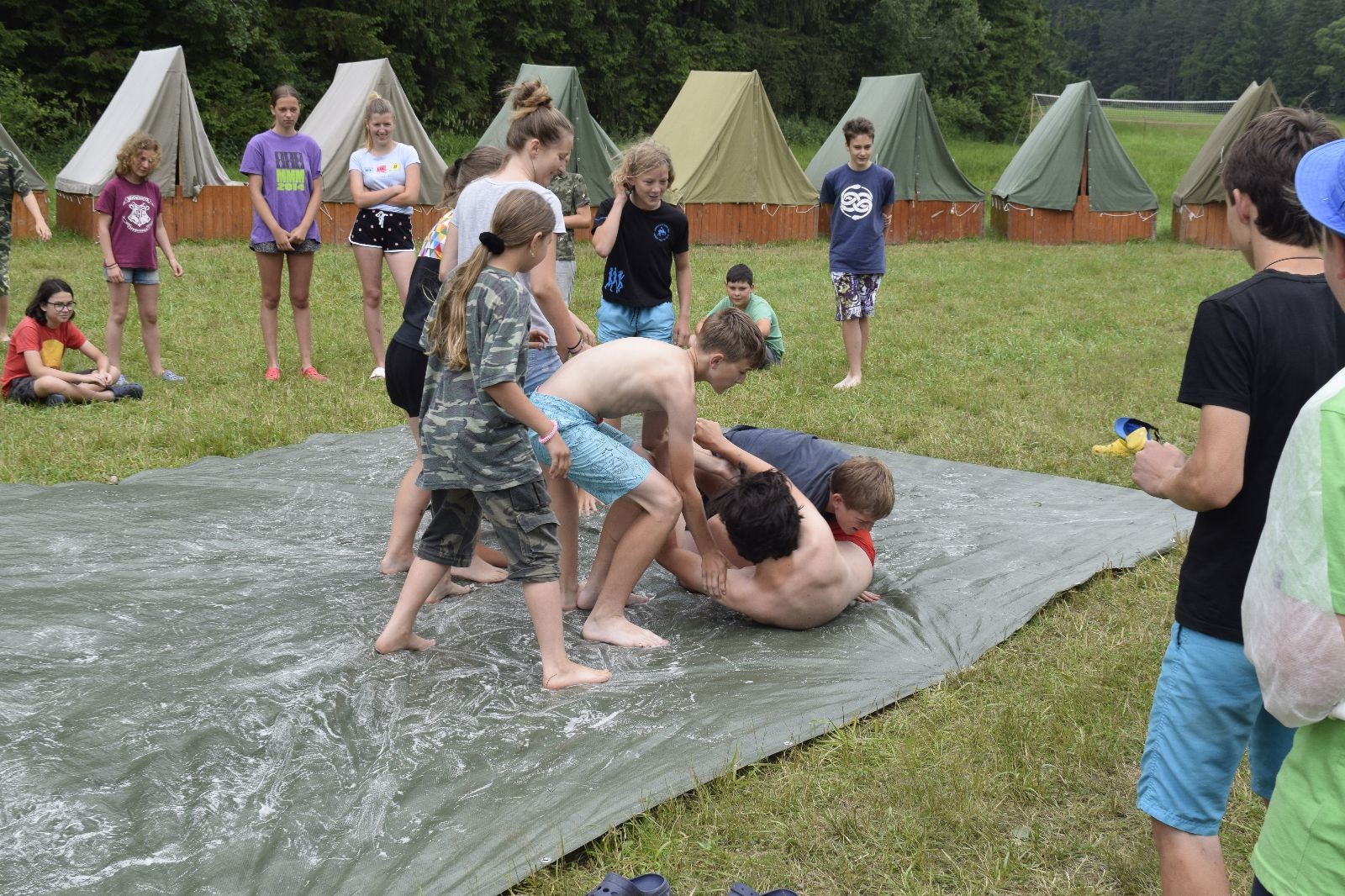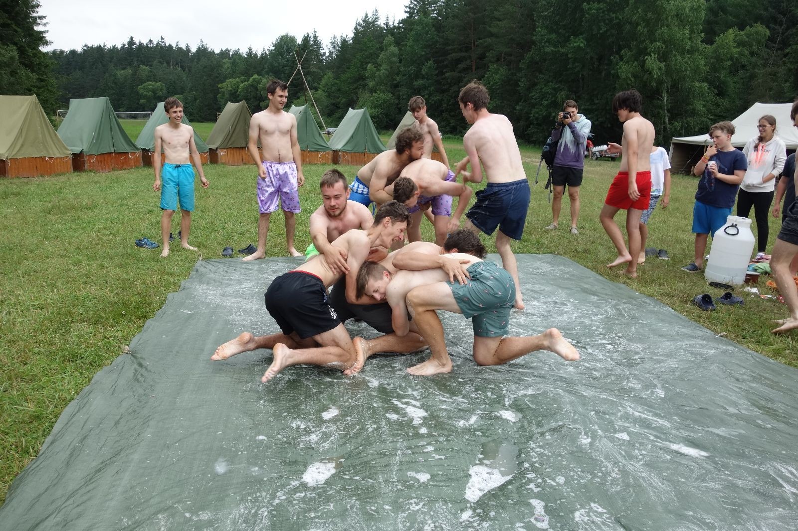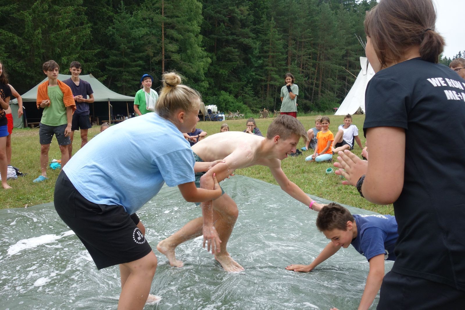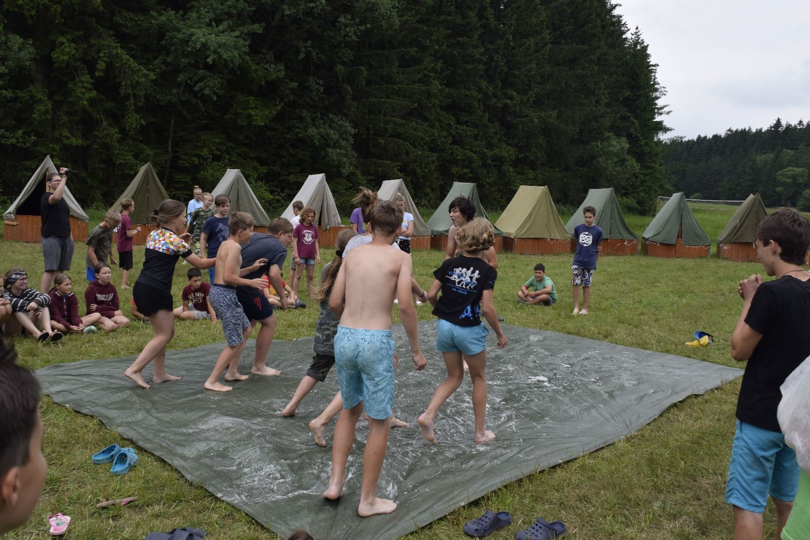 Noční přepad nám opět trošku zvětšil táborový spánkový deficit, ale co, zážitek to byl. Den se rozjíždí piánko – budíček, rozcvička, snídaně, bodování úklidu… A pak: souboje na mýdlové ploše. To je kultovní oddílová soutěž, kterou si obzvláště starší neskutečně užívají. Mladší mezi tím hrají hru v lese. Na oběd máme těstoviny s kečupem a sýrem, po poledním klidu následuje družinový program. Kulinářské zážitky, cesty do okolí tábora, koupání v přehradě, plavba na loďkách na rybníku…co družinka to dobrý nápad. Večer po sněmu zkoušíme novinku – stolní hry. Každý vedoucí má nějakou hru na starost a zájemci si můžou přijít zahrát. Vypadá to, že novinka se osvědčila.