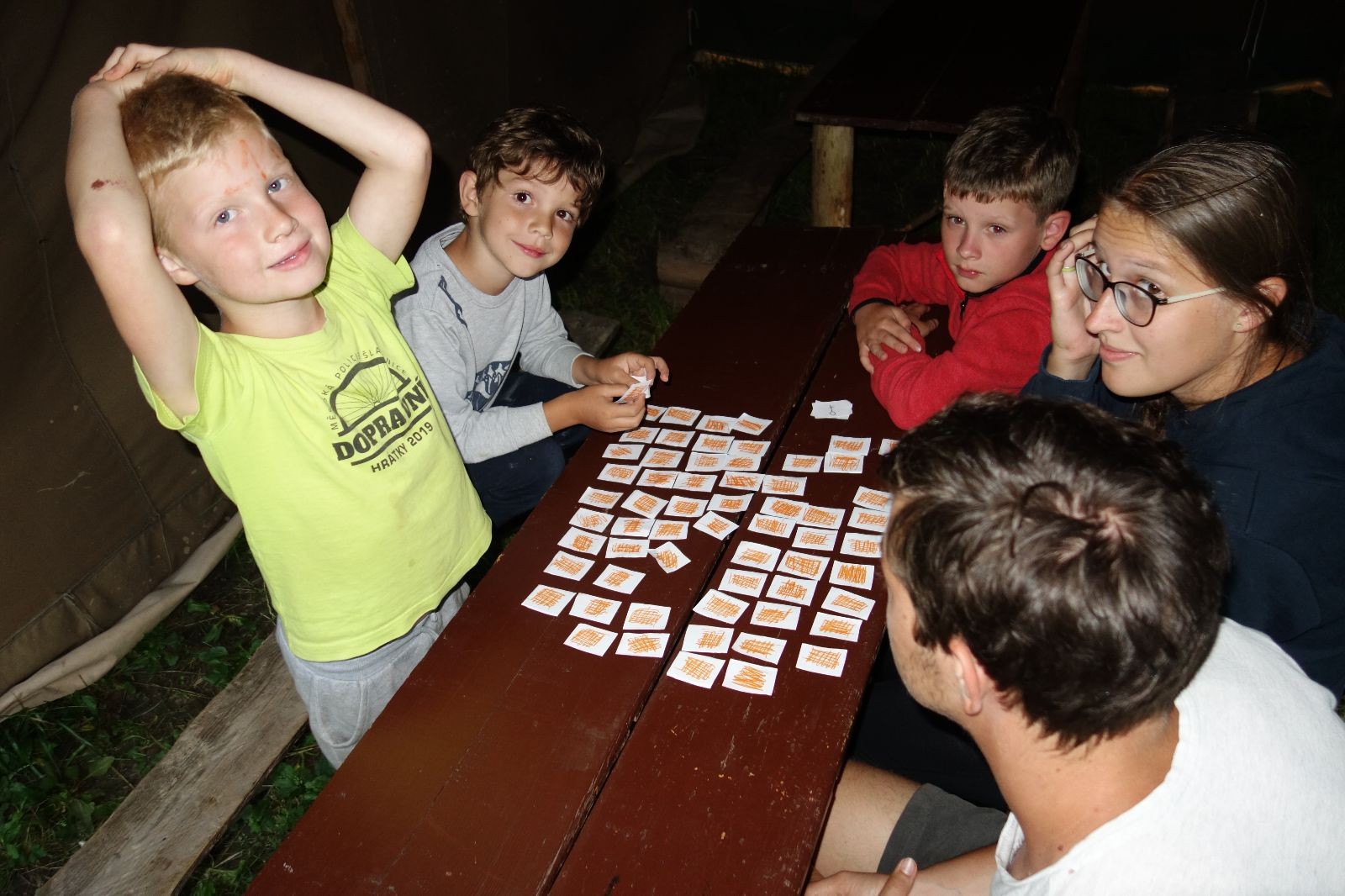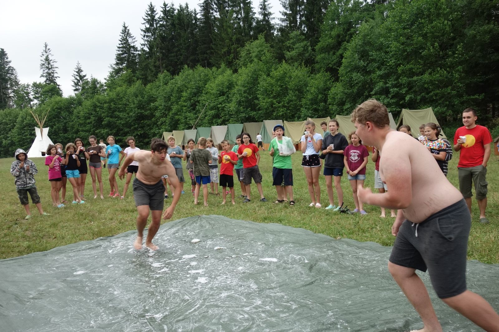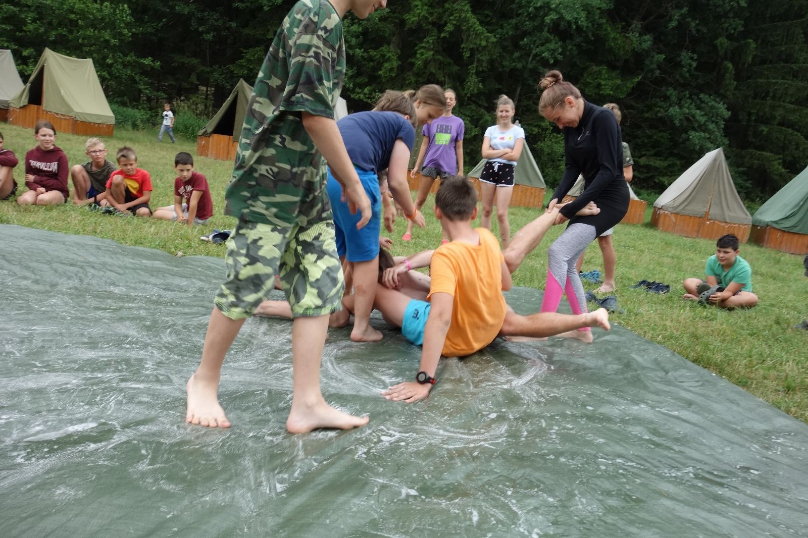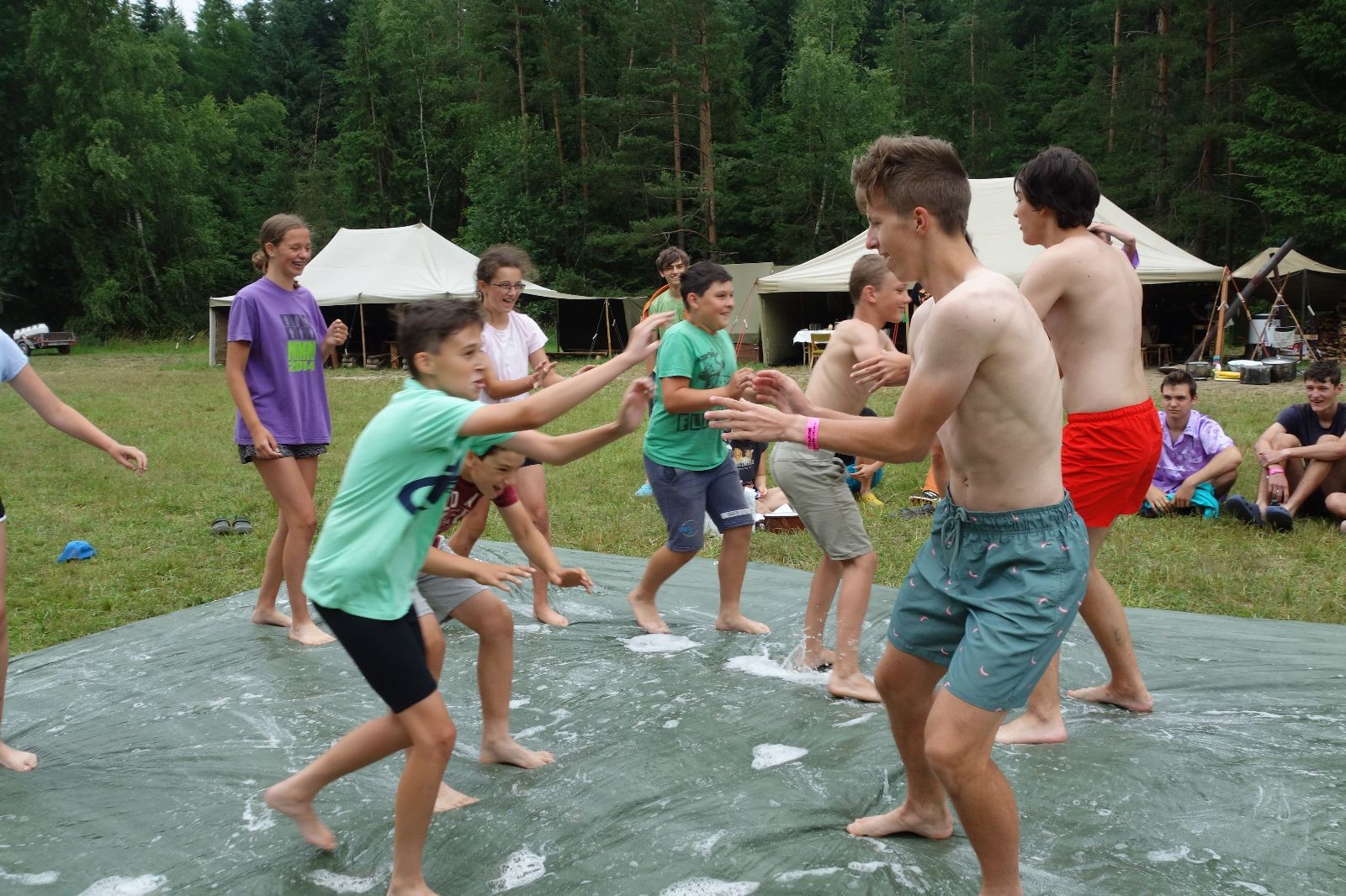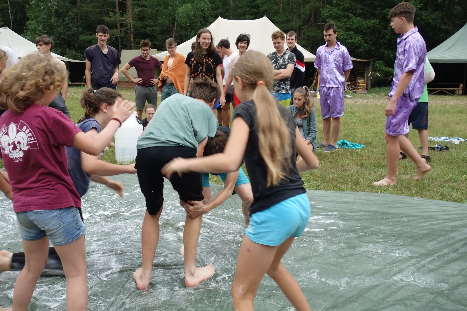 Noční přepad nám opět trošku zvětšil táborový spánkový deficit, ale co, zážitek to byl. Den se rozjíždí piánko – budíček, rozcvička, snídaně, bodování úklidu… A pak: souboje na mýdlové ploše. To je kultovní oddílová soutěž, kterou si obzvláště starší neskutečně užívají. Mladší mezi tím hrají hru v lese. Na oběd máme těstoviny s kečupem a sýrem, po poledním klidu následuje družinový program. Kulinářské zážitky, cesty do okolí tábora, koupání v přehradě, plavba na loďkách na rybníku…co družinka to dobrý nápad. Večer po sněmu zkoušíme novinku – stolní hry. Každý vedoucí má nějakou hru na starost a zájemci si můžou přijít zahrát. Vypadá to, že novinka se osvědčila.