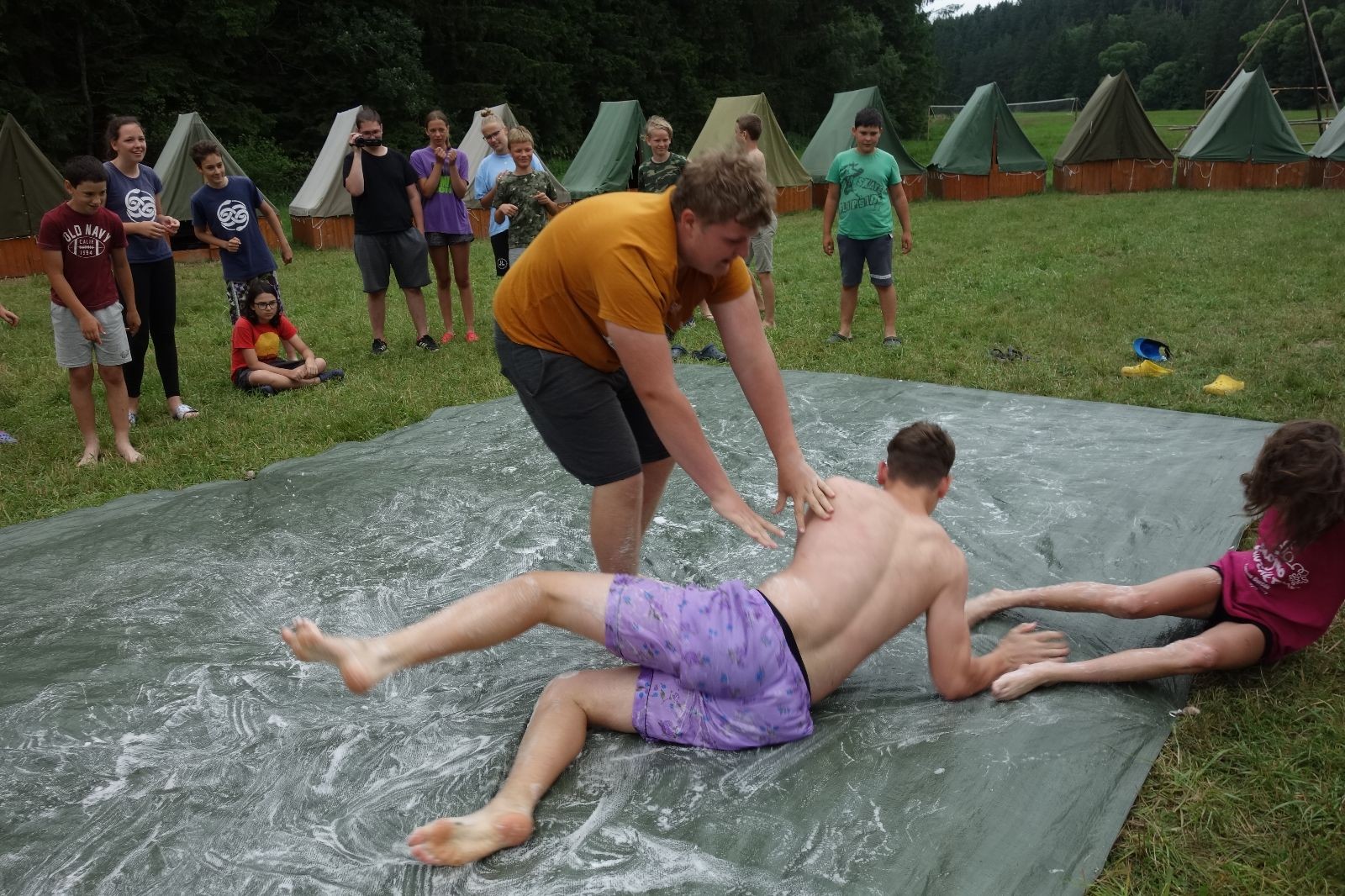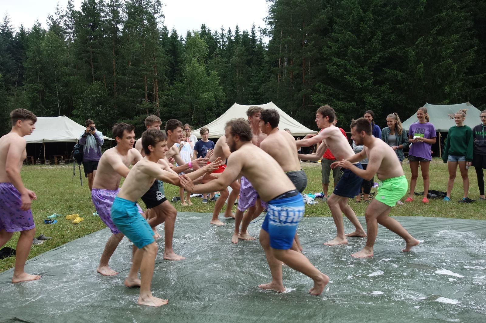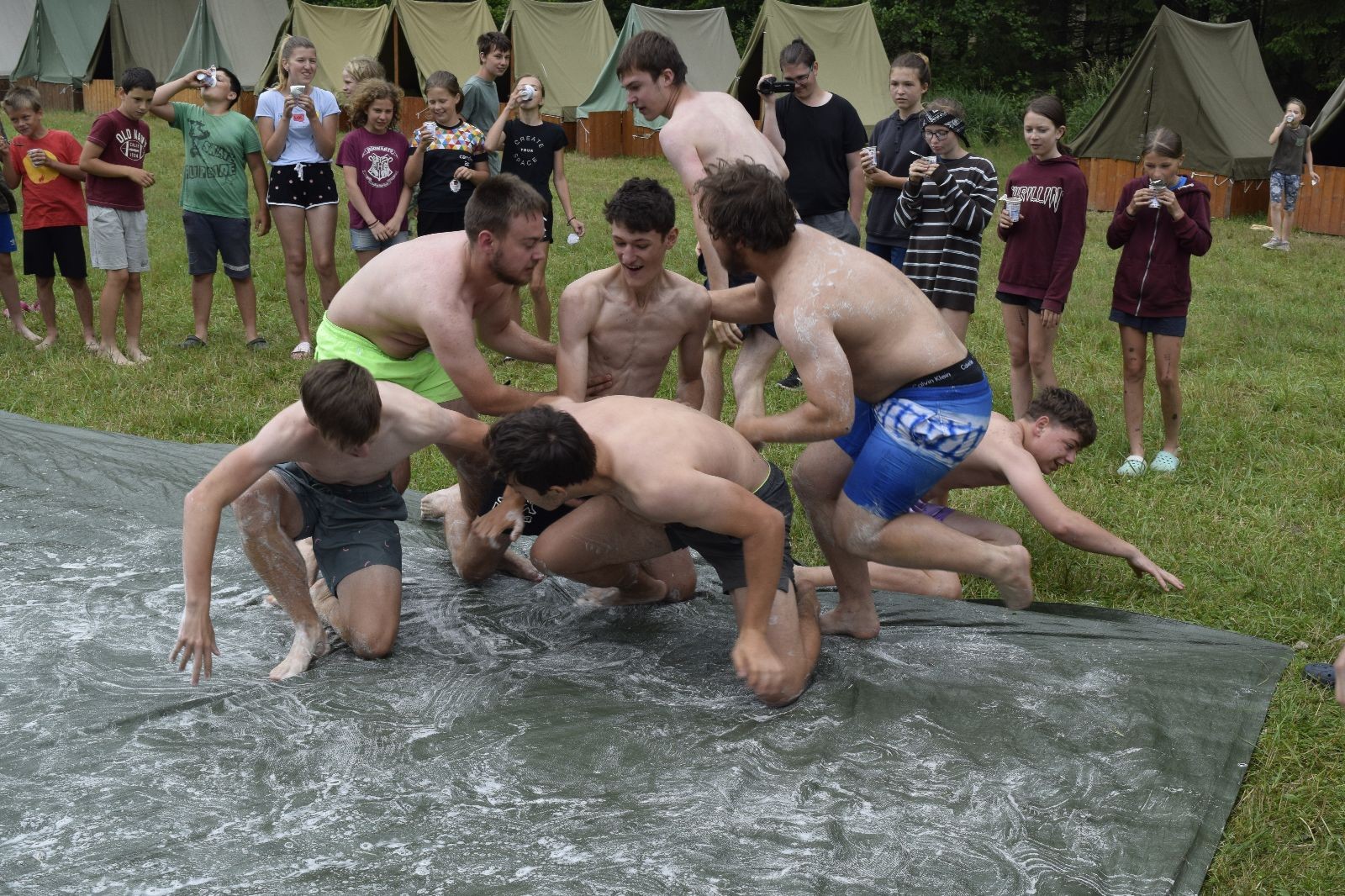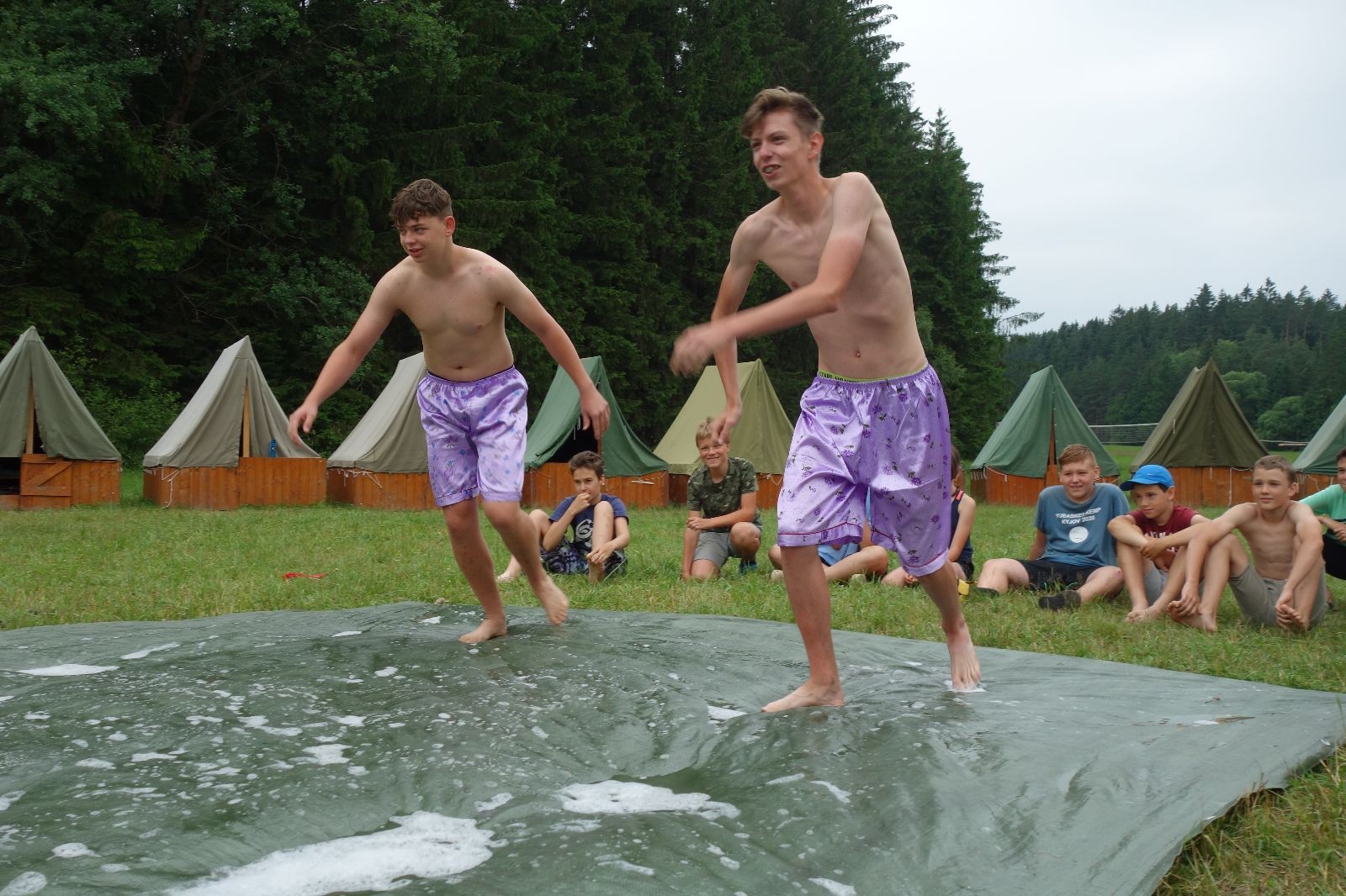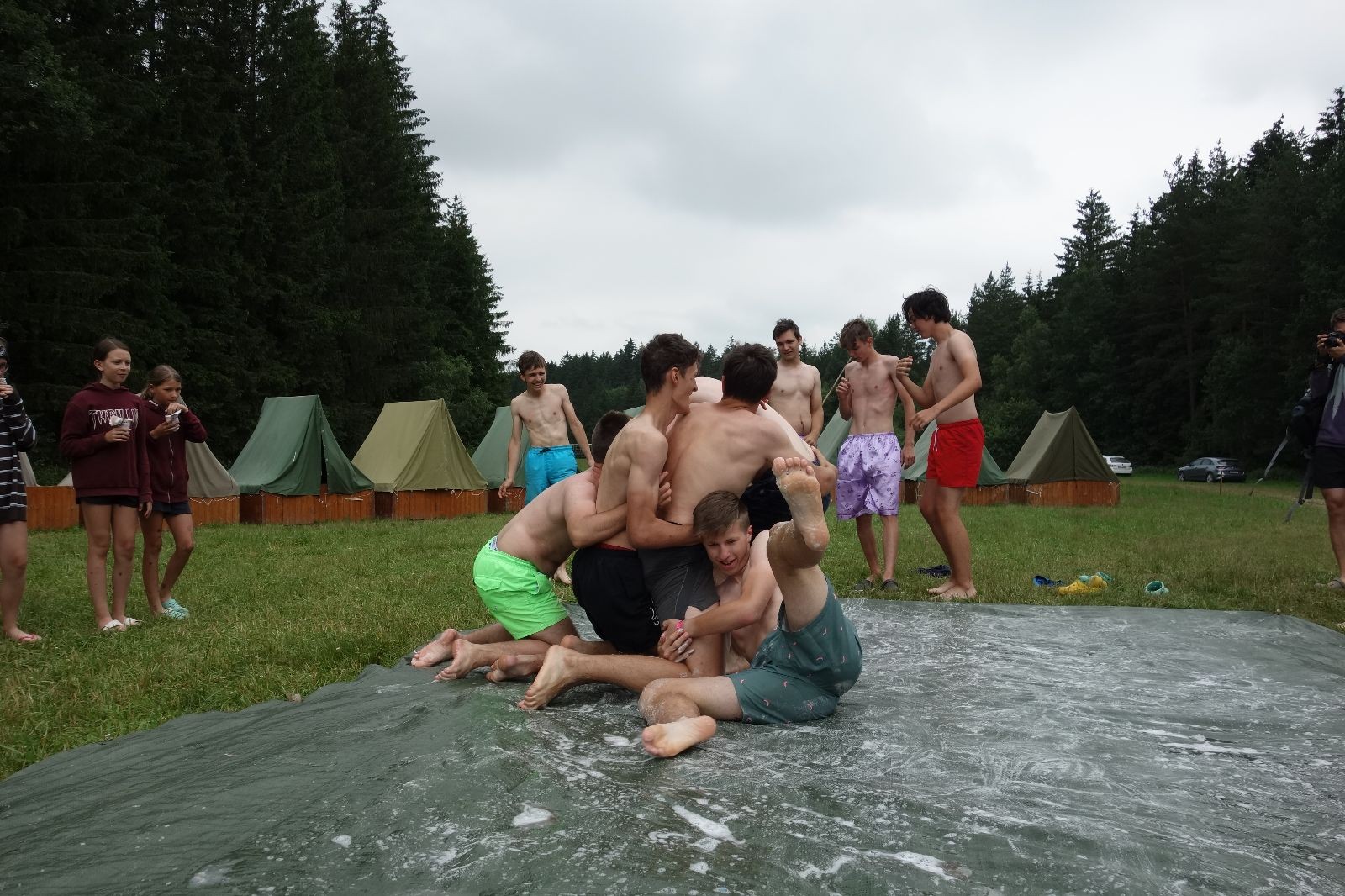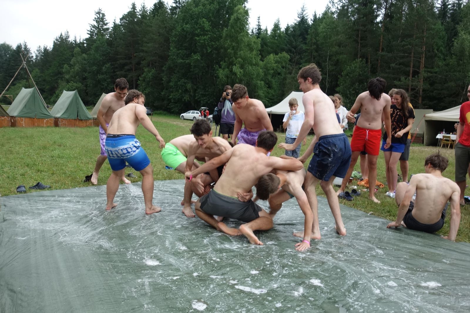 Noční přepad nám opět trošku zvětšil táborový spánkový deficit, ale co, zážitek to byl. Den se rozjíždí piánko – budíček, rozcvička, snídaně, bodování úklidu… A pak: souboje na mýdlové ploše. To je kultovní oddílová soutěž, kterou si obzvláště starší neskutečně užívají. Mladší mezi tím hrají hru v lese. Na oběd máme těstoviny s kečupem a sýrem, po poledním klidu následuje družinový program. Kulinářské zážitky, cesty do okolí tábora, koupání v přehradě, plavba na loďkách na rybníku…co družinka to dobrý nápad. Večer po sněmu zkoušíme novinku – stolní hry. Každý vedoucí má nějakou hru na starost a zájemci si můžou přijít zahrát. Vypadá to, že novinka se osvědčila.