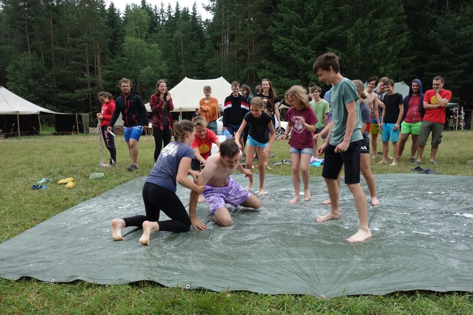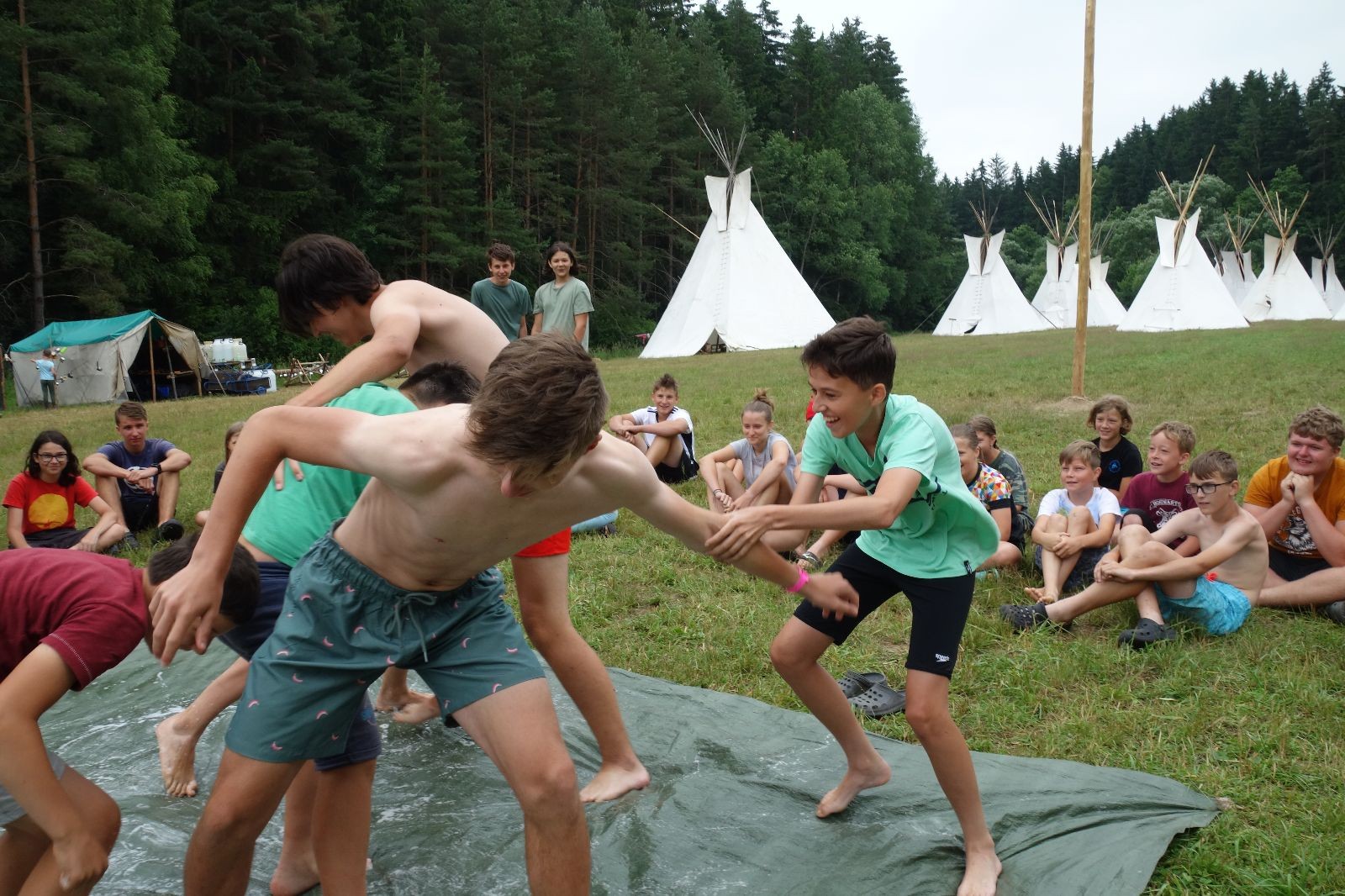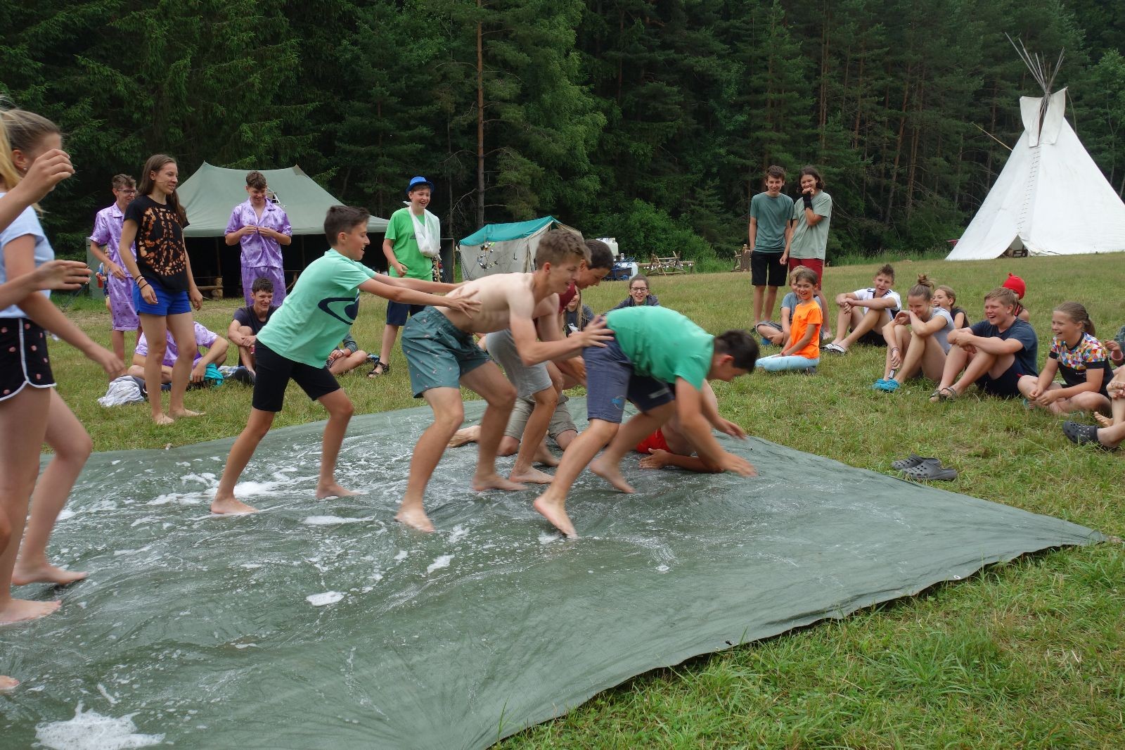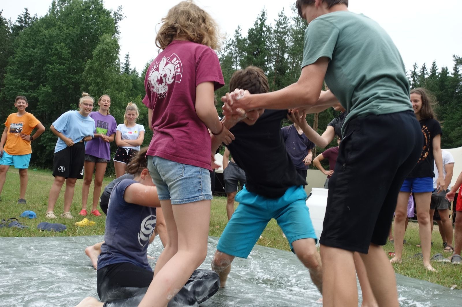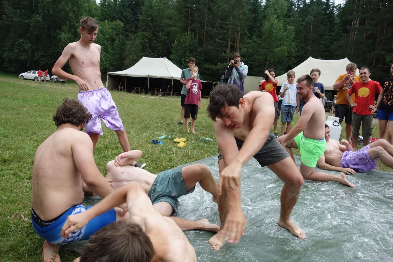 Noční přepad nám opět trošku zvětšil táborový spánkový deficit, ale co, zážitek to byl. Den se rozjíždí piánko – budíček, rozcvička, snídaně, bodování úklidu… A pak: souboje na mýdlové ploše. To je kultovní oddílová soutěž, kterou si obzvláště starší neskutečně užívají. Mladší mezi tím hrají hru v lese. Na oběd máme těstoviny s kečupem a sýrem, po poledním klidu následuje družinový program. Kulinářské zážitky, cesty do okolí tábora, koupání v přehradě, plavba na loďkách na rybníku…co družinka to dobrý nápad. Večer po sněmu zkoušíme novinku – stolní hry. Každý vedoucí má nějakou hru na starost a zájemci si můžou přijít zahrát. Vypadá to, že novinka se osvědčila.