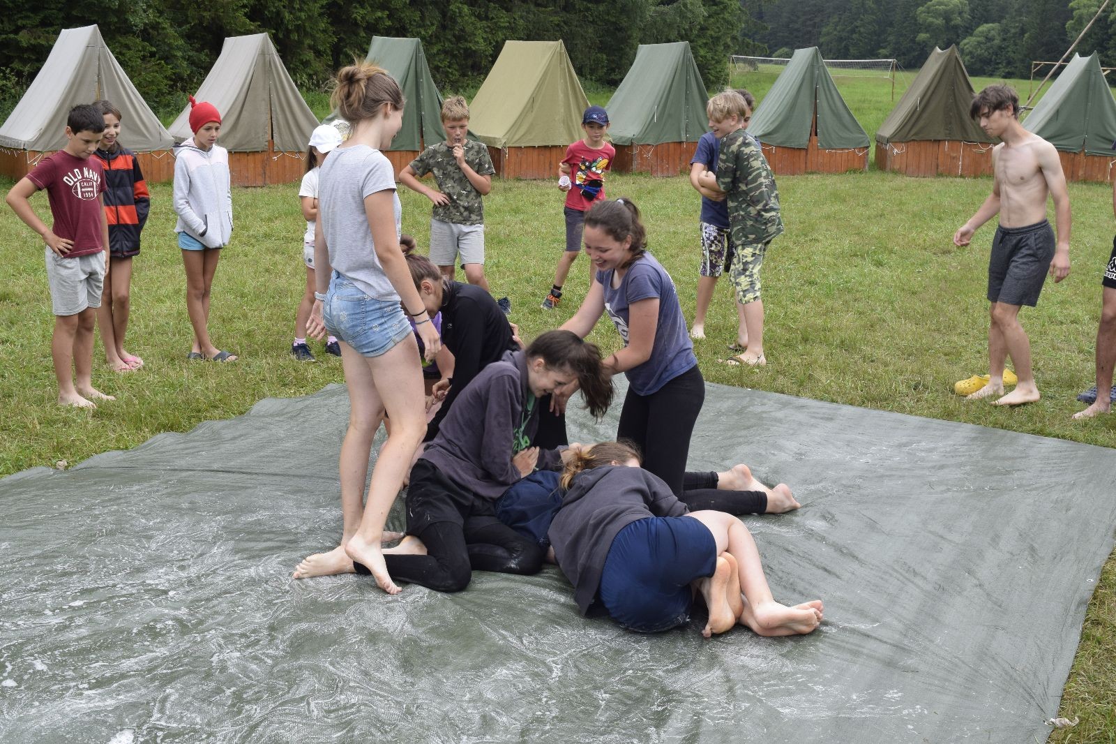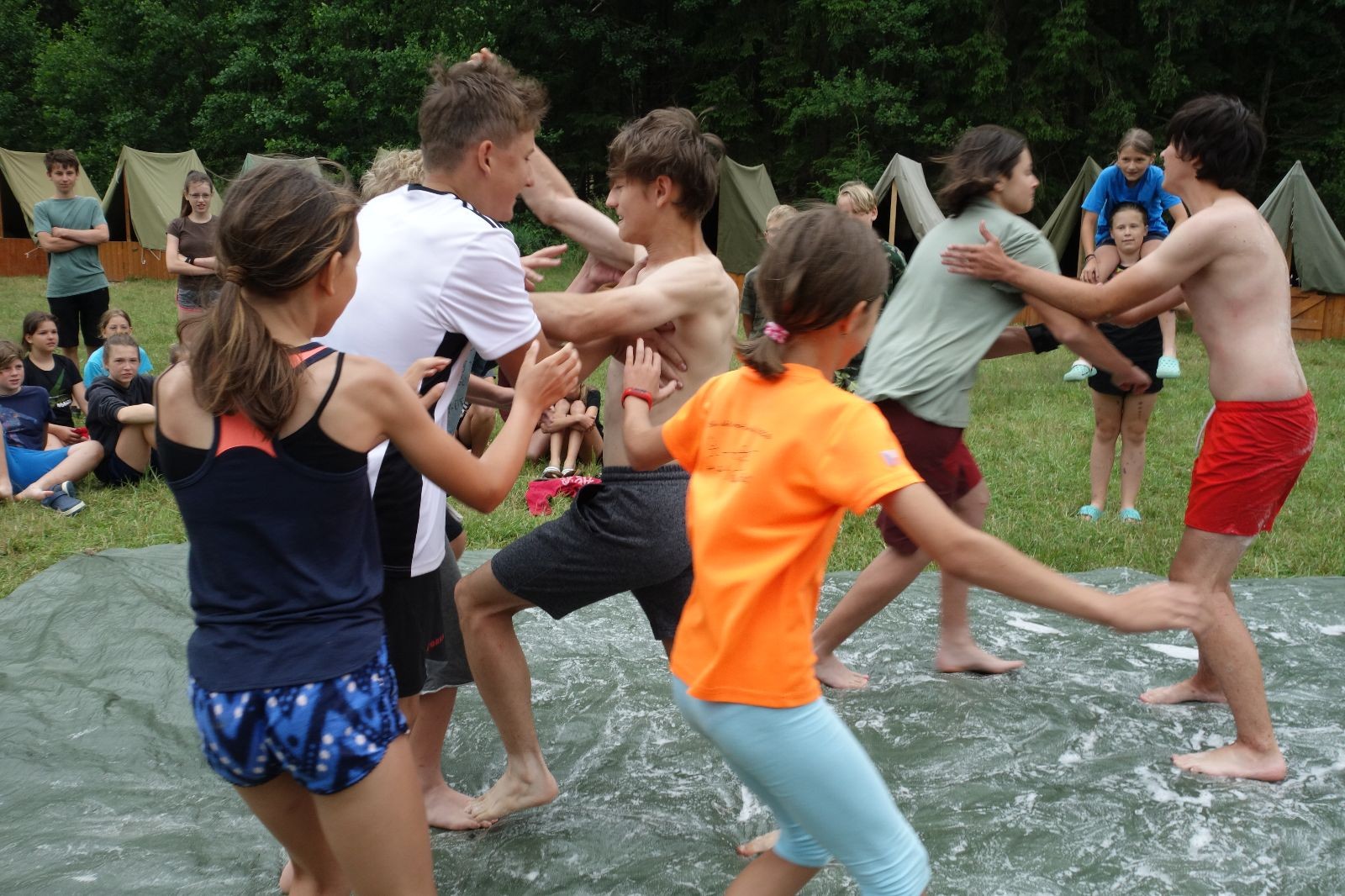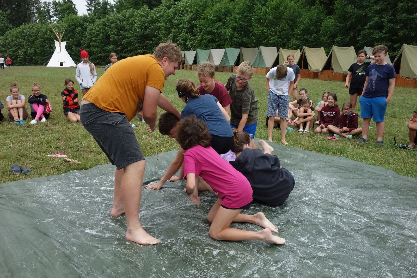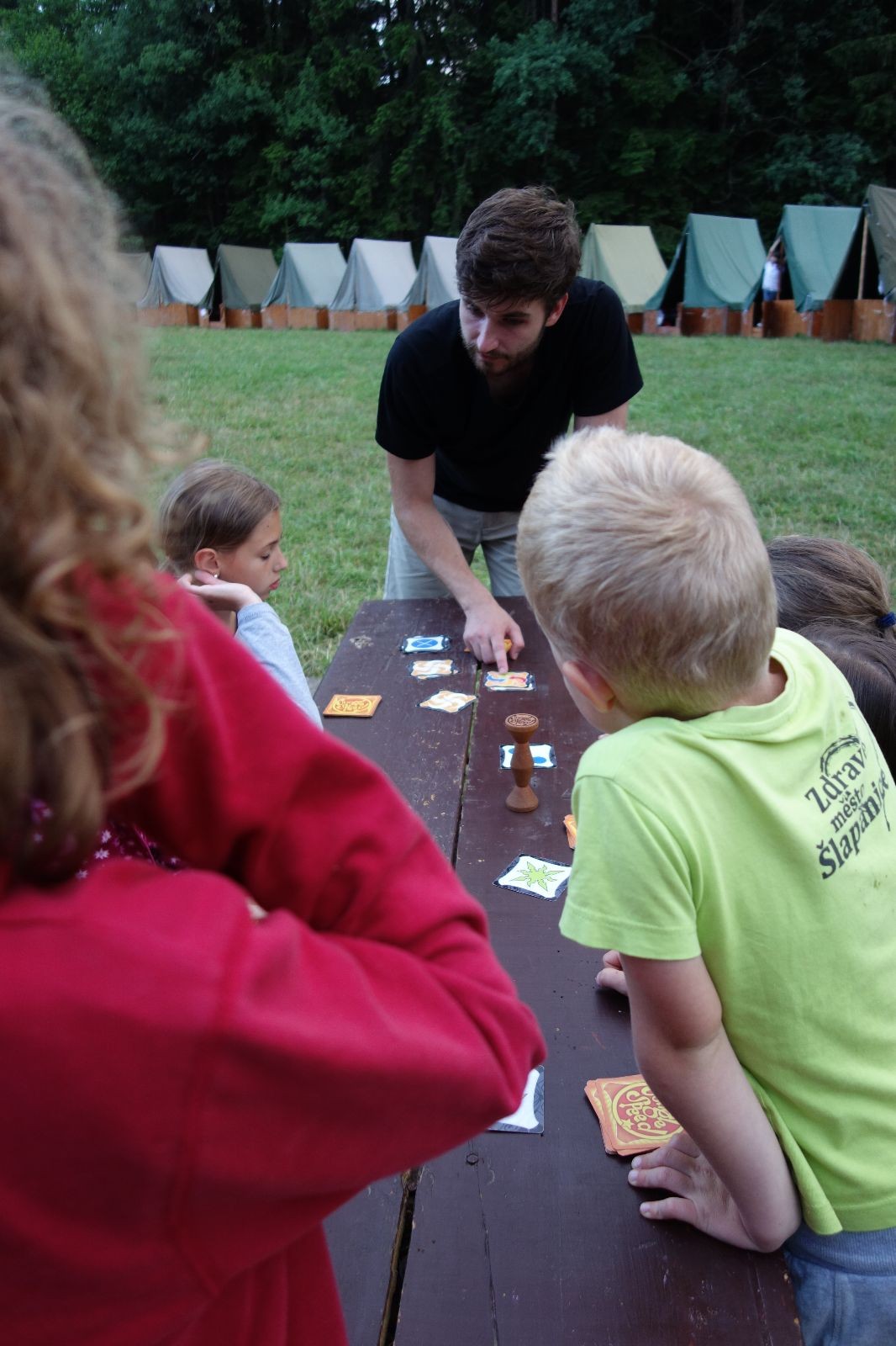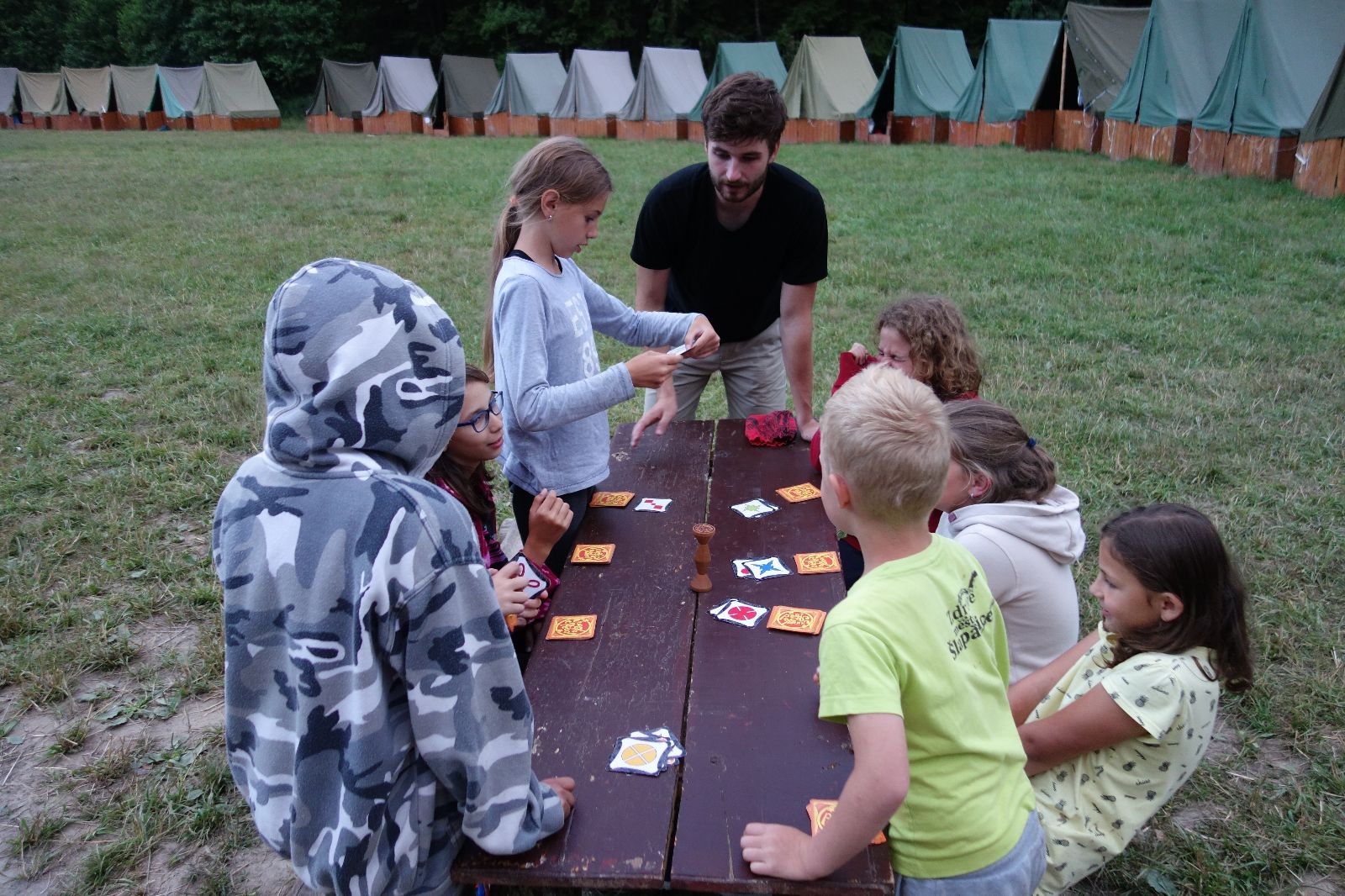 Noční přepad nám opět trošku zvětšil táborový spánkový deficit, ale co, zážitek to byl. Den se rozjíždí piánko – budíček, rozcvička, snídaně, bodování úklidu… A pak: souboje na mýdlové ploše. To je kultovní oddílová soutěž, kterou si obzvláště starší neskutečně užívají. Mladší mezi tím hrají hru v lese. Na oběd máme těstoviny s kečupem a sýrem, po poledním klidu následuje družinový program. Kulinářské zážitky, cesty do okolí tábora, koupání v přehradě, plavba na loďkách na rybníku…co družinka to dobrý nápad. Večer po sněmu zkoušíme novinku – stolní hry. Každý vedoucí má nějakou hru na starost a zájemci si můžou přijít zahrát. Vypadá to, že novinka se osvědčila.