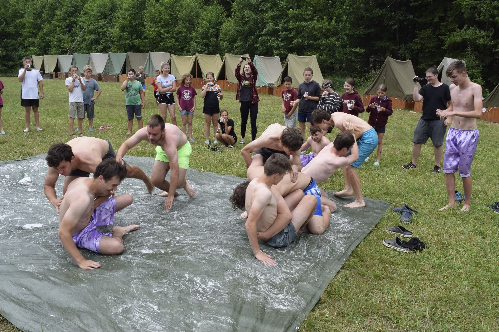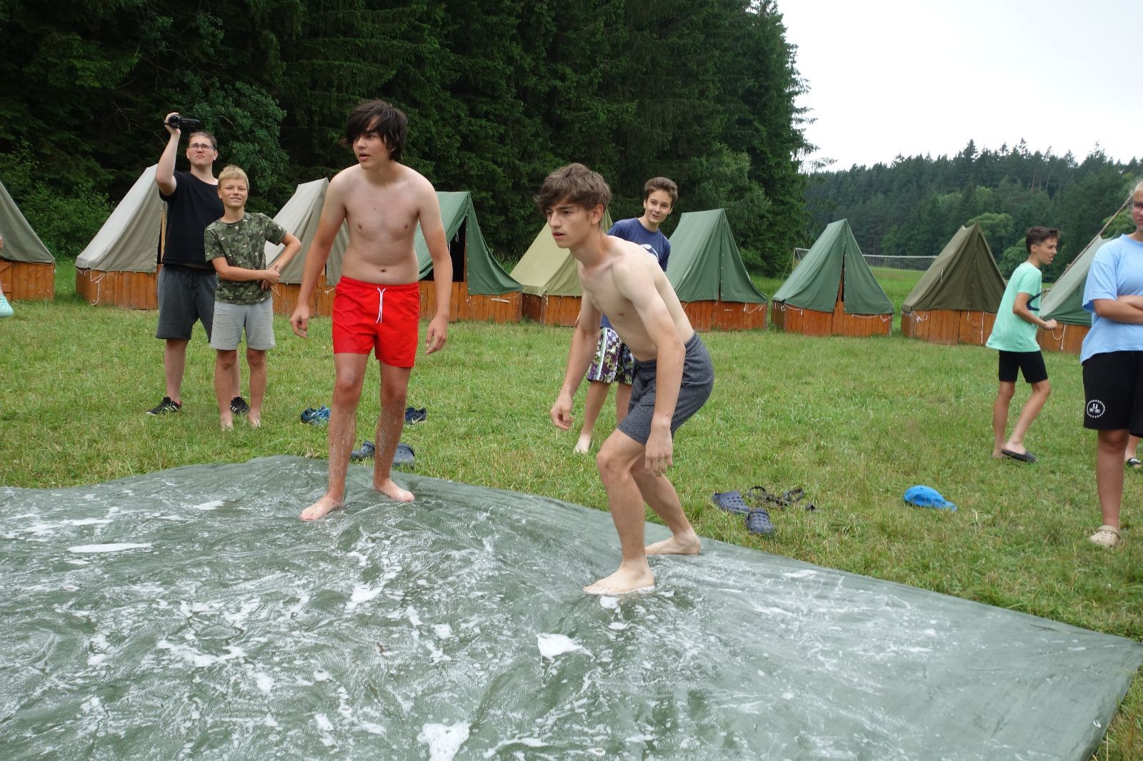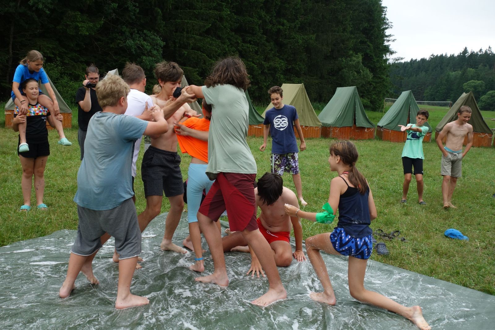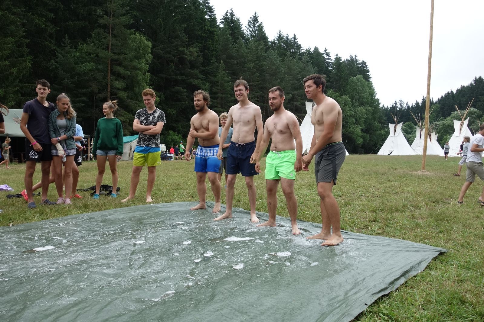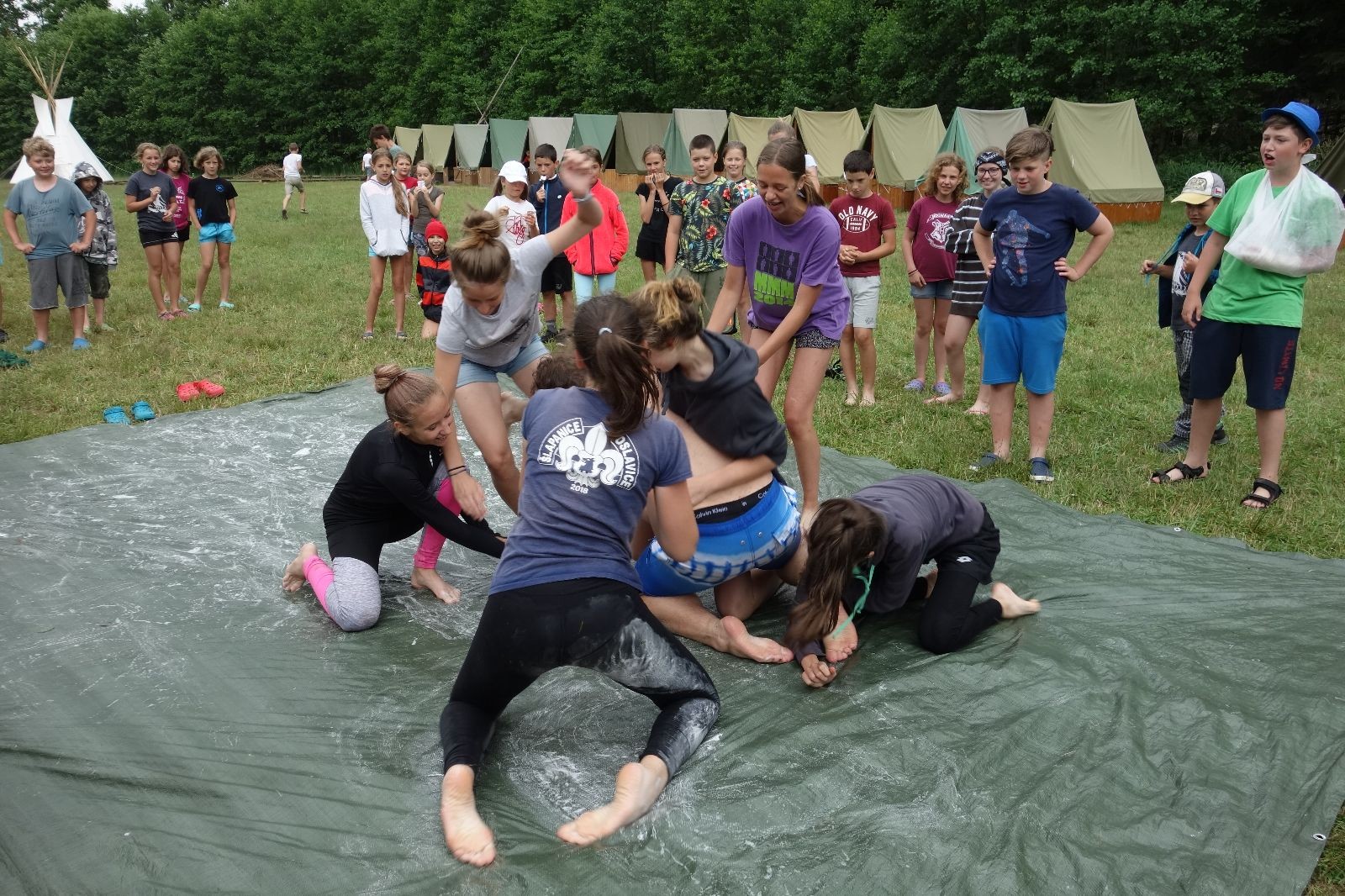 Noční přepad nám opět trošku zvětšil táborový spánkový deficit, ale co, zážitek to byl. Den se rozjíždí piánko – budíček, rozcvička, snídaně, bodování úklidu… A pak: souboje na mýdlové ploše. To je kultovní oddílová soutěž, kterou si obzvláště starší neskutečně užívají. Mladší mezi tím hrají hru v lese. Na oběd máme těstoviny s kečupem a sýrem, po poledním klidu následuje družinový program. Kulinářské zážitky, cesty do okolí tábora, koupání v přehradě, plavba na loďkách na rybníku…co družinka to dobrý nápad. Večer po sněmu zkoušíme novinku – stolní hry. Každý vedoucí má nějakou hru na starost a zájemci si můžou přijít zahrát. Vypadá to, že novinka se osvědčila.