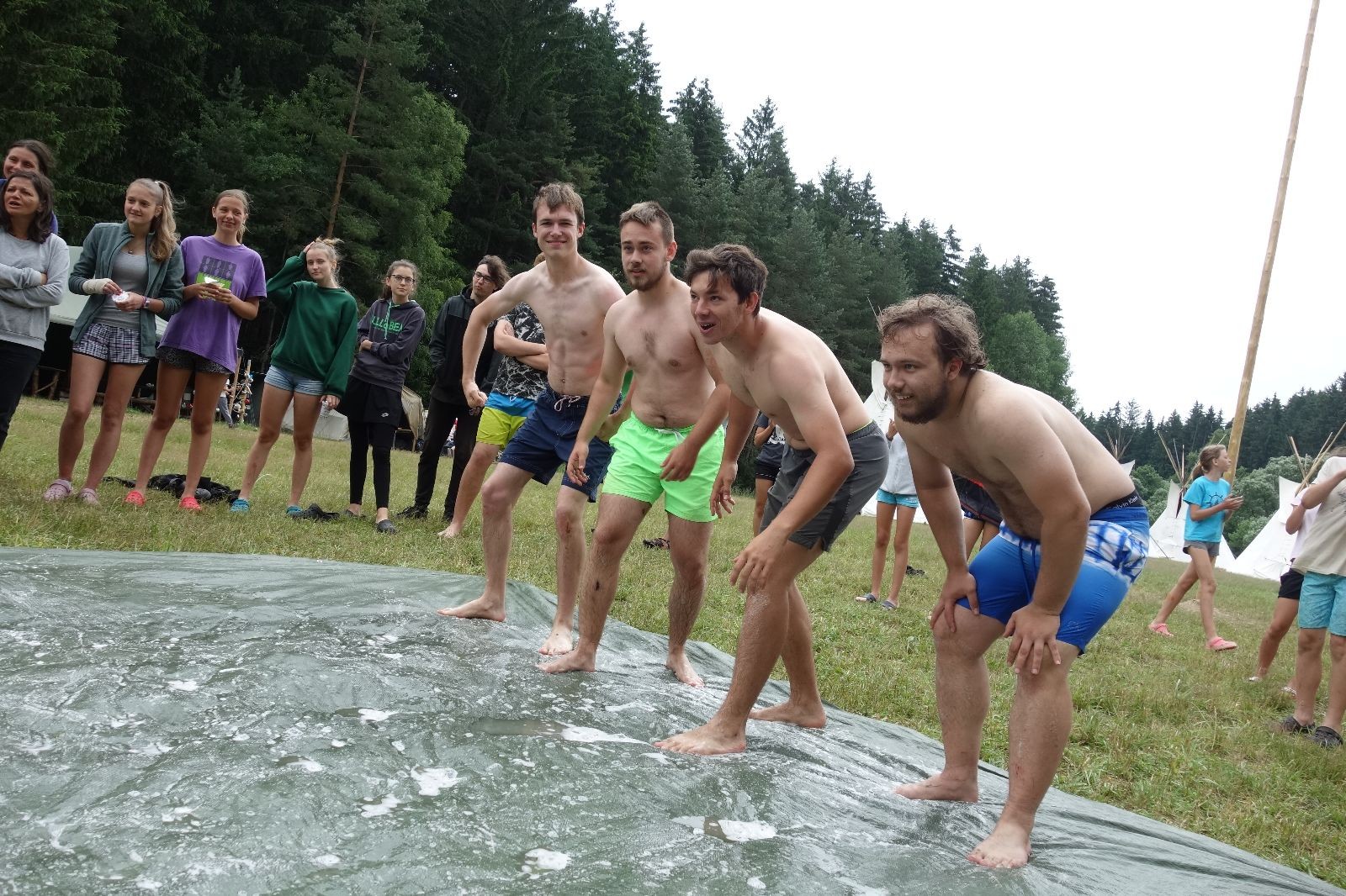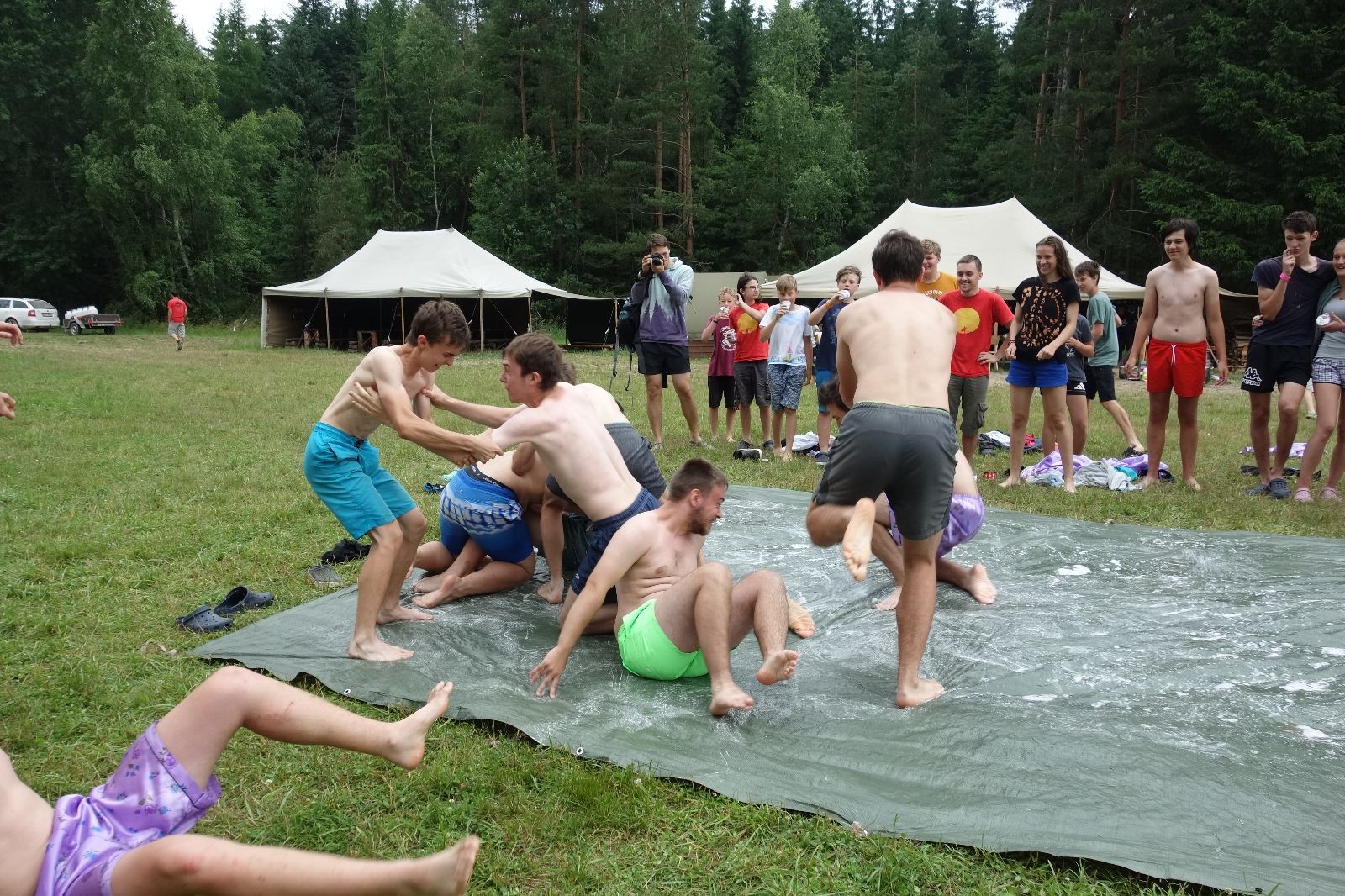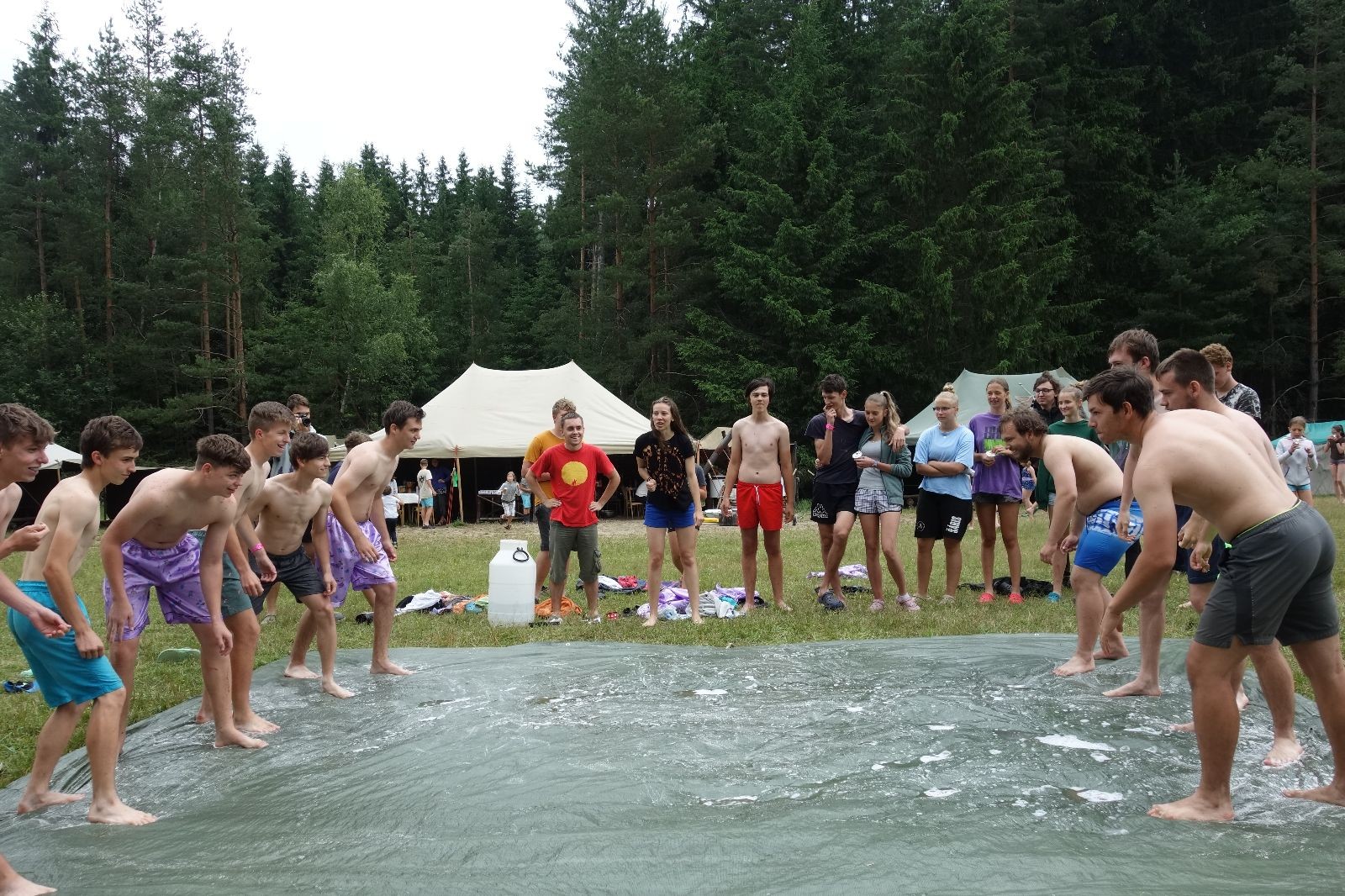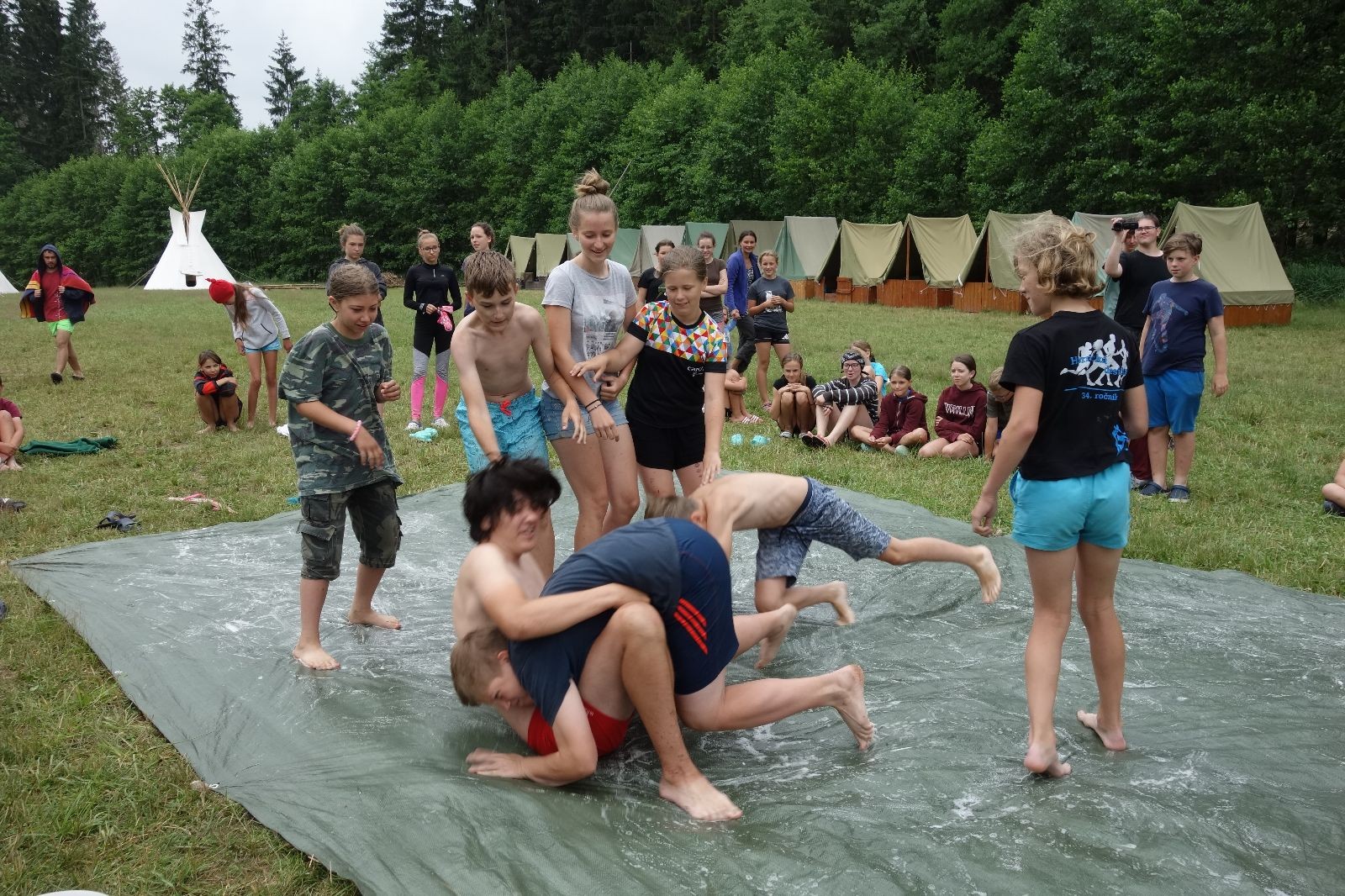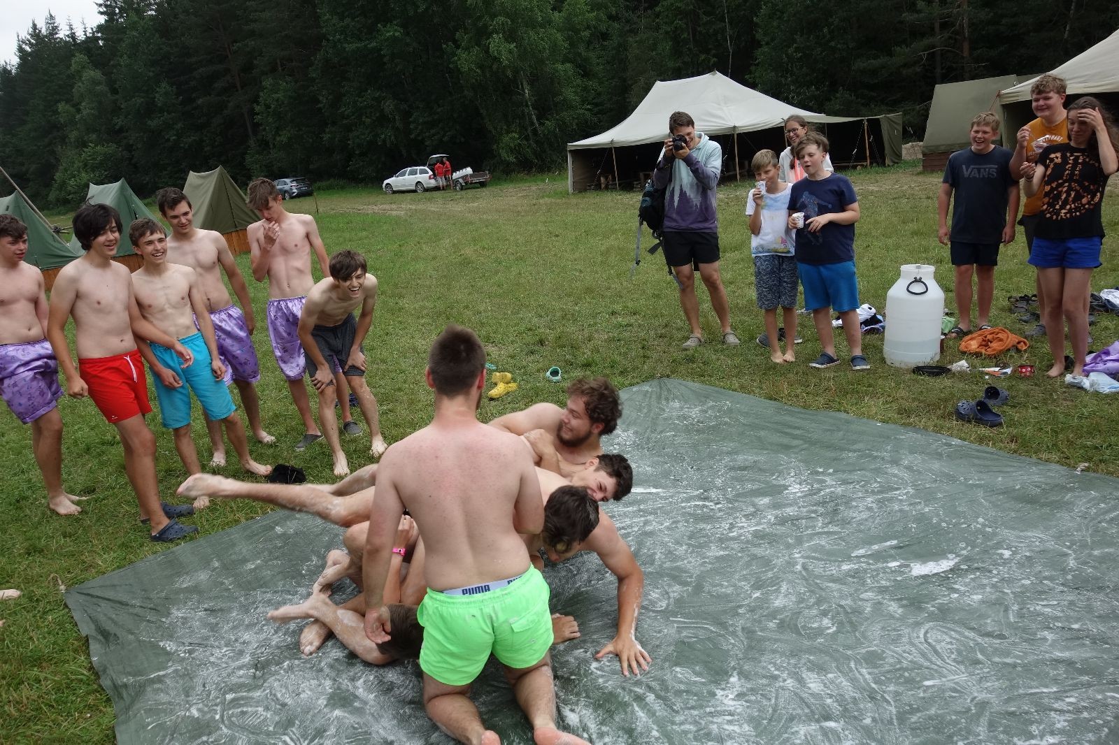 Noční přepad nám opět trošku zvětšil táborový spánkový deficit, ale co, zážitek to byl. Den se rozjíždí piánko – budíček, rozcvička, snídaně, bodování úklidu… A pak: souboje na mýdlové ploše. To je kultovní oddílová soutěž, kterou si obzvláště starší neskutečně užívají. Mladší mezi tím hrají hru v lese. Na oběd máme těstoviny s kečupem a sýrem, po poledním klidu následuje družinový program. Kulinářské zážitky, cesty do okolí tábora, koupání v přehradě, plavba na loďkách na rybníku…co družinka to dobrý nápad. Večer po sněmu zkoušíme novinku – stolní hry. Každý vedoucí má nějakou hru na starost a zájemci si můžou přijít zahrát. Vypadá to, že novinka se osvědčila.