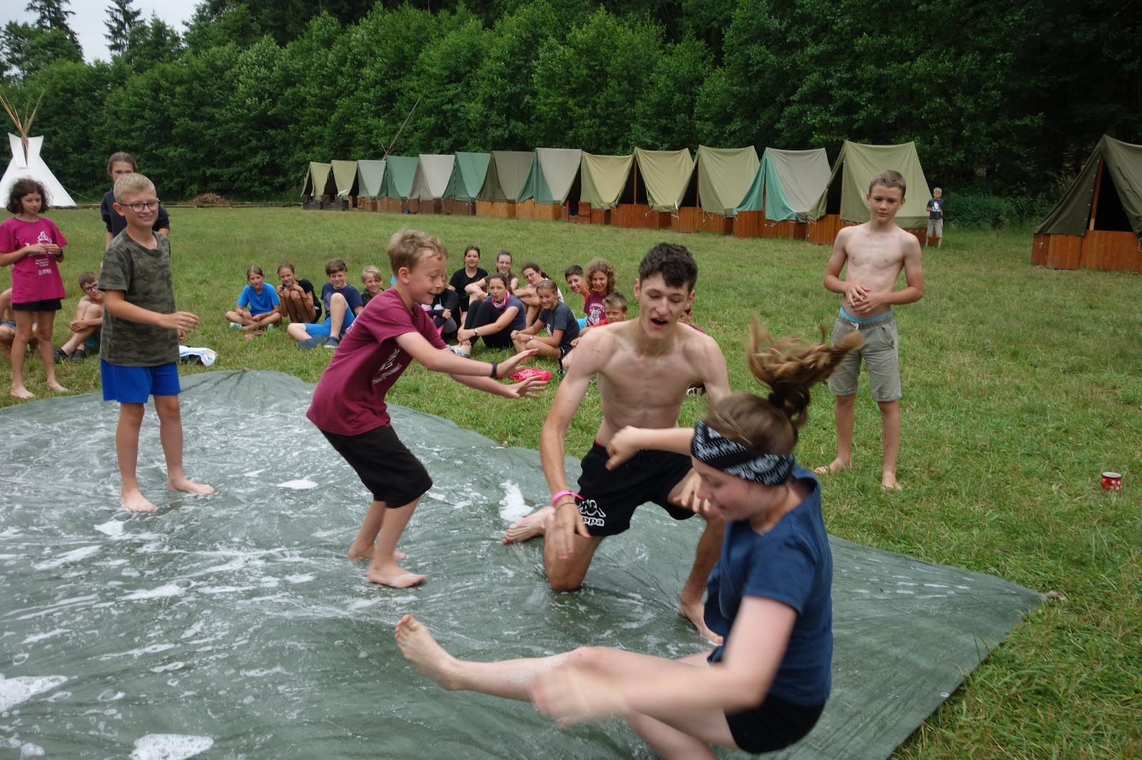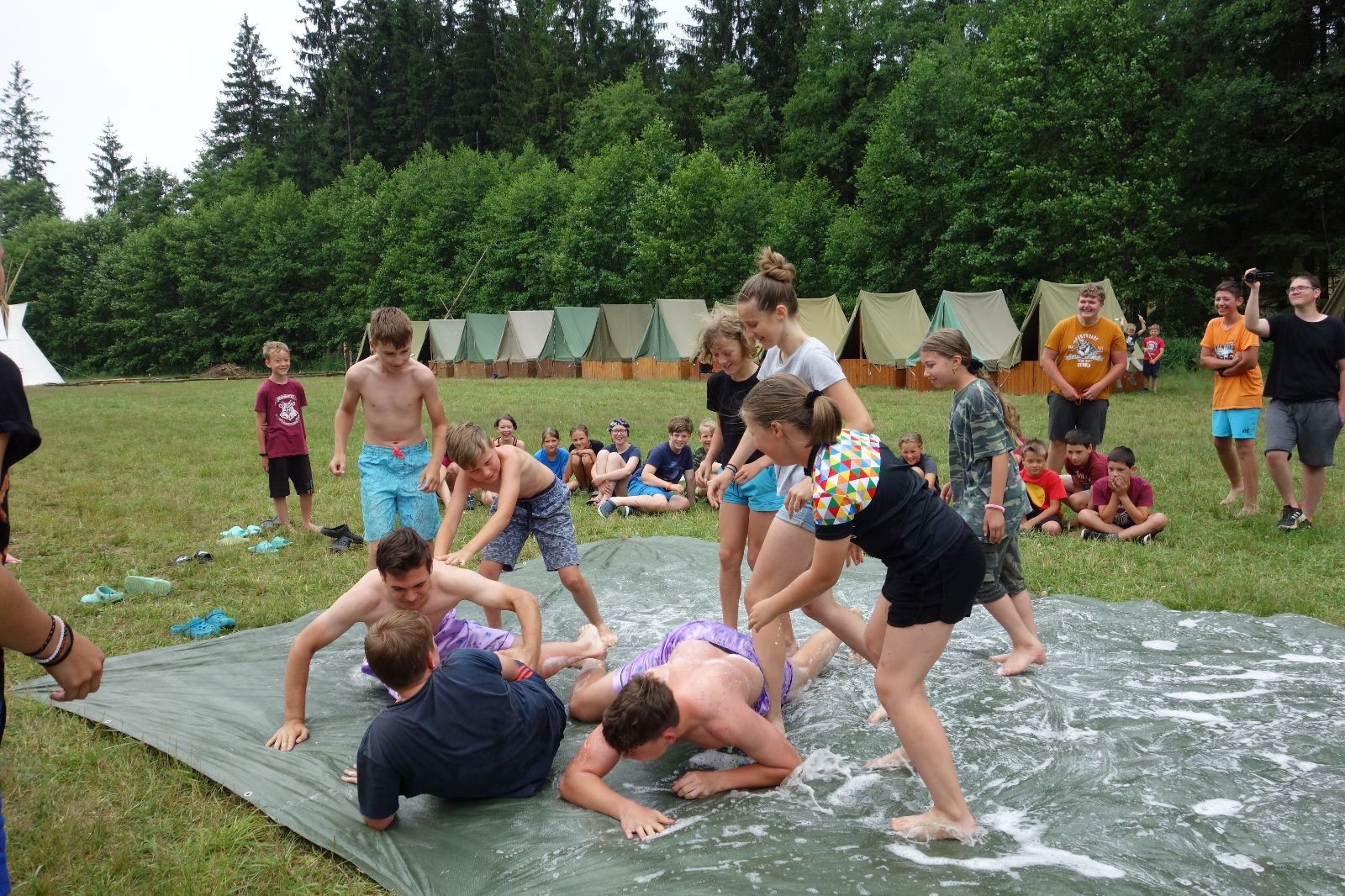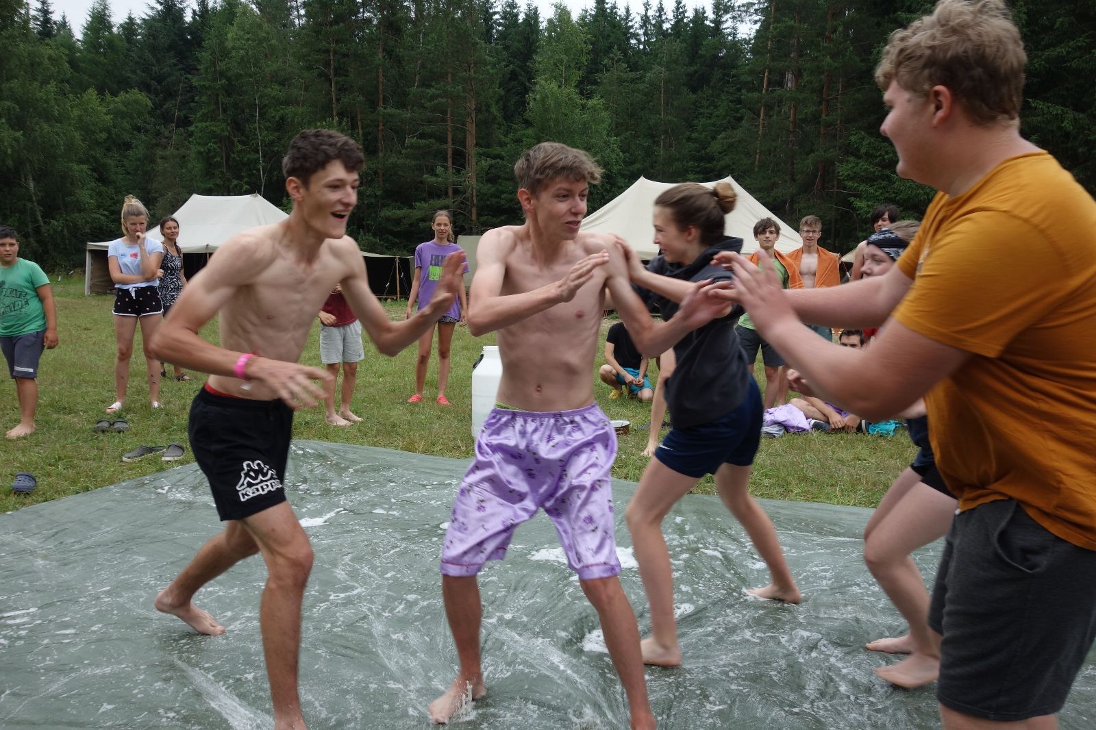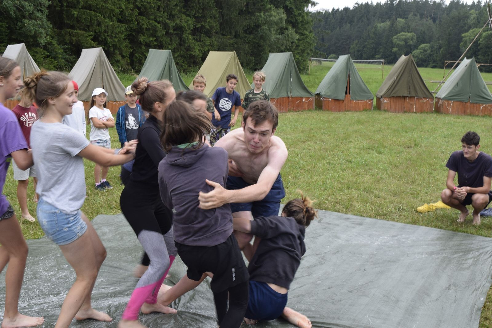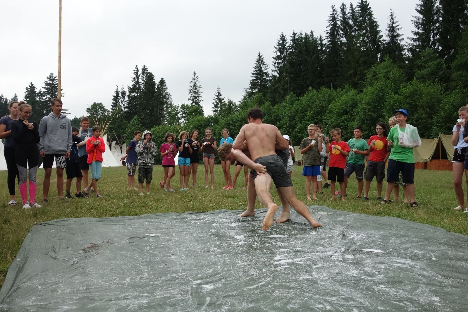 Noční přepad nám opět trošku zvětšil táborový spánkový deficit, ale co, zážitek to byl. Den se rozjíždí piánko – budíček, rozcvička, snídaně, bodování úklidu… A pak: souboje na mýdlové ploše. To je kultovní oddílová soutěž, kterou si obzvláště starší neskutečně užívají. Mladší mezi tím hrají hru v lese. Na oběd máme těstoviny s kečupem a sýrem, po poledním klidu následuje družinový program. Kulinářské zážitky, cesty do okolí tábora, koupání v přehradě, plavba na loďkách na rybníku…co družinka to dobrý nápad. Večer po sněmu zkoušíme novinku – stolní hry. Každý vedoucí má nějakou hru na starost a zájemci si můžou přijít zahrát. Vypadá to, že novinka se osvědčila.