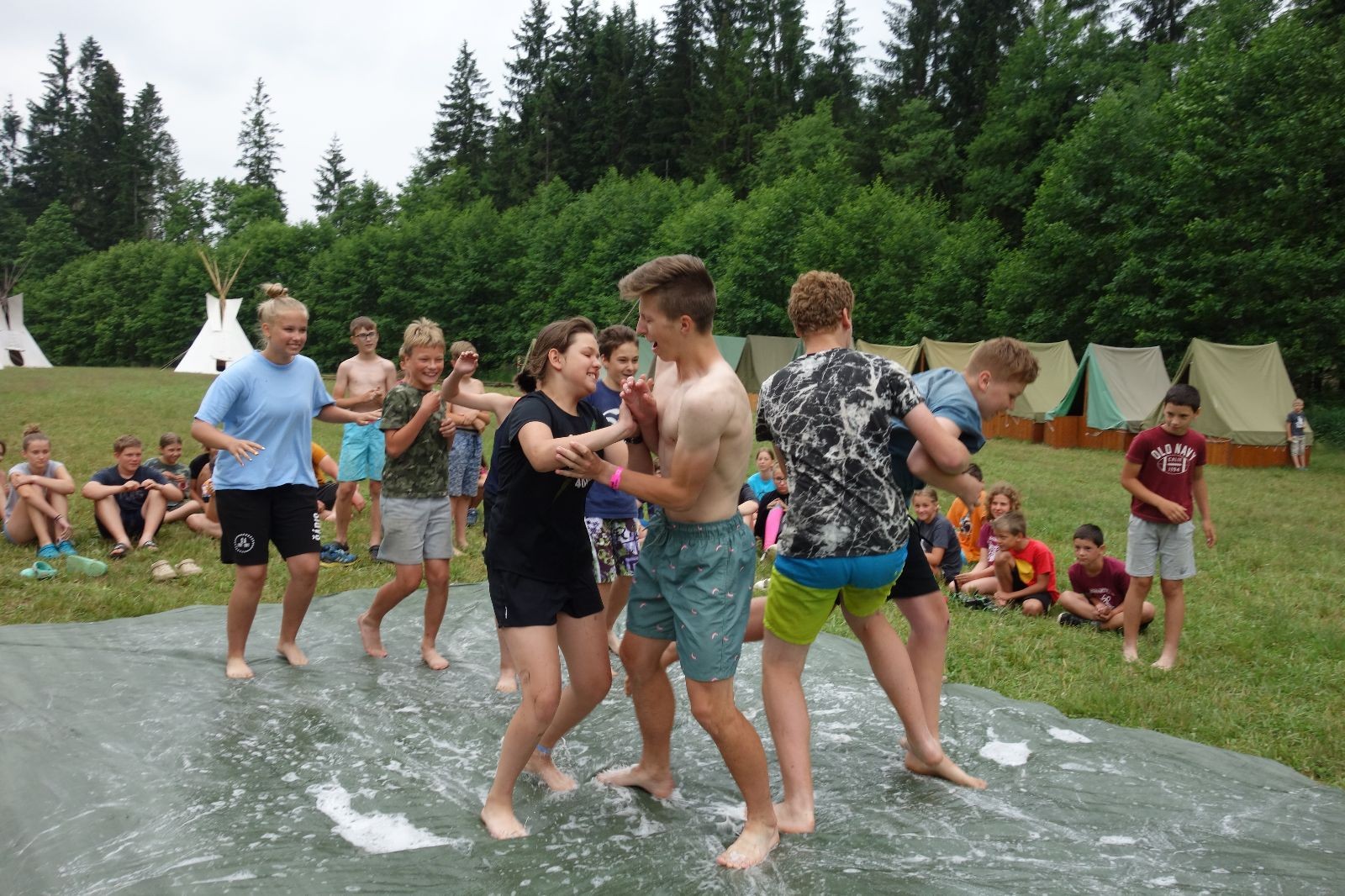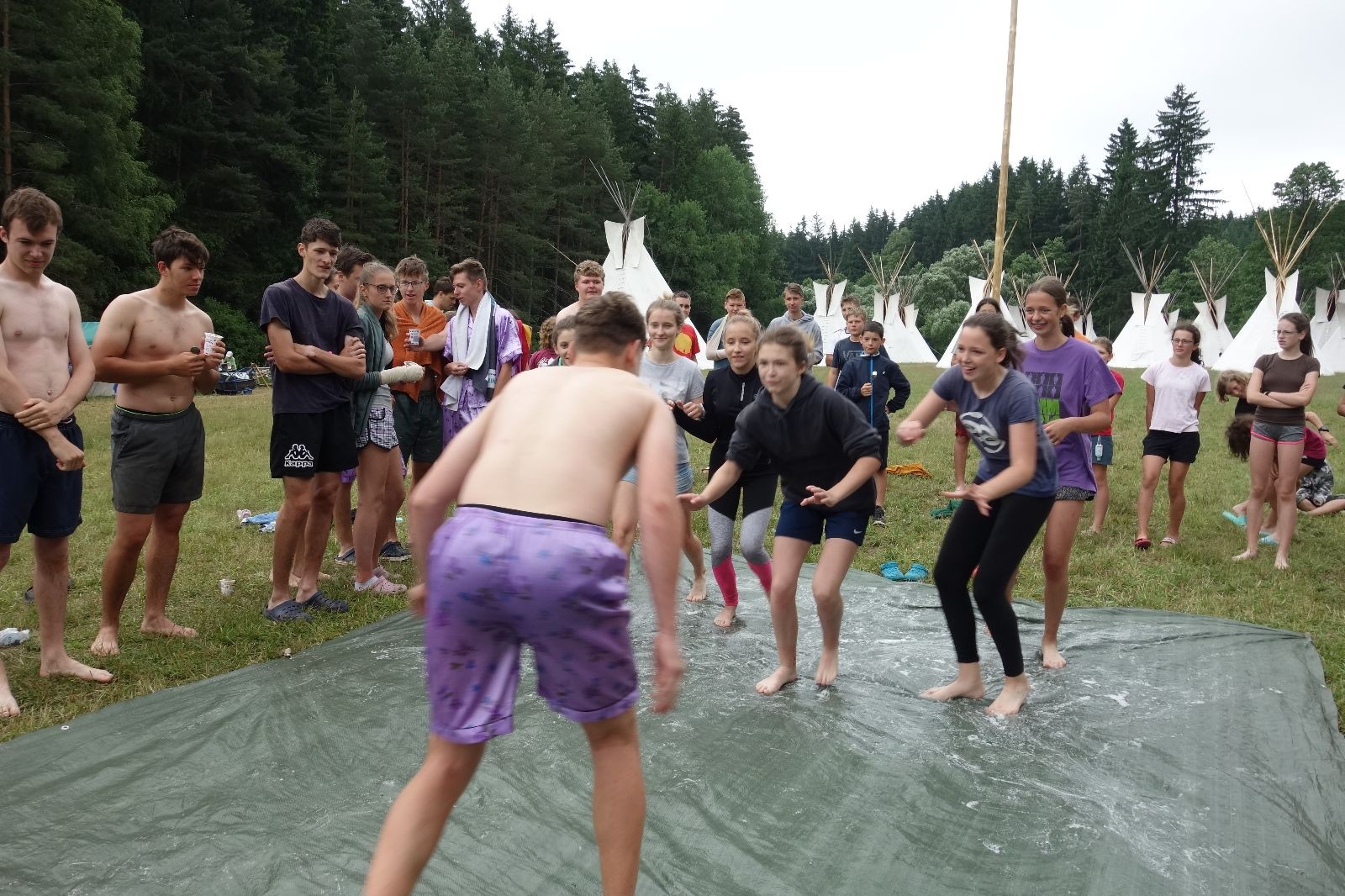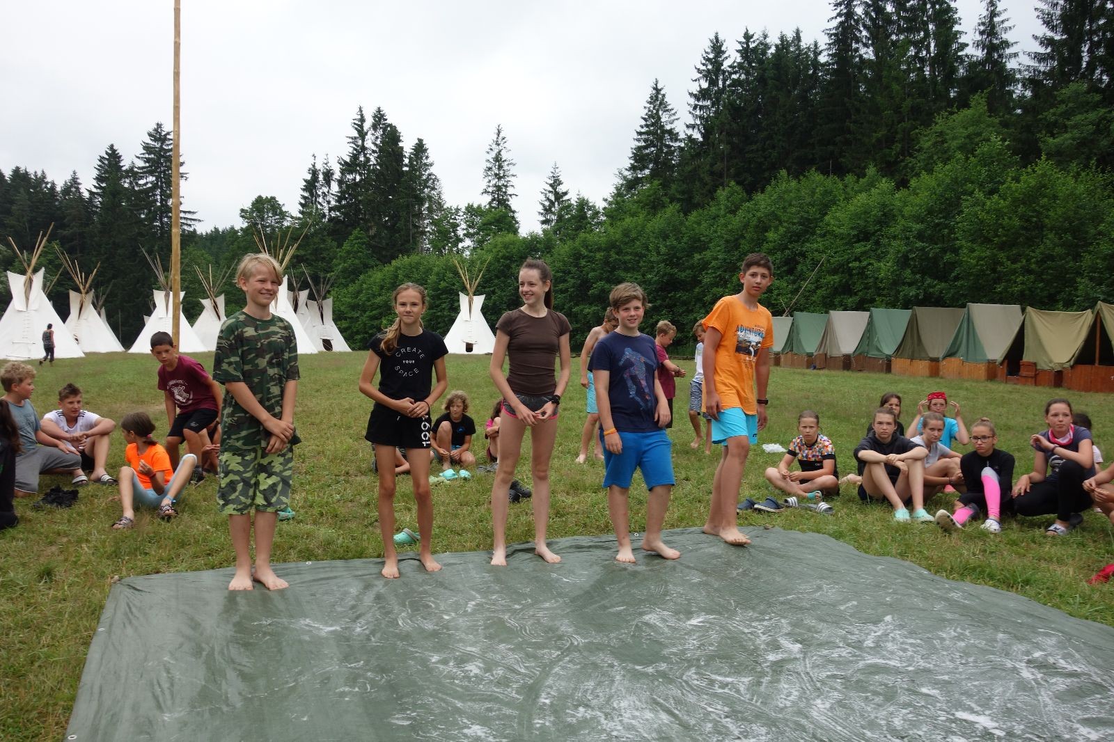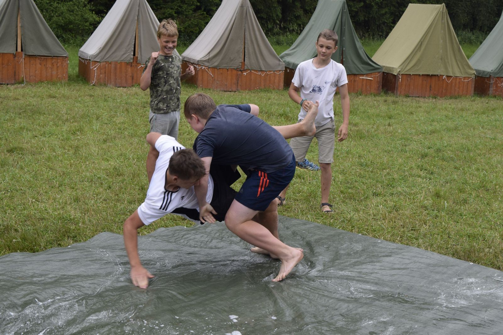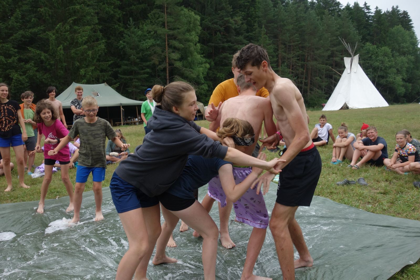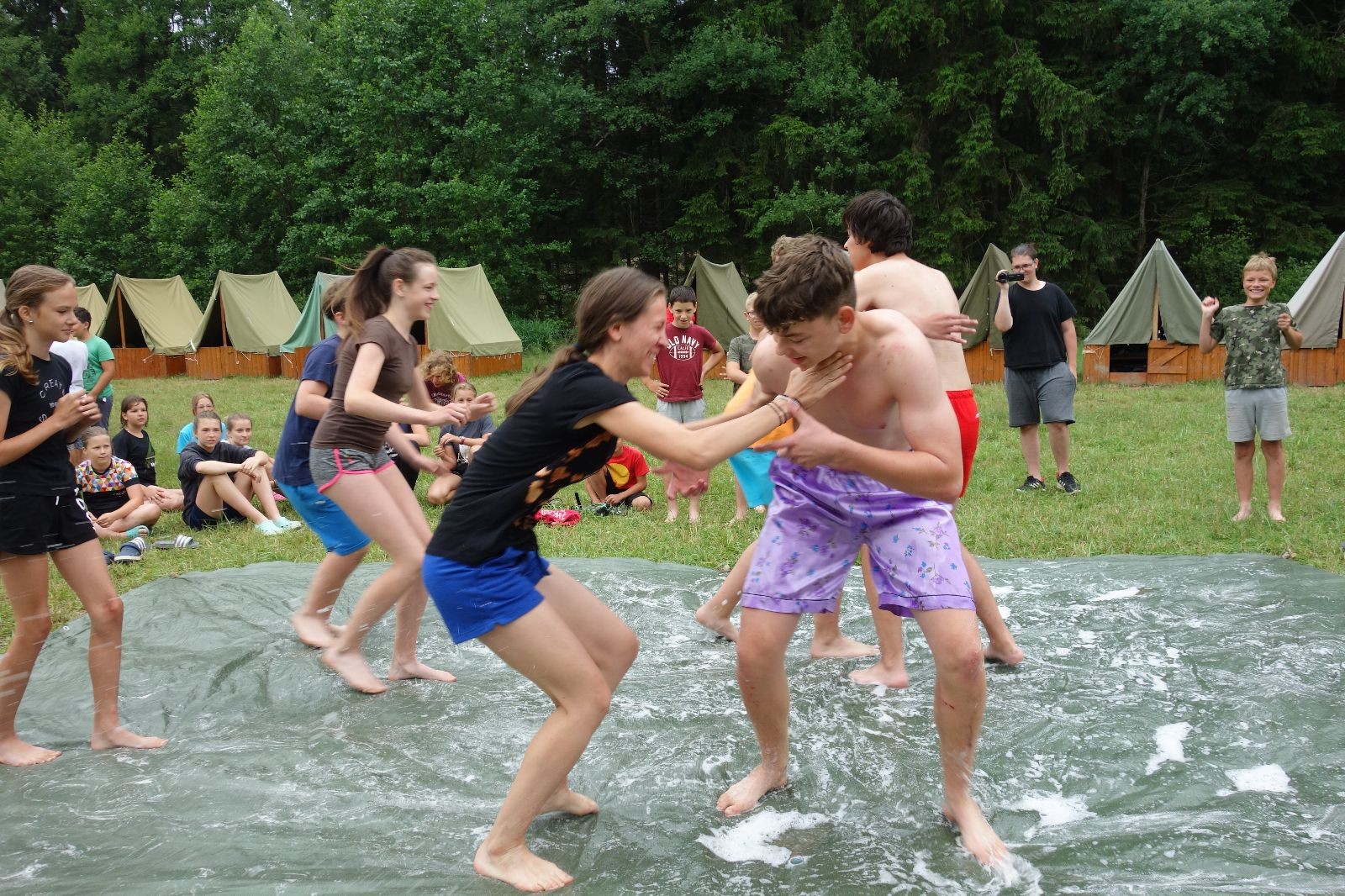 Noční přepad nám opět trošku zvětšil táborový spánkový deficit, ale co, zážitek to byl. Den se rozjíždí piánko – budíček, rozcvička, snídaně, bodování úklidu… A pak: souboje na mýdlové ploše. To je kultovní oddílová soutěž, kterou si obzvláště starší neskutečně užívají. Mladší mezi tím hrají hru v lese. Na oběd máme těstoviny s kečupem a sýrem, po poledním klidu následuje družinový program. Kulinářské zážitky, cesty do okolí tábora, koupání v přehradě, plavba na loďkách na rybníku…co družinka to dobrý nápad. Večer po sněmu zkoušíme novinku – stolní hry. Každý vedoucí má nějakou hru na starost a zájemci si můžou přijít zahrát. Vypadá to, že novinka se osvědčila.