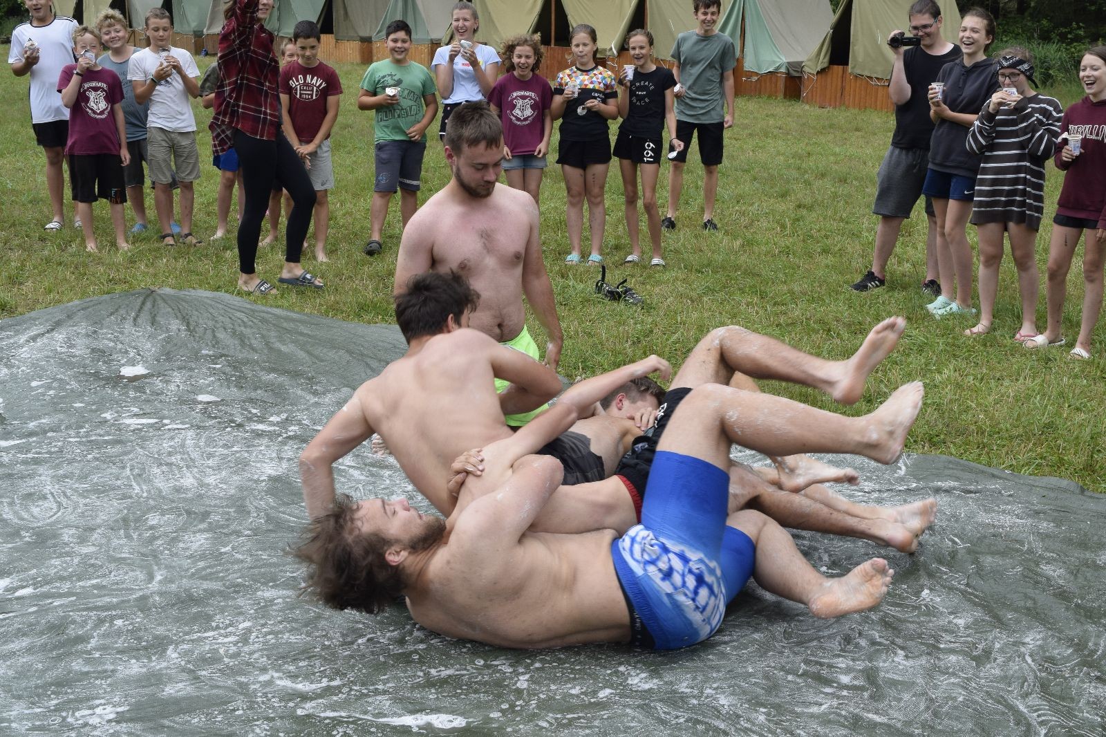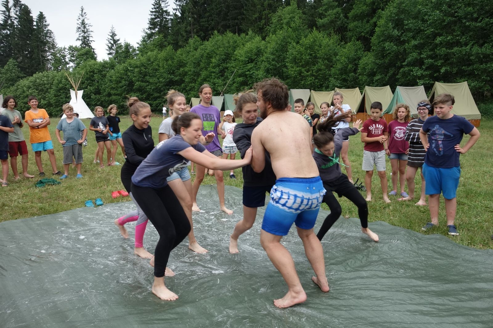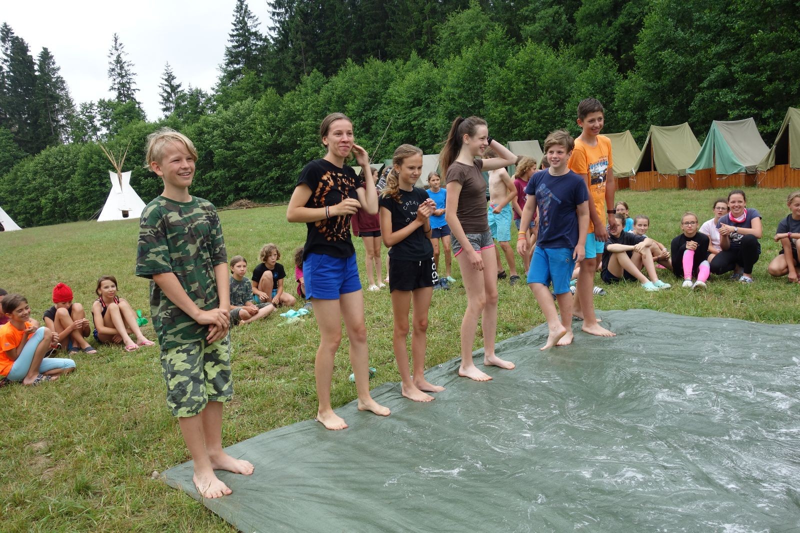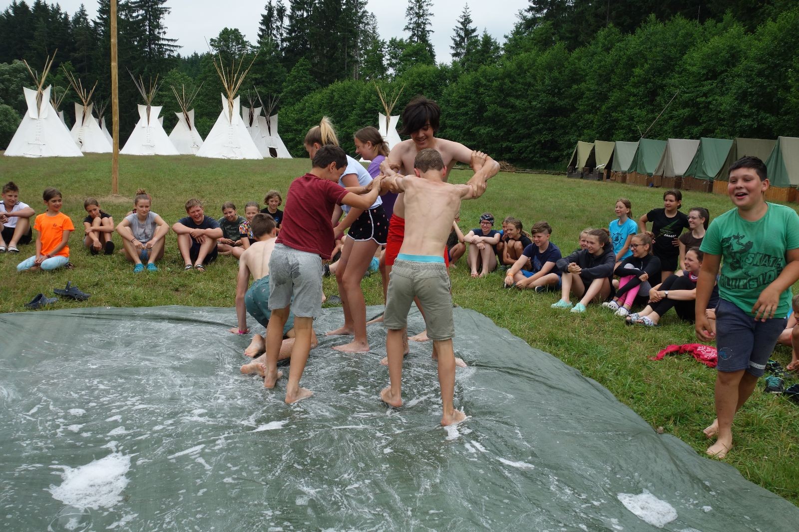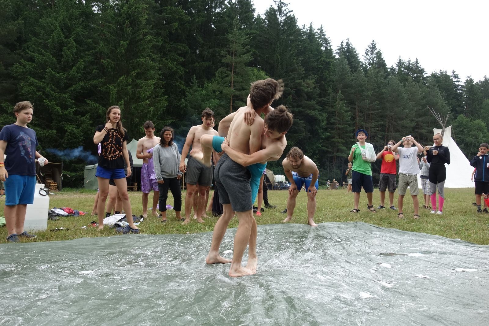 Noční přepad nám opět trošku zvětšil táborový spánkový deficit, ale co, zážitek to byl. Den se rozjíždí piánko – budíček, rozcvička, snídaně, bodování úklidu… A pak: souboje na mýdlové ploše. To je kultovní oddílová soutěž, kterou si obzvláště starší neskutečně užívají. Mladší mezi tím hrají hru v lese. Na oběd máme těstoviny s kečupem a sýrem, po poledním klidu následuje družinový program. Kulinářské zážitky, cesty do okolí tábora, koupání v přehradě, plavba na loďkách na rybníku…co družinka to dobrý nápad. Večer po sněmu zkoušíme novinku – stolní hry. Každý vedoucí má nějakou hru na starost a zájemci si můžou přijít zahrát. Vypadá to, že novinka se osvědčila.