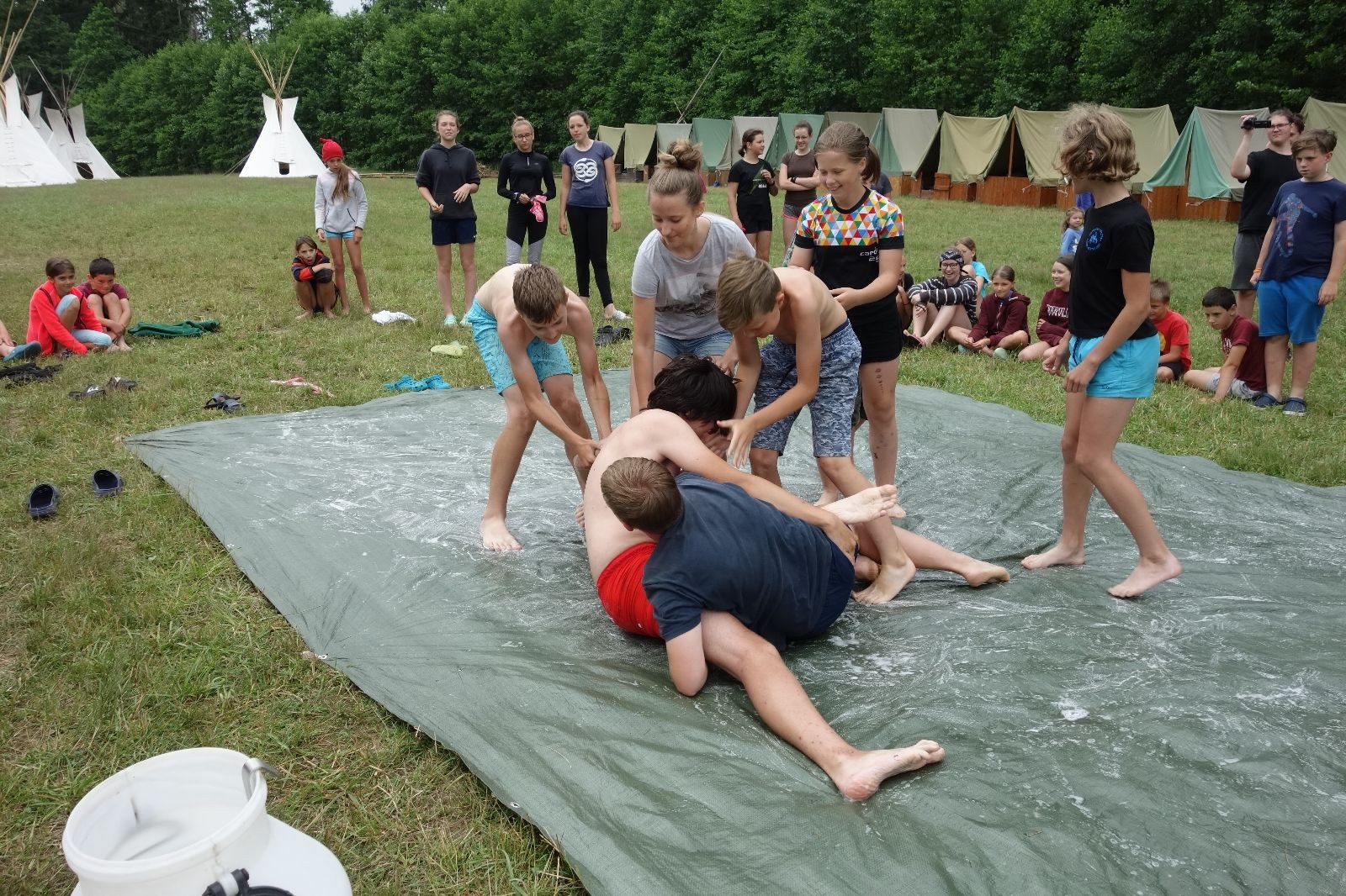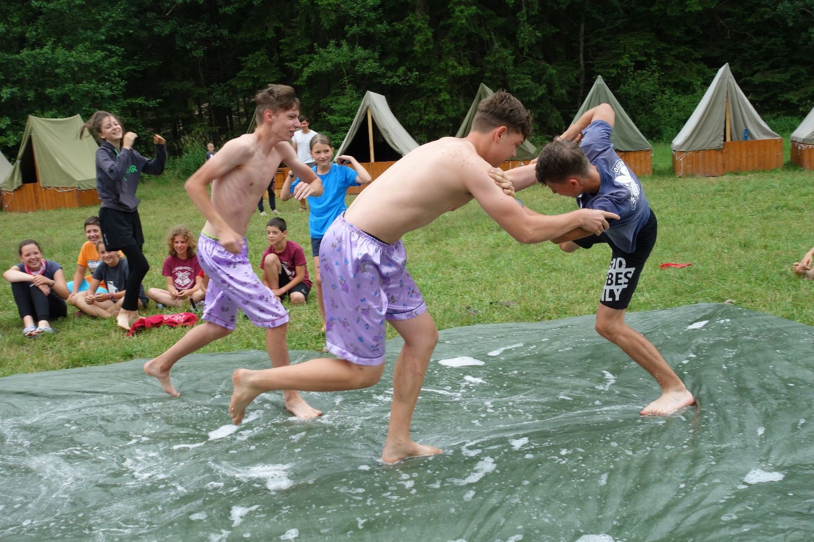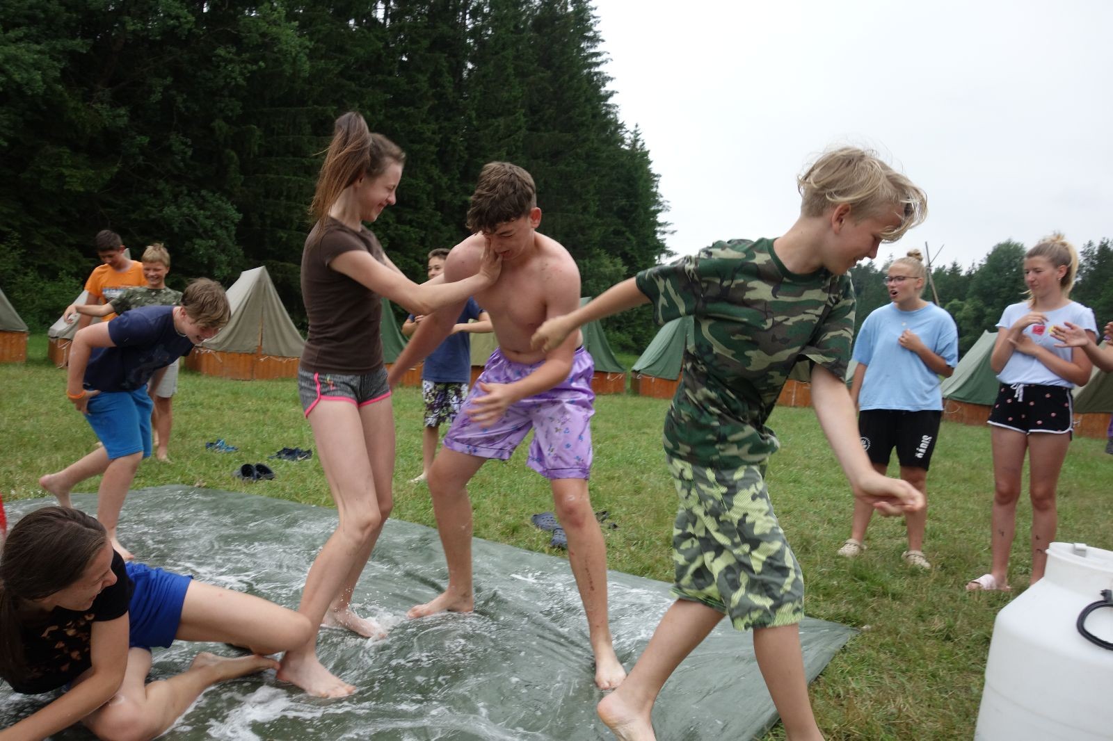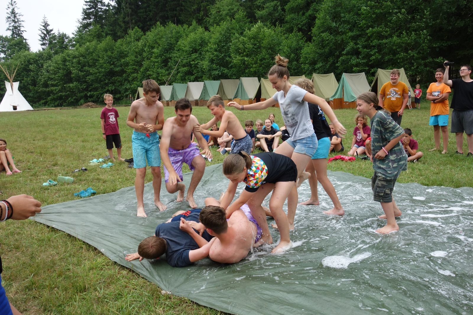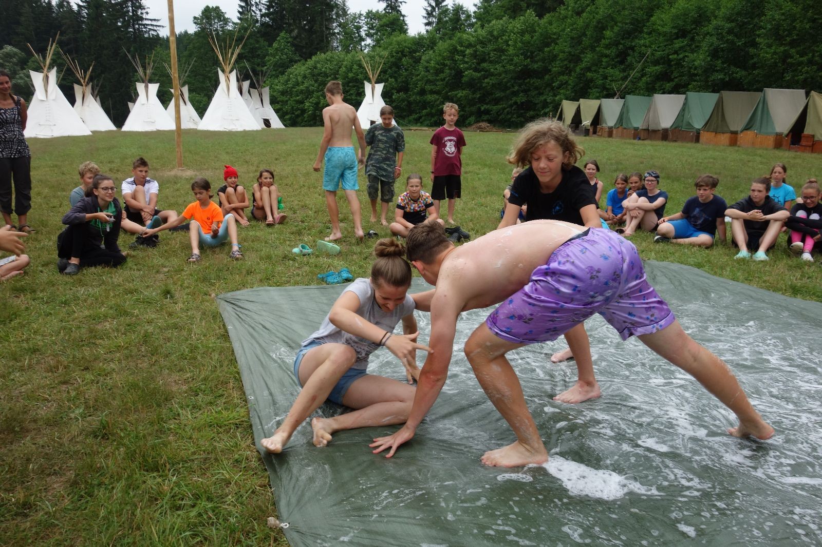Noční přepad nám opět trošku zvětšil táborový spánkový deficit, ale co, zážitek to byl. Den se rozjíždí piánko – budíček, rozcvička, snídaně, bodování úklidu… A pak: souboje na mýdlové ploše. To je kultovní oddílová soutěž, kterou si obzvláště starší neskutečně užívají. Mladší mezi tím hrají hru v lese. Na oběd máme těstoviny s kečupem a sýrem, po poledním klidu následuje družinový program. Kulinářské zážitky, cesty do okolí tábora, koupání v přehradě, plavba na loďkách na rybníku…co družinka to dobrý nápad. Večer po sněmu zkoušíme novinku – stolní hry. Každý vedoucí má nějakou hru na starost a zájemci si můžou přijít zahrát. Vypadá to, že novinka se osvědčila.