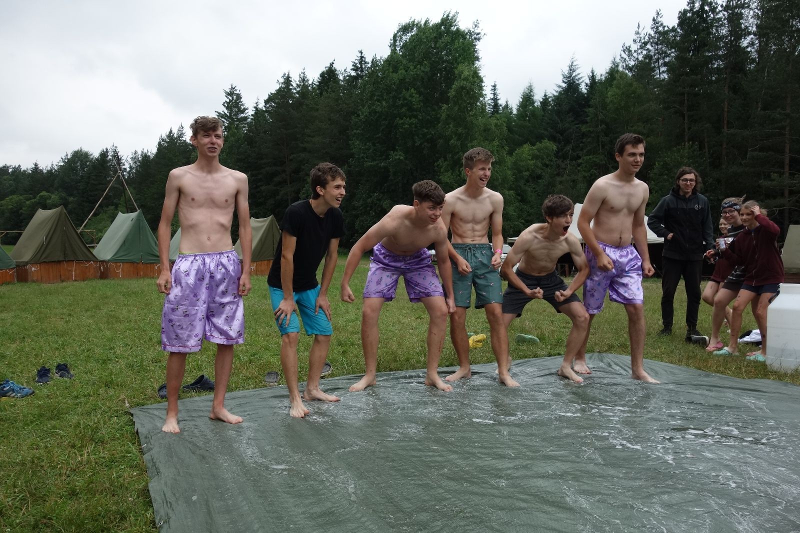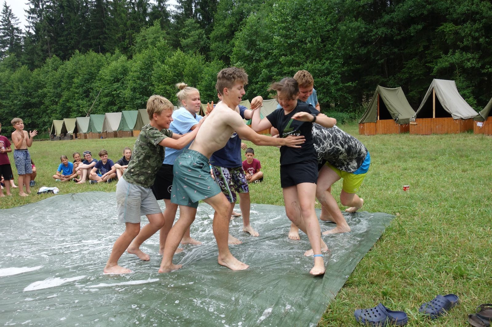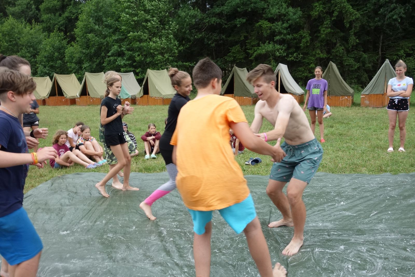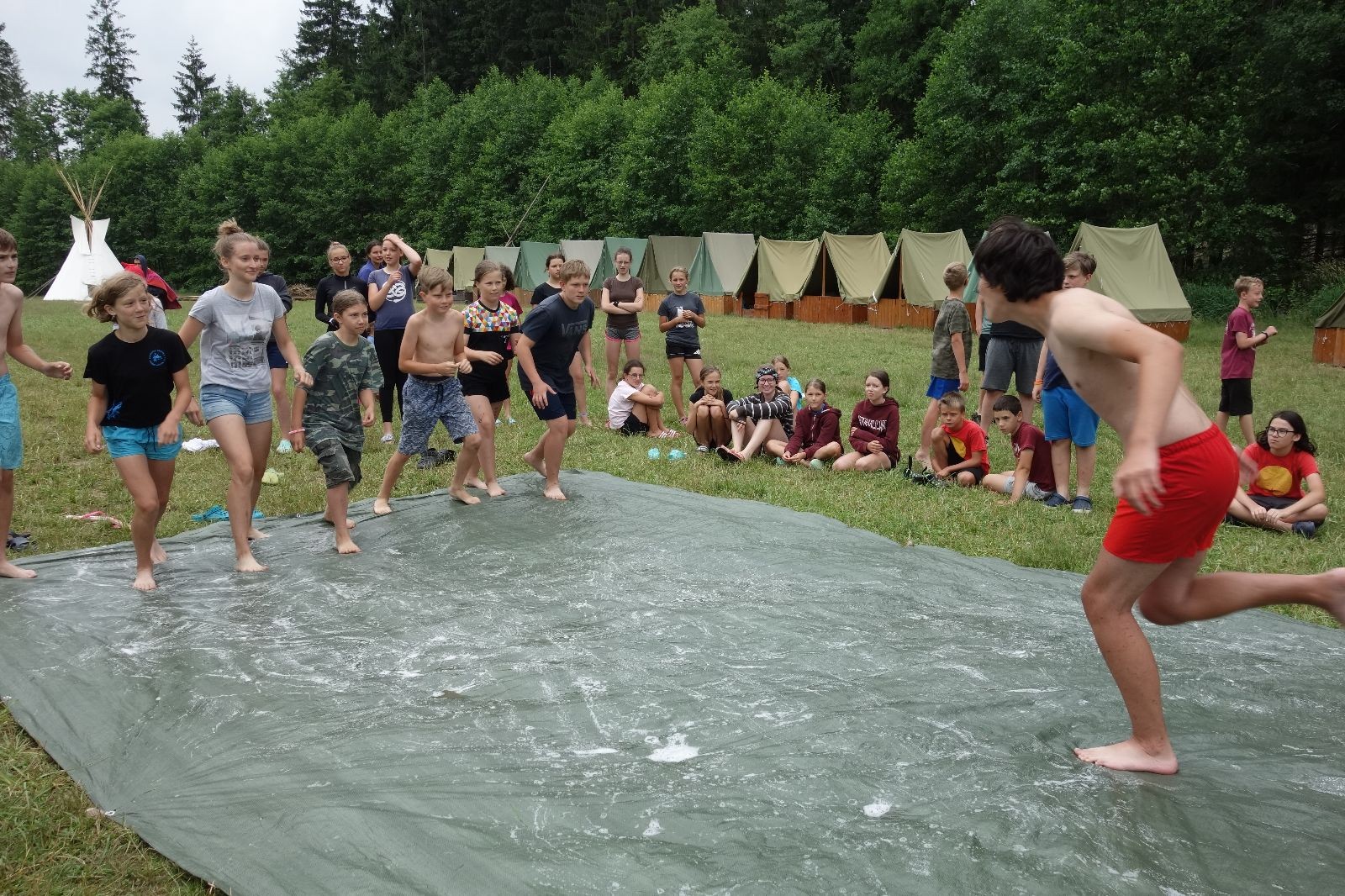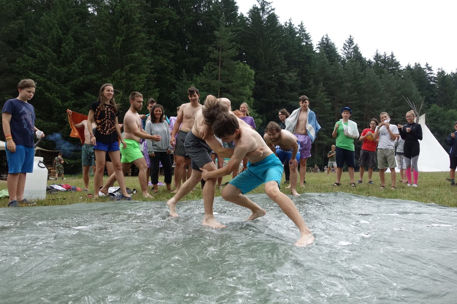 Noční přepad nám opět trošku zvětšil táborový spánkový deficit, ale co, zážitek to byl. Den se rozjíždí piánko – budíček, rozcvička, snídaně, bodování úklidu… A pak: souboje na mýdlové ploše. To je kultovní oddílová soutěž, kterou si obzvláště starší neskutečně užívají. Mladší mezi tím hrají hru v lese. Na oběd máme těstoviny s kečupem a sýrem, po poledním klidu následuje družinový program. Kulinářské zážitky, cesty do okolí tábora, koupání v přehradě, plavba na loďkách na rybníku…co družinka to dobrý nápad. Večer po sněmu zkoušíme novinku – stolní hry. Každý vedoucí má nějakou hru na starost a zájemci si můžou přijít zahrát. Vypadá to, že novinka se osvědčila.