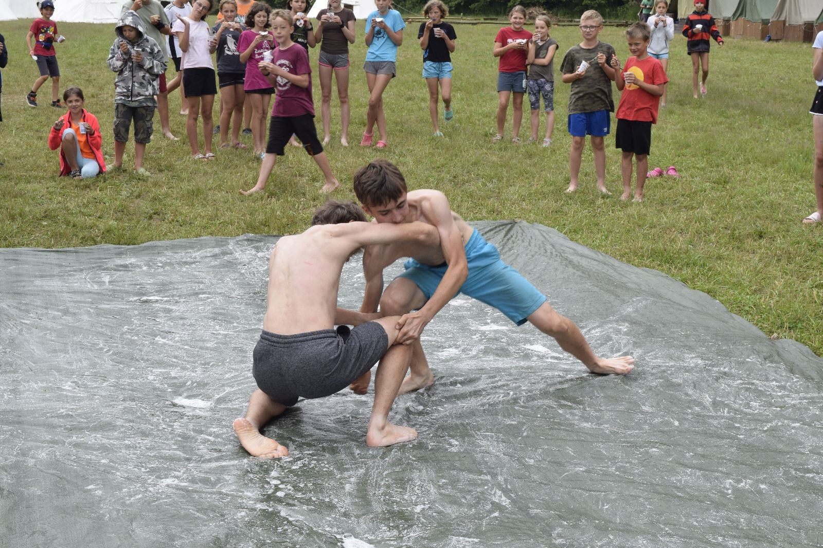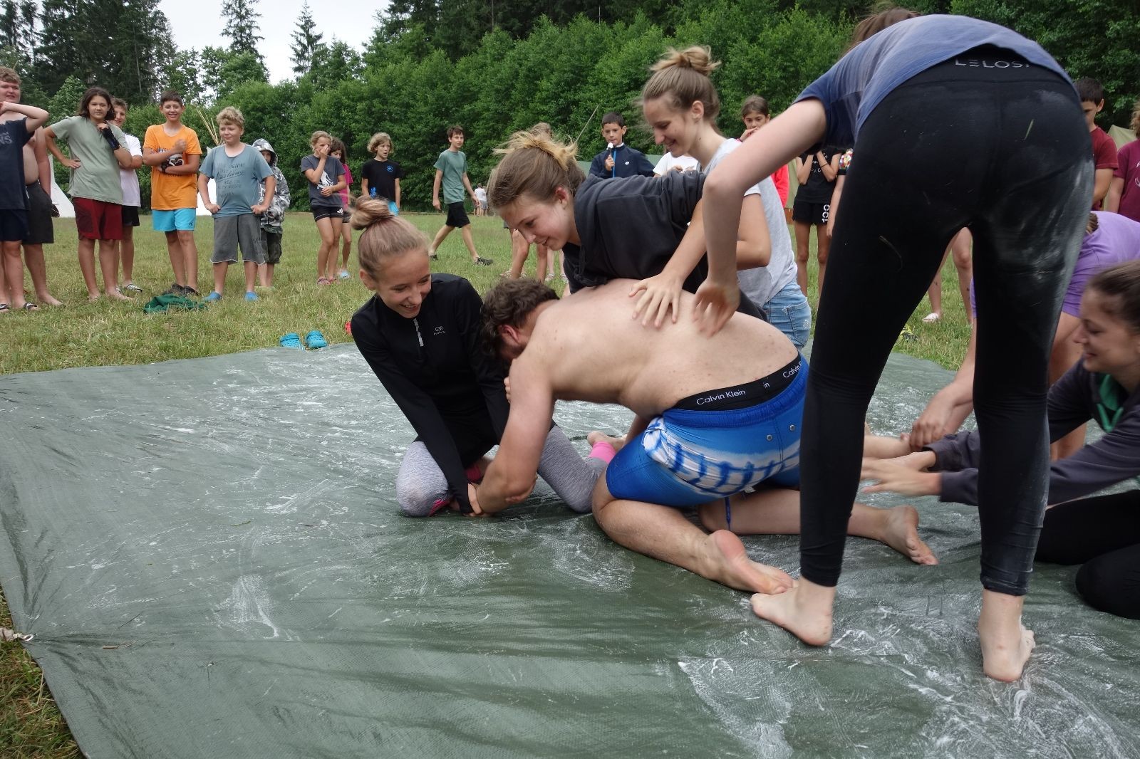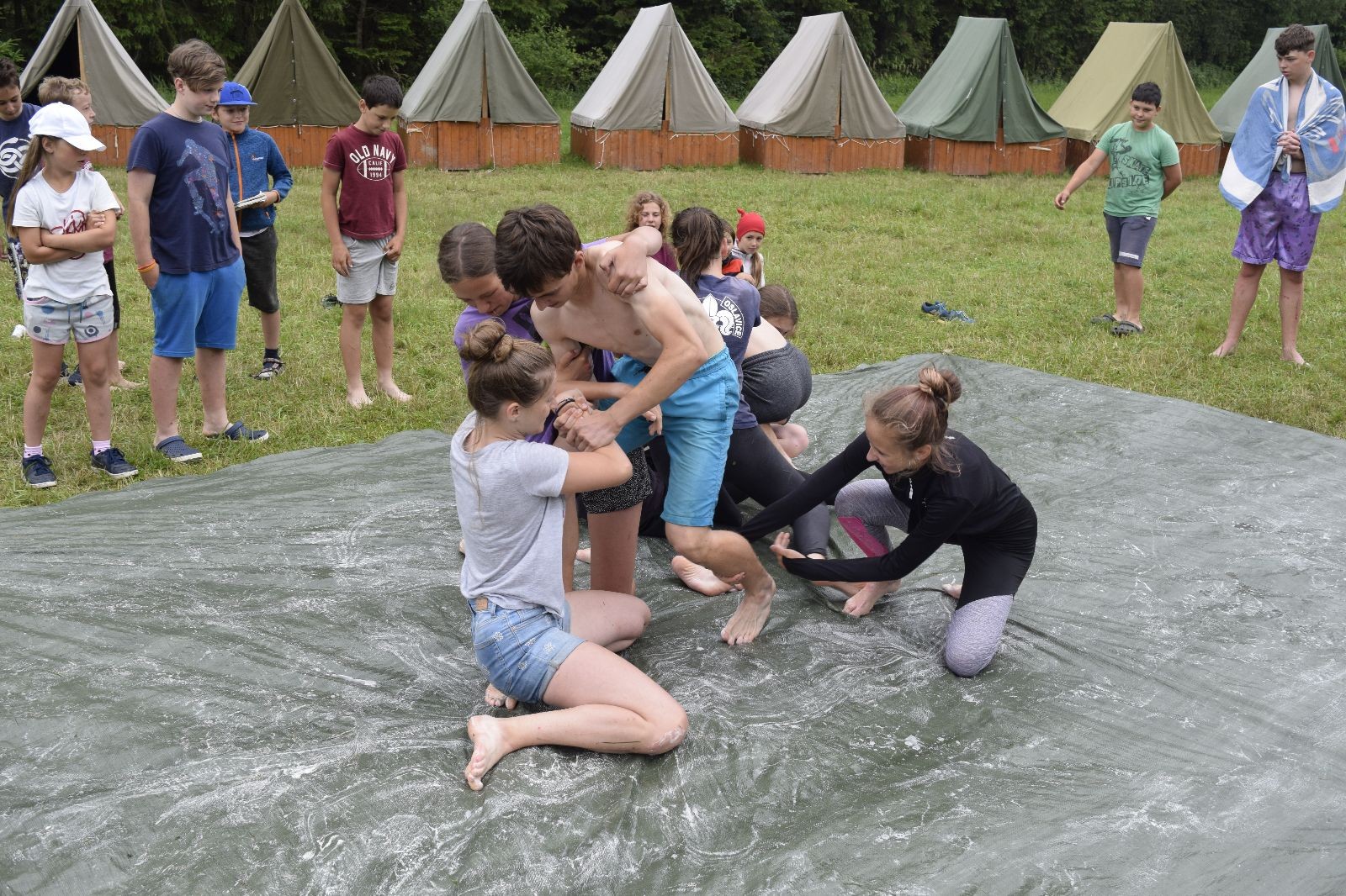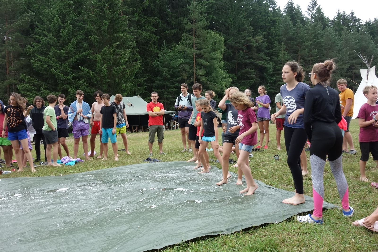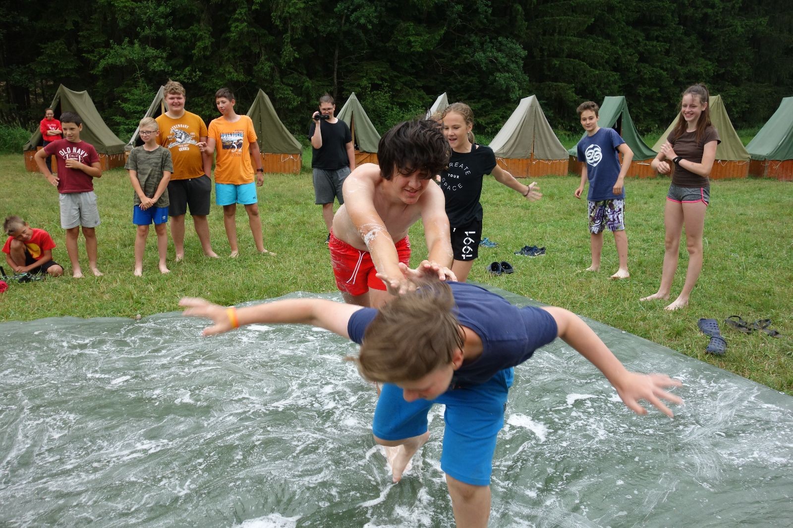 Noční přepad nám opět trošku zvětšil táborový spánkový deficit, ale co, zážitek to byl. Den se rozjíždí piánko – budíček, rozcvička, snídaně, bodování úklidu… A pak: souboje na mýdlové ploše. To je kultovní oddílová soutěž, kterou si obzvláště starší neskutečně užívají. Mladší mezi tím hrají hru v lese. Na oběd máme těstoviny s kečupem a sýrem, po poledním klidu následuje družinový program. Kulinářské zážitky, cesty do okolí tábora, koupání v přehradě, plavba na loďkách na rybníku…co družinka to dobrý nápad. Večer po sněmu zkoušíme novinku – stolní hry. Každý vedoucí má nějakou hru na starost a zájemci si můžou přijít zahrát. Vypadá to, že novinka se osvědčila.