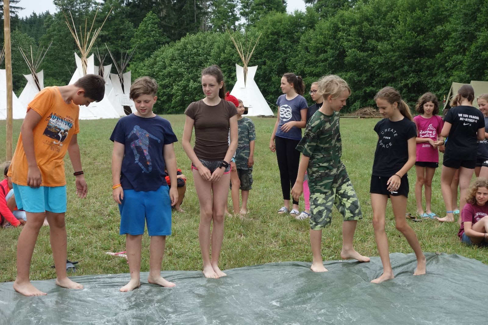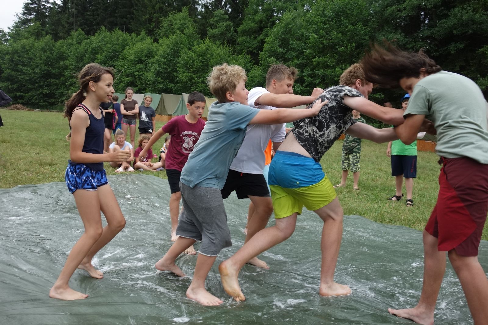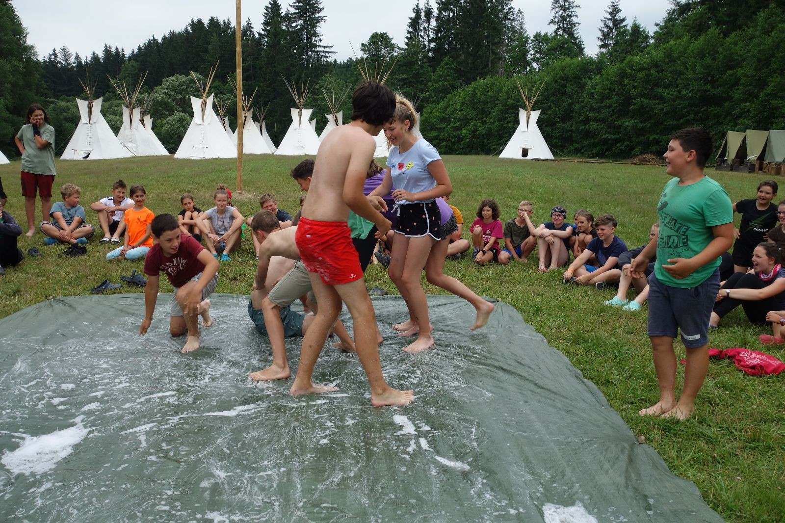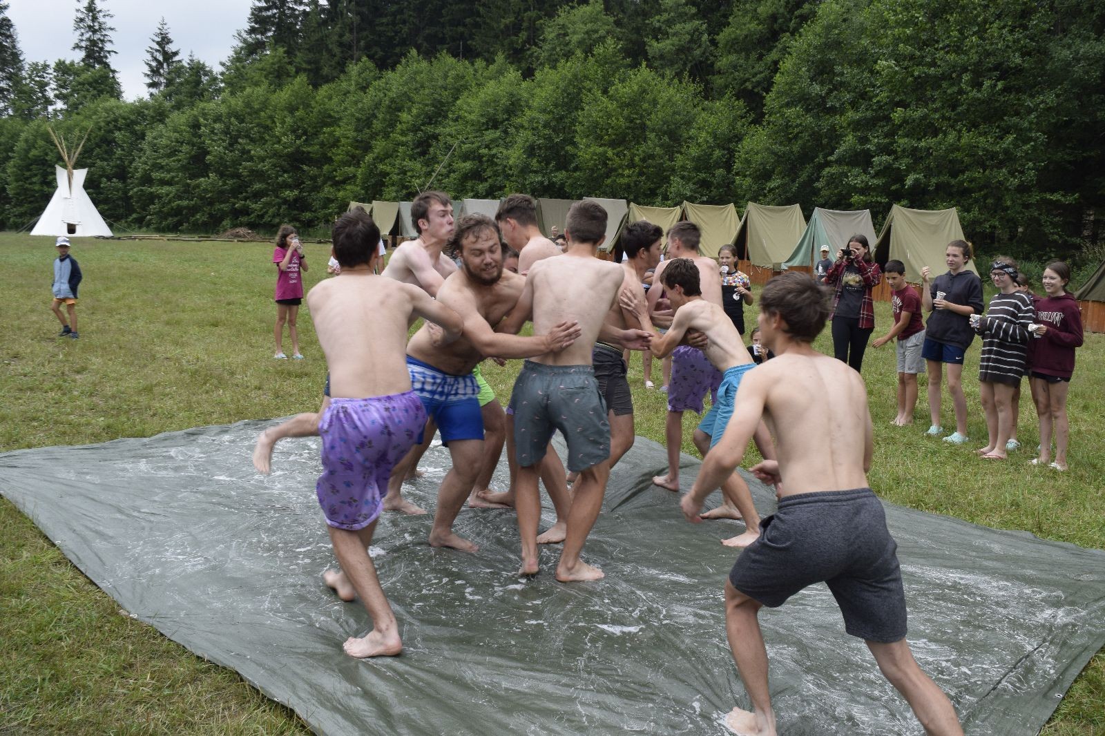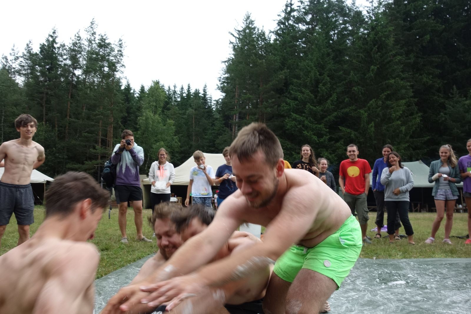 Noční přepad nám opět trošku zvětšil táborový spánkový deficit, ale co, zážitek to byl. Den se rozjíždí piánko – budíček, rozcvička, snídaně, bodování úklidu… A pak: souboje na mýdlové ploše. To je kultovní oddílová soutěž, kterou si obzvláště starší neskutečně užívají. Mladší mezi tím hrají hru v lese. Na oběd máme těstoviny s kečupem a sýrem, po poledním klidu následuje družinový program. Kulinářské zážitky, cesty do okolí tábora, koupání v přehradě, plavba na loďkách na rybníku…co družinka to dobrý nápad. Večer po sněmu zkoušíme novinku – stolní hry. Každý vedoucí má nějakou hru na starost a zájemci si můžou přijít zahrát. Vypadá to, že novinka se osvědčila.