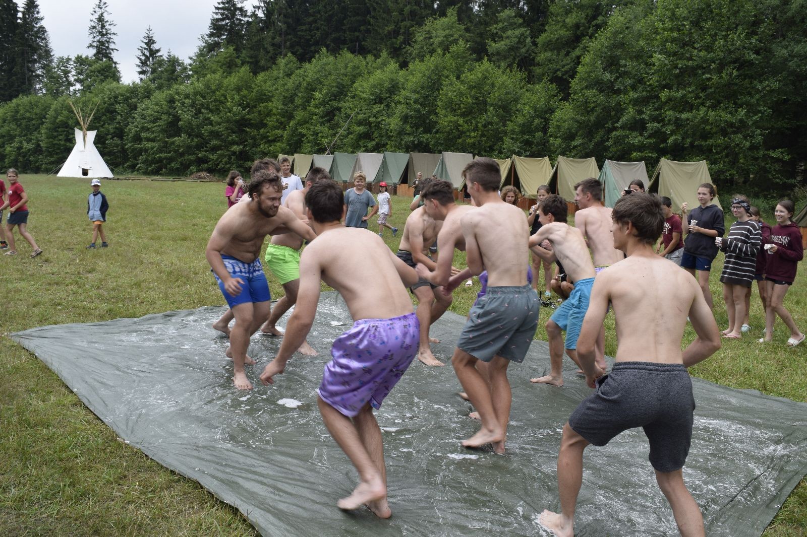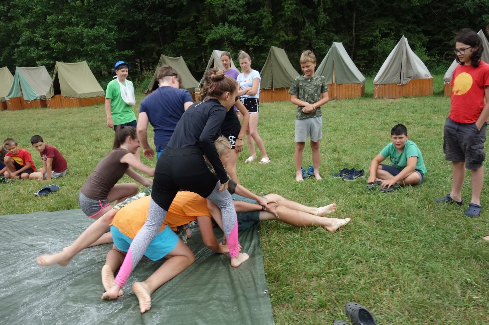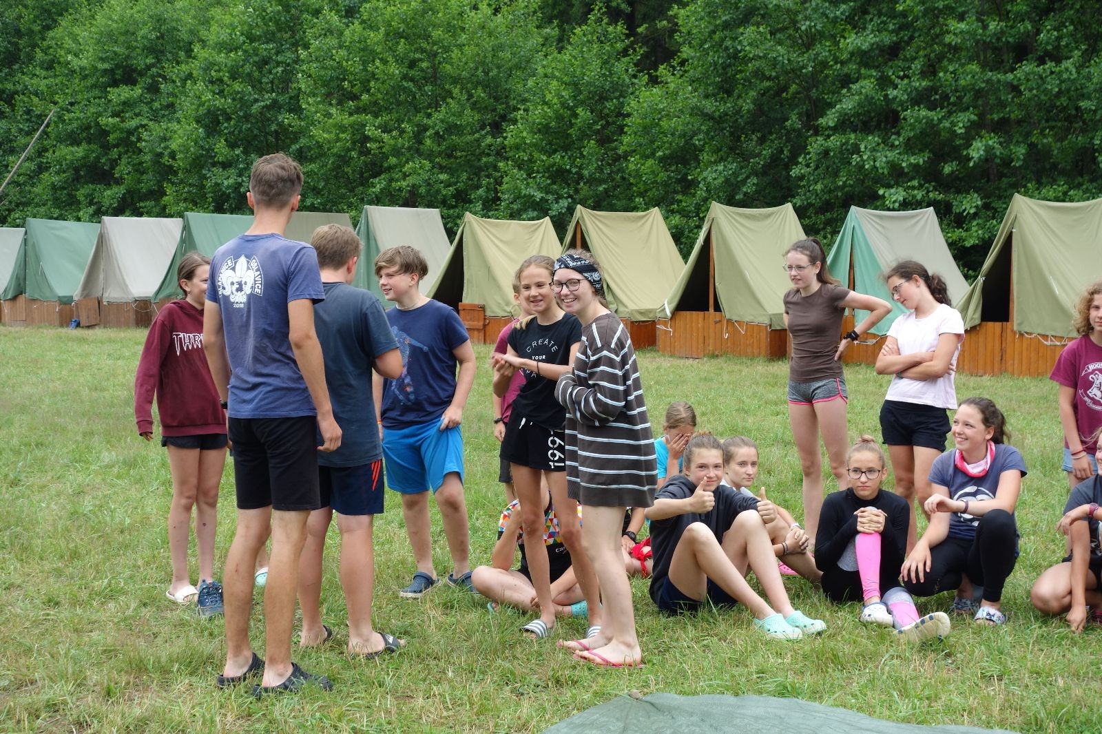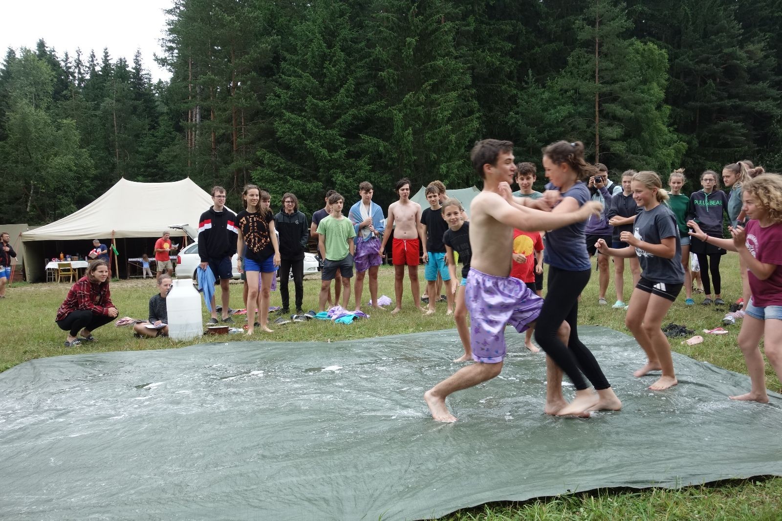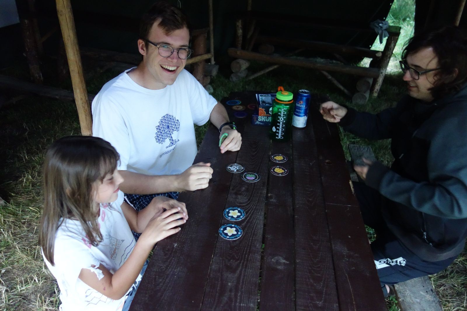 Noční přepad nám opět trošku zvětšil táborový spánkový deficit, ale co, zážitek to byl. Den se rozjíždí piánko – budíček, rozcvička, snídaně, bodování úklidu… A pak: souboje na mýdlové ploše. To je kultovní oddílová soutěž, kterou si obzvláště starší neskutečně užívají. Mladší mezi tím hrají hru v lese. Na oběd máme těstoviny s kečupem a sýrem, po poledním klidu následuje družinový program. Kulinářské zážitky, cesty do okolí tábora, koupání v přehradě, plavba na loďkách na rybníku…co družinka to dobrý nápad. Večer po sněmu zkoušíme novinku – stolní hry. Každý vedoucí má nějakou hru na starost a zájemci si můžou přijít zahrát. Vypadá to, že novinka se osvědčila.