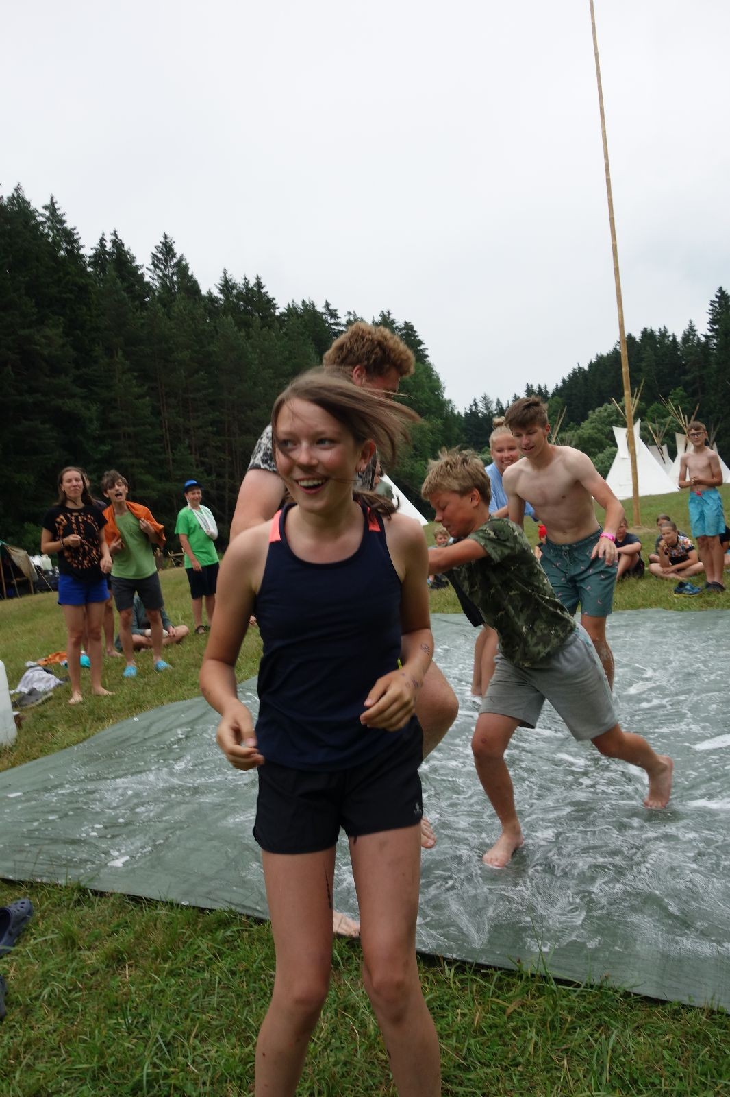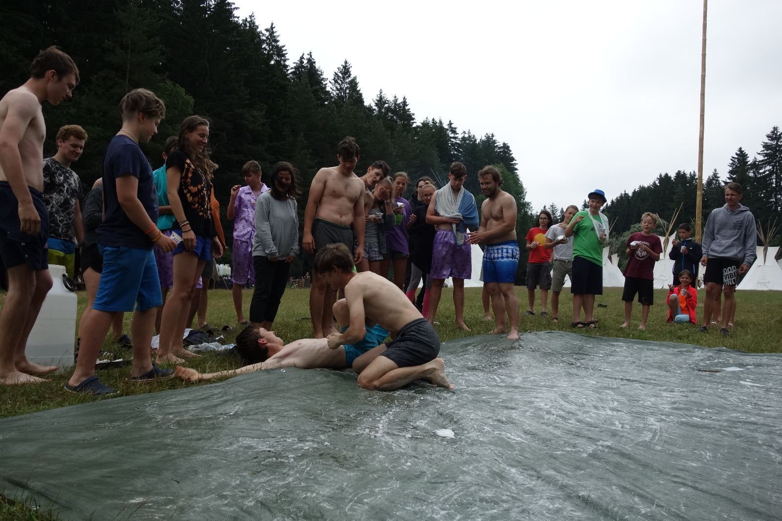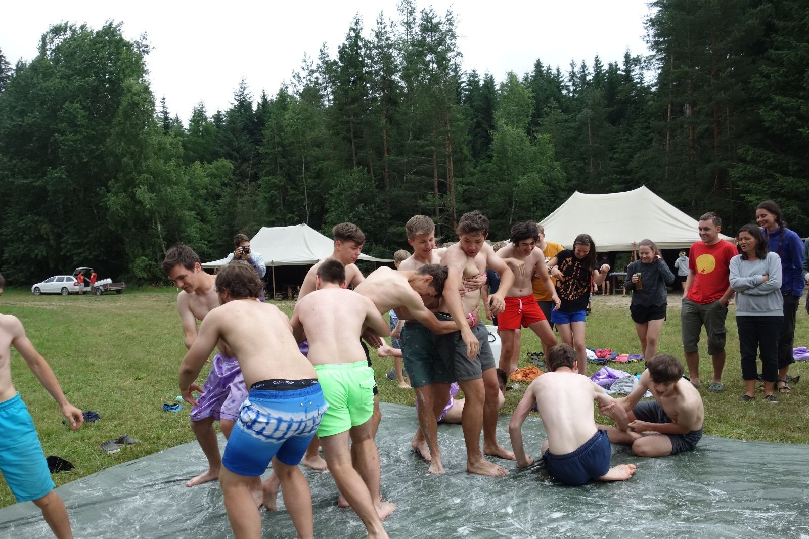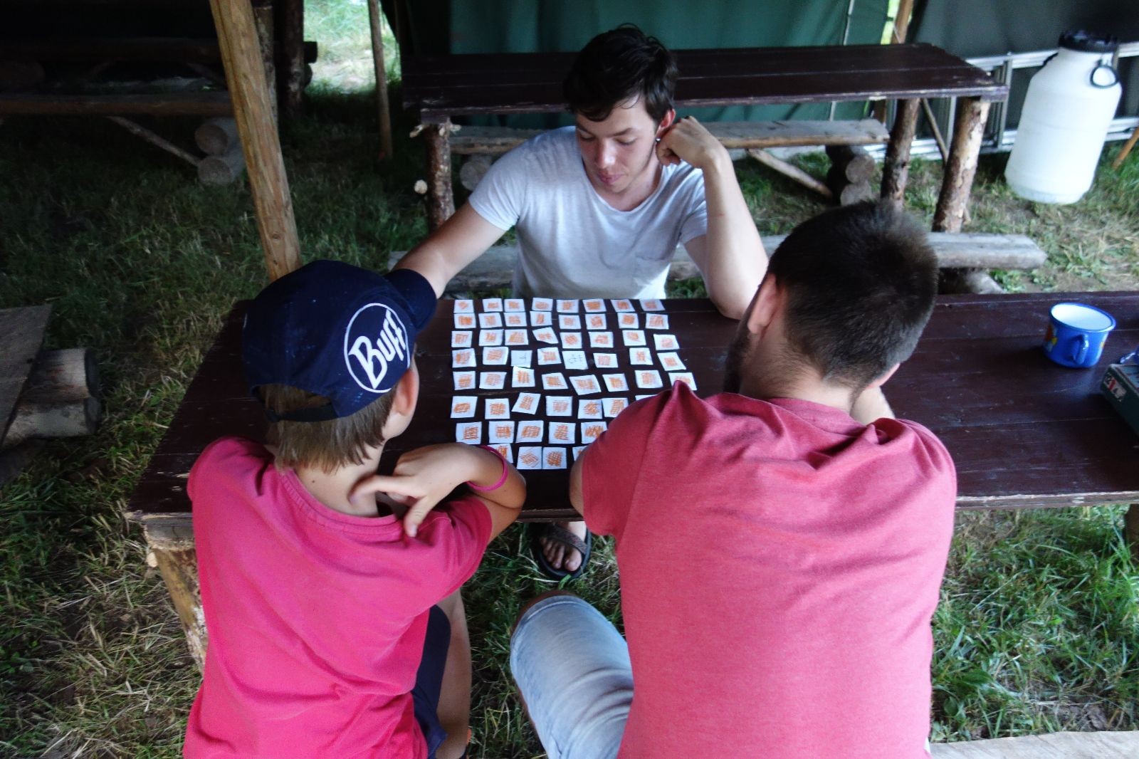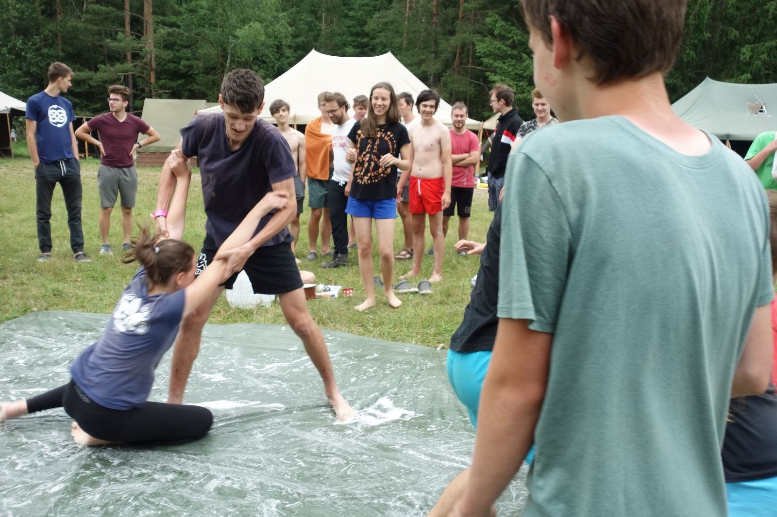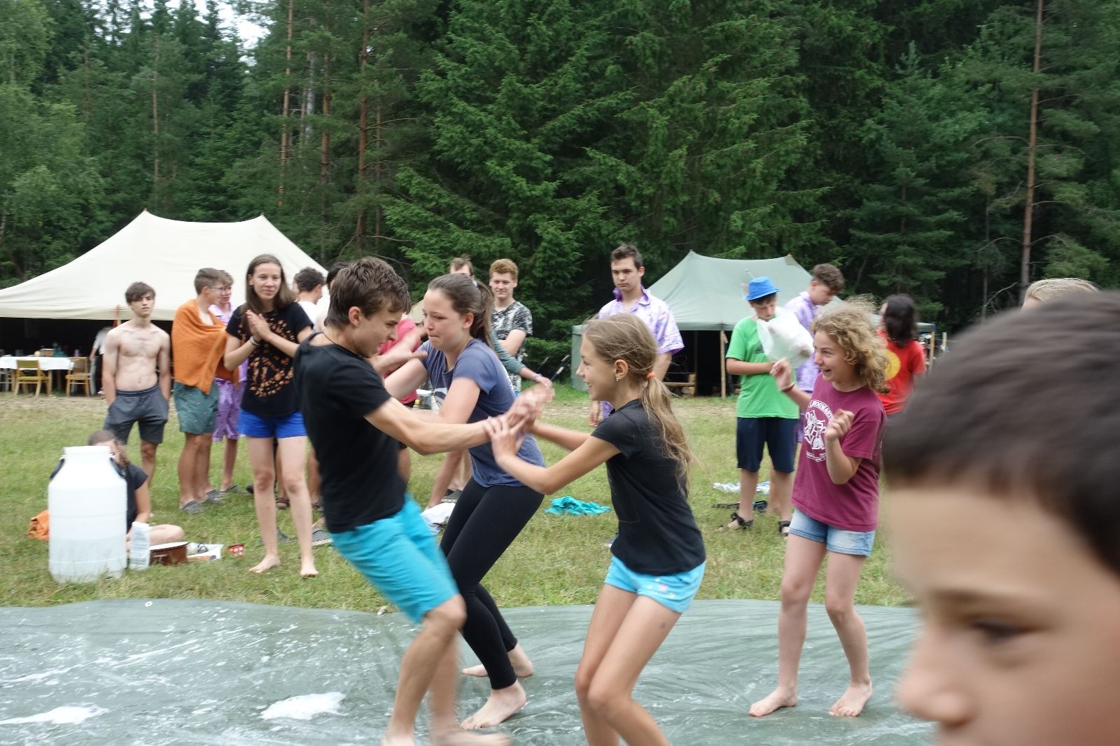 Noční přepad nám opět trošku zvětšil táborový spánkový deficit, ale co, zážitek to byl. Den se rozjíždí piánko – budíček, rozcvička, snídaně, bodování úklidu… A pak: souboje na mýdlové ploše. To je kultovní oddílová soutěž, kterou si obzvláště starší neskutečně užívají. Mladší mezi tím hrají hru v lese. Na oběd máme těstoviny s kečupem a sýrem, po poledním klidu následuje družinový program. Kulinářské zážitky, cesty do okolí tábora, koupání v přehradě, plavba na loďkách na rybníku…co družinka to dobrý nápad. Večer po sněmu zkoušíme novinku – stolní hry. Každý vedoucí má nějakou hru na starost a zájemci si můžou přijít zahrát. Vypadá to, že novinka se osvědčila.