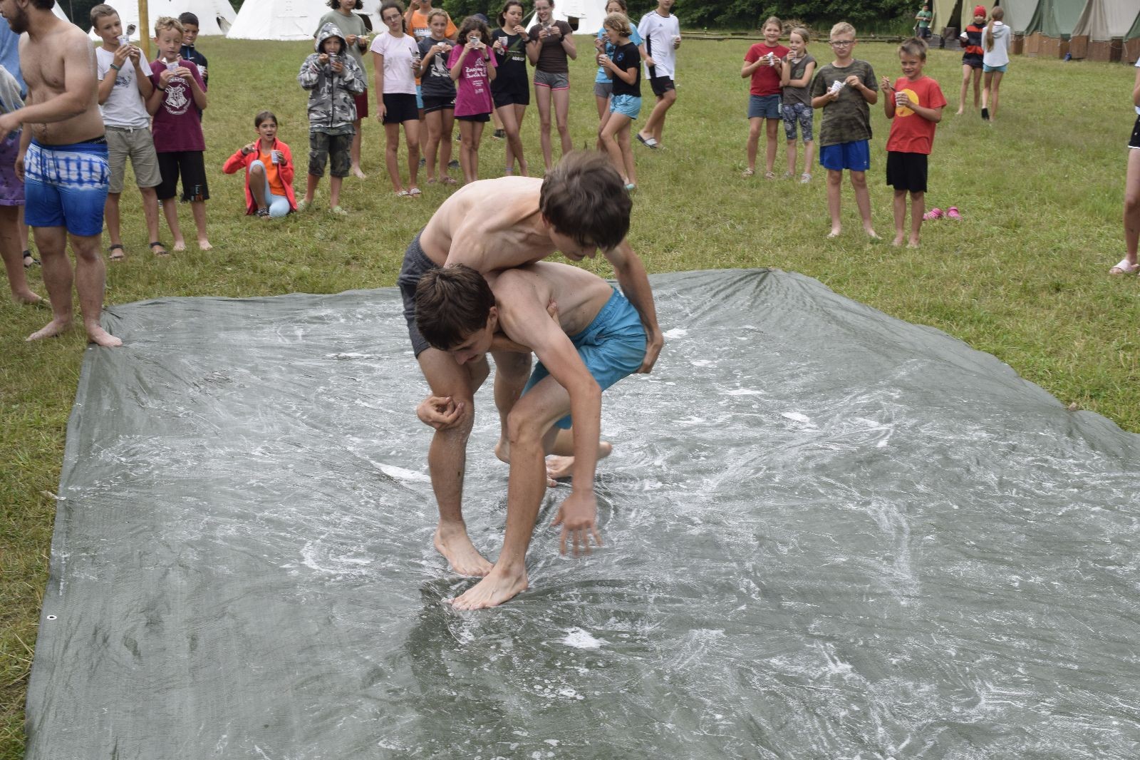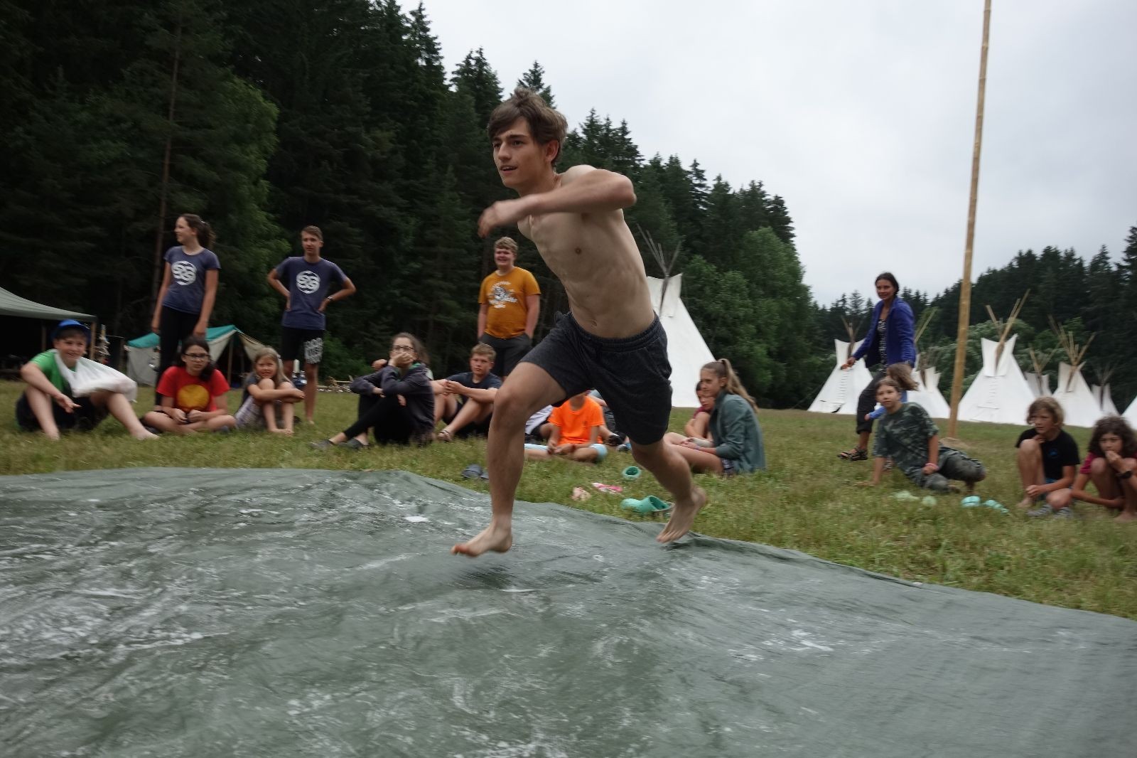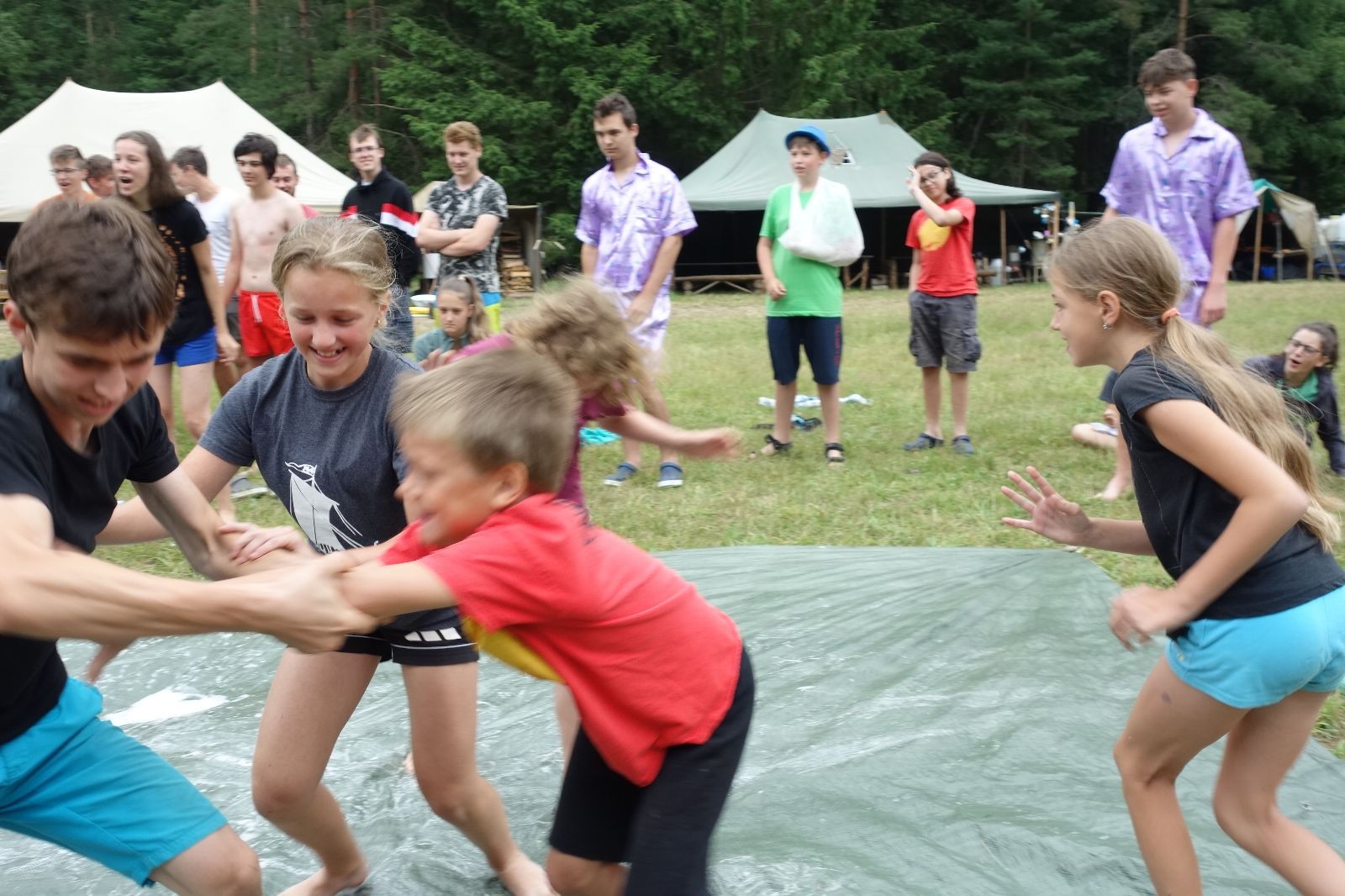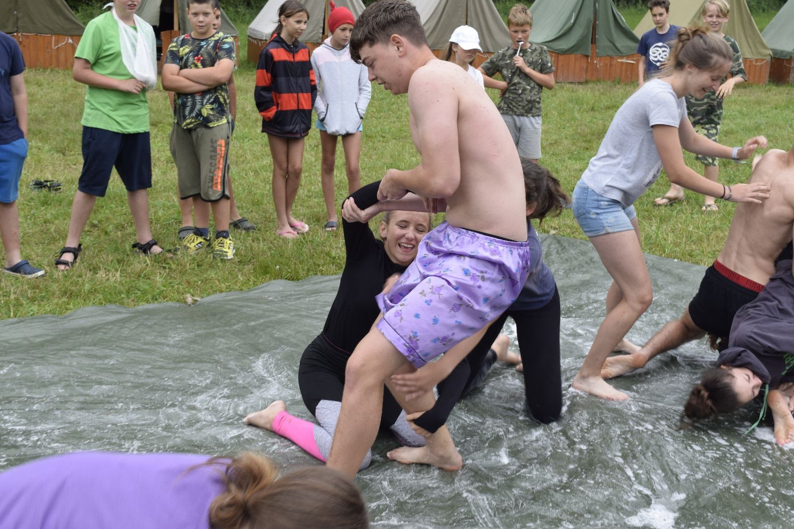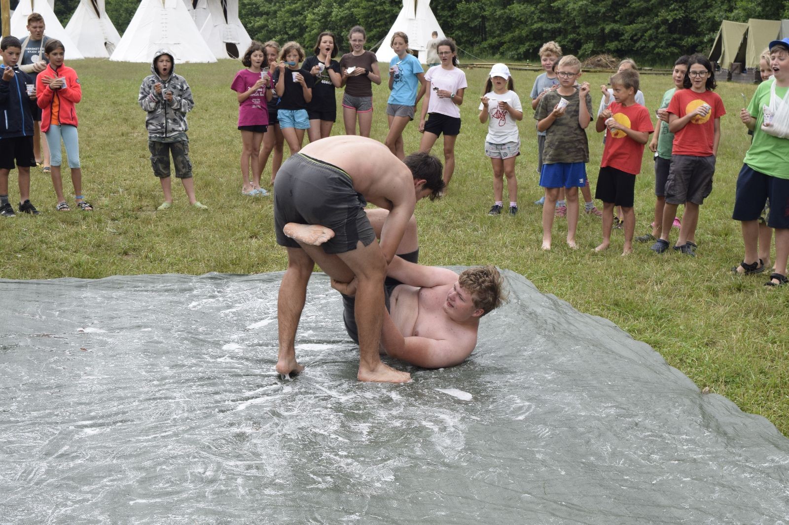 Noční přepad nám opět trošku zvětšil táborový spánkový deficit, ale co, zážitek to byl. Den se rozjíždí piánko – budíček, rozcvička, snídaně, bodování úklidu… A pak: souboje na mýdlové ploše. To je kultovní oddílová soutěž, kterou si obzvláště starší neskutečně užívají. Mladší mezi tím hrají hru v lese. Na oběd máme těstoviny s kečupem a sýrem, po poledním klidu následuje družinový program. Kulinářské zážitky, cesty do okolí tábora, koupání v přehradě, plavba na loďkách na rybníku…co družinka to dobrý nápad. Večer po sněmu zkoušíme novinku – stolní hry. Každý vedoucí má nějakou hru na starost a zájemci si můžou přijít zahrát. Vypadá to, že novinka se osvědčila.
