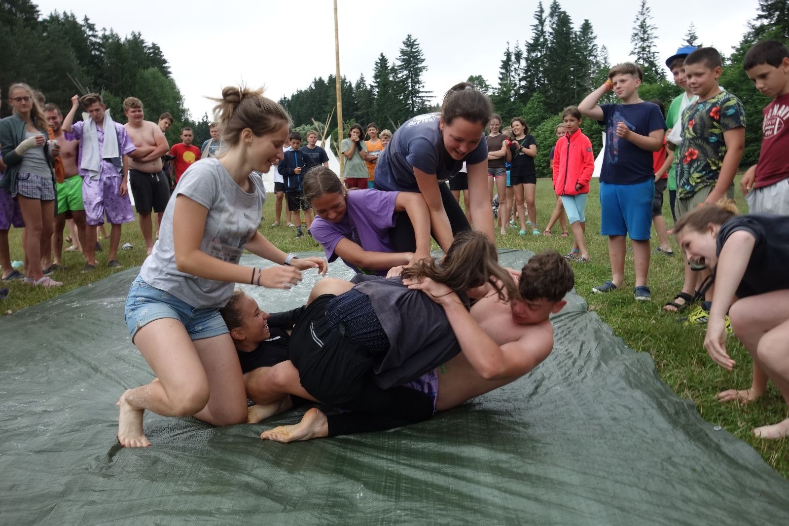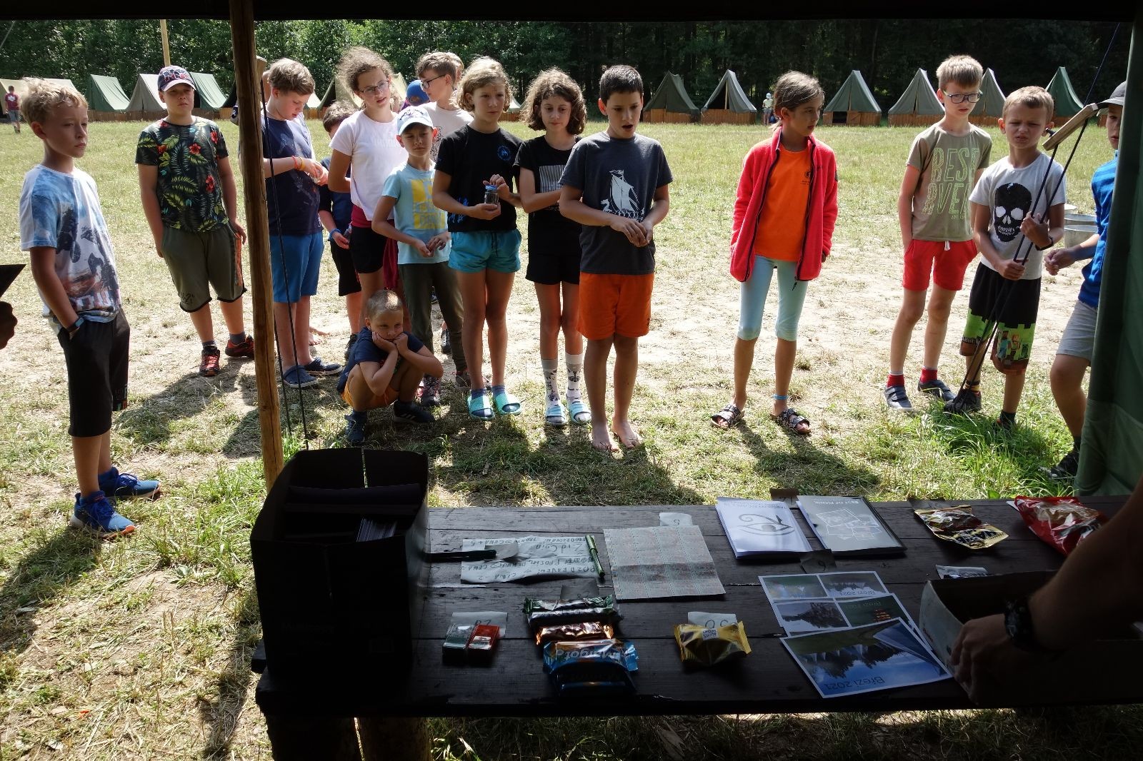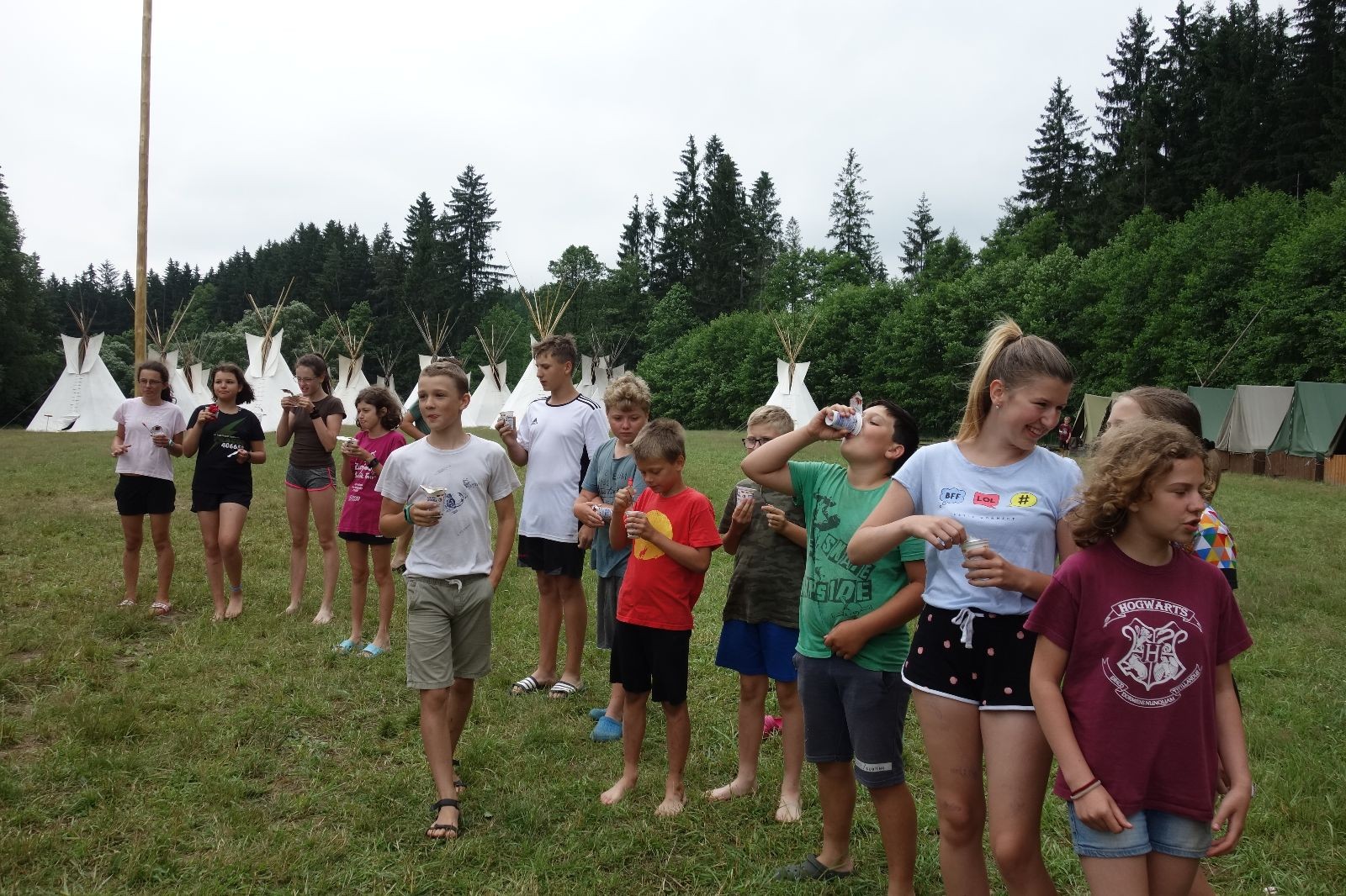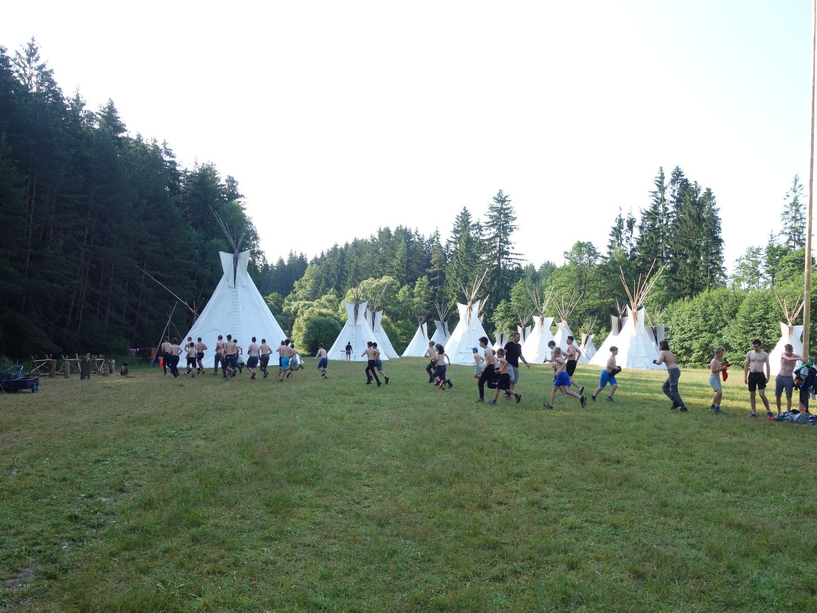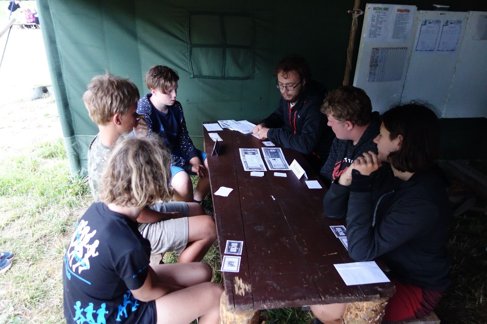 Noční přepad nám opět trošku zvětšil táborový spánkový deficit, ale co, zážitek to byl. Den se rozjíždí piánko – budíček, rozcvička, snídaně, bodování úklidu… A pak: souboje na mýdlové ploše. To je kultovní oddílová soutěž, kterou si obzvláště starší neskutečně užívají. Mladší mezi tím hrají hru v lese. Na oběd máme těstoviny s kečupem a sýrem, po poledním klidu následuje družinový program. Kulinářské zážitky, cesty do okolí tábora, koupání v přehradě, plavba na loďkách na rybníku…co družinka to dobrý nápad. Večer po sněmu zkoušíme novinku – stolní hry. Každý vedoucí má nějakou hru na starost a zájemci si můžou přijít zahrát. Vypadá to, že novinka se osvědčila.