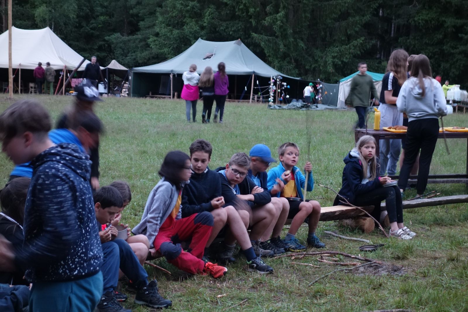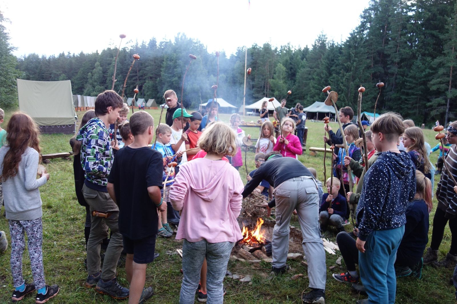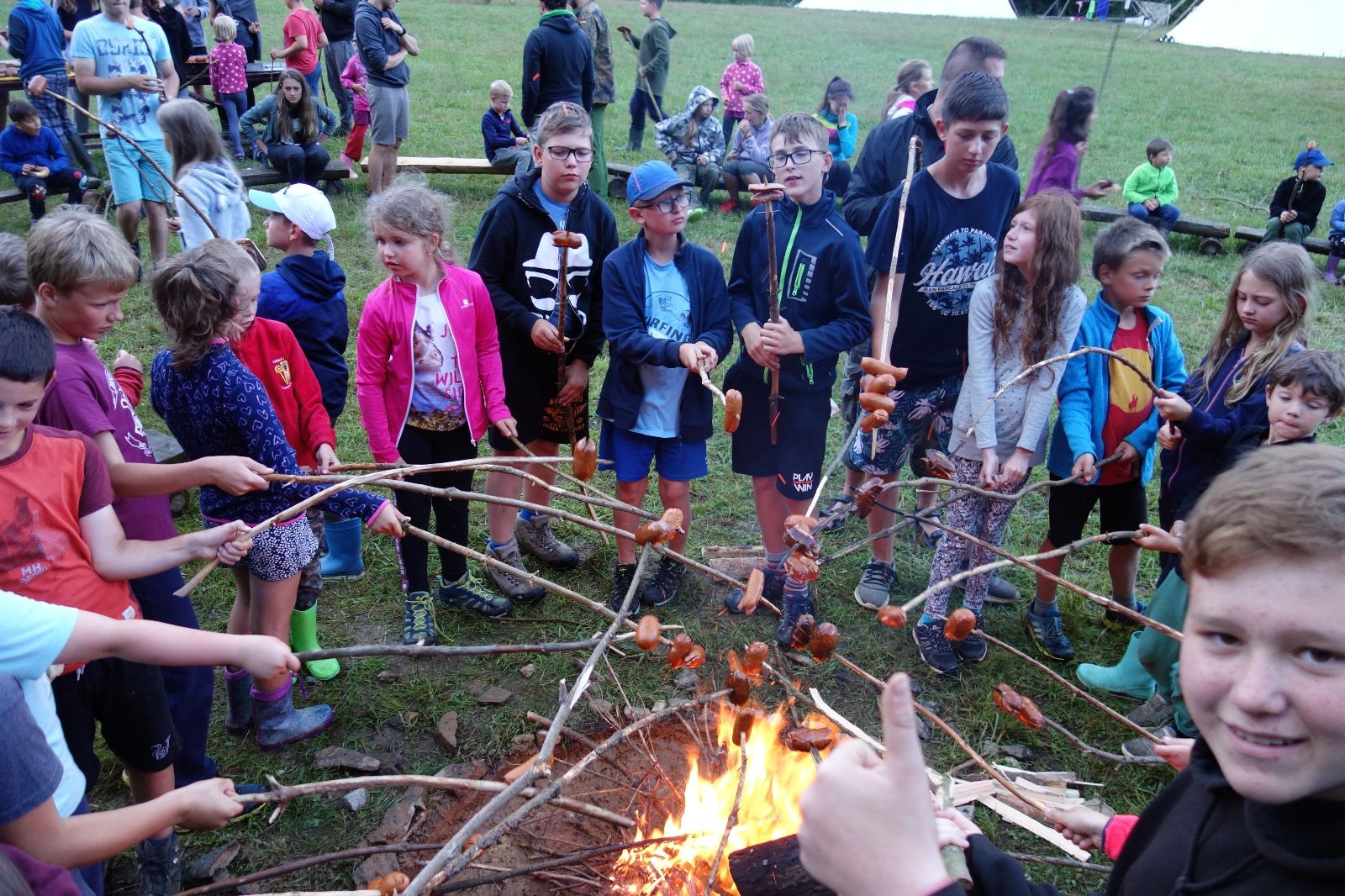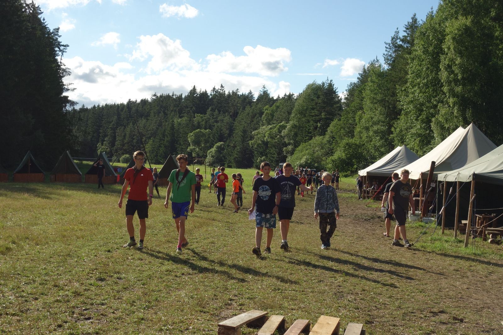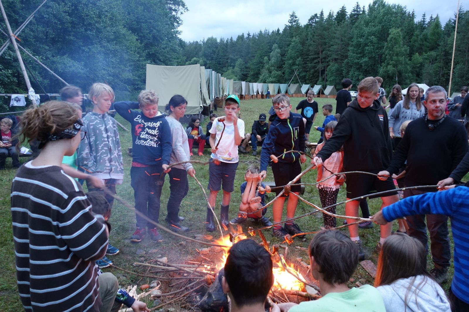 Tak aby toho nebylo málo, nad ránem přišla ještě bouřka třetí a vzala nás pěkně poctivě, středem. Od 3:40 do 3:50 to bylo, jako když otočíte kýbl. Blesky a hromy lítaly všude okolo. Všichni vedoucí a starší byli vzhůru, naopak většina mladších to v podsadách zaspala. Naštěstí ani tentokrát nefoukal žádný uragán a tak opět odneslo jen pár zmáčených věcí. Škody na životech či majetku nula nula nic. Ráno nesměle vykoukl oskárek a pak už nás provázel celým dnem stejně jako lehký vítr. Louka doslova vysychala před očima podobně jako věci na sušárnách. Dopoledne bylo věnováno lesní strategické hře „Přístavy“, mladší hráli „Riskuj“. V poledne do tábora dorazila šestice Svišťů a ulokovala se v podsadách. Odpoledne kromě etap mladších a starších probíhaly též hry se Svišti, doplnili jsme zásoby dřeva v kuchyni a dále sušili navlhlé věci. Večer oheň, písničky a opékání špekáčků. Usínali jsme s jasnou oblohou nad hlavou, hvězdy zářily. Pěkný rozdíl, proti minulé noci…