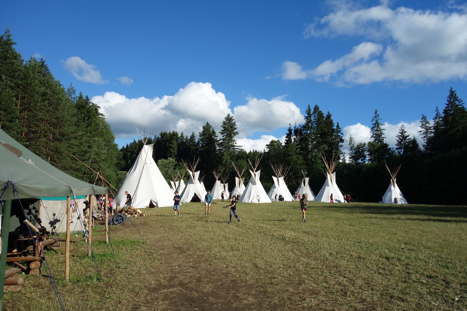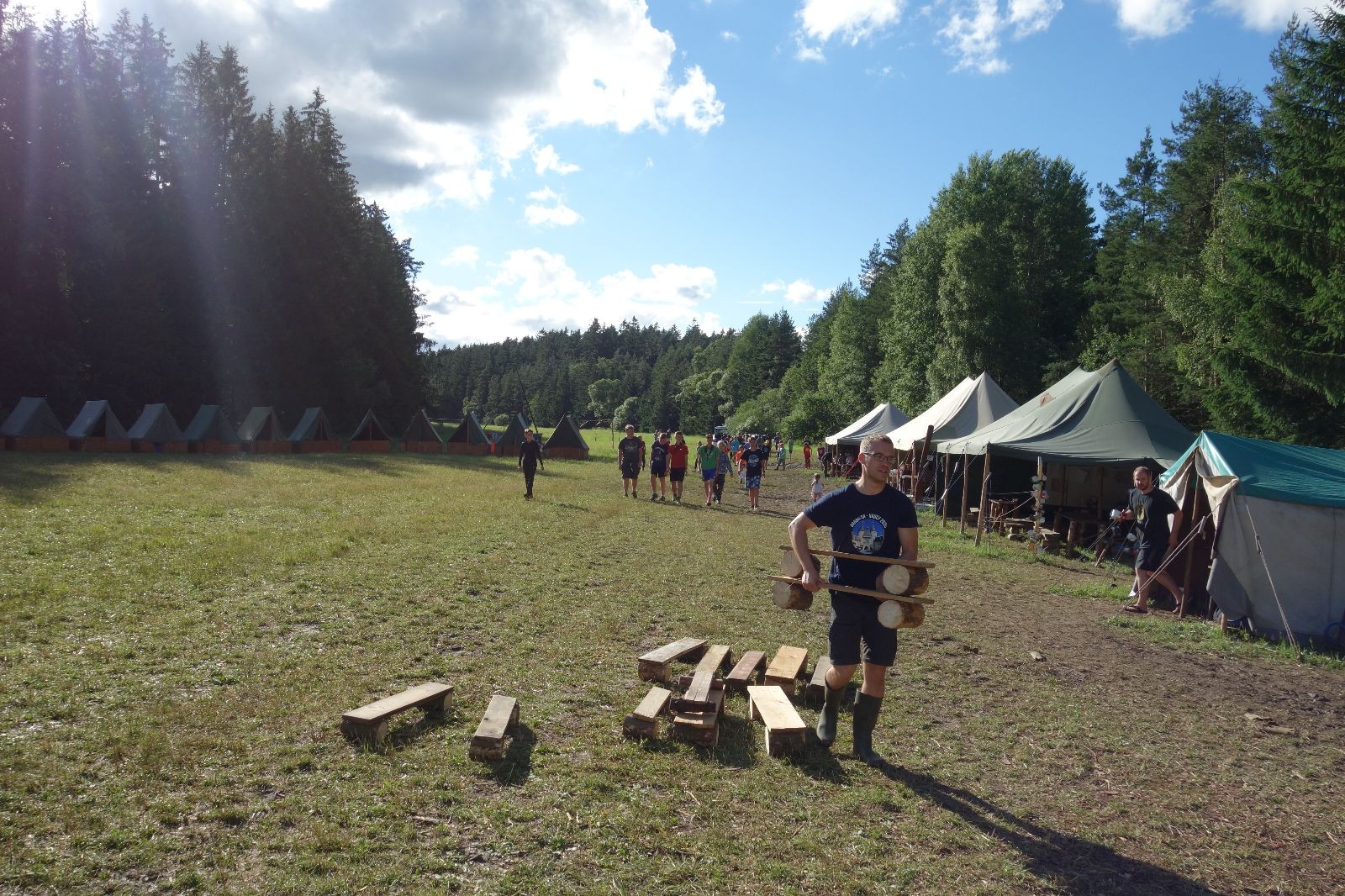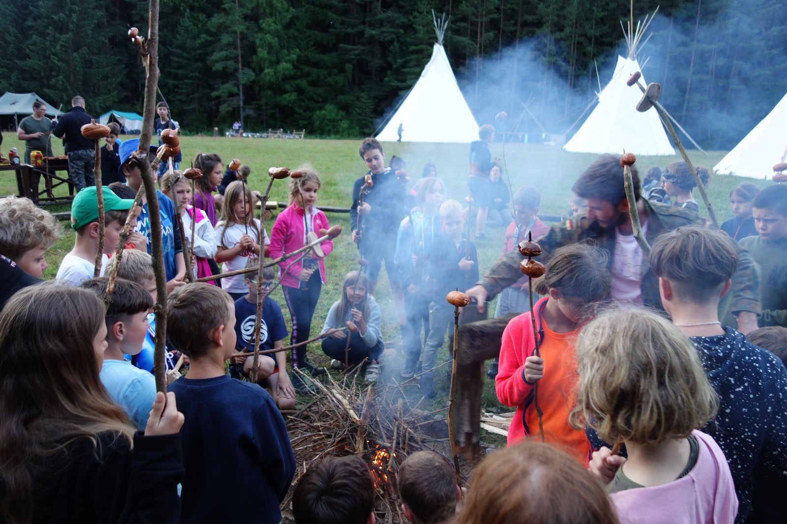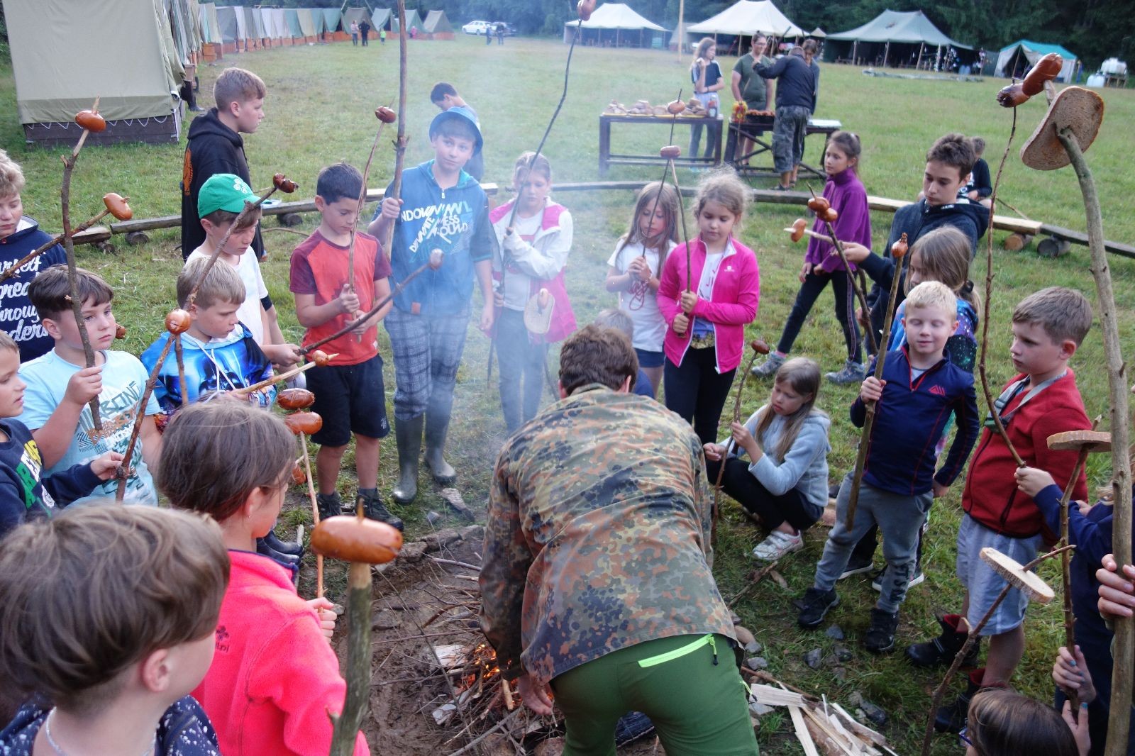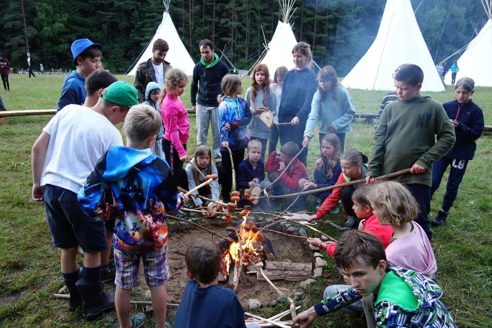 Tak aby toho nebylo málo, nad ránem přišla ještě bouřka třetí a vzala nás pěkně poctivě, středem. Od 3:40 do 3:50 to bylo, jako když otočíte kýbl. Blesky a hromy lítaly všude okolo. Všichni vedoucí a starší byli vzhůru, naopak většina mladších to v podsadách zaspala. Naštěstí ani tentokrát nefoukal žádný uragán a tak opět odneslo jen pár zmáčených věcí. Škody na životech či majetku nula nula nic. Ráno nesměle vykoukl oskárek a pak už nás provázel celým dnem stejně jako lehký vítr. Louka doslova vysychala před očima podobně jako věci na sušárnách. Dopoledne bylo věnováno lesní strategické hře „Přístavy“, mladší hráli „Riskuj“. V poledne do tábora dorazila šestice Svišťů a ulokovala se v podsadách. Odpoledne kromě etap mladších a starších probíhaly též hry se Svišti, doplnili jsme zásoby dřeva v kuchyni a dále sušili navlhlé věci. Večer oheň, písničky a opékání špekáčků. Usínali jsme s jasnou oblohou nad hlavou, hvězdy zářily. Pěkný rozdíl, proti minulé noci…
