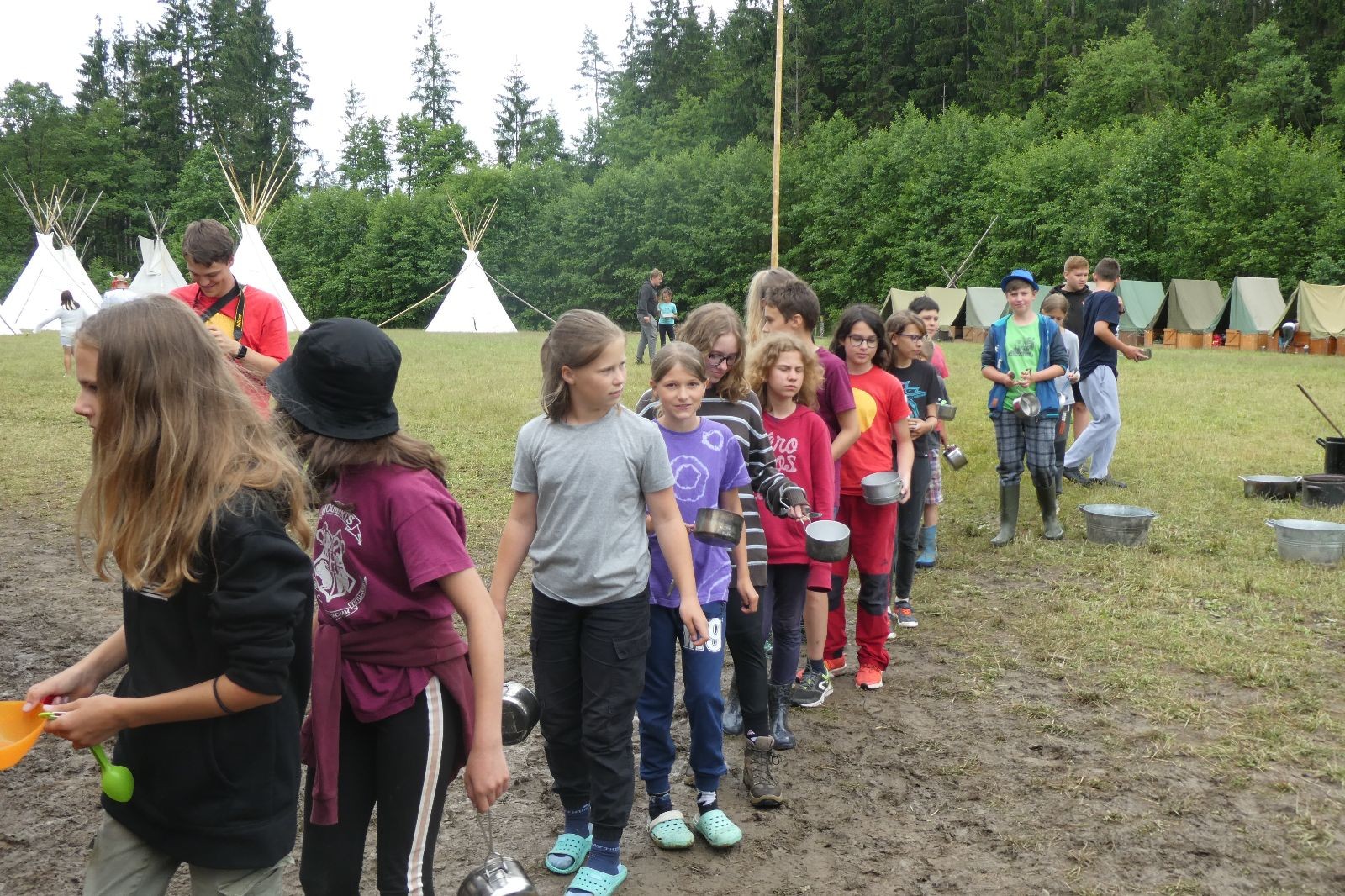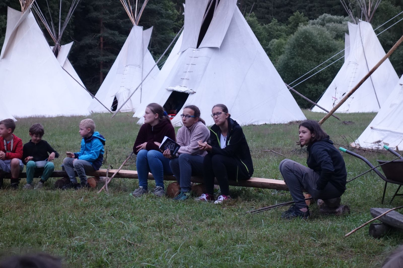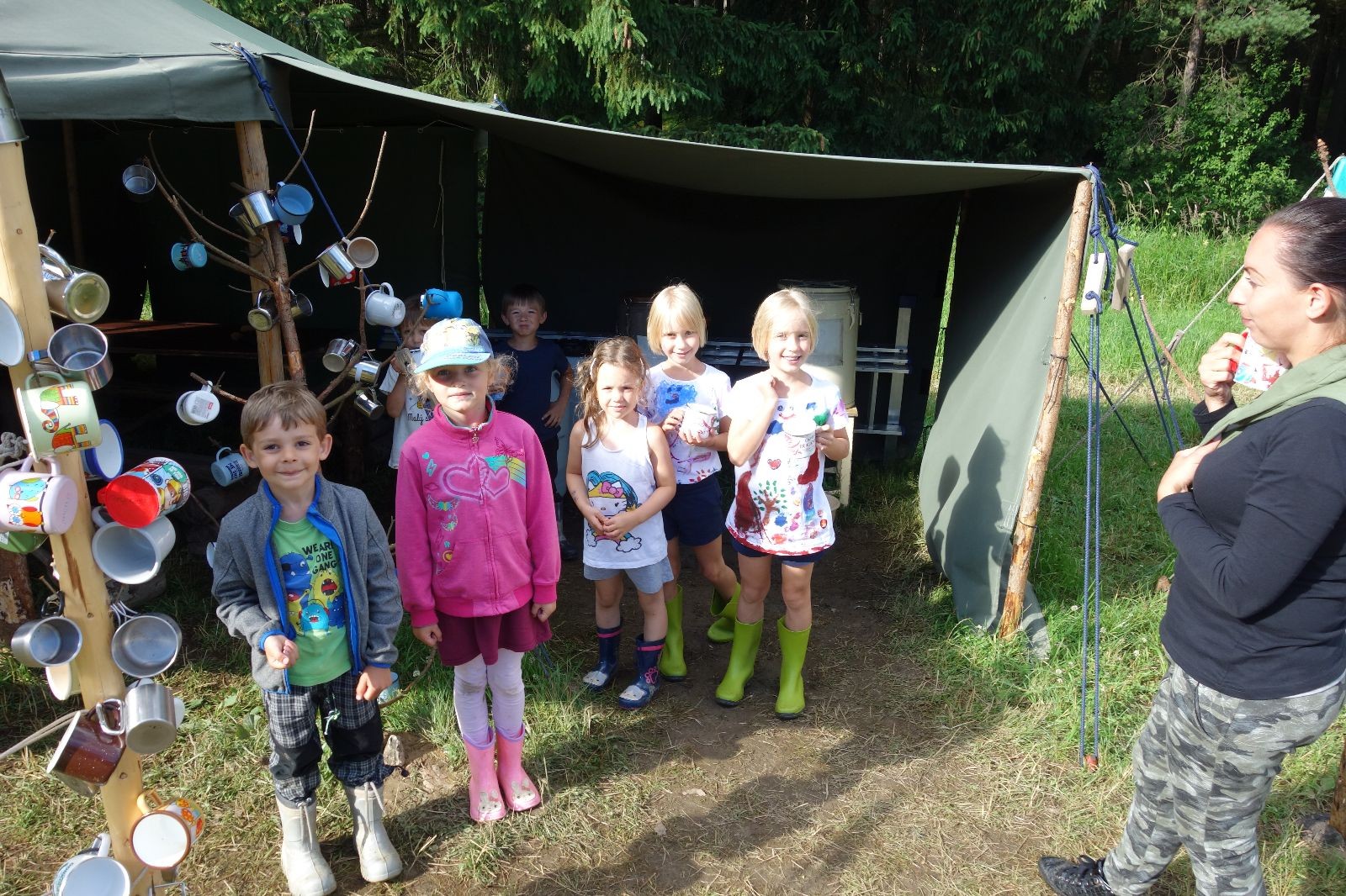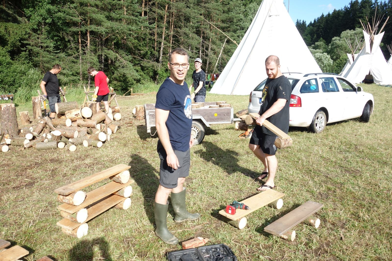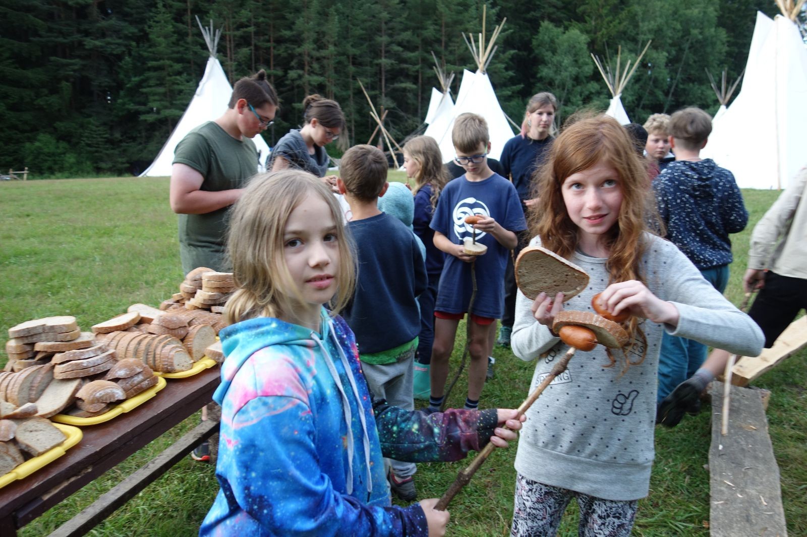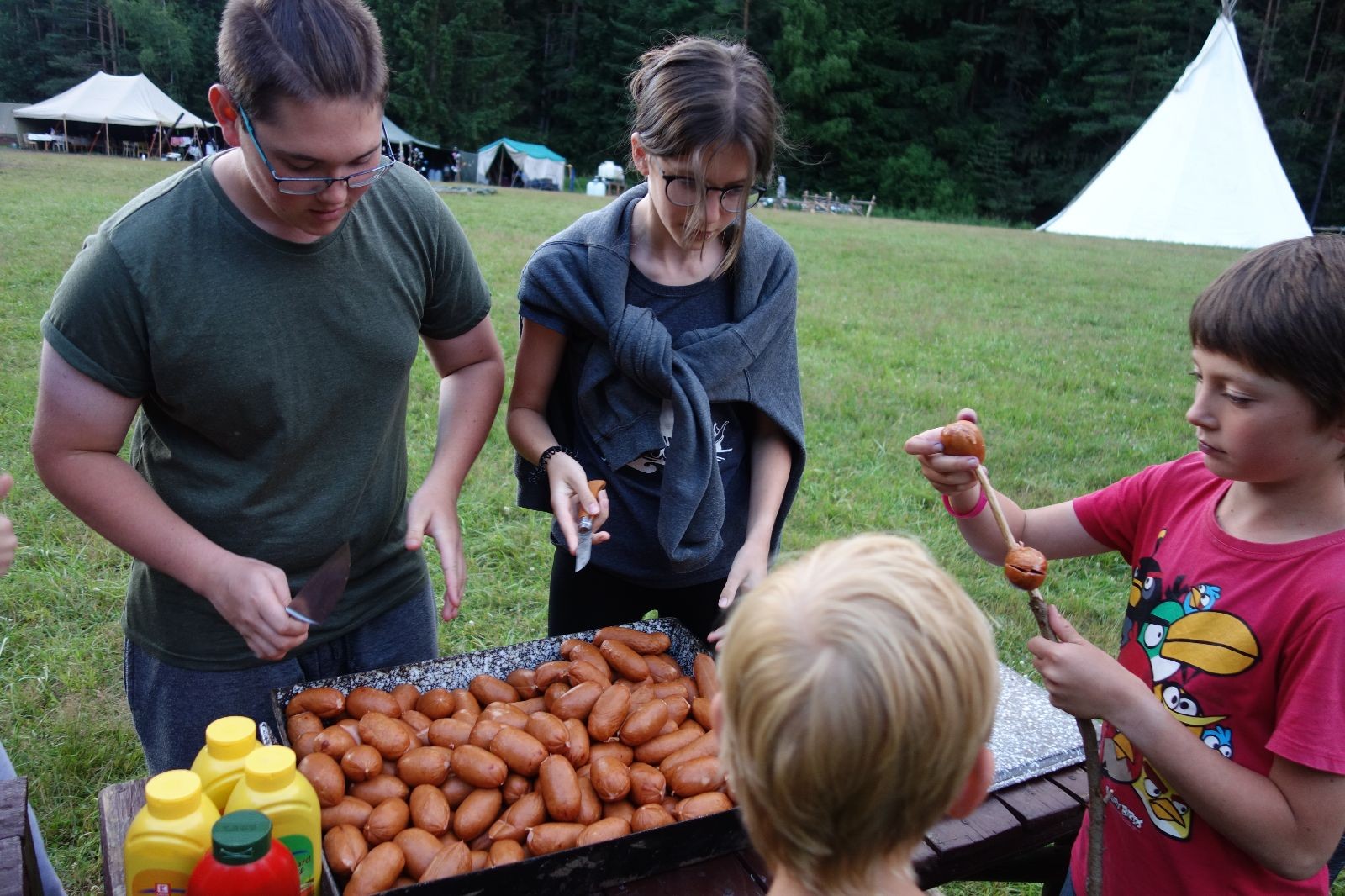 Tak aby toho nebylo málo, nad ránem přišla ještě bouřka třetí a vzala nás pěkně poctivě, středem. Od 3:40 do 3:50 to bylo, jako když otočíte kýbl. Blesky a hromy lítaly všude okolo. Všichni vedoucí a starší byli vzhůru, naopak většina mladších to v podsadách zaspala. Naštěstí ani tentokrát nefoukal žádný uragán a tak opět odneslo jen pár zmáčených věcí. Škody na životech či majetku nula nula nic. Ráno nesměle vykoukl oskárek a pak už nás provázel celým dnem stejně jako lehký vítr. Louka doslova vysychala před očima podobně jako věci na sušárnách. Dopoledne bylo věnováno lesní strategické hře „Přístavy“, mladší hráli „Riskuj“. V poledne do tábora dorazila šestice Svišťů a ulokovala se v podsadách. Odpoledne kromě etap mladších a starších probíhaly též hry se Svišti, doplnili jsme zásoby dřeva v kuchyni a dále sušili navlhlé věci. Večer oheň, písničky a opékání špekáčků. Usínali jsme s jasnou oblohou nad hlavou, hvězdy zářily. Pěkný rozdíl, proti minulé noci…