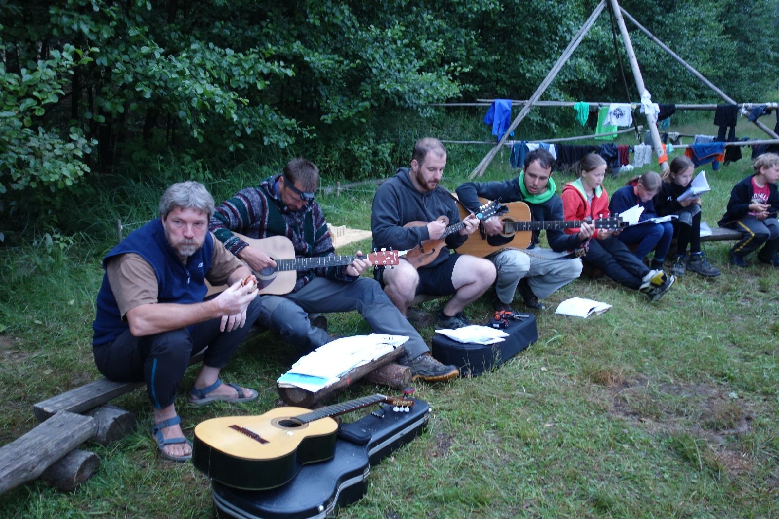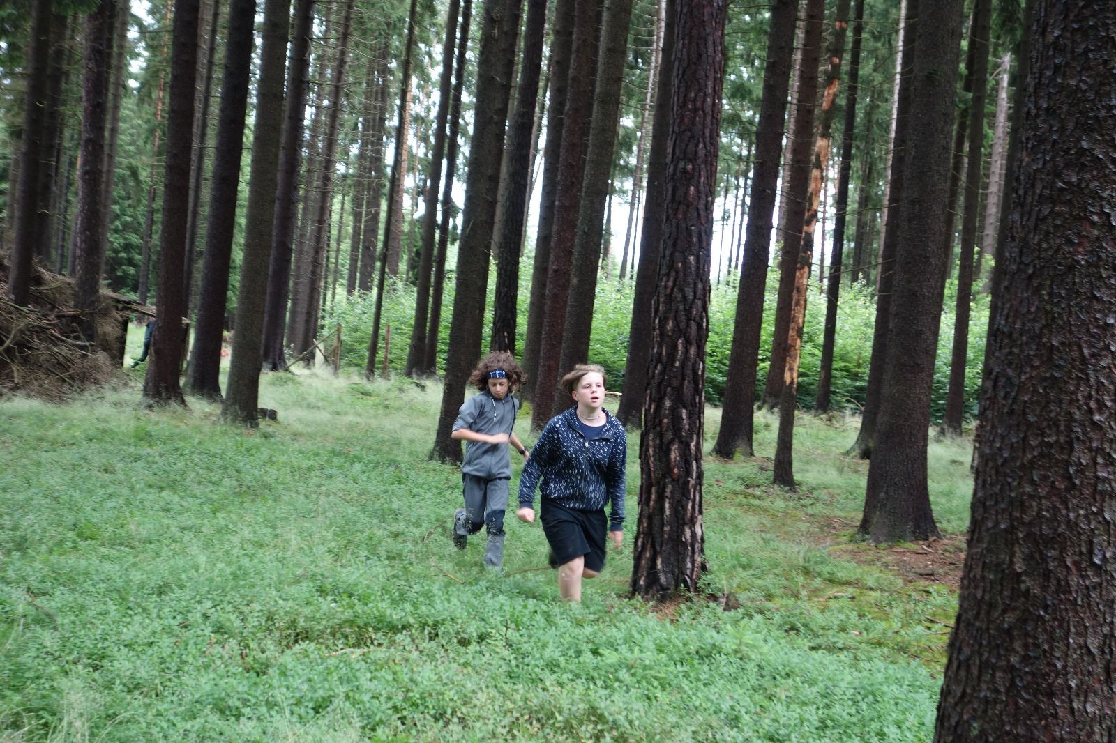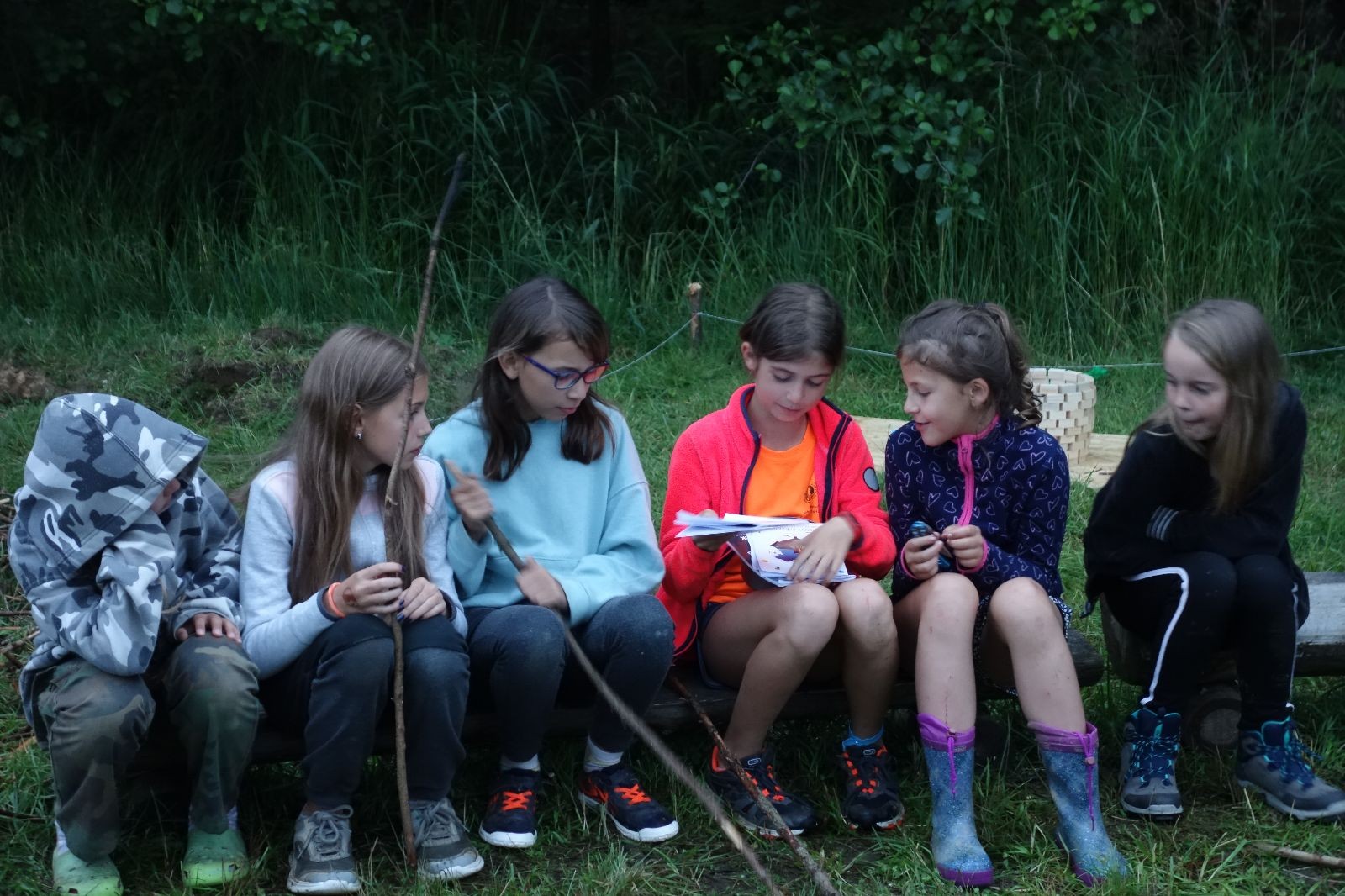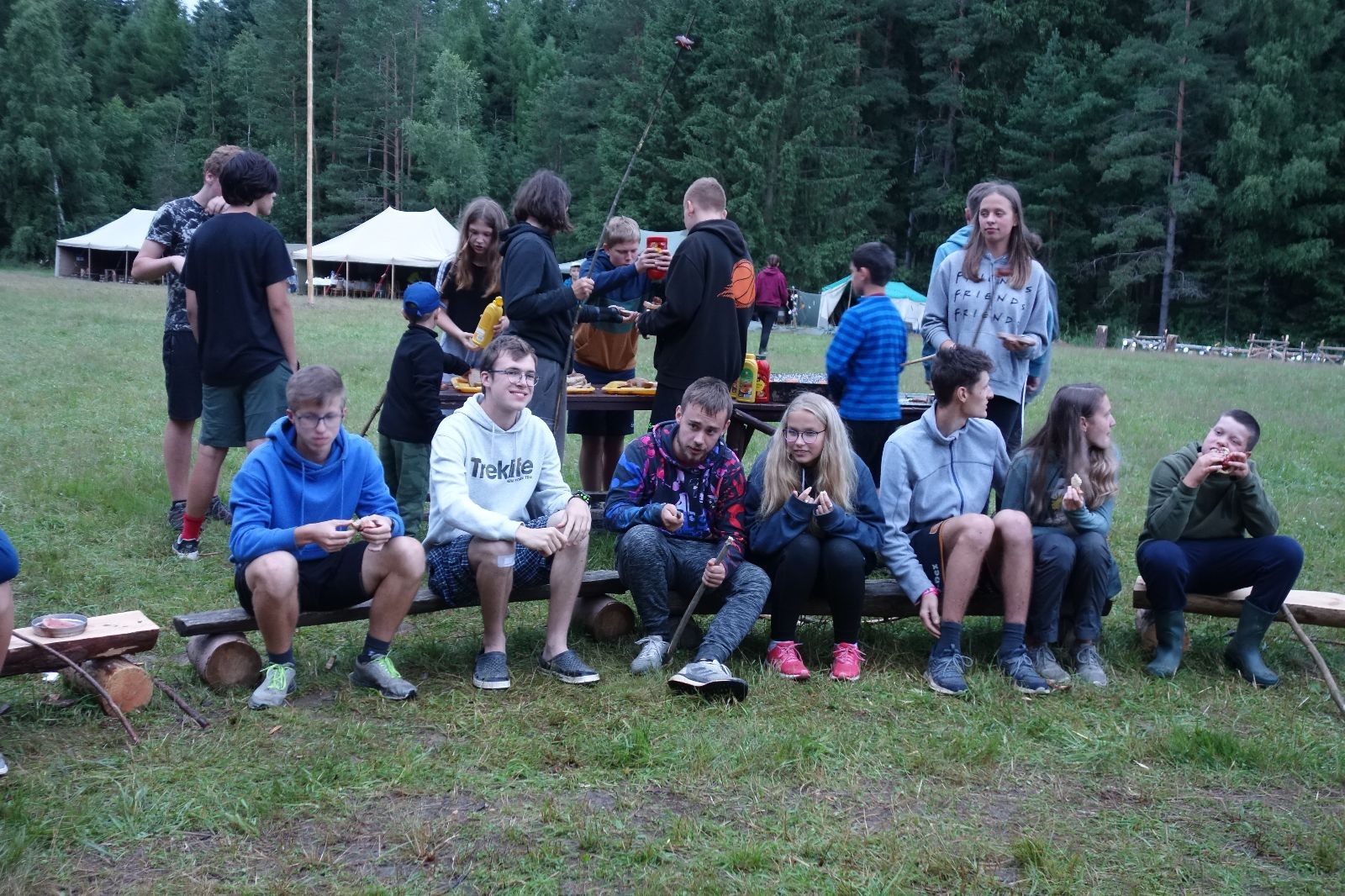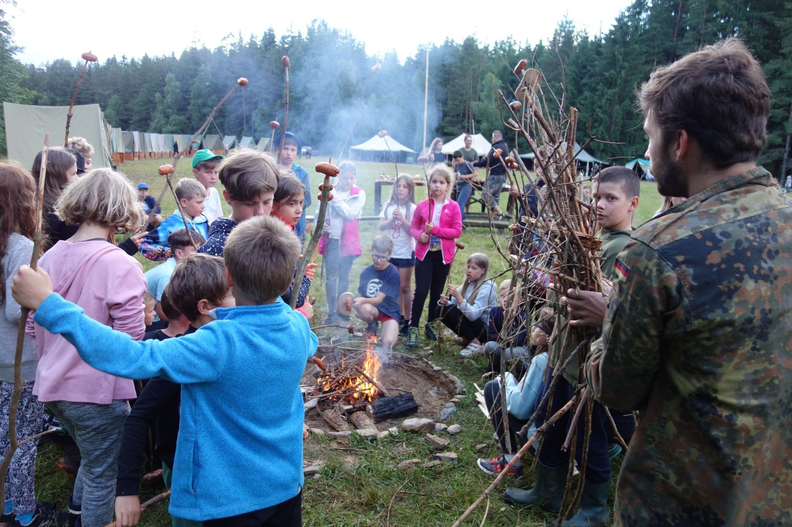Tak aby toho nebylo málo, nad ránem přišla ještě bouřka třetí a vzala nás pěkně poctivě, středem. Od 3:40 do 3:50 to bylo, jako když otočíte kýbl. Blesky a hromy lítaly všude okolo. Všichni vedoucí a starší byli vzhůru, naopak většina mladších to v podsadách zaspala. Naštěstí ani tentokrát nefoukal žádný uragán a tak opět odneslo jen pár zmáčených věcí. Škody na životech či majetku nula nula nic. Ráno nesměle vykoukl oskárek a pak už nás provázel celým dnem stejně jako lehký vítr. Louka doslova vysychala před očima podobně jako věci na sušárnách. Dopoledne bylo věnováno lesní strategické hře „Přístavy“, mladší hráli „Riskuj“. V poledne do tábora dorazila šestice Svišťů a ulokovala se v podsadách. Odpoledne kromě etap mladších a starších probíhaly též hry se Svišti, doplnili jsme zásoby dřeva v kuchyni a dále sušili navlhlé věci. Večer oheň, písničky a opékání špekáčků. Usínali jsme s jasnou oblohou nad hlavou, hvězdy zářily. Pěkný rozdíl, proti minulé noci…