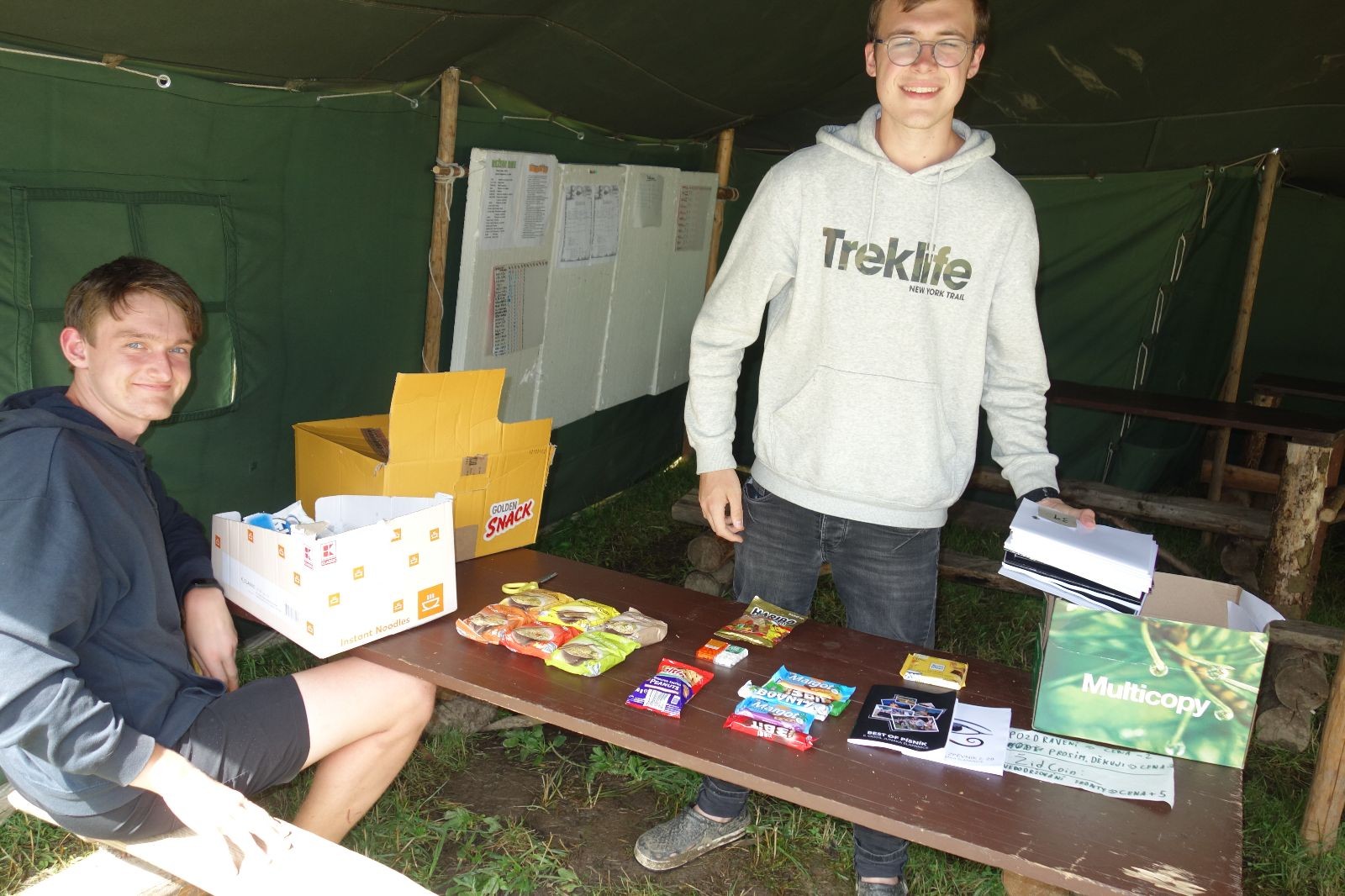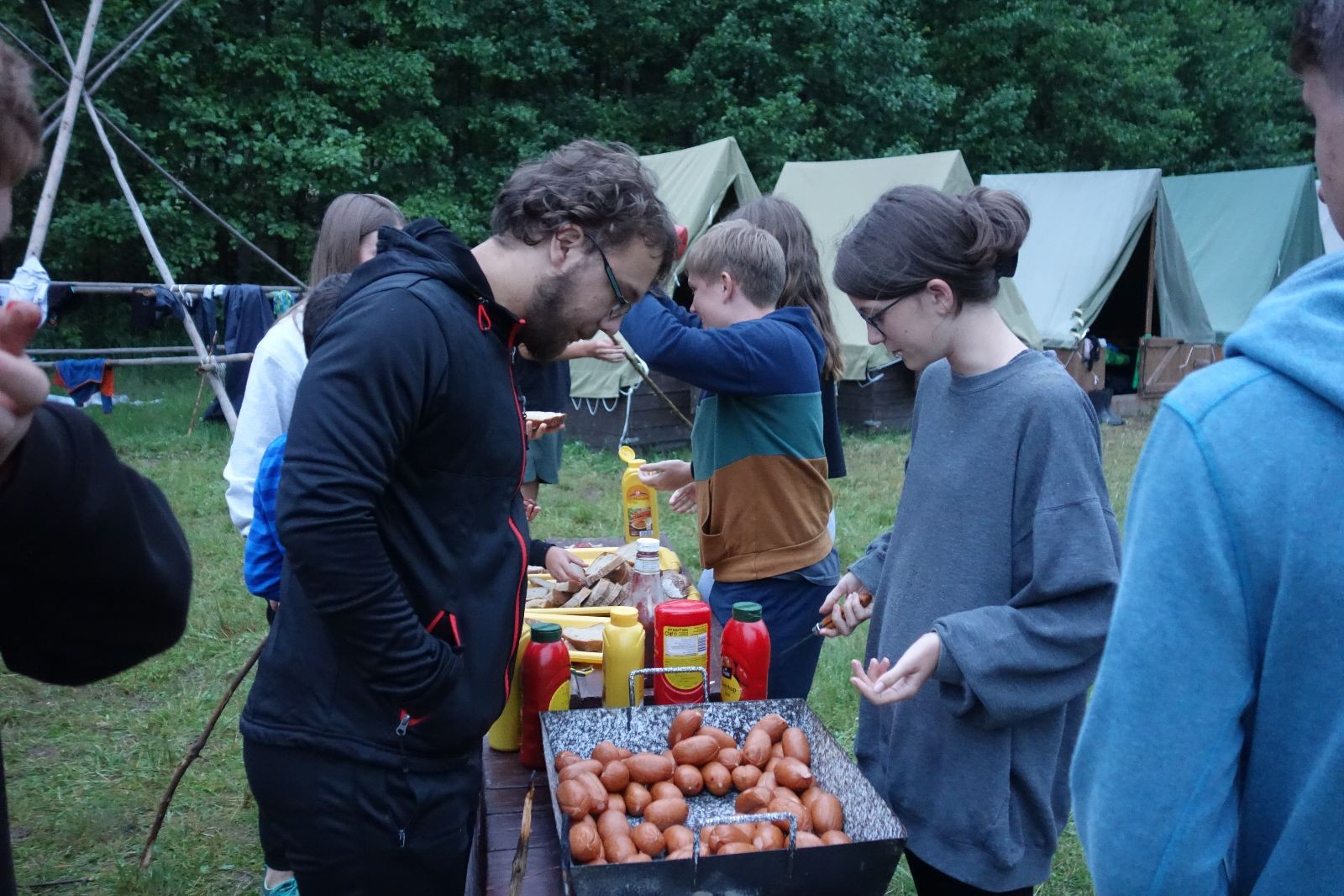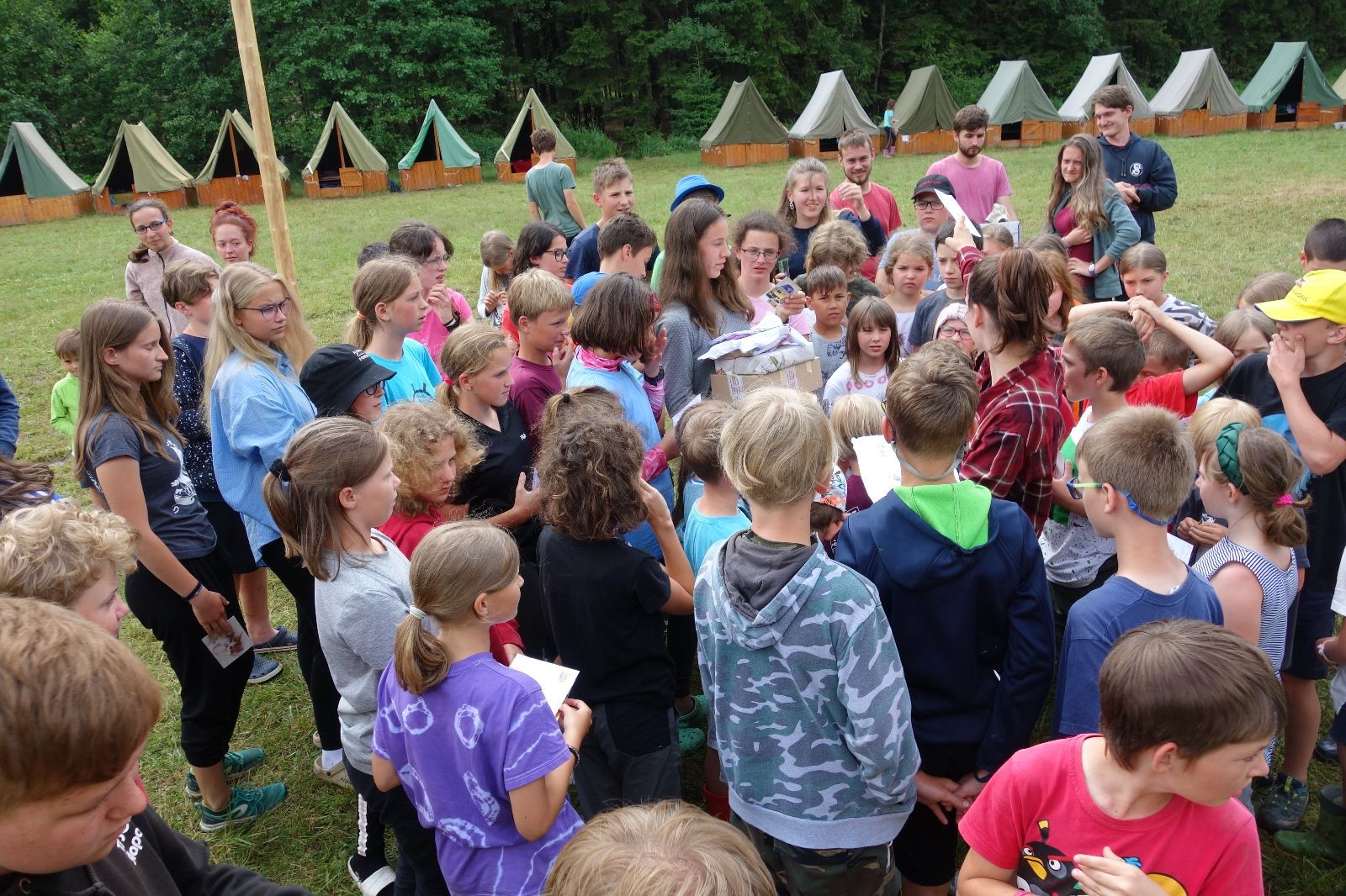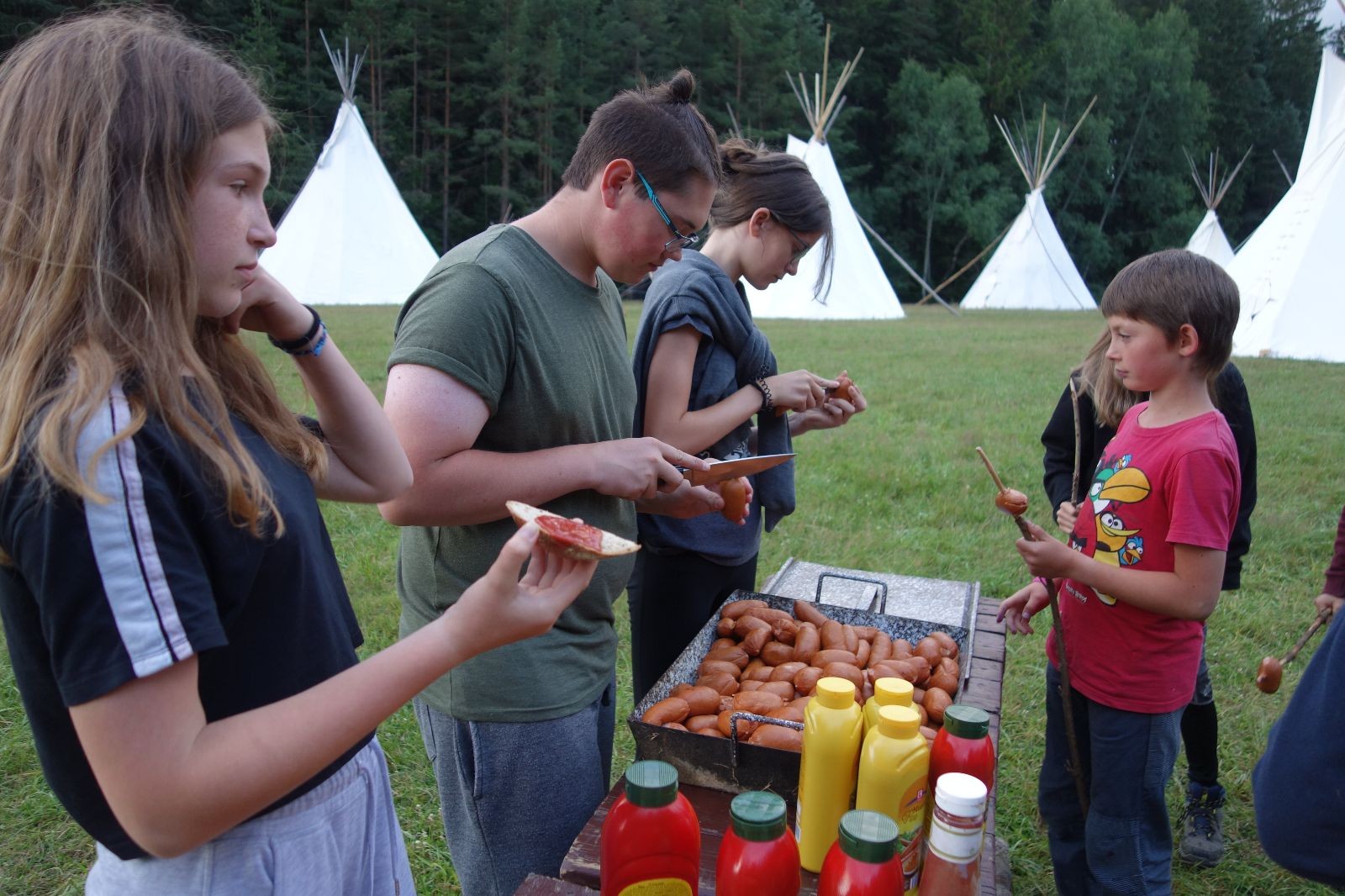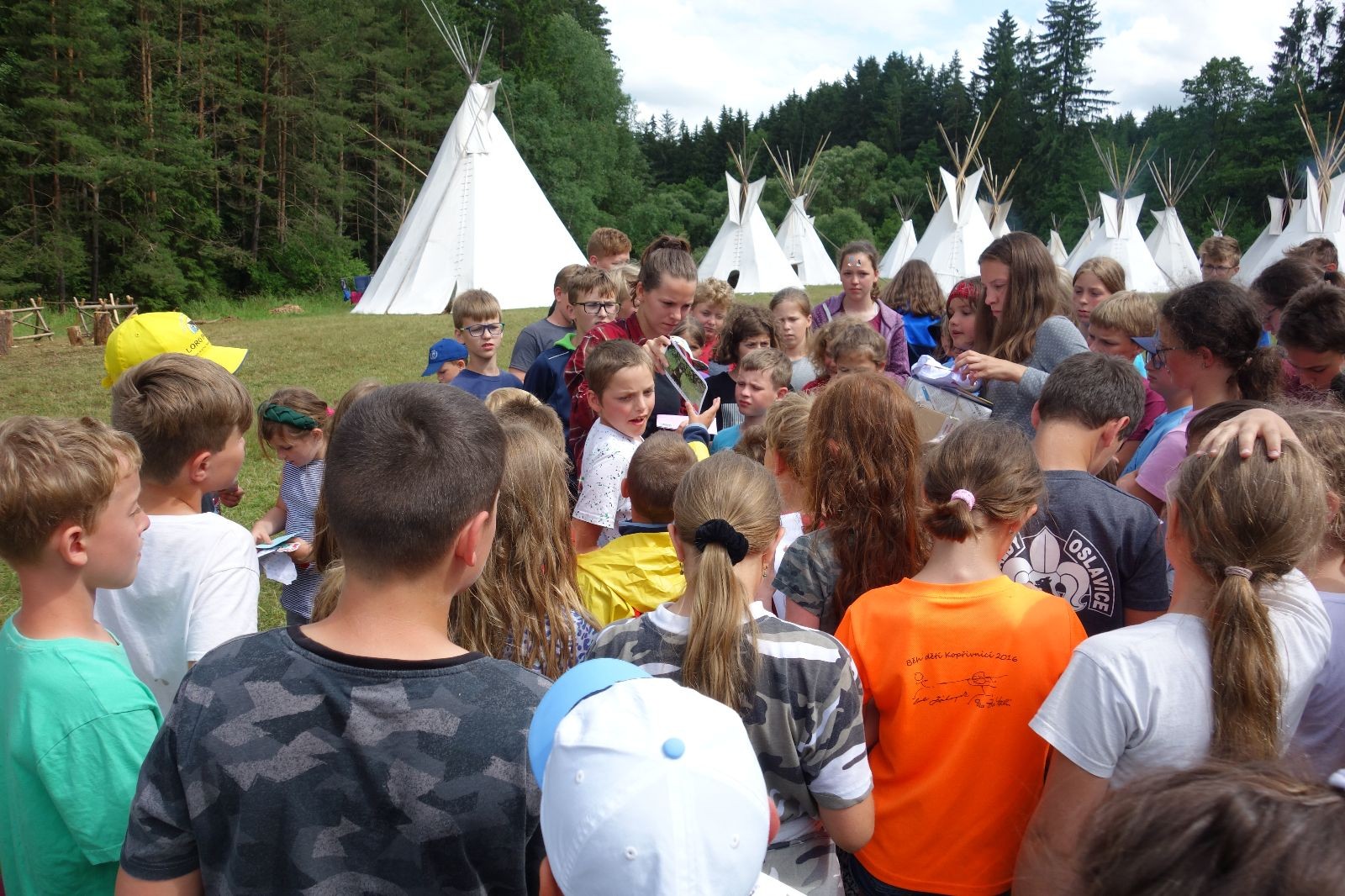 Tak aby toho nebylo málo, nad ránem přišla ještě bouřka třetí a vzala nás pěkně poctivě, středem. Od 3:40 do 3:50 to bylo, jako když otočíte kýbl. Blesky a hromy lítaly všude okolo. Všichni vedoucí a starší byli vzhůru, naopak většina mladších to v podsadách zaspala. Naštěstí ani tentokrát nefoukal žádný uragán a tak opět odneslo jen pár zmáčených věcí. Škody na životech či majetku nula nula nic. Ráno nesměle vykoukl oskárek a pak už nás provázel celým dnem stejně jako lehký vítr. Louka doslova vysychala před očima podobně jako věci na sušárnách. Dopoledne bylo věnováno lesní strategické hře „Přístavy“, mladší hráli „Riskuj“. V poledne do tábora dorazila šestice Svišťů a ulokovala se v podsadách. Odpoledne kromě etap mladších a starších probíhaly též hry se Svišti, doplnili jsme zásoby dřeva v kuchyni a dále sušili navlhlé věci. Večer oheň, písničky a opékání špekáčků. Usínali jsme s jasnou oblohou nad hlavou, hvězdy zářily. Pěkný rozdíl, proti minulé noci…