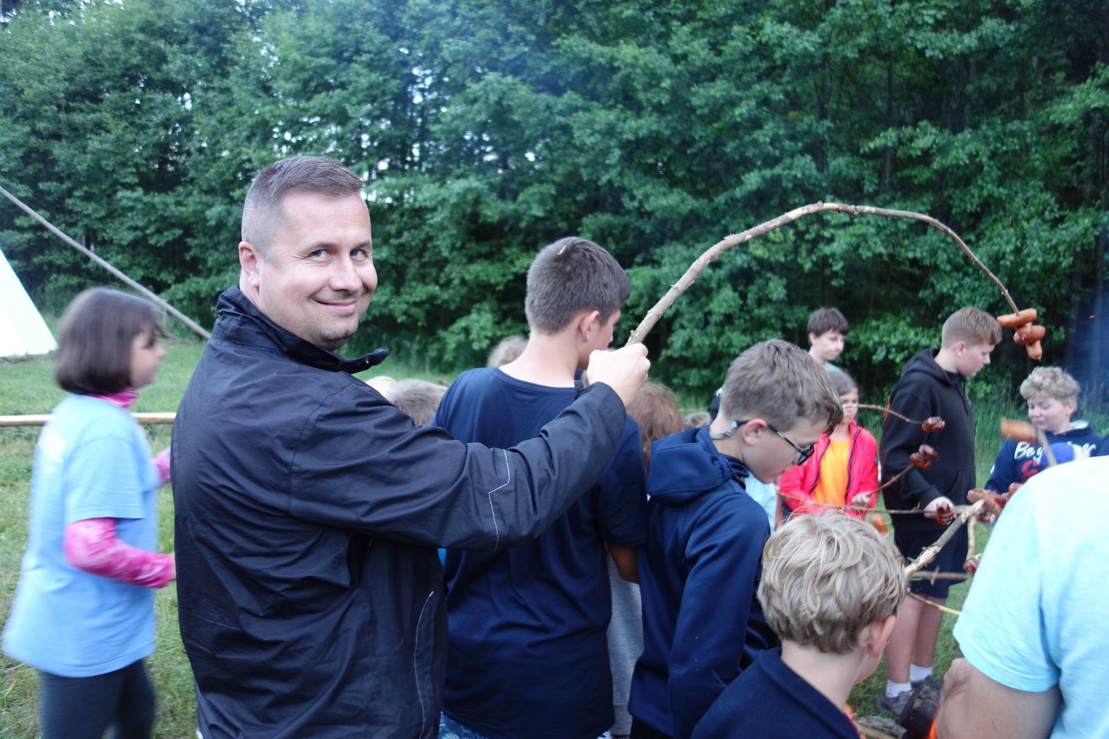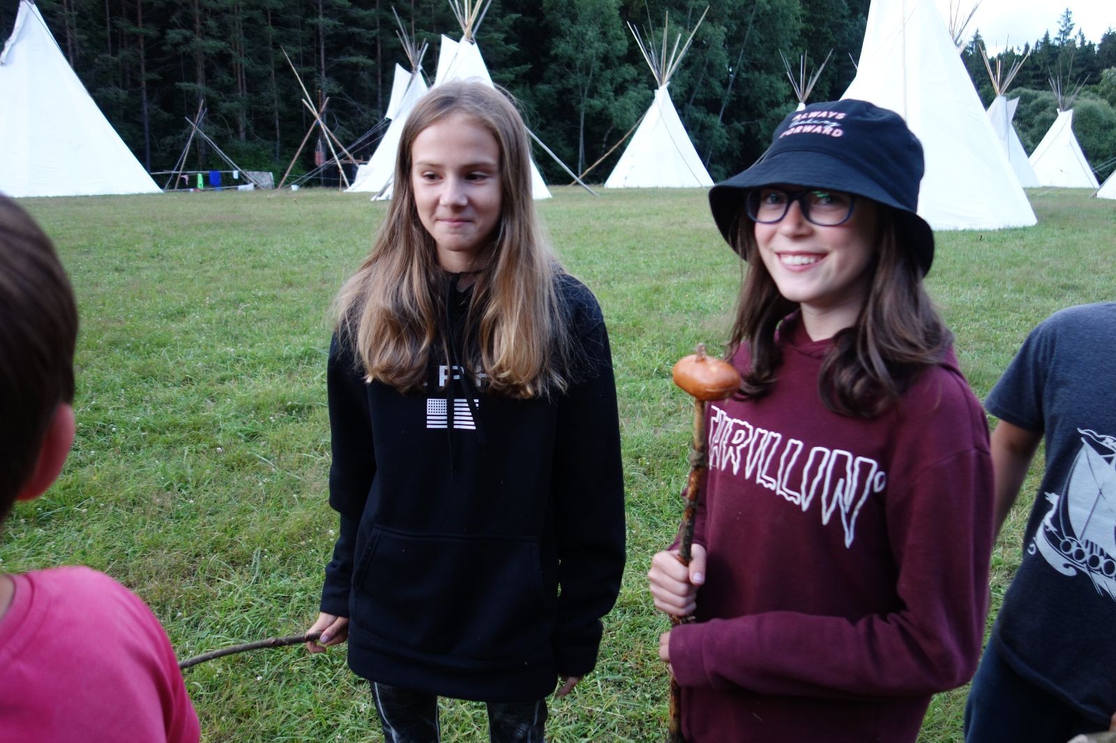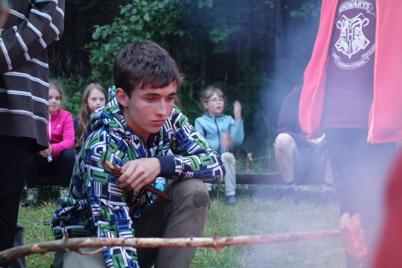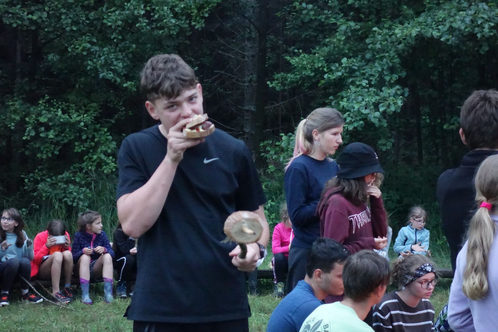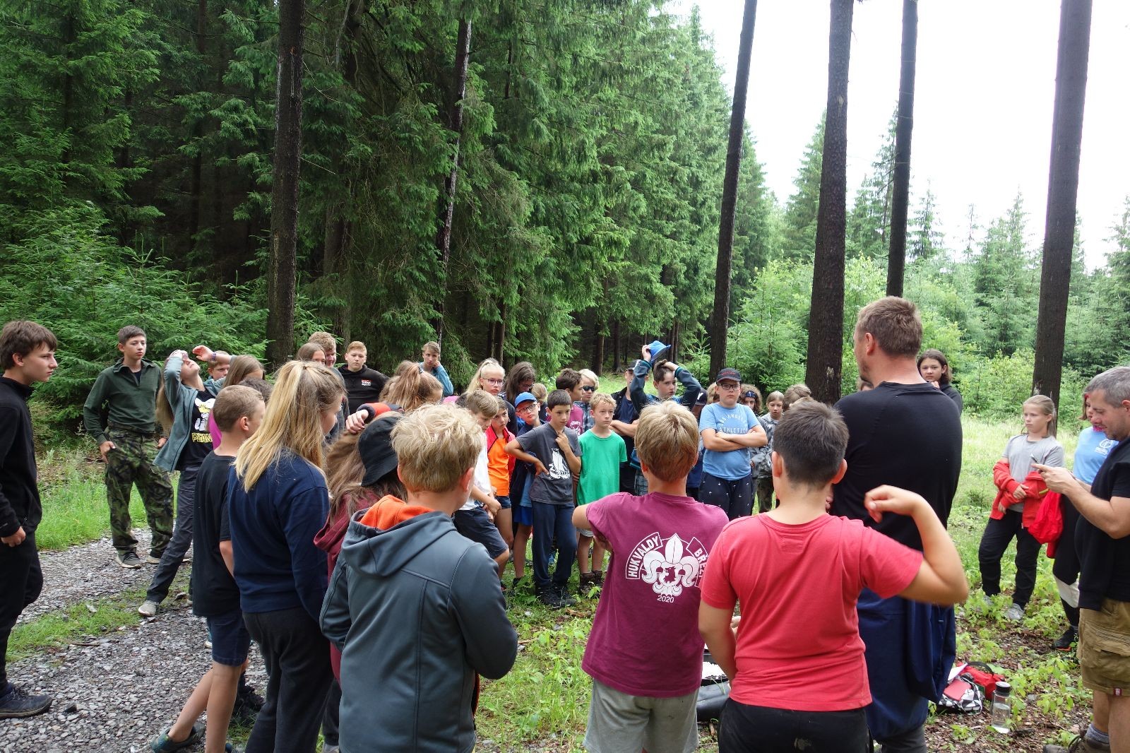 Tak aby toho nebylo málo, nad ránem přišla ještě bouřka třetí a vzala nás pěkně poctivě, středem. Od 3:40 do 3:50 to bylo, jako když otočíte kýbl. Blesky a hromy lítaly všude okolo. Všichni vedoucí a starší byli vzhůru, naopak většina mladších to v podsadách zaspala. Naštěstí ani tentokrát nefoukal žádný uragán a tak opět odneslo jen pár zmáčených věcí. Škody na životech či majetku nula nula nic. Ráno nesměle vykoukl oskárek a pak už nás provázel celým dnem stejně jako lehký vítr. Louka doslova vysychala před očima podobně jako věci na sušárnách. Dopoledne bylo věnováno lesní strategické hře „Přístavy“, mladší hráli „Riskuj“. V poledne do tábora dorazila šestice Svišťů a ulokovala se v podsadách. Odpoledne kromě etap mladších a starších probíhaly též hry se Svišti, doplnili jsme zásoby dřeva v kuchyni a dále sušili navlhlé věci. Večer oheň, písničky a opékání špekáčků. Usínali jsme s jasnou oblohou nad hlavou, hvězdy zářily. Pěkný rozdíl, proti minulé noci…