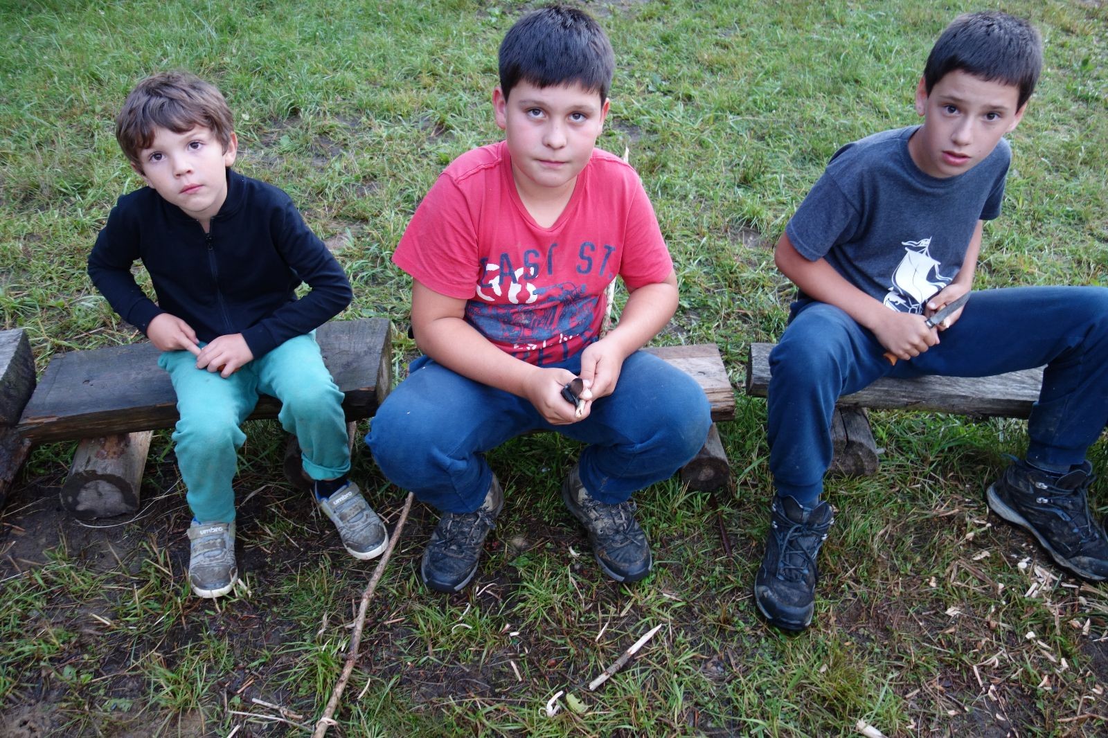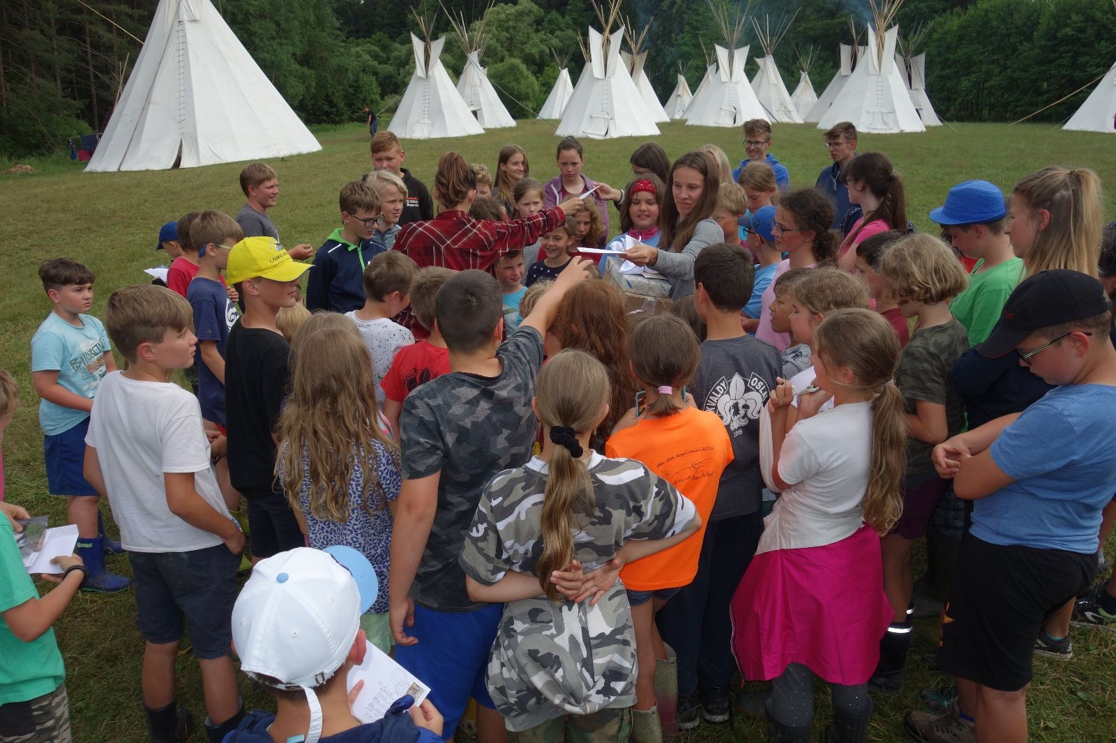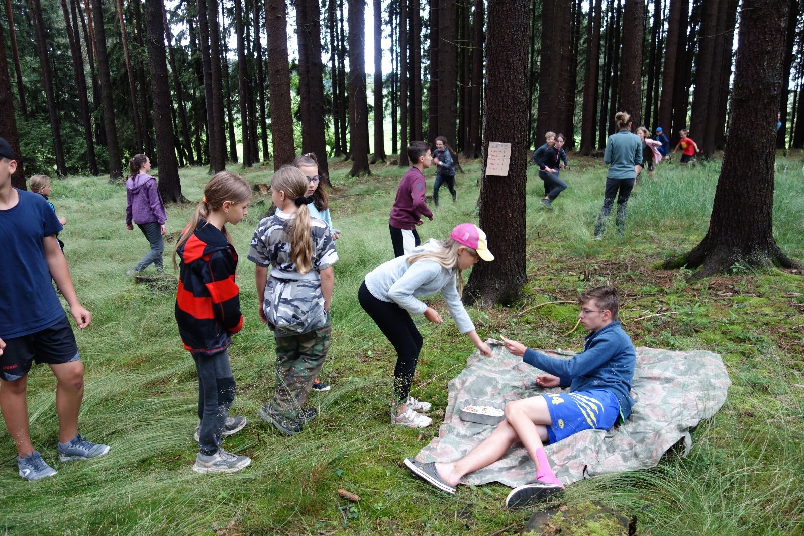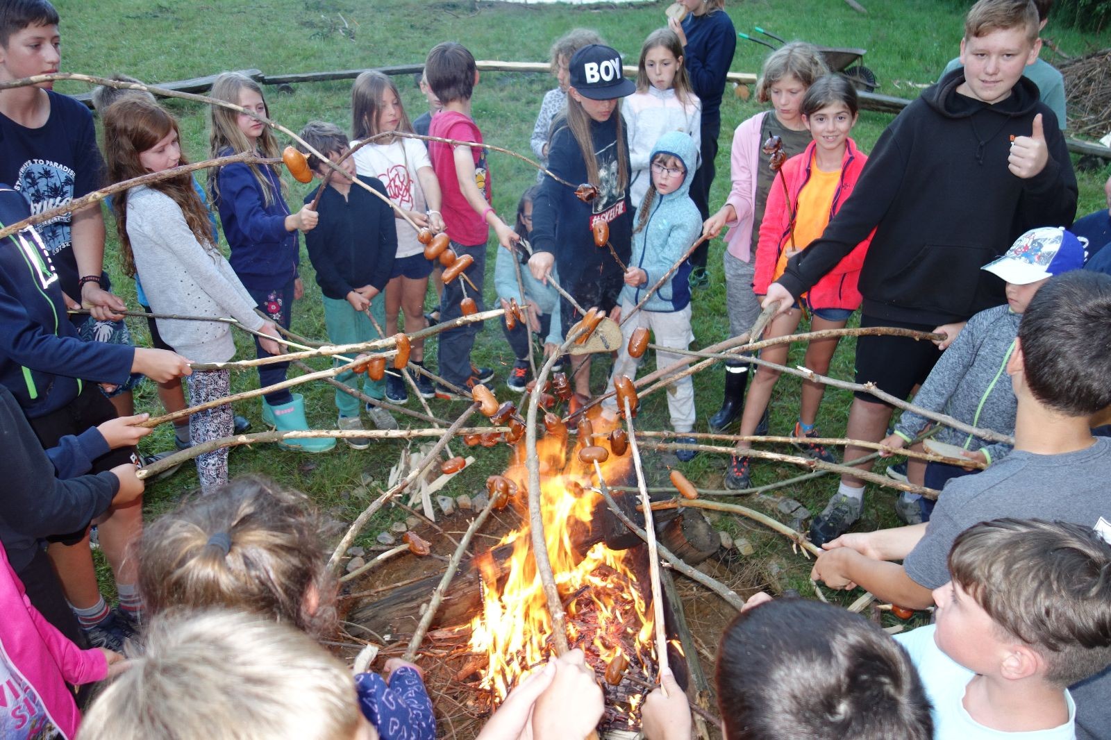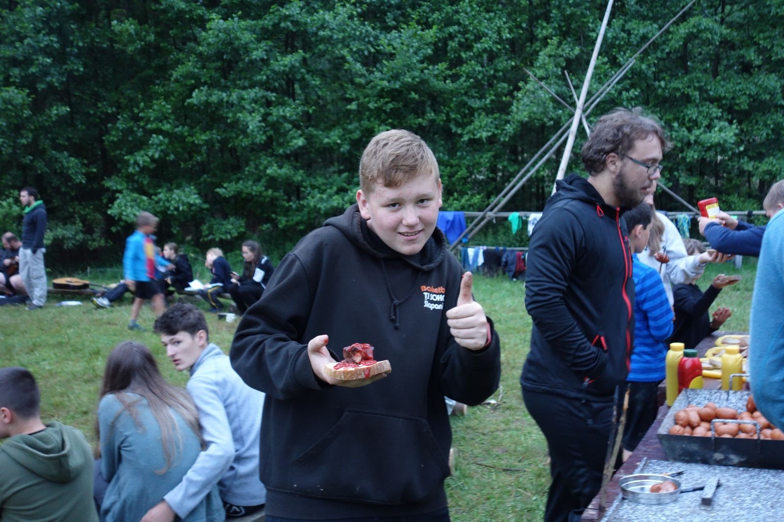 Tak aby toho nebylo málo, nad ránem přišla ještě bouřka třetí a vzala nás pěkně poctivě, středem. Od 3:40 do 3:50 to bylo, jako když otočíte kýbl. Blesky a hromy lítaly všude okolo. Všichni vedoucí a starší byli vzhůru, naopak většina mladších to v podsadách zaspala. Naštěstí ani tentokrát nefoukal žádný uragán a tak opět odneslo jen pár zmáčených věcí. Škody na životech či majetku nula nula nic. Ráno nesměle vykoukl oskárek a pak už nás provázel celým dnem stejně jako lehký vítr. Louka doslova vysychala před očima podobně jako věci na sušárnách. Dopoledne bylo věnováno lesní strategické hře „Přístavy“, mladší hráli „Riskuj“. V poledne do tábora dorazila šestice Svišťů a ulokovala se v podsadách. Odpoledne kromě etap mladších a starších probíhaly též hry se Svišti, doplnili jsme zásoby dřeva v kuchyni a dále sušili navlhlé věci. Večer oheň, písničky a opékání špekáčků. Usínali jsme s jasnou oblohou nad hlavou, hvězdy zářily. Pěkný rozdíl, proti minulé noci…