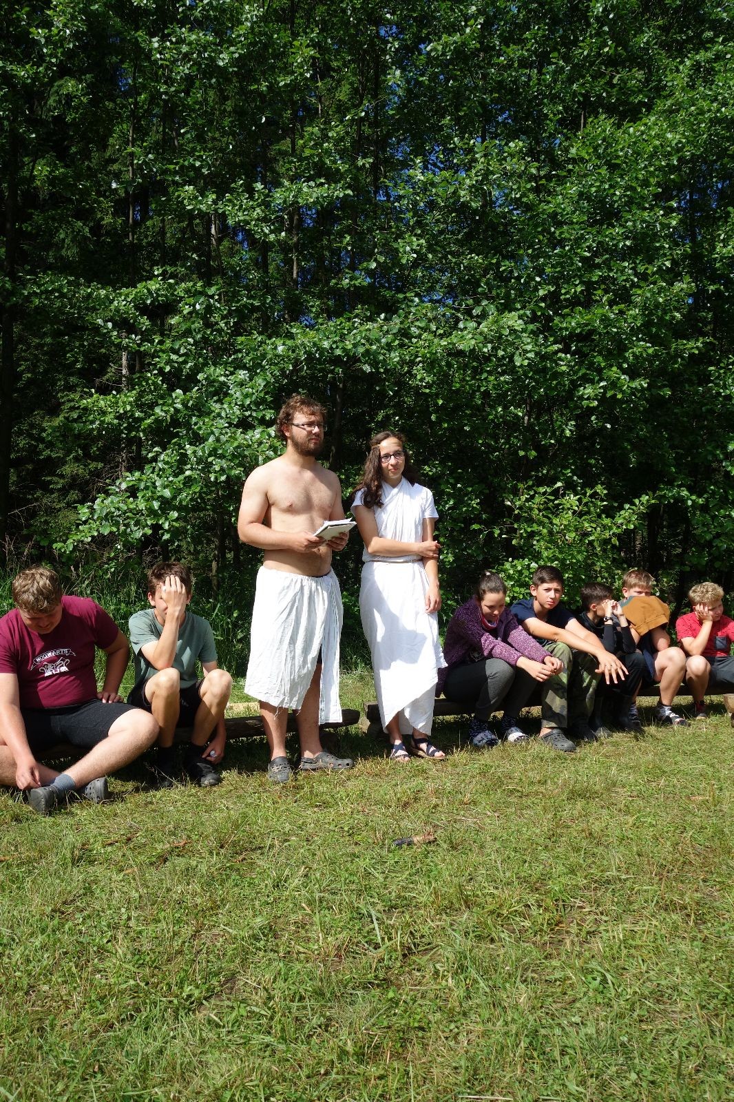Krásný prosluněný den už od rána. Pohodová rozcvička, bodování úklidu ve stanech, snídaně… Následuje scénka, v níž Kleopatra slovně zdeptá Julia Caesara za narušování stavby paláců. Má obrovský úspěch. Vyhodnocení včerejších a předvčerejších etap, stavba paláců. Příchod přepadačů, co nám minulou noc uloupili totemy. Návštěva Filého, Ucha a příjezd Lenky a Terky. Odjíždí nám Ťapka. Špenát na oběd, etapa s poskytováním první pomoci. Dosušení posledních zbylých vlhkých kusů oblečení. Odpoledne další etapy u Svišťů, mladších i starších. Svišti běhají po lese, u mladších bojovka, starší vyrábějí dárky. A večer písničky na přání u ohně ve sněmovním. Opravdu vydařený den.
