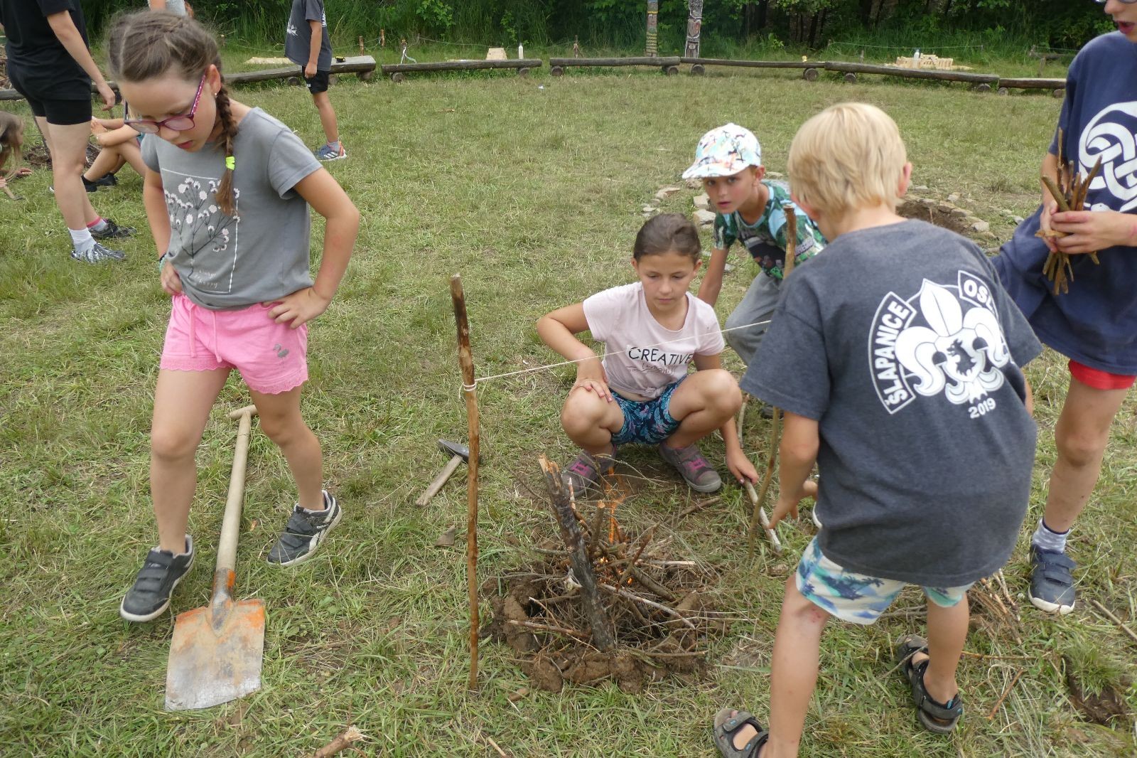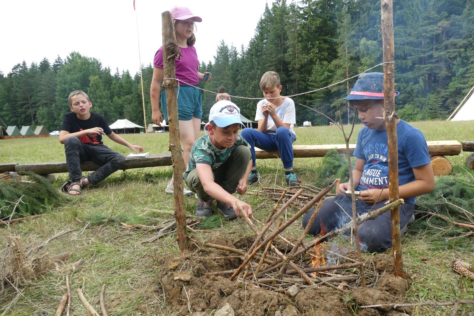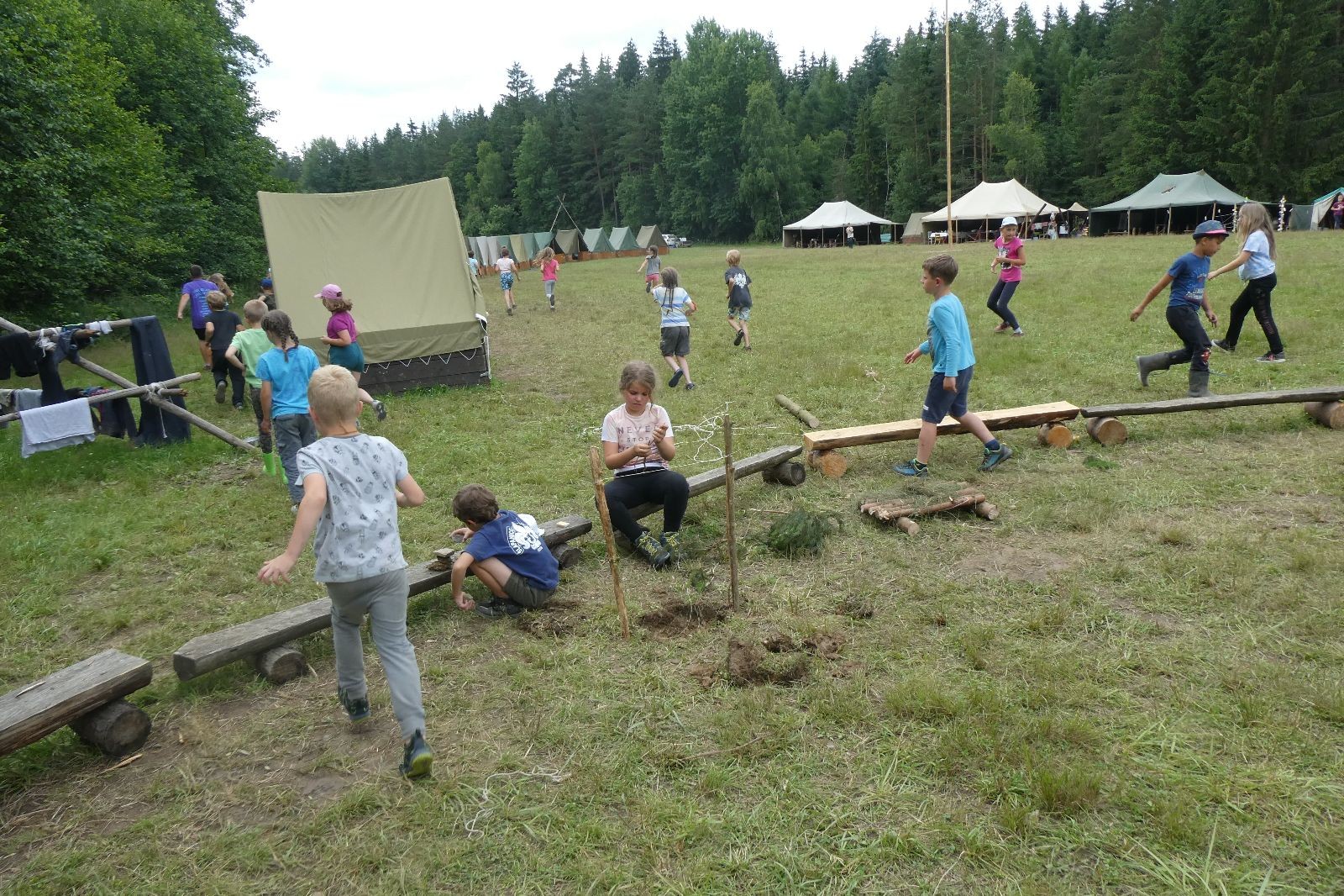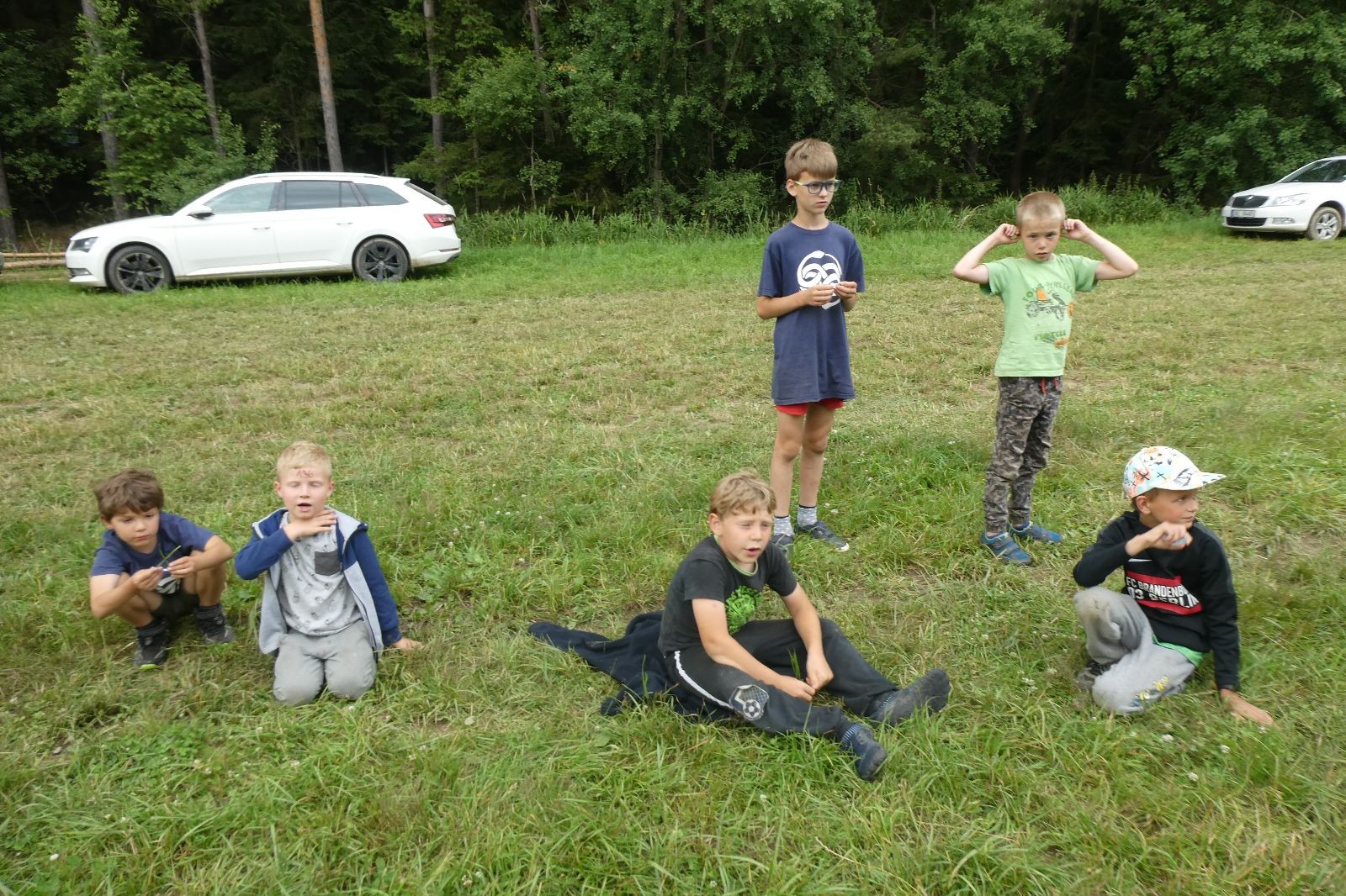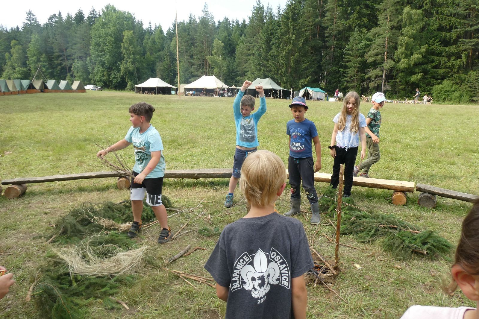 Neděle. Ta se obejde bez rozcvičky. Dopolední etapy u mladších i u starších probíhaly v lese a byly docela bojové. Svišti měli etapu poslední a každý v jejím závěru získal pěkného plyšáka. Ještě před obědem nás Svišti opustili a tak přišli o zážitek z „nejlepšího guláše v dějinách oddílu“, jak se někteří obdivně vyjádřili směrem k dnešnímu obědu. Po poledním klidu starší plnili úkoly na trase – etapa spíše intelektuální a podobně na tom byli mladší – ti zase rozdělávali oheň a přepalovali provázek. Sluníčko stále nepolevovalo v aktivitě. Navečer vedoucí mladších naplánovali skvělou stezku odvahy, vedoucí starších pro změnu výsadek. Jenže se trošku ženou mraky. První bouřka nás minula, ani nekáplo, jen foukalo, ale zahradnickému deštíčku se podle radaru asi nevyhneme. No uvidíme, zítra napíšu, jak to dopadlo.