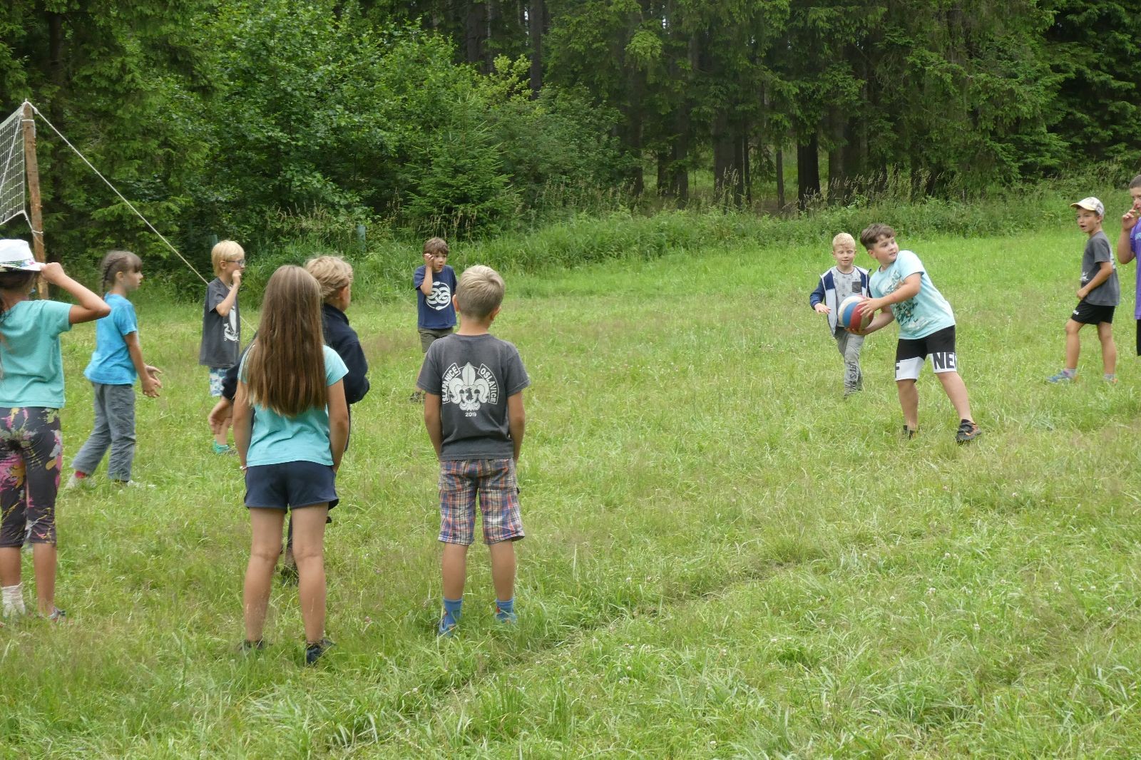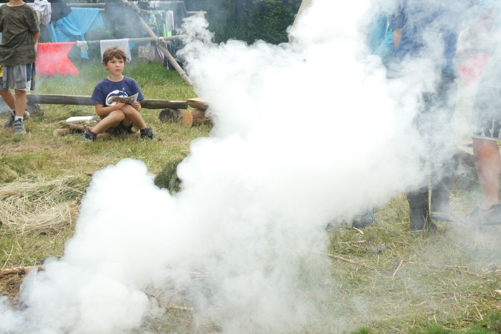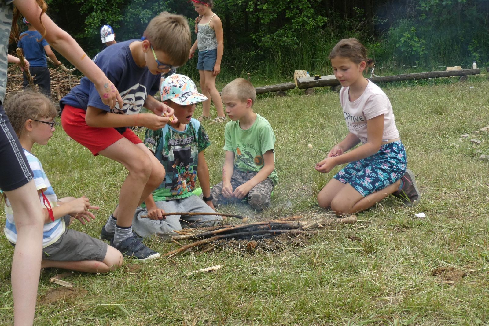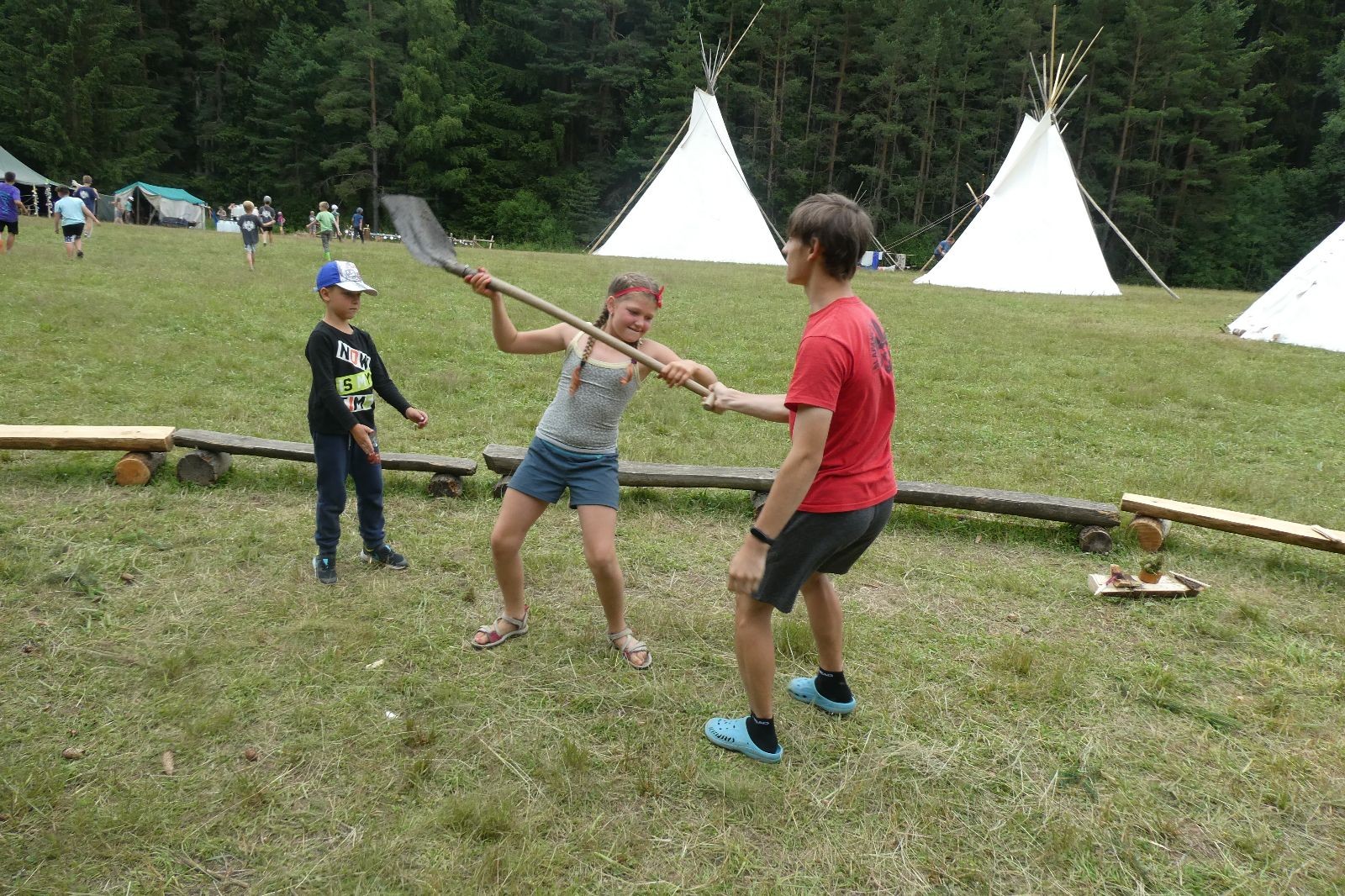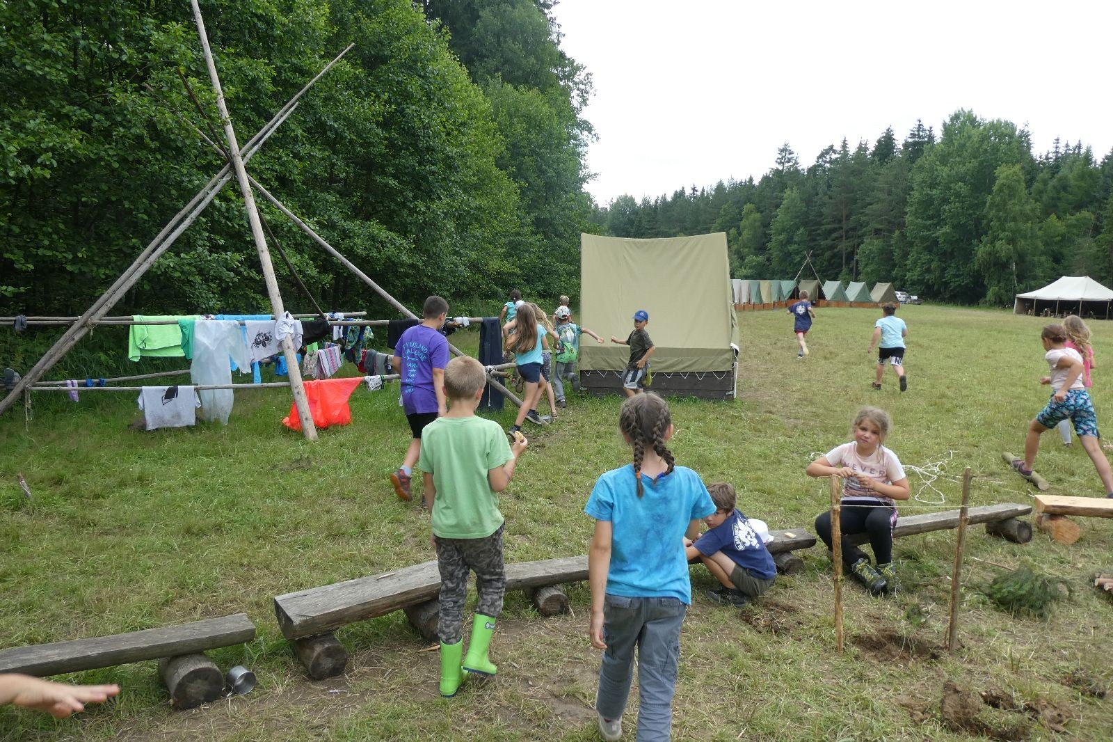 Neděle. Ta se obejde bez rozcvičky. Dopolední etapy u mladších i u starších probíhaly v lese a byly docela bojové. Svišti měli etapu poslední a každý v jejím závěru získal pěkného plyšáka. Ještě před obědem nás Svišti opustili a tak přišli o zážitek z „nejlepšího guláše v dějinách oddílu“, jak se někteří obdivně vyjádřili směrem k dnešnímu obědu. Po poledním klidu starší plnili úkoly na trase – etapa spíše intelektuální a podobně na tom byli mladší – ti zase rozdělávali oheň a přepalovali provázek. Sluníčko stále nepolevovalo v aktivitě. Navečer vedoucí mladších naplánovali skvělou stezku odvahy, vedoucí starších pro změnu výsadek. Jenže se trošku ženou mraky. První bouřka nás minula, ani nekáplo, jen foukalo, ale zahradnickému deštíčku se podle radaru asi nevyhneme. No uvidíme, zítra napíšu, jak to dopadlo.