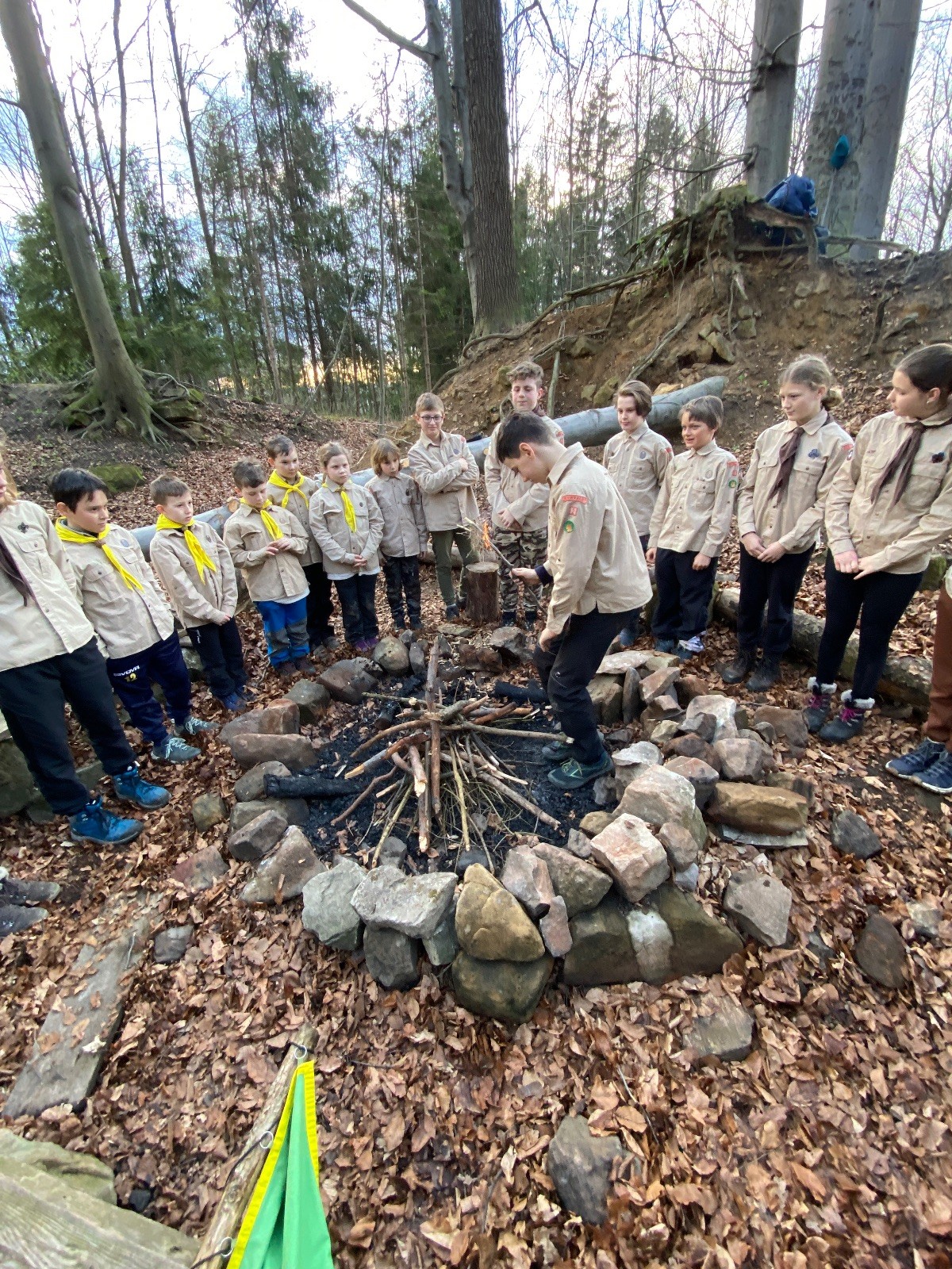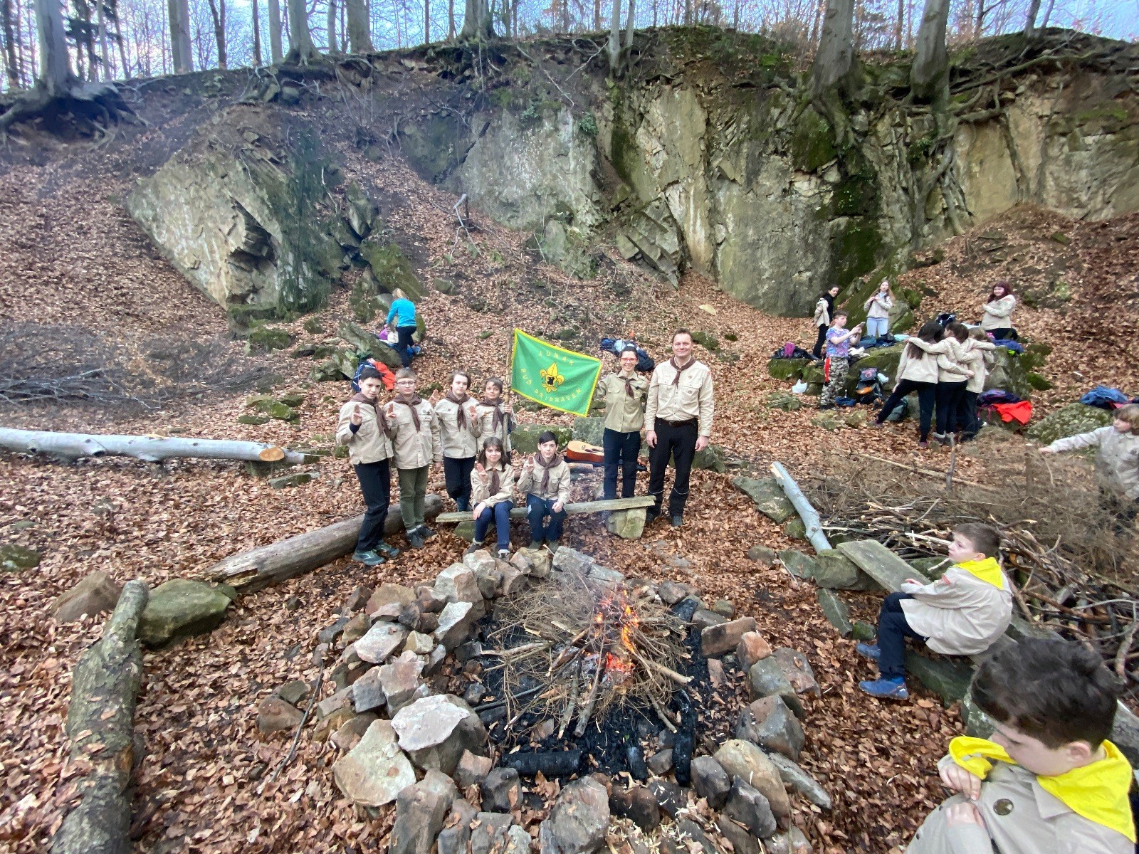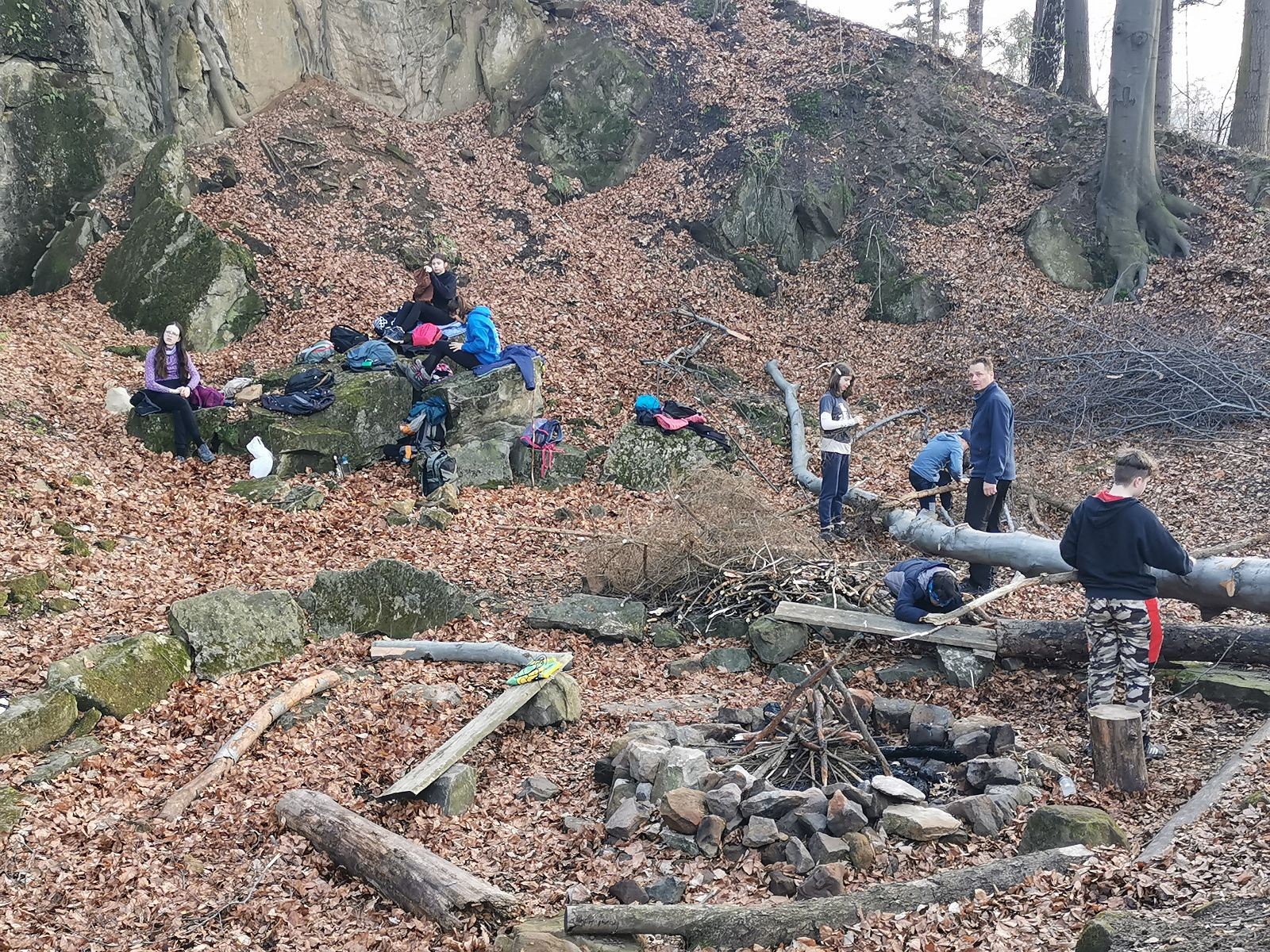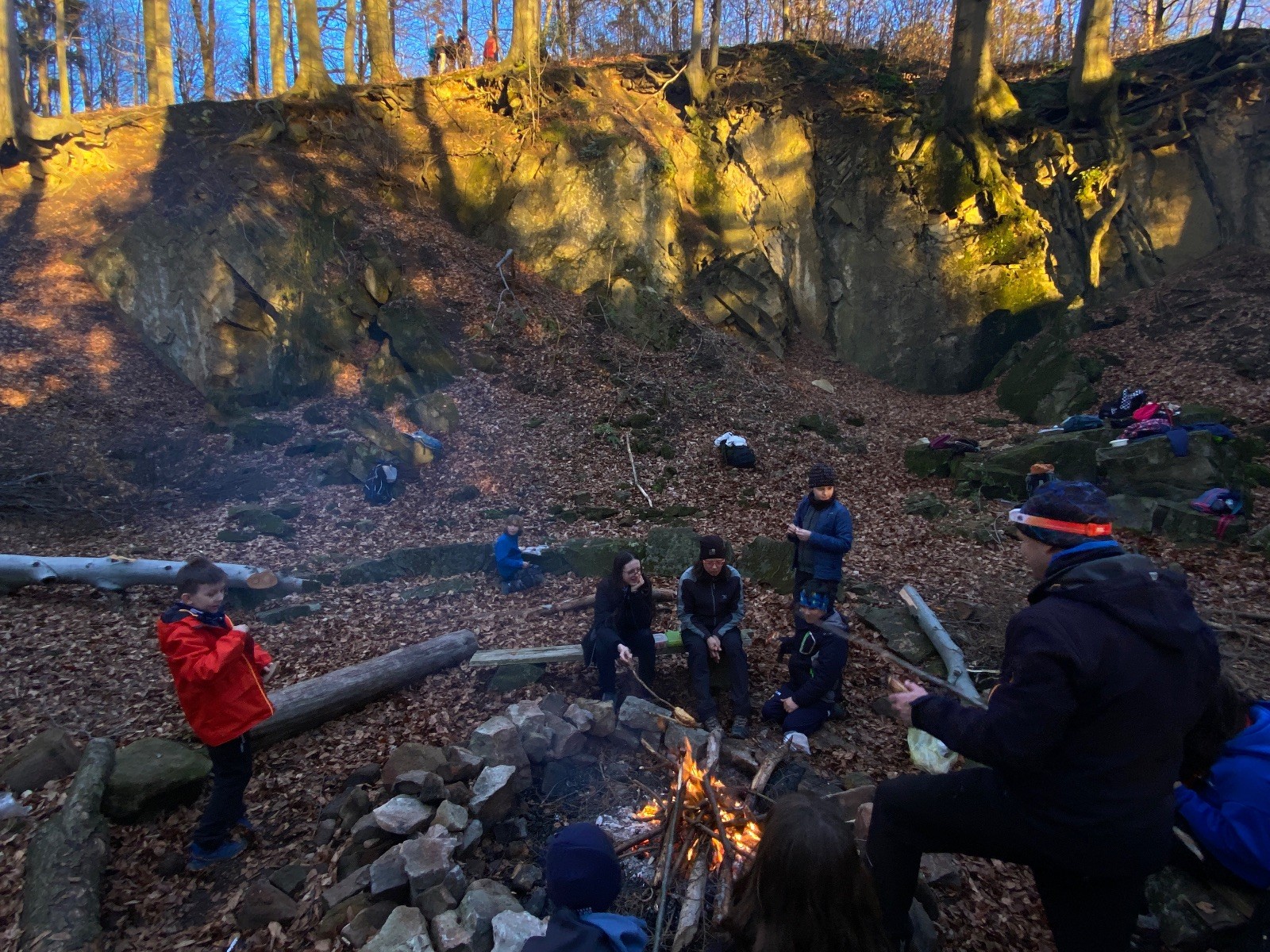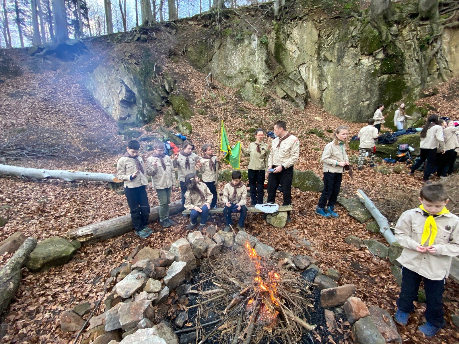 V 15.00 dáváme opět schůzku u myslivecké chaty, topíme a vybalujeme věci na spaní. Celkem se nás schází 21 (6 kocourů + 15 lišek). Vydáváme se směrem do větřkovického lomu. Po cestě již tradičně hrajeme na poli vlajkovanou. Netradiční, ale mi sympatickou kulisu nám tvoří rallye v pozadí. V lomu chystáme oheň, klacky na opékání a věci na sliby. Já připravuju pochodeň na zažehnutí slavnostního ohně. Někdy ostatním musíte ukázat, jak se věci dělat nemají, a říci: “Takhle ne, přátelé.” Ač nerad, tak se tohoto úkolu ujímám já a řežu se do prstu. Testuju novou lékárničku a pak už nám nic nebrání v cestě zapálit oheň. No a povězte sami, co by to bylo za slavnostní oheň, kdybychom pro něj nedali kousek ze sebe, že?