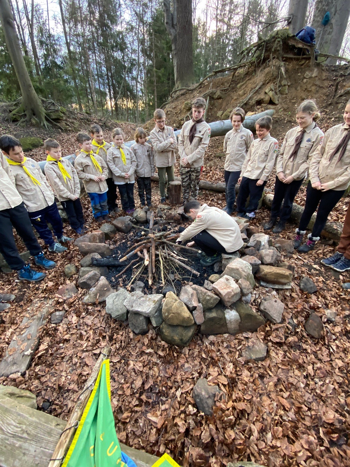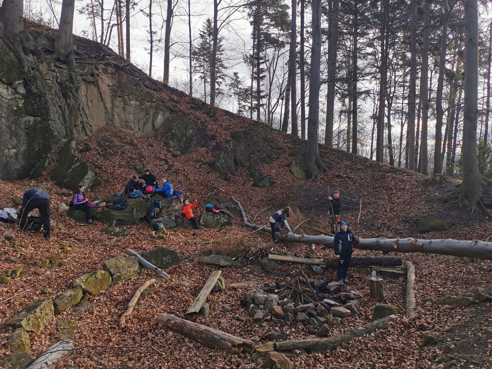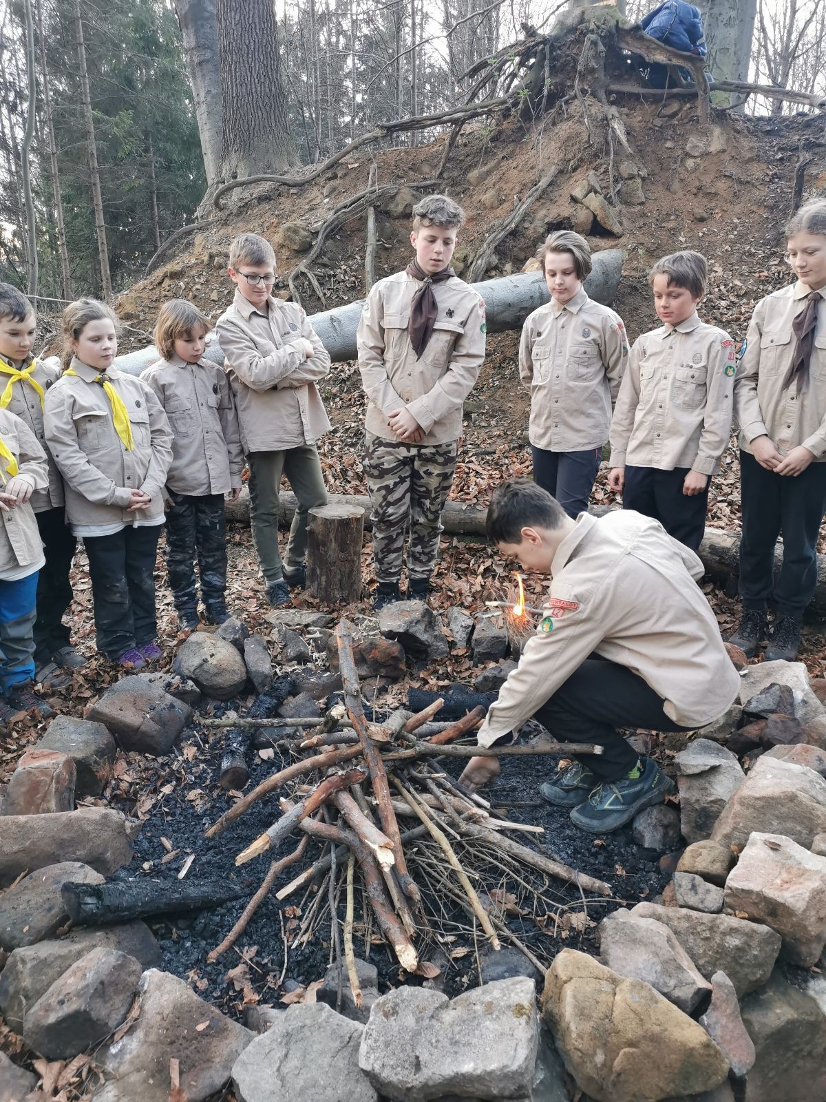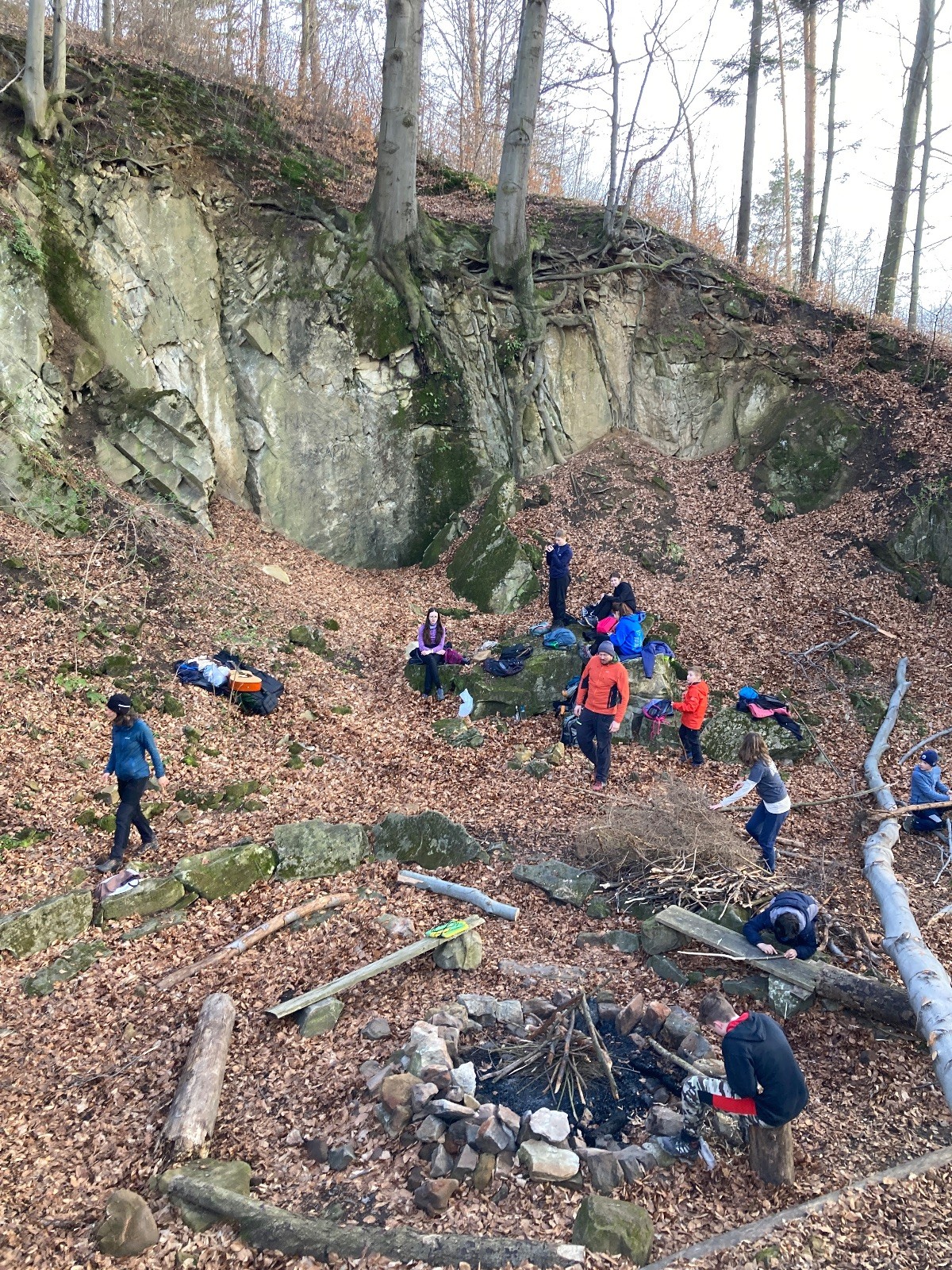 V 15.00 dáváme opět schůzku u myslivecké chaty, topíme a vybalujeme věci na spaní. Celkem se nás schází 21 (6 kocourů + 15 lišek). Vydáváme se směrem do větřkovického lomu. Po cestě již tradičně hrajeme na poli vlajkovanou. Netradiční, ale mi sympatickou kulisu nám tvoří rallye v pozadí. V lomu chystáme oheň, klacky na opékání a věci na sliby. Já připravuju pochodeň na zažehnutí slavnostního ohně. Někdy ostatním musíte ukázat, jak se věci dělat nemají, a říci: “Takhle ne, přátelé.” Ač nerad, tak se tohoto úkolu ujímám já a řežu se do prstu. Testuju novou lékárničku a pak už nám nic nebrání v cestě zapálit oheň. No a povězte sami, co by to bylo za slavnostní oheň, kdybychom pro něj nedali kousek ze sebe, že?