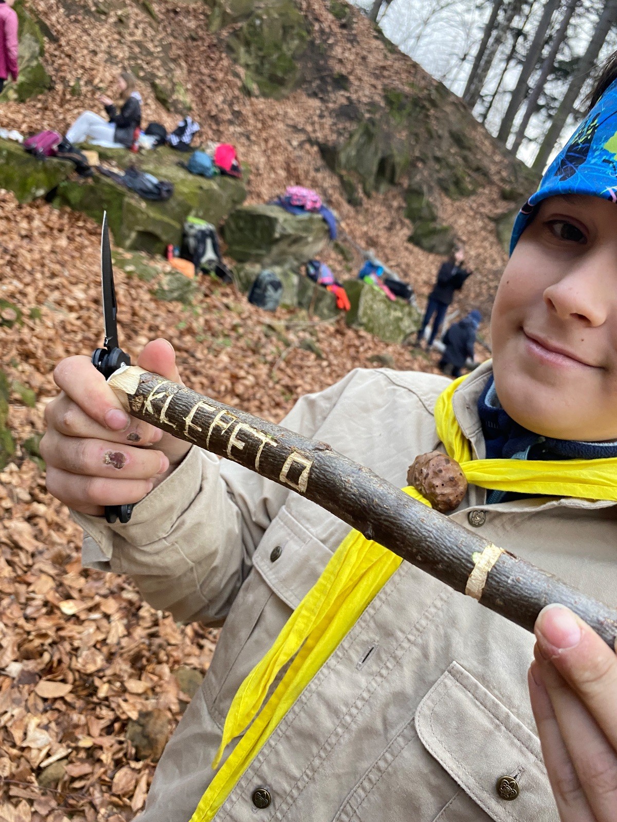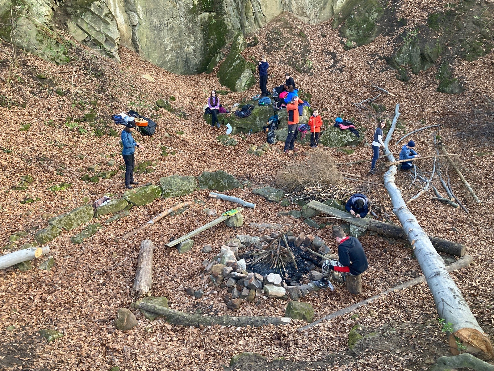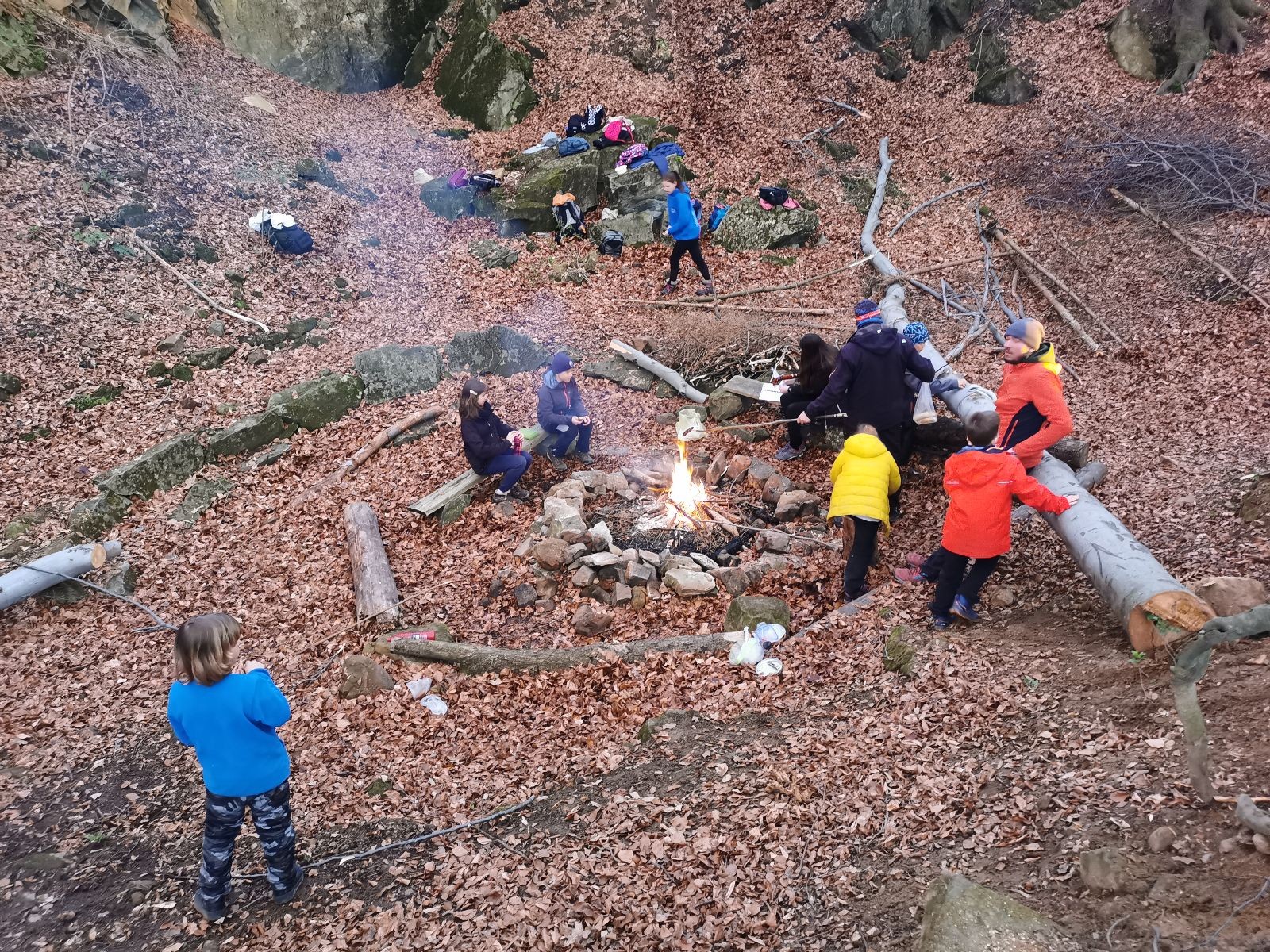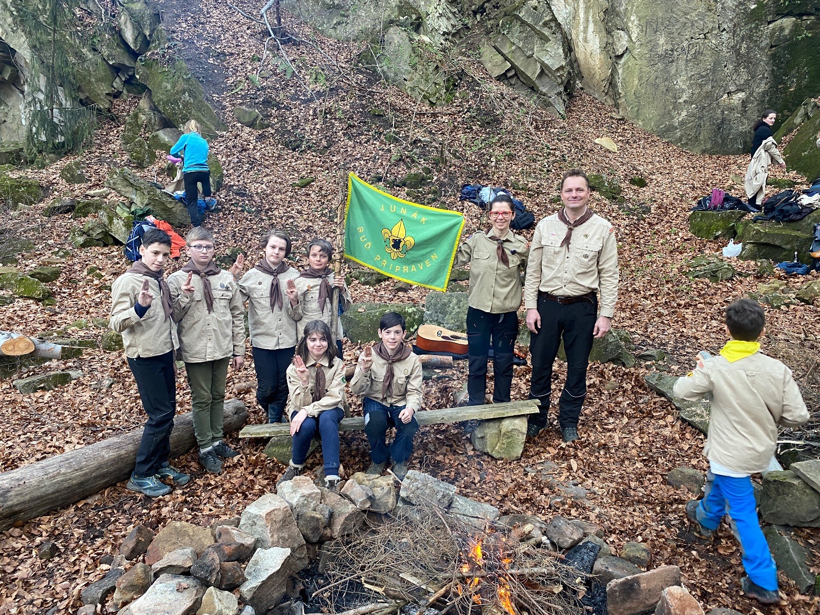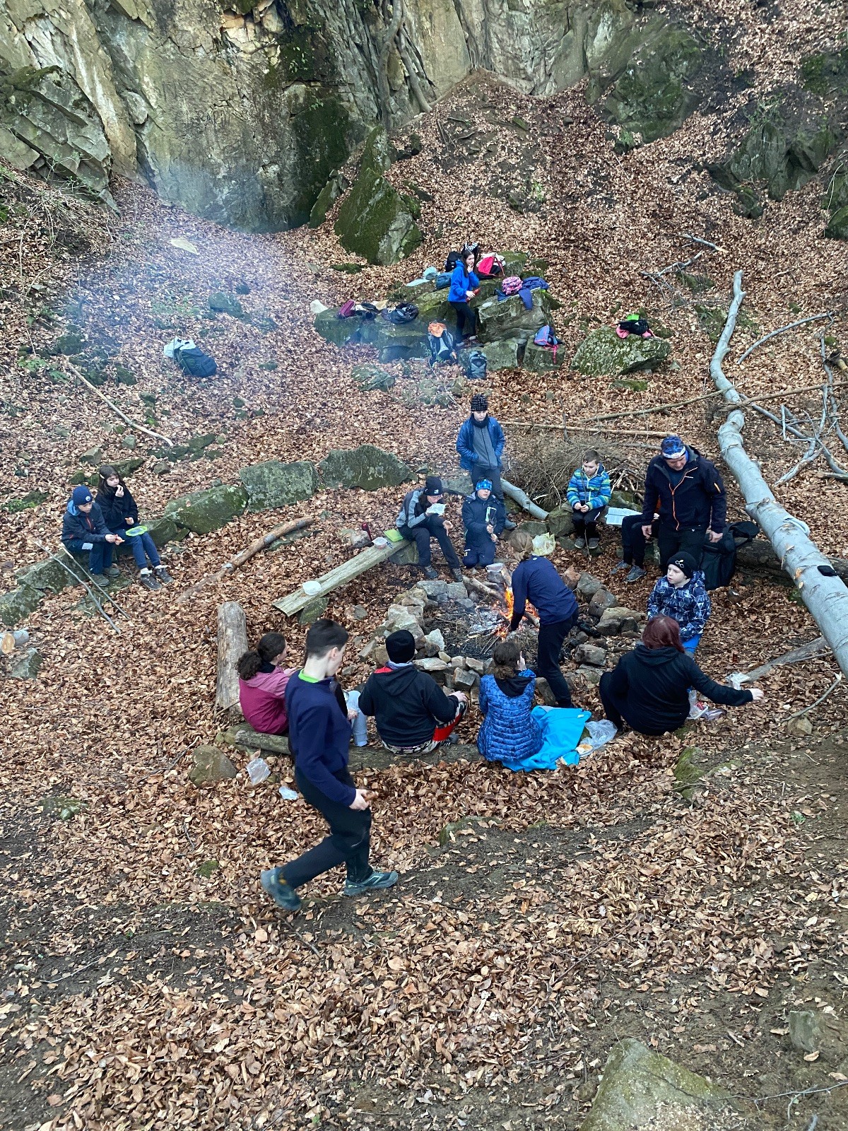 V 15.00 dáváme opět schůzku u myslivecké chaty, topíme a vybalujeme věci na spaní. Celkem se nás schází 21 (6 kocourů + 15 lišek). Vydáváme se směrem do větřkovického lomu. Po cestě již tradičně hrajeme na poli vlajkovanou. Netradiční, ale mi sympatickou kulisu nám tvoří rallye v pozadí. V lomu chystáme oheň, klacky na opékání a věci na sliby. Já připravuju pochodeň na zažehnutí slavnostního ohně. Někdy ostatním musíte ukázat, jak se věci dělat nemají, a říci: “Takhle ne, přátelé.” Ač nerad, tak se tohoto úkolu ujímám já a řežu se do prstu. Testuju novou lékárničku a pak už nám nic nebrání v cestě zapálit oheň. No a povězte sami, co by to bylo za slavnostní oheň, kdybychom pro něj nedali kousek ze sebe, že?