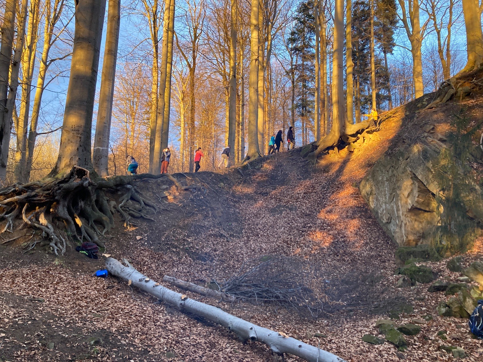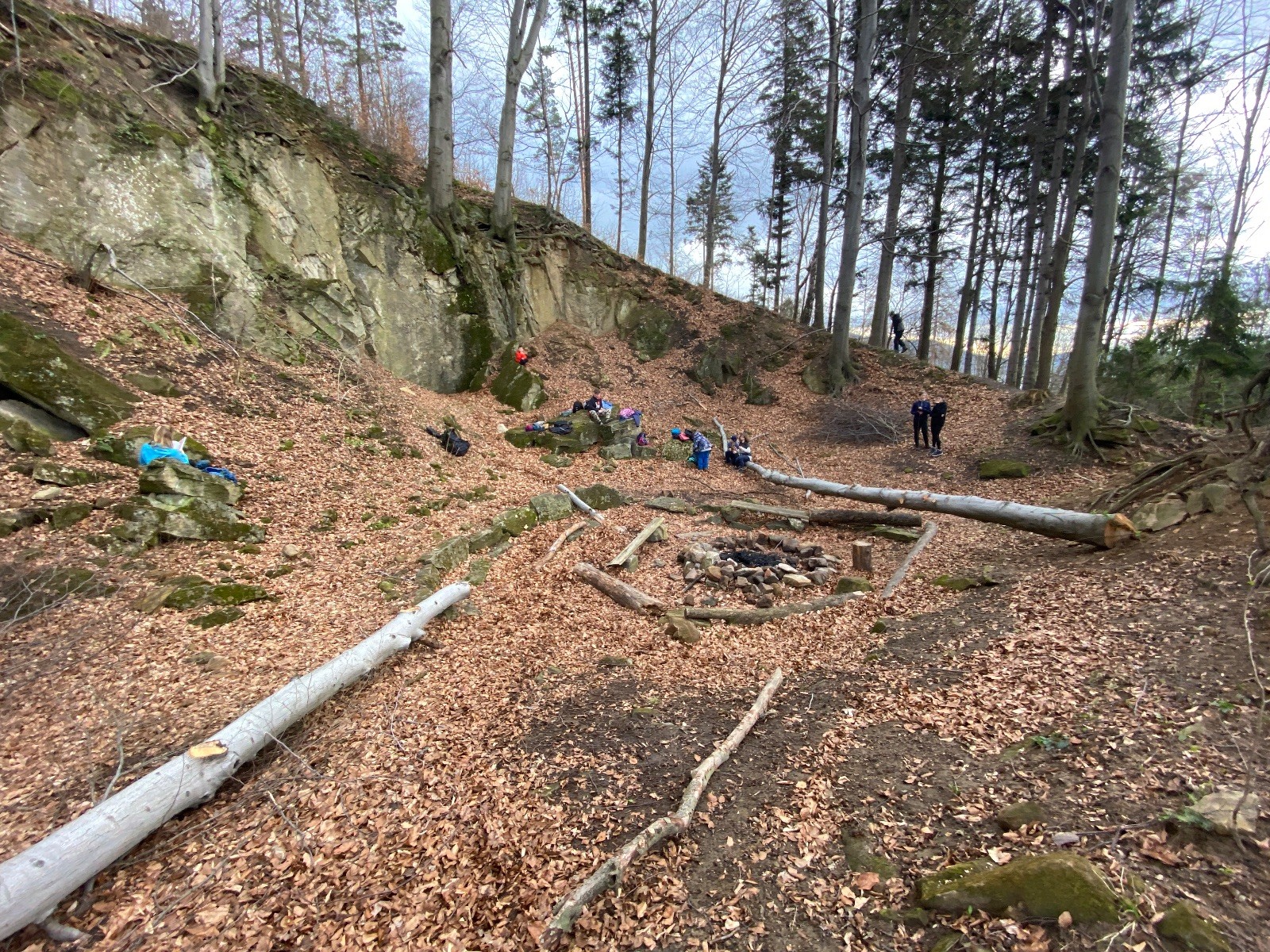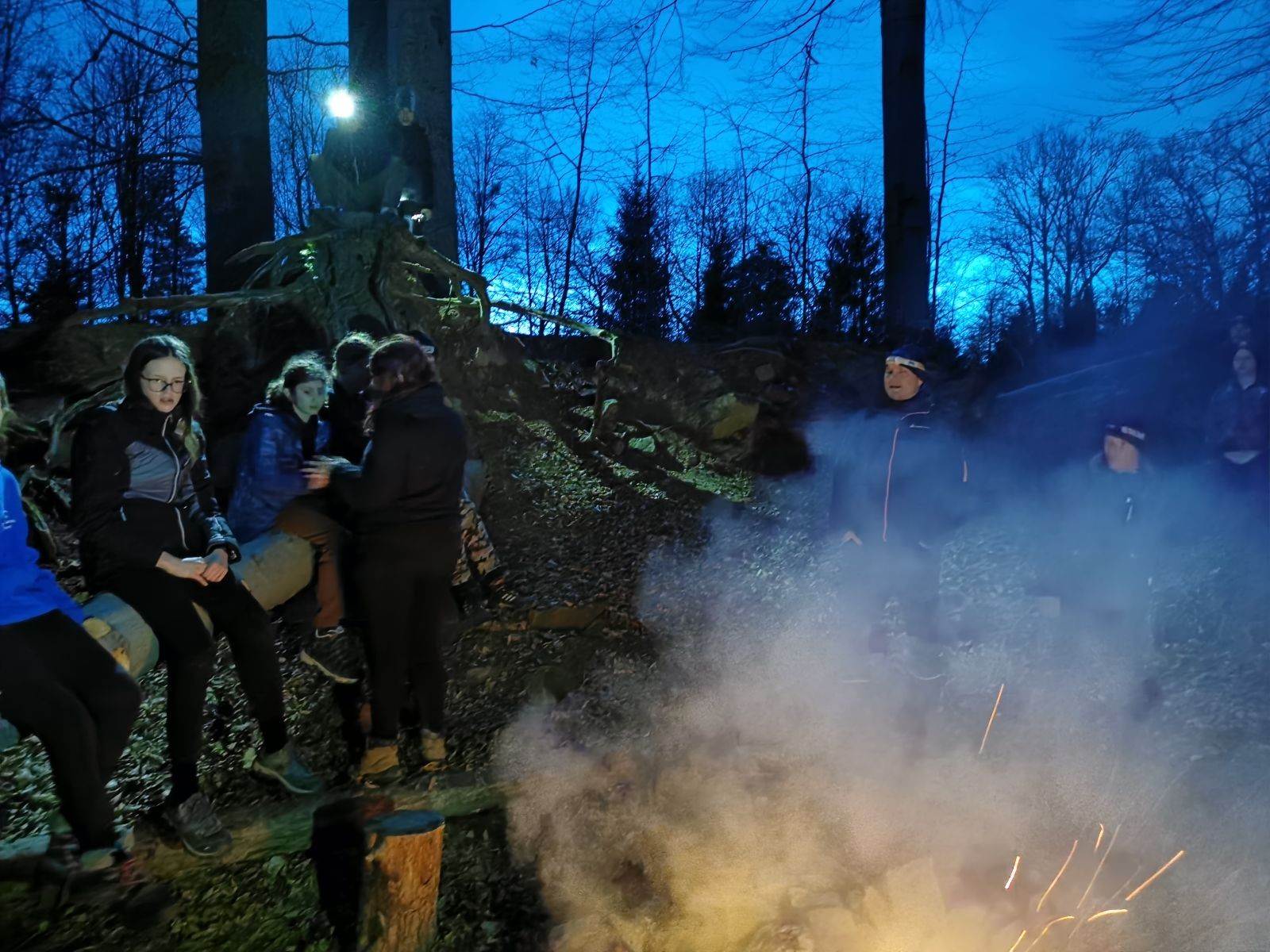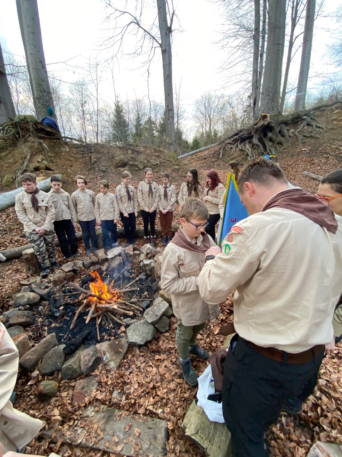 V 15.00 dáváme opět schůzku u myslivecké chaty, topíme a vybalujeme věci na spaní. Celkem se nás schází 21 (6 kocourů + 15 lišek). Vydáváme se směrem do větřkovického lomu. Po cestě již tradičně hrajeme na poli vlajkovanou. Netradiční, ale mi sympatickou kulisu nám tvoří rallye v pozadí. V lomu chystáme oheň, klacky na opékání a věci na sliby. Já připravuju pochodeň na zažehnutí slavnostního ohně. Někdy ostatním musíte ukázat, jak se věci dělat nemají, a říci: “Takhle ne, přátelé.” Ač nerad, tak se tohoto úkolu ujímám já a řežu se do prstu. Testuju novou lékárničku a pak už nám nic nebrání v cestě zapálit oheň. No a povězte sami, co by to bylo za slavnostní oheň, kdybychom pro něj nedali kousek ze sebe, že?