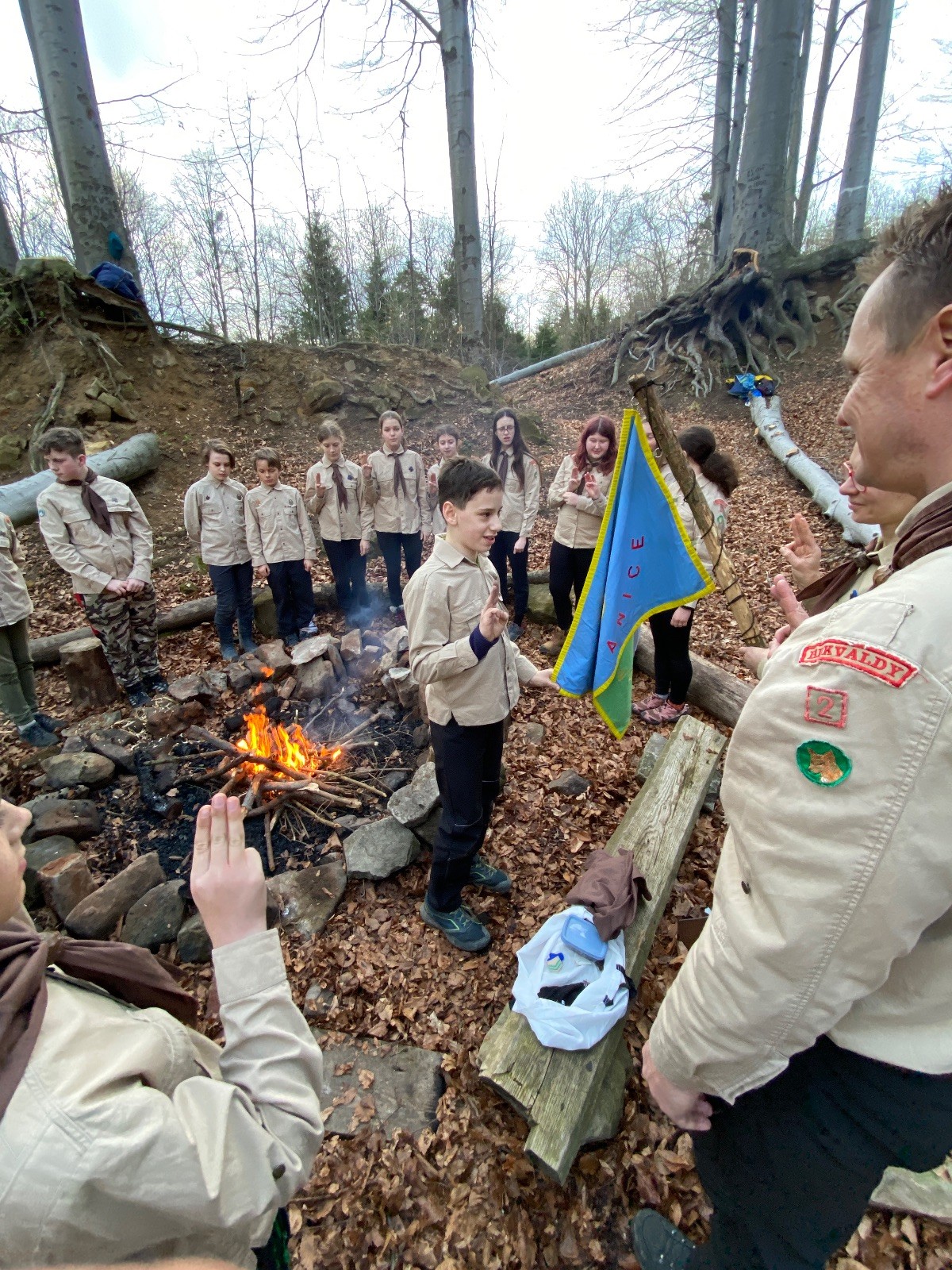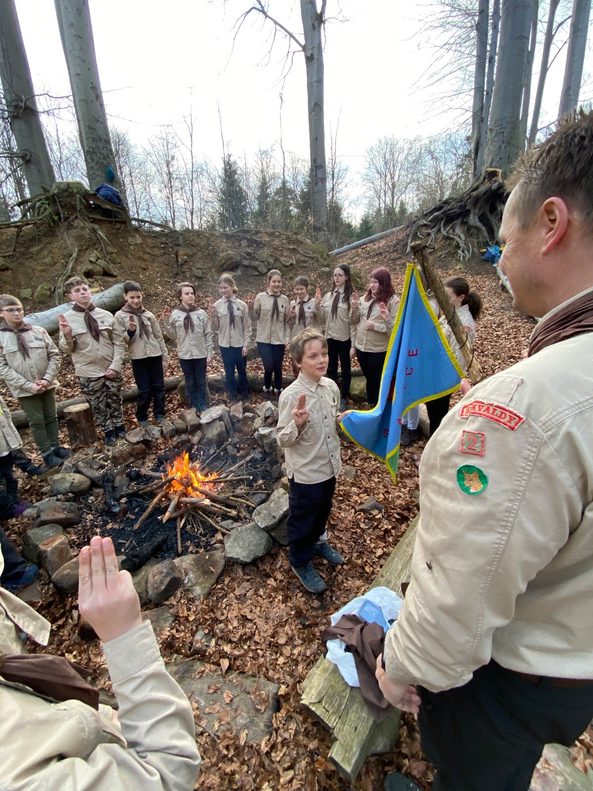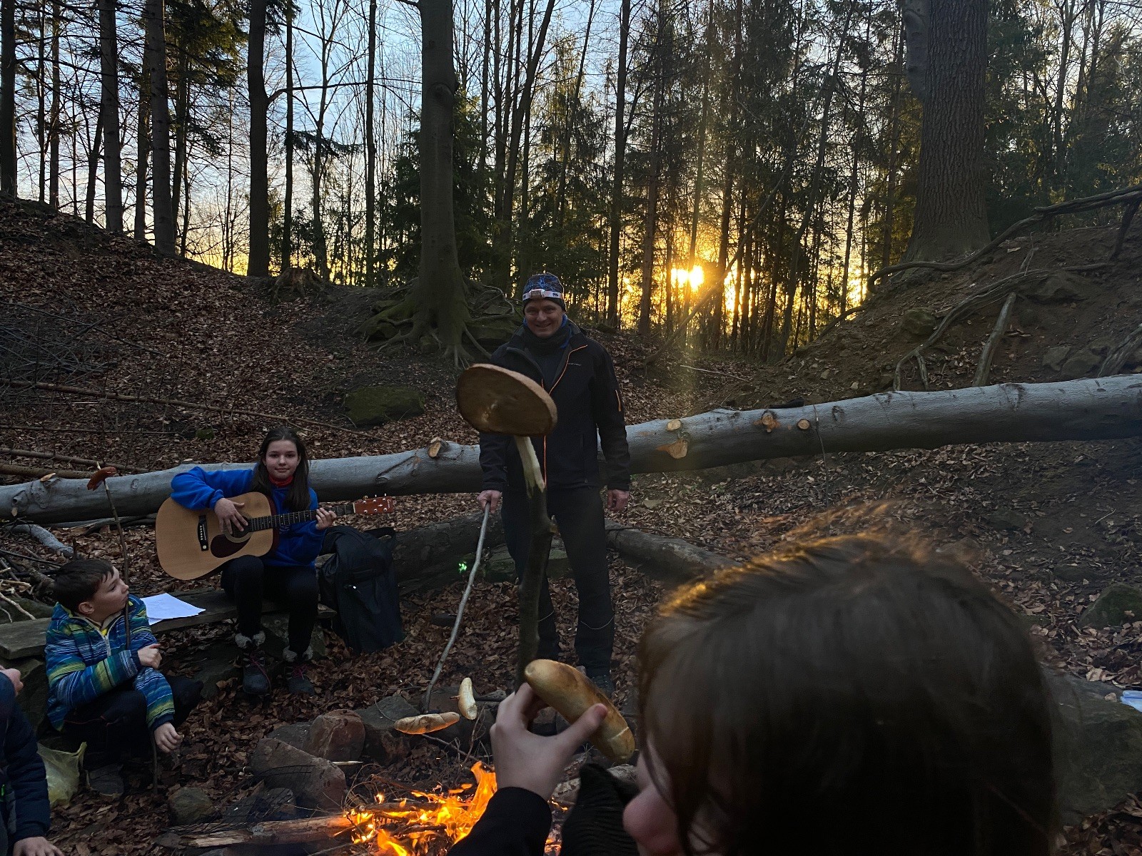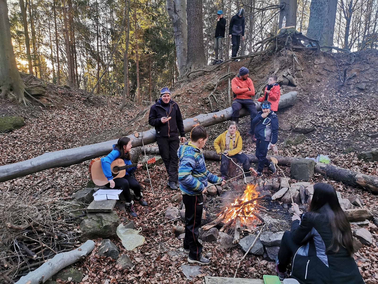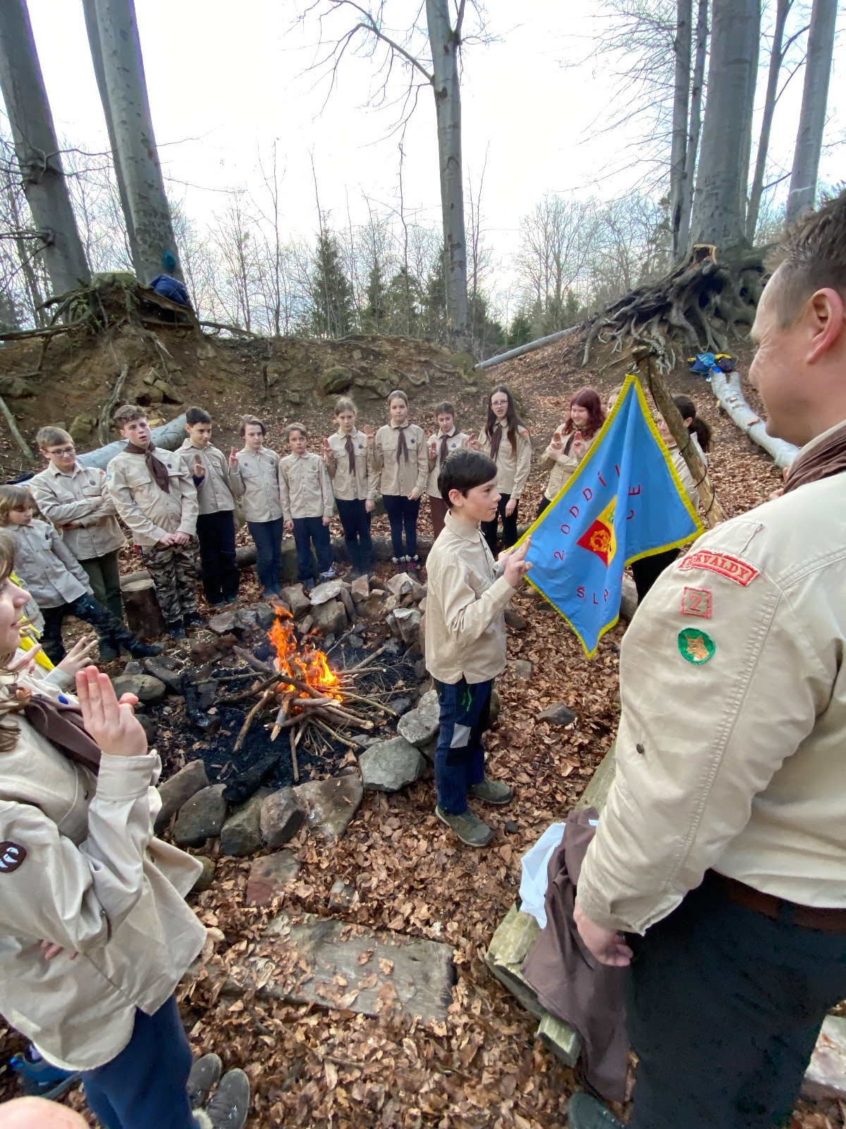 Skautské sliby skládá 6 lišek. Mí kocouři, kteří za sebou mají nováčkovskou zkoušku, bohužel chybí. Rozdáváme lipové lístečky, slavnostní oheň překřtíme na užitkový a chystáme večeři. Já si své špekáčky prozíravě nechal v autě. Mí kocouři mě ovšem mají rádi, takže se se mnou ochotně musí rozdělit. Díky Marťanovi a Schofce 😁. Potom kytara, písničky a pauza na vytrávení. Se setměním ještě hrajeme pár kol schovávané. Na závěr vytahujeme naše čupr, svíčky se skořicovou vůní. Jeden od druhého si je zapalujeme a vyslovujeme naše přání. Svíčky sice voní hezky, ale to, co výrobce přidal na vůni, zjevně ubral z jejich schopnosti hořet a vydržet. Ale co… byly ve slevě. Hasíme oheň a frčíme zpátky na myslivnu, kde nám Jana od Uzla poctivě přikládala. Vyčistíme zuby a na dobrou noc pouštíme Spidermana.