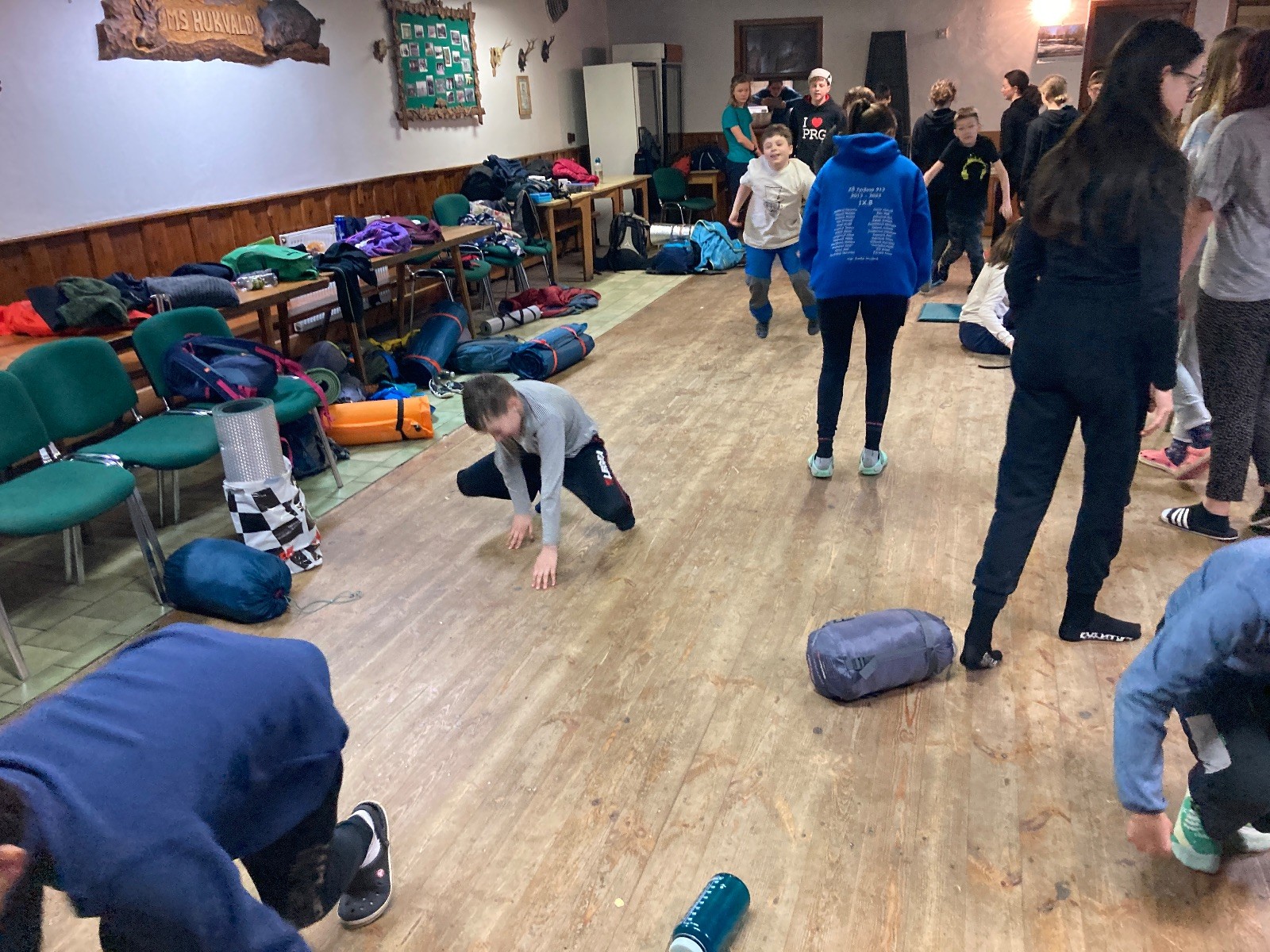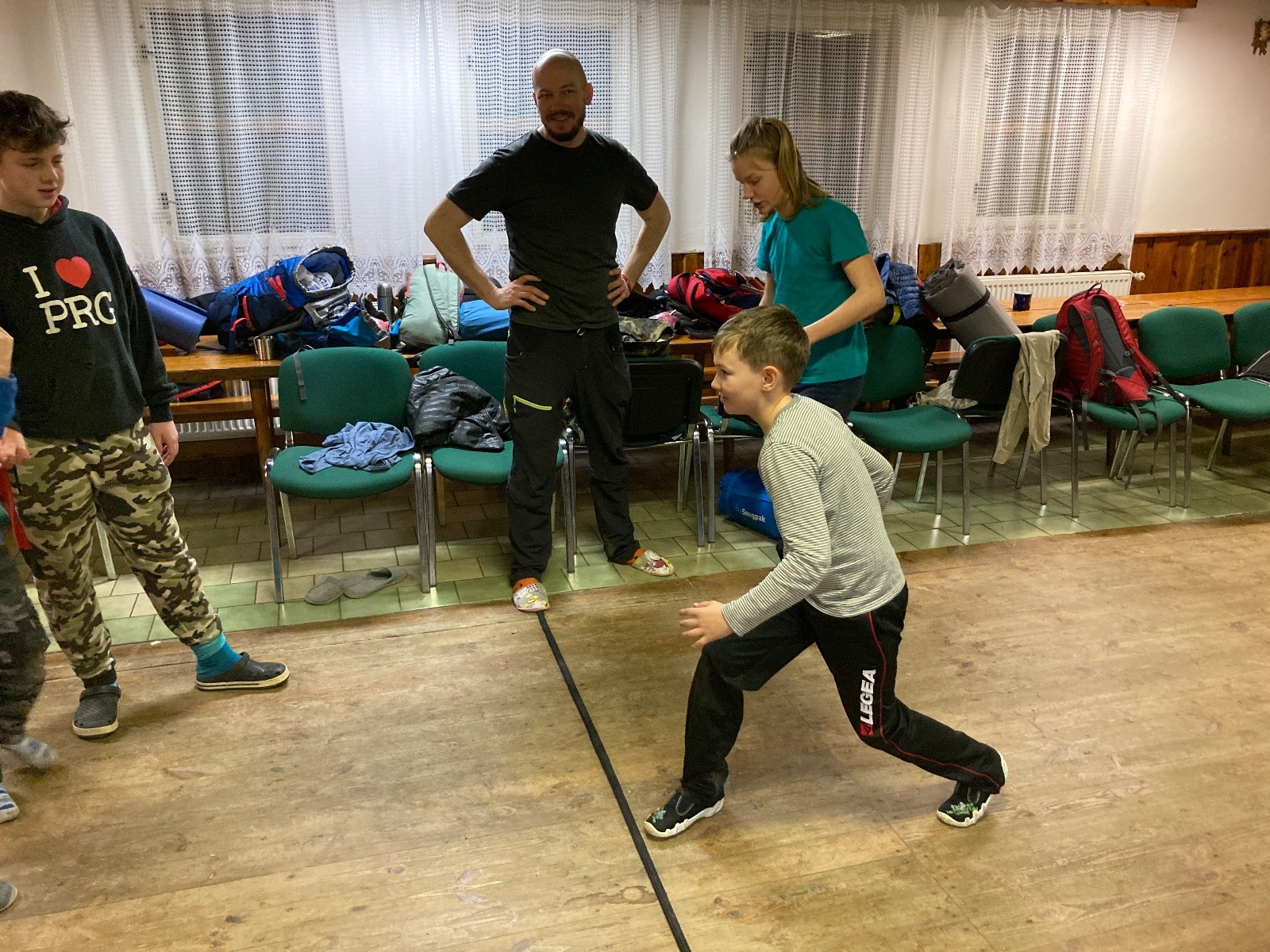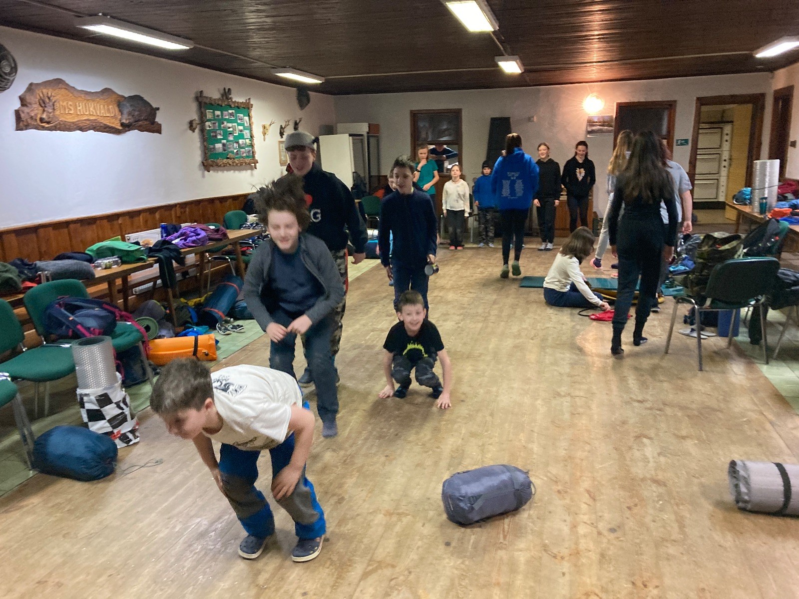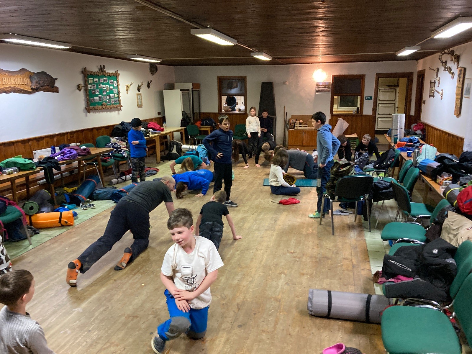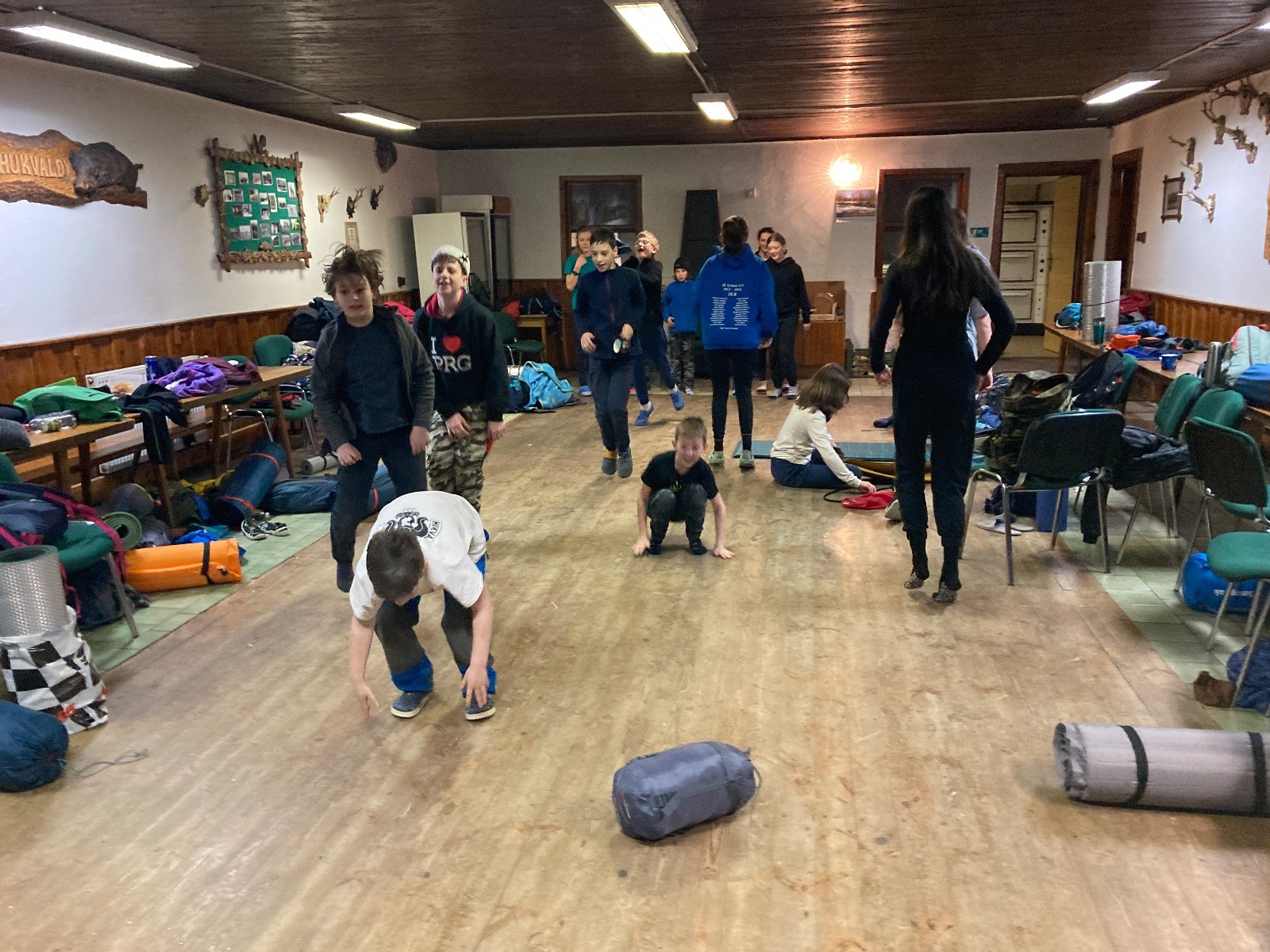 Je neděle, takže si hezky pospíme a ráno zahájíme rozcvičkou, na kterou si všichni těšíme tak, že pokud si příště zase zapomenu špekáčky, asi zůstanu hlady. Pak zahrajeme kámen-nůžky, hutututu, uklidíme a frčíme domů.