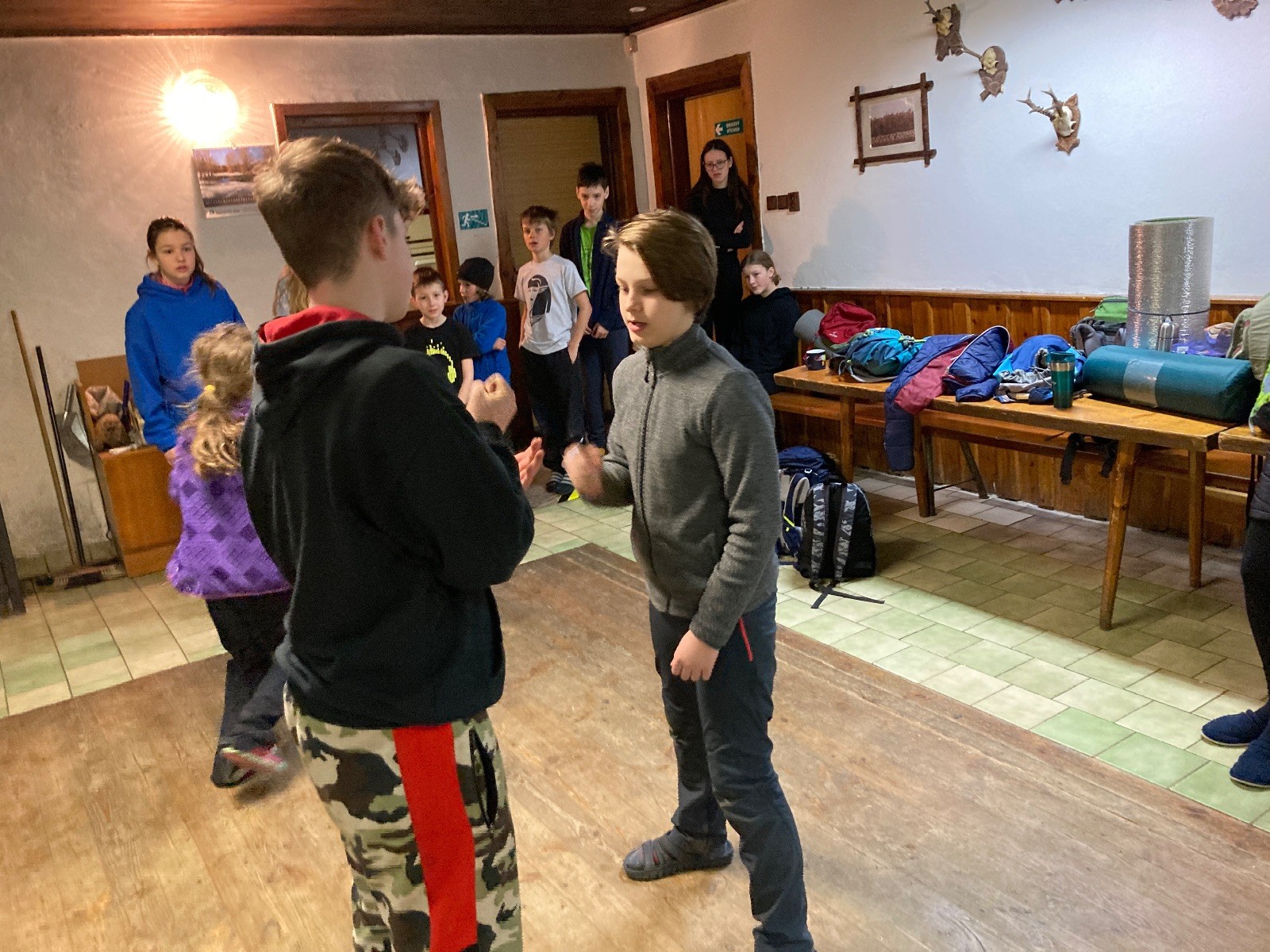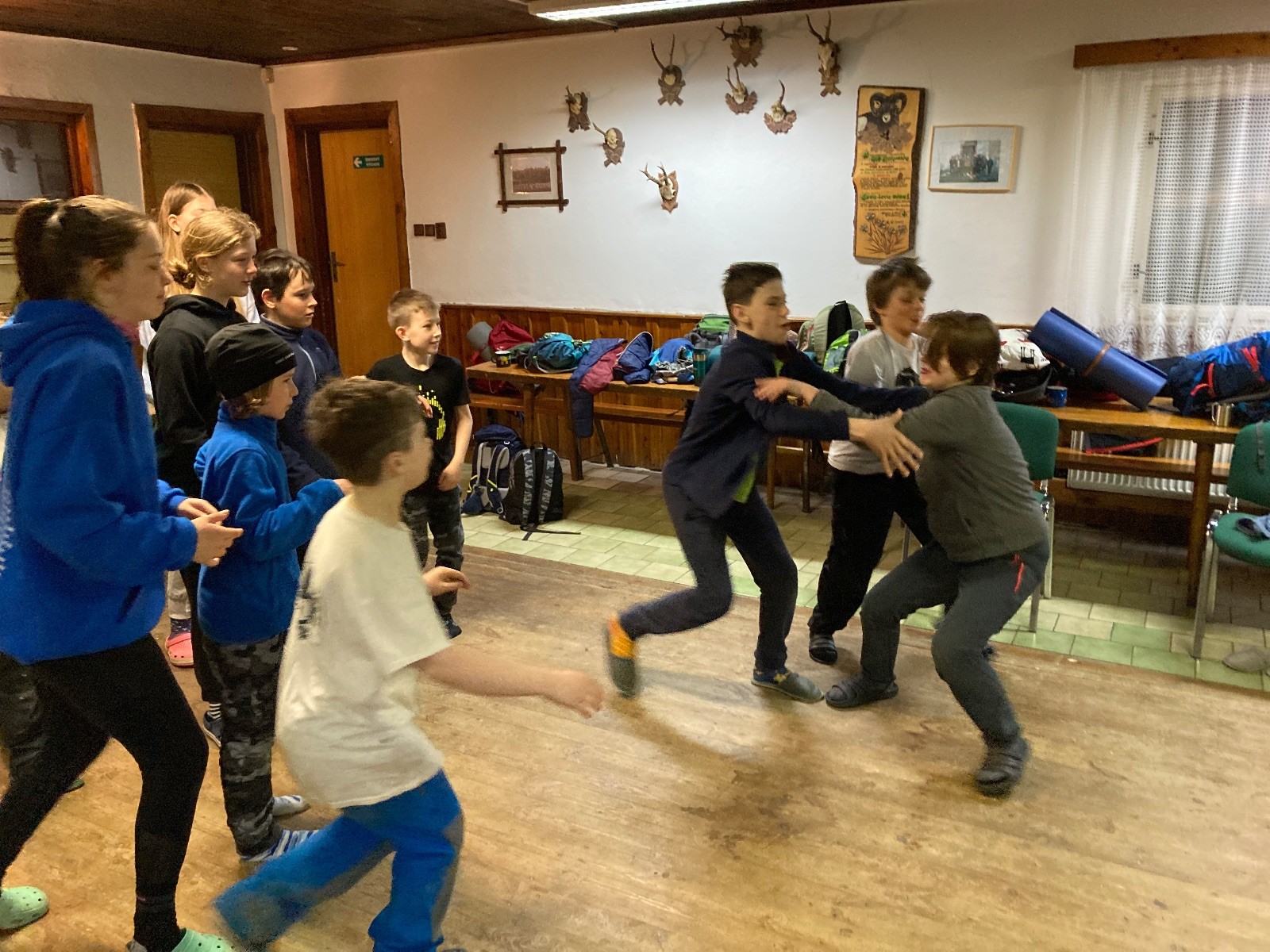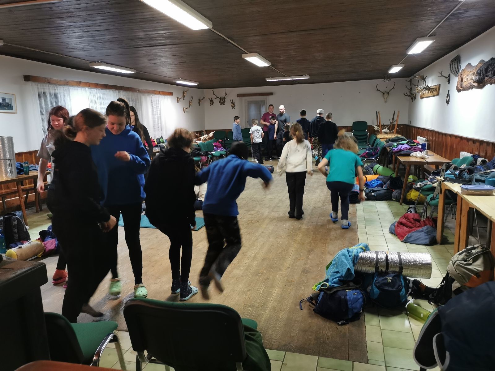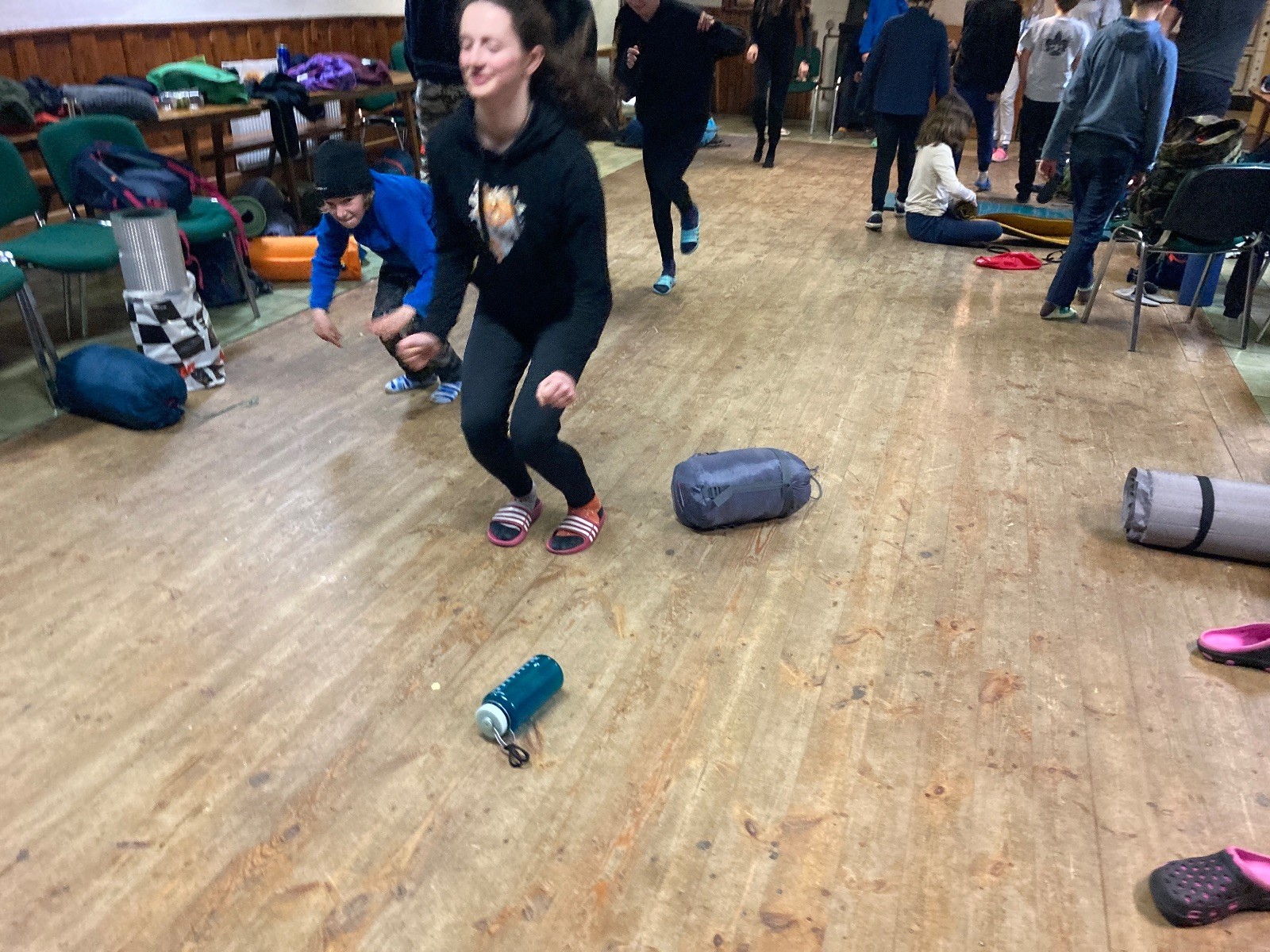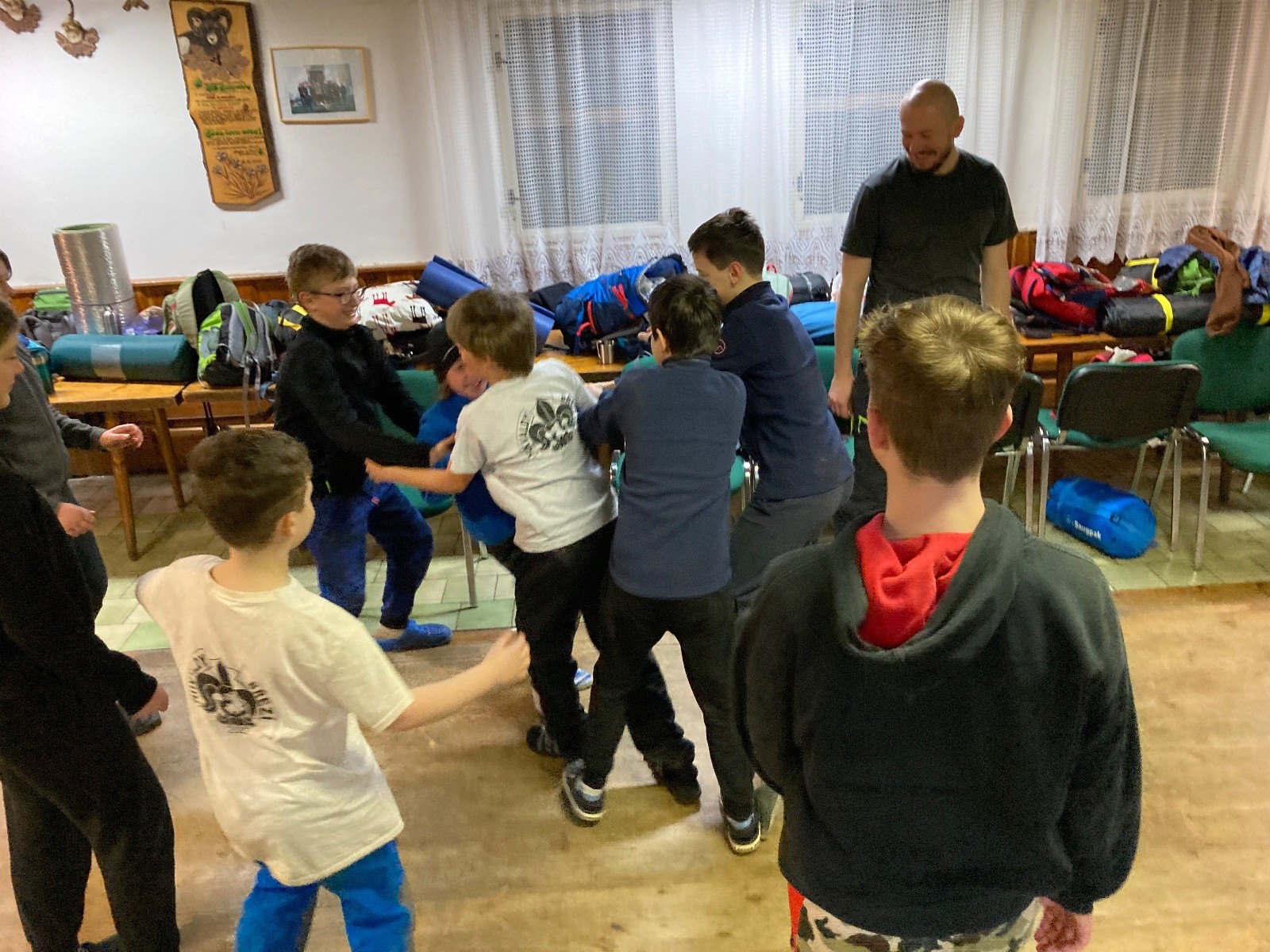 Je neděle, takže si hezky pospíme a ráno zahájíme rozcvičkou, na kterou si všichni těšíme tak, že pokud si příště zase zapomenu špekáčky, asi zůstanu hlady. Pak zahrajeme kámen-nůžky, hutututu, uklidíme a frčíme domů.