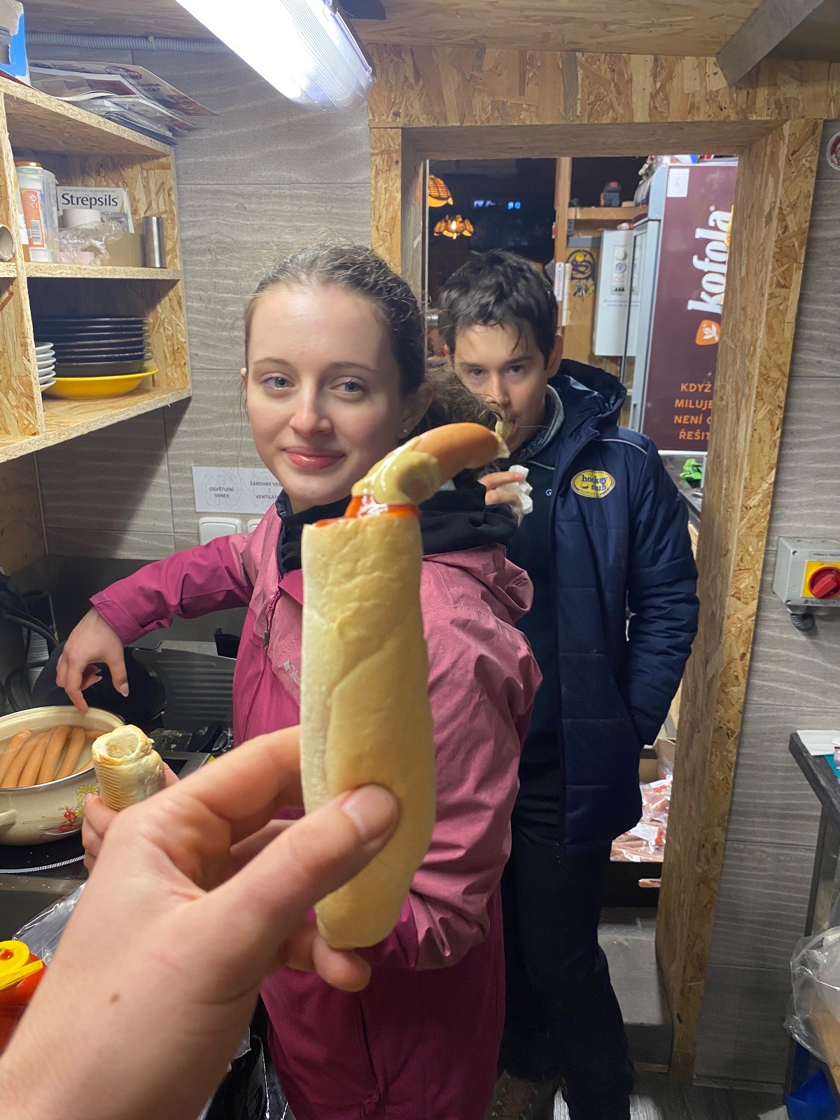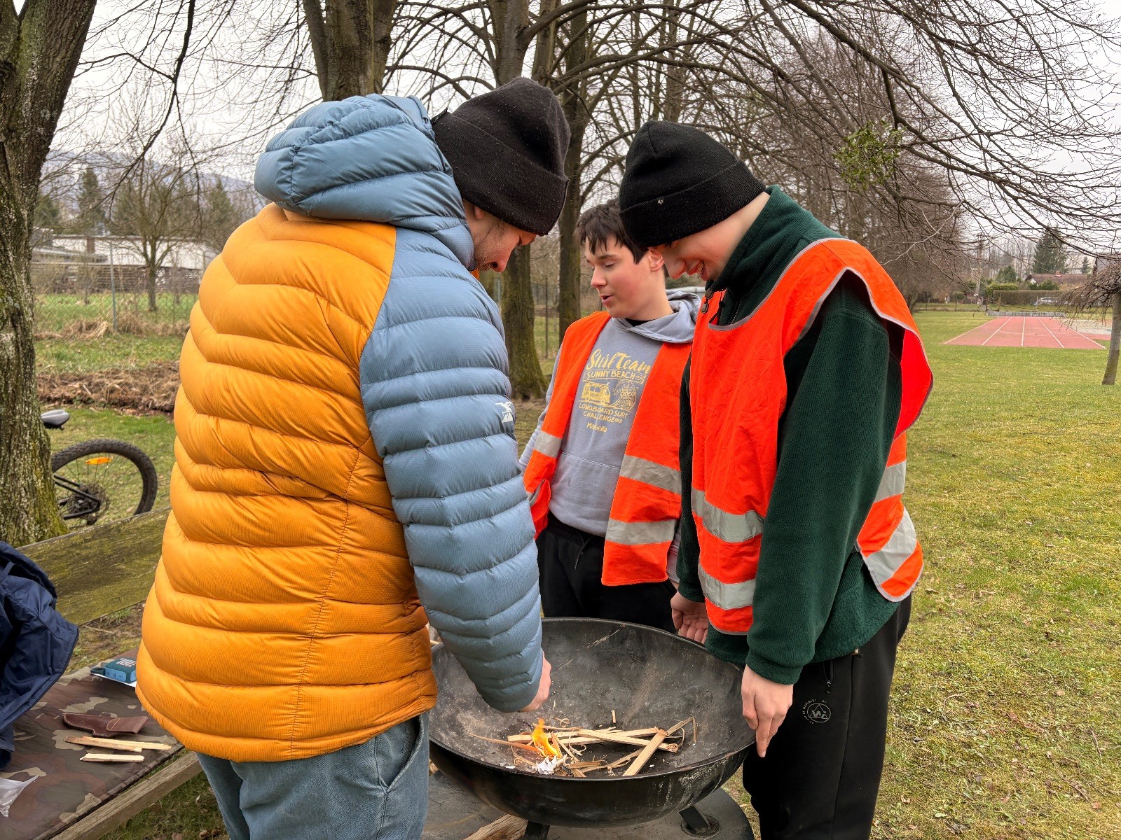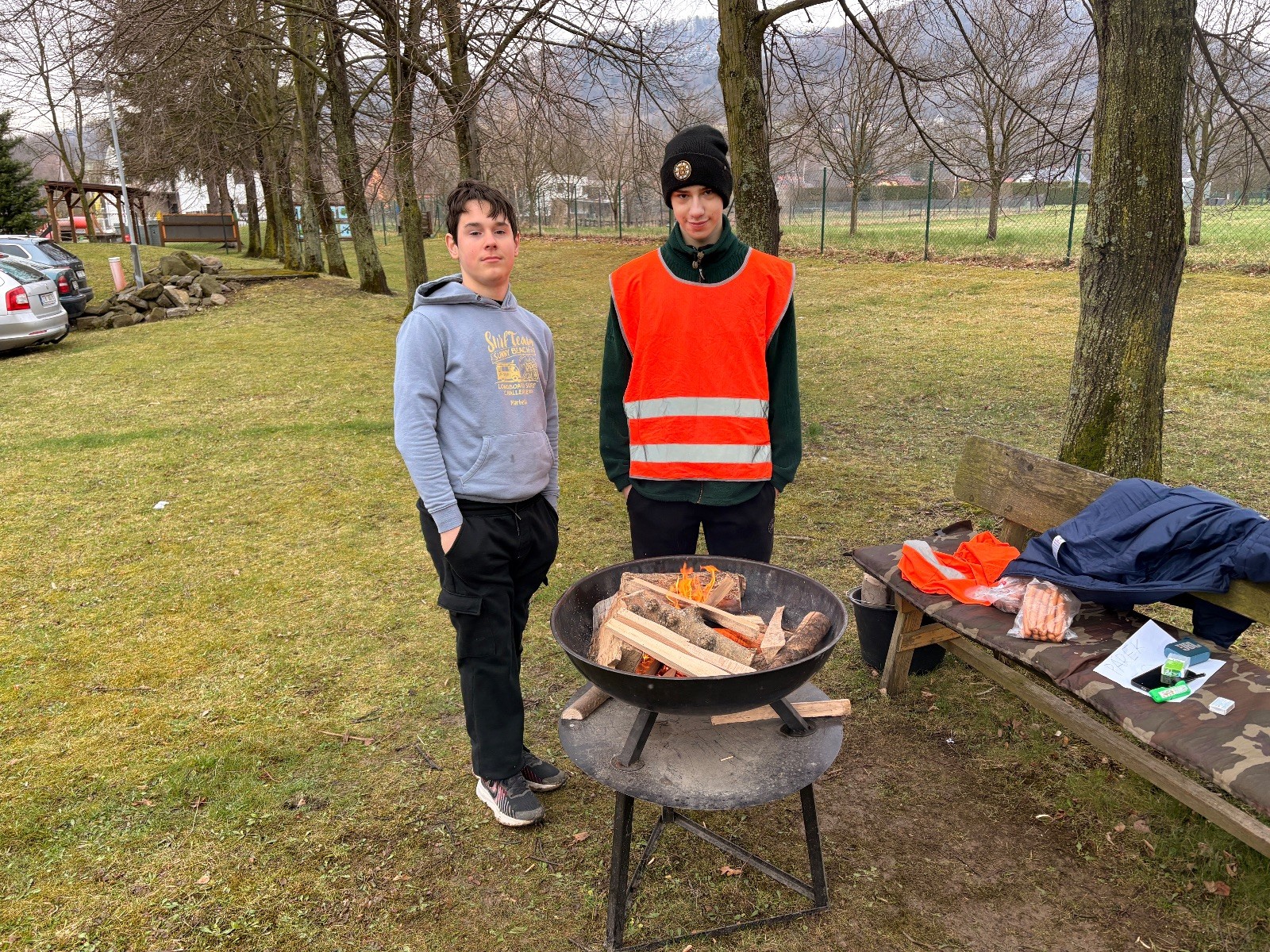 Lišky a Kocouři se pak setkávají znova odpoledne u školy, kde pomáháme Potlachářům. Janča se Zuzkou se starají o šatny a jde jim to! Lidé jsou nebývale štědří, za což děkujeme. Frankie a Soki šéfují oheň a opékají špekáčky. Vojta s Mikim již tradičně řeší parking a užírají párky. Já se musím zdekovat, protože mě ještě čeká cesta do Brna, takže odcházím chvilku před nástupem druhé směny, kterou mají v gesci Bať, Davka, Kozička a Marťan. Co se dělo si tak můžu jen domýšlet, ale vzhledem k tomu, že jsem nenarazil na žádnou katastrofickou zprávu z Hukvald, soudím, že vše proběhlo hladce a bezproblémově. Dovolím si hádat, že Vojta se přežral párků a Frankiemu bylo blbě, protože jak jinak by mohla dopadnout konzumace spáleného párku posypaného cukrem.